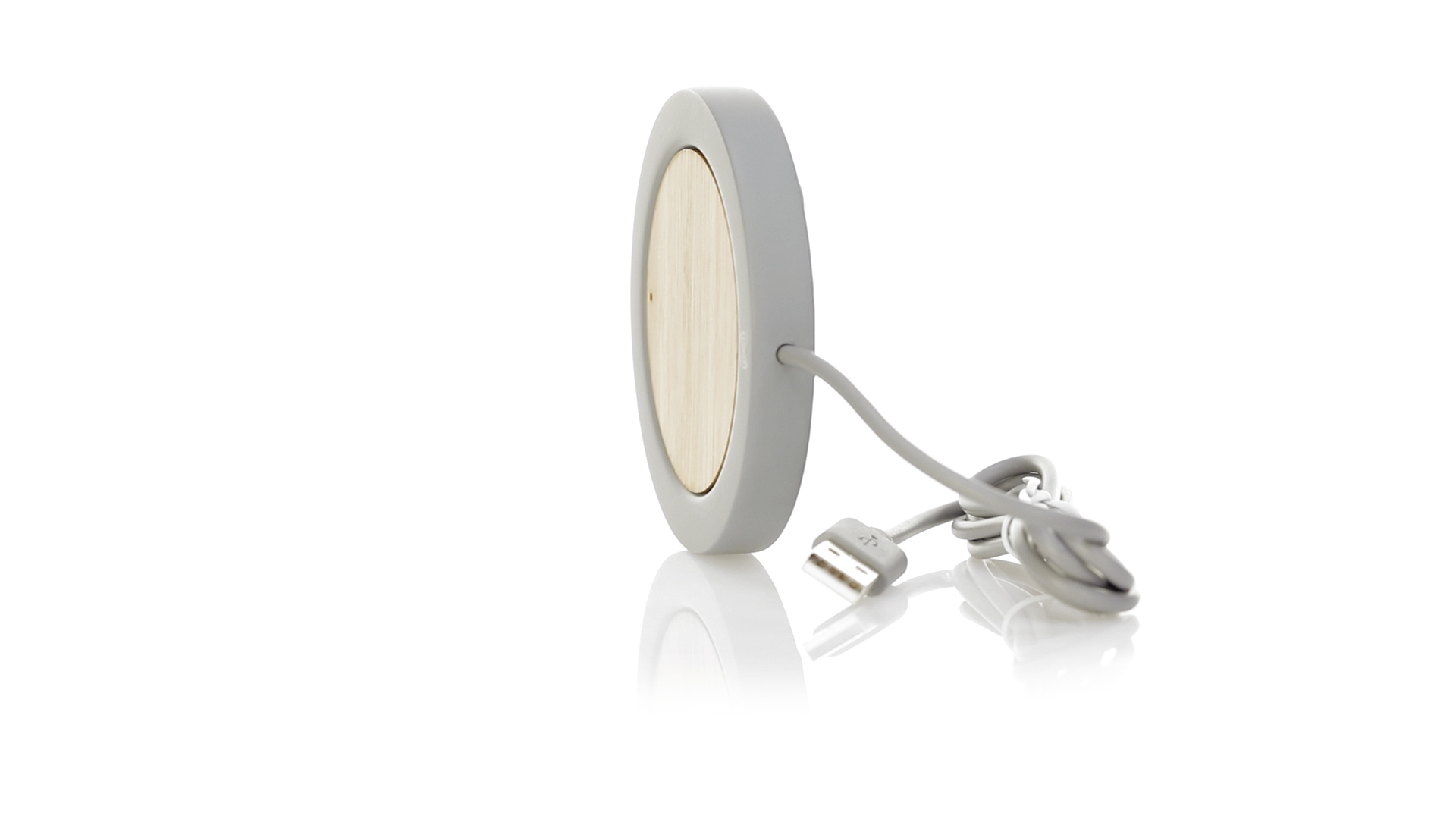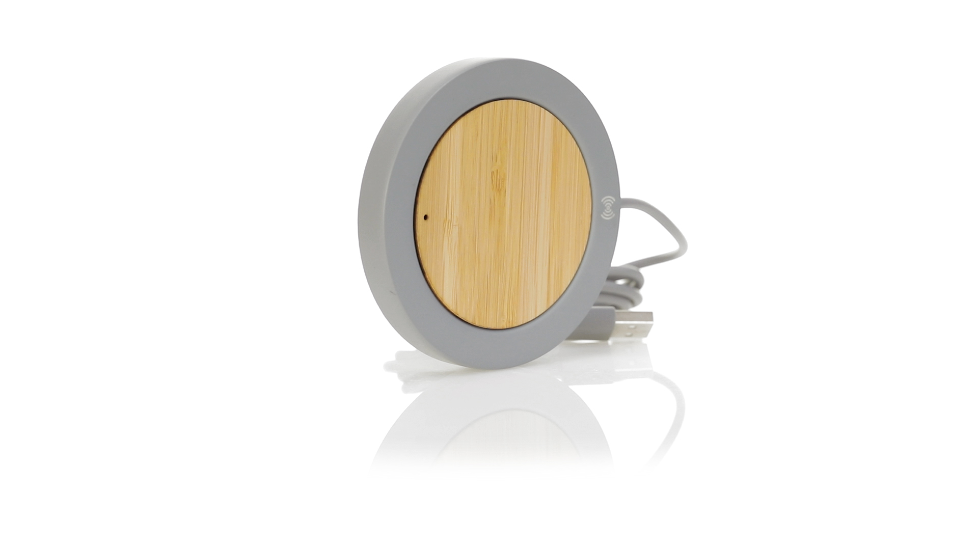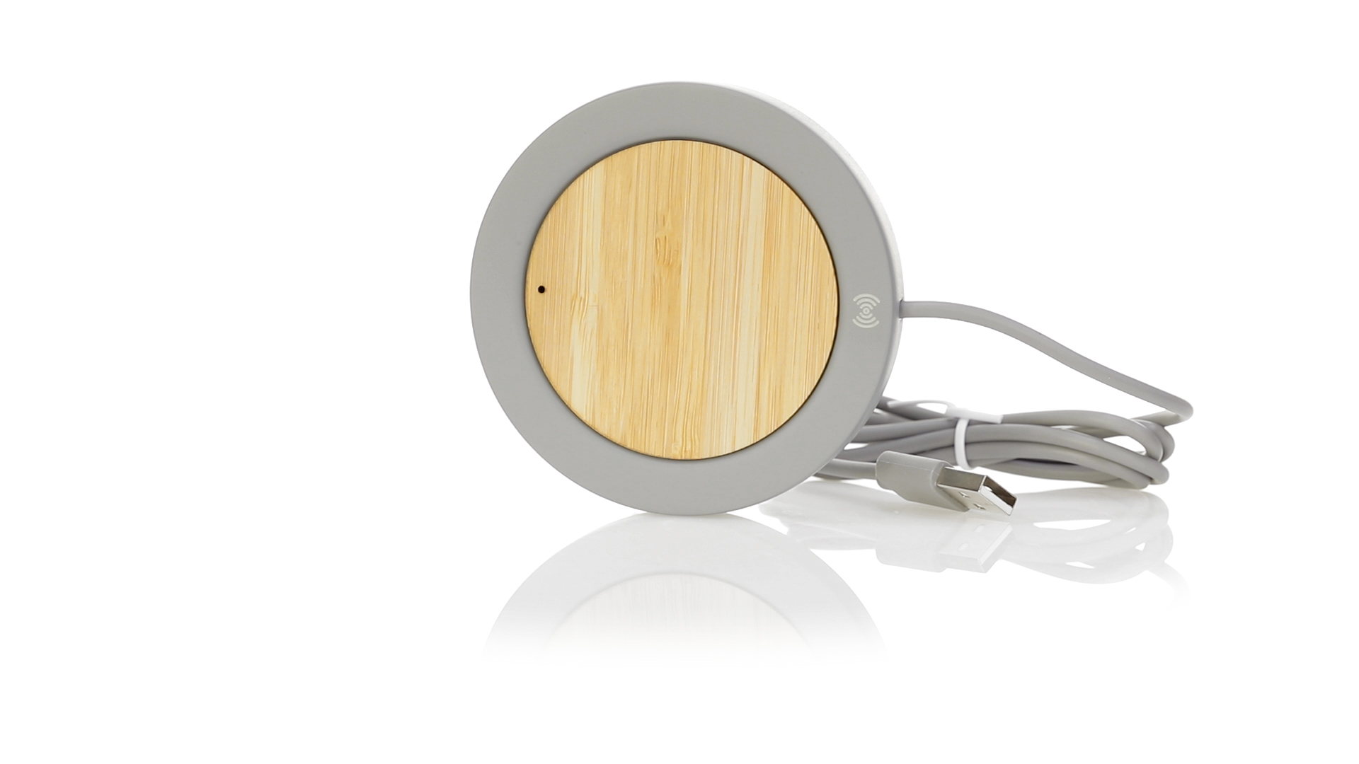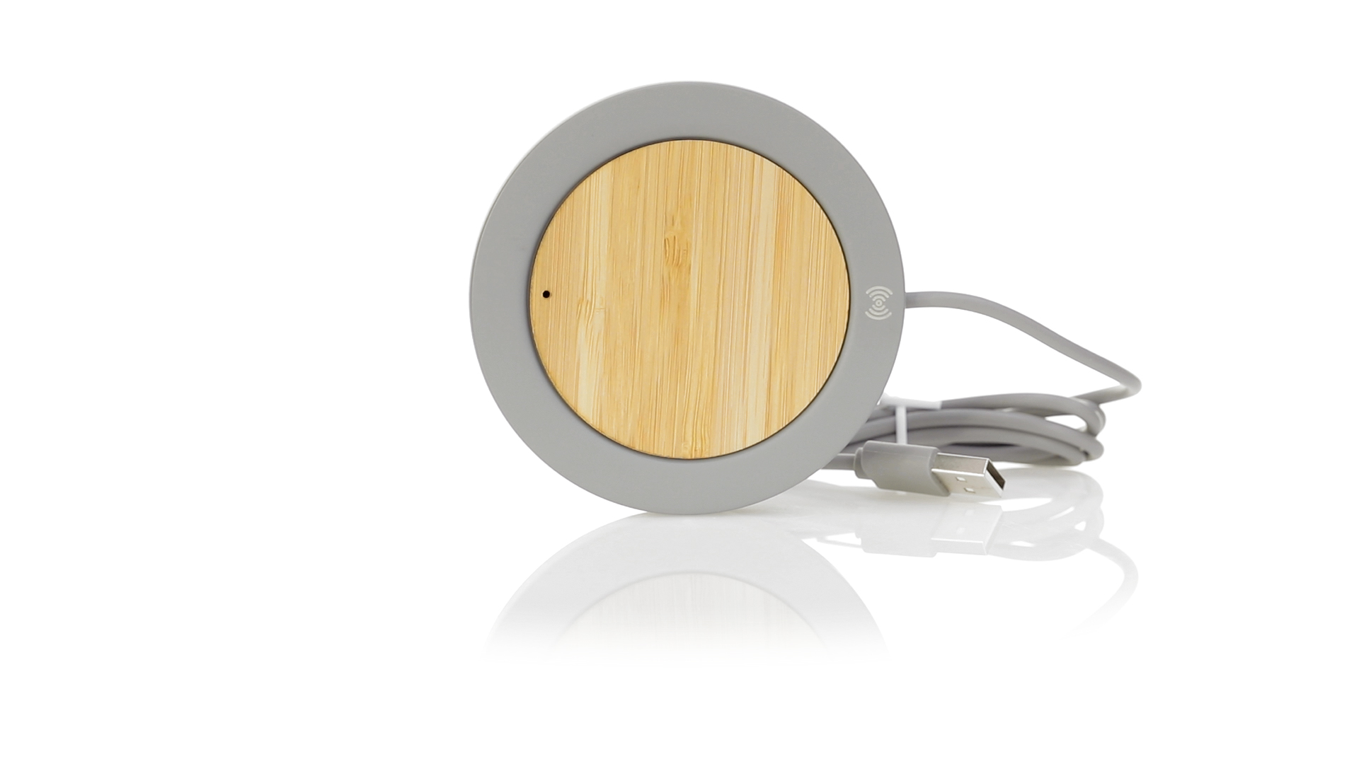 Drahtloses Ladegerät mit rundem Design in Kombination aus natürlich geschnittenen Bambusstücken und Kalksteinzement, einem Konglomerat, das durch die Mischung natürlicher Materialien, hauptsächlich gemahlener Kalkstein und Wasser, gebildet wird, wodurch ein Material von grosser Konsistenz und Haltbarkeit entsteht.USB-Ladekabel in passender Farbe, kompatibel mit Geräten, die mit drahtloser Ladetechnologie ausgestattet sind. Sicherheitsschutz zur Vermeidung von Überhitzung, Überladung und Kurzschluss. Präsentiert in einer attraktiven Design-Box.