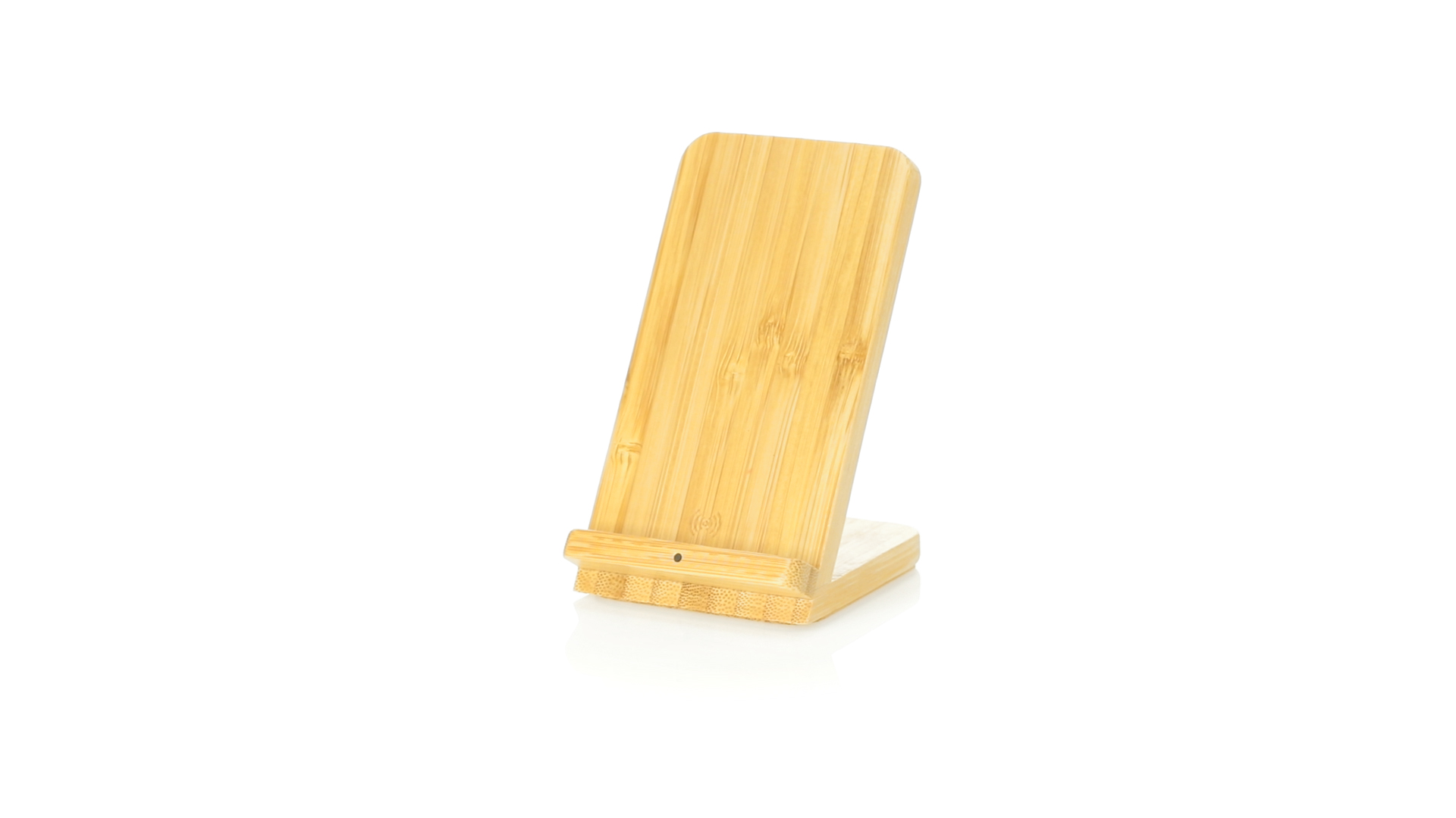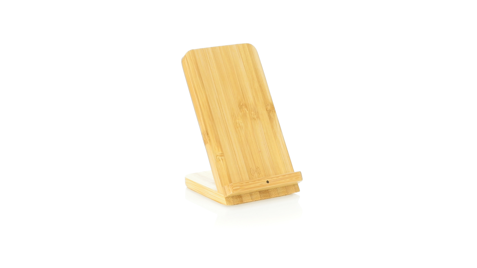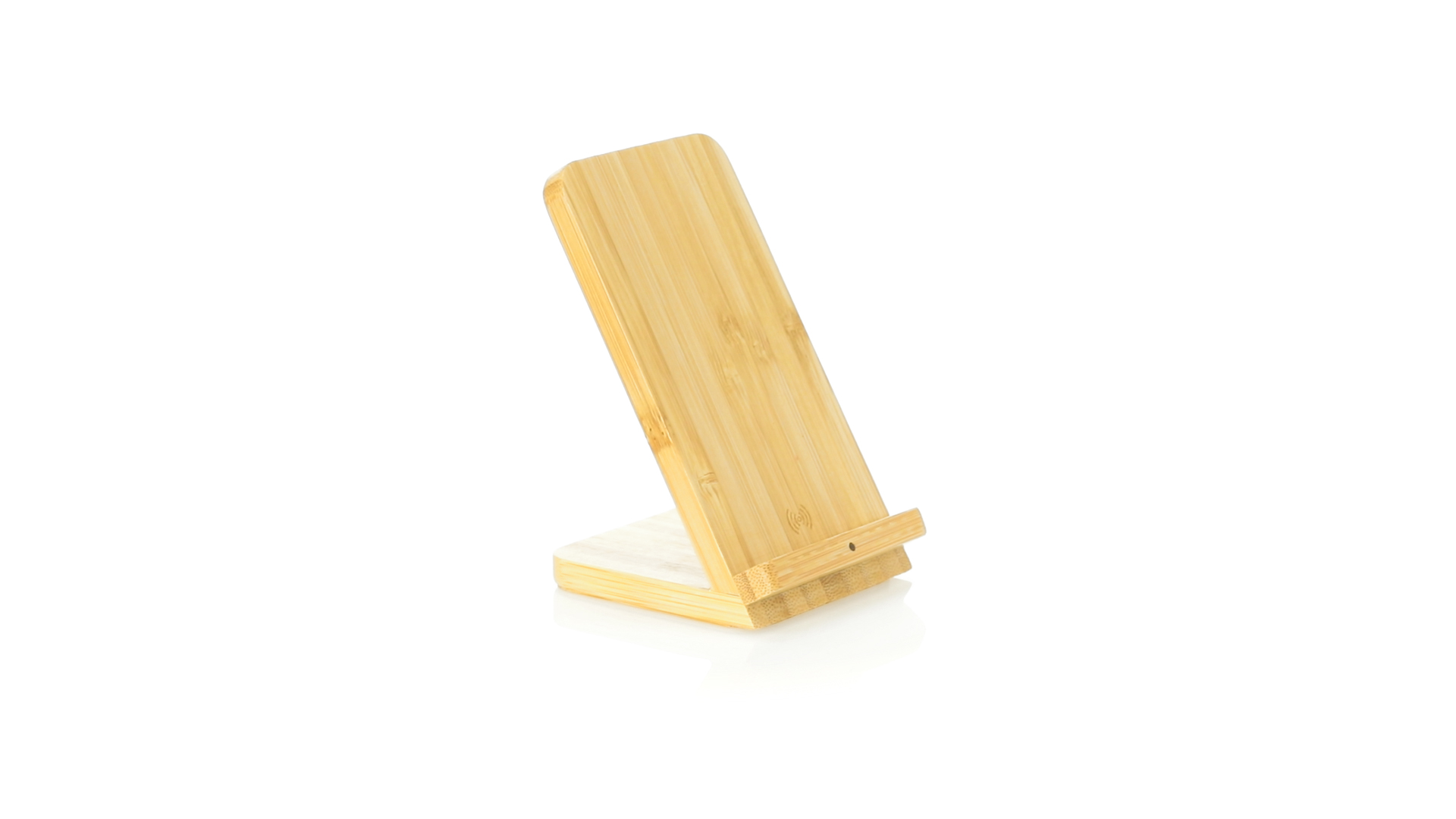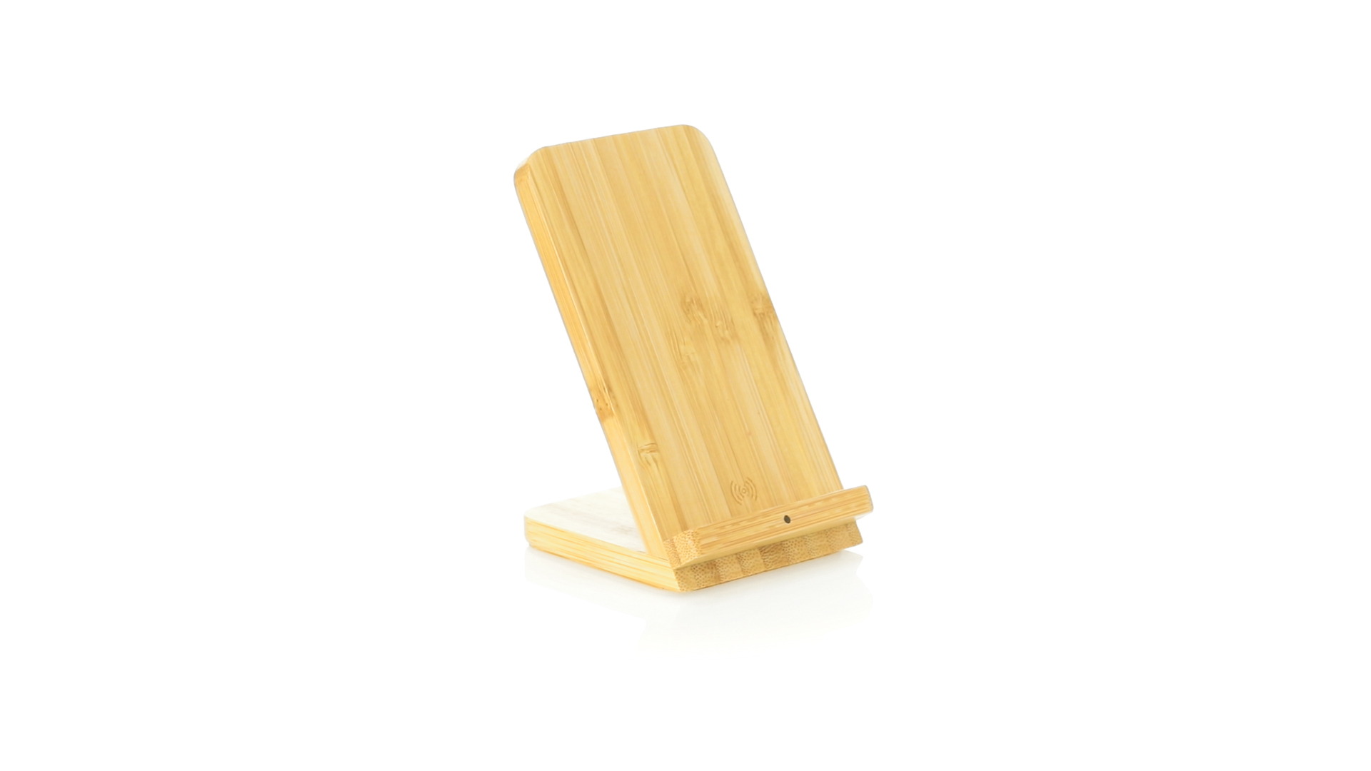 Naturlinie, kabelloses Ladegerät mit Smartphone-Halterungsfunktionalität. Hergestellt aus Bambus, aus natürlich geschnittenen Bambusstücken. Ladeanzeige und kompatibel mit Geräten, die mit drahtloser Ladetechnologie ausgestattet sind. Grosser Druckbereich und präsentiert in einer attraktiven, individuellen Öko-Design-Box.