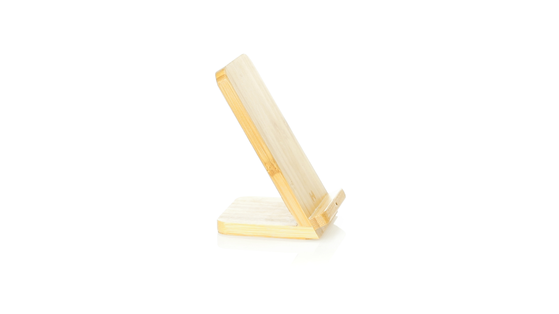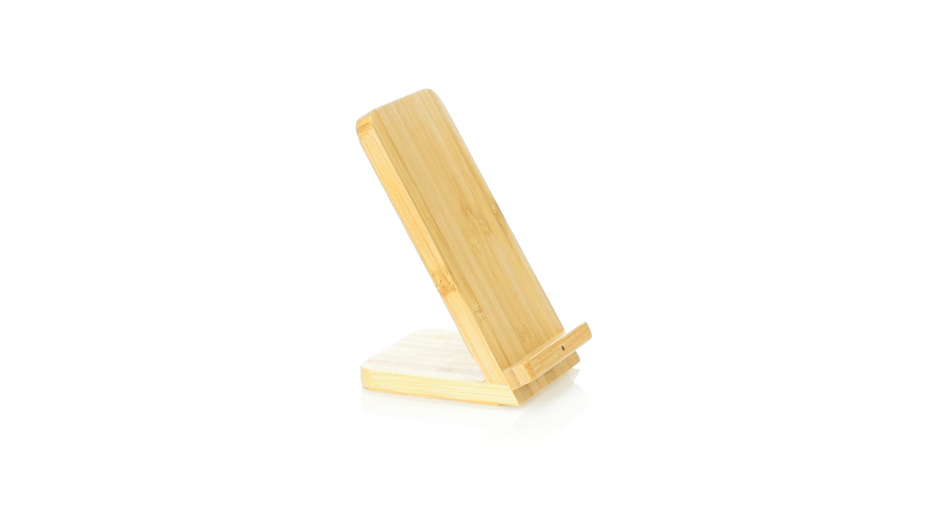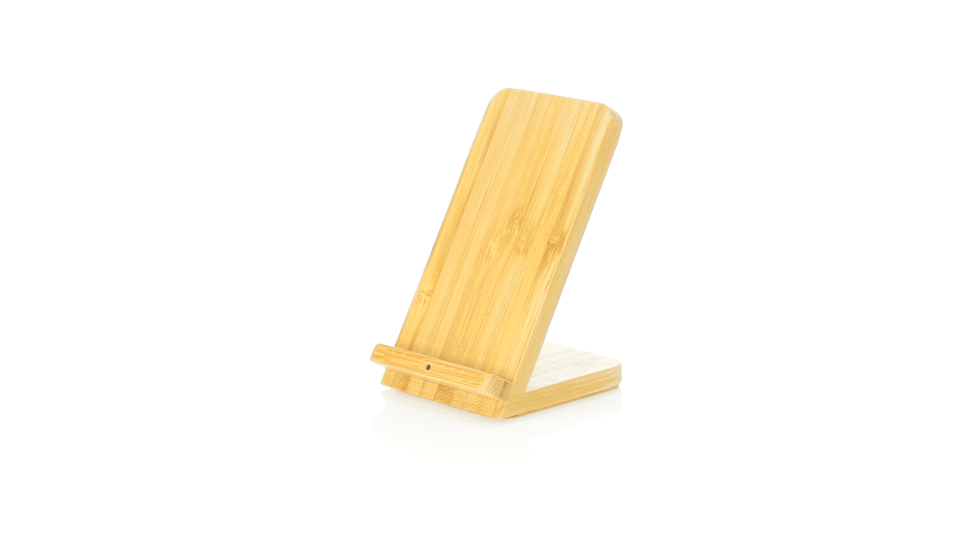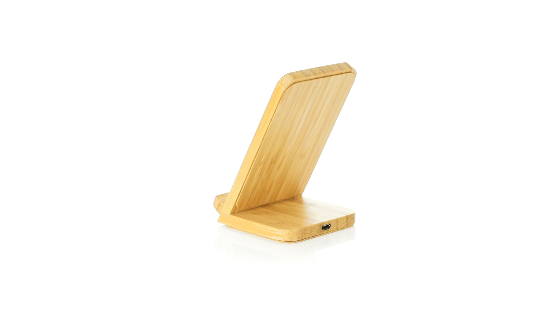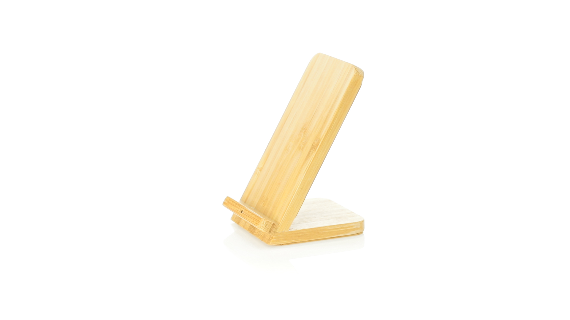 Naturlinie, kabelloses Ladegerät mit Smartphone-Halterungsfunktionalität. Hergestellt aus Bambus, aus natürlich geschnittenen Bambusstücken. Ladeanzeige und kompatibel mit Geräten, die mit drahtloser Ladetechnologie ausgestattet sind. Grosser Druckbereich und präsentiert in einer attraktiven, individuellen Öko-Design-Box.