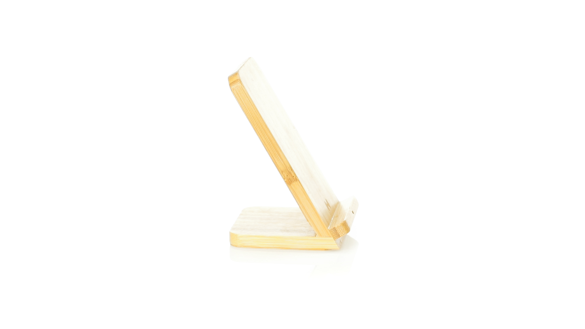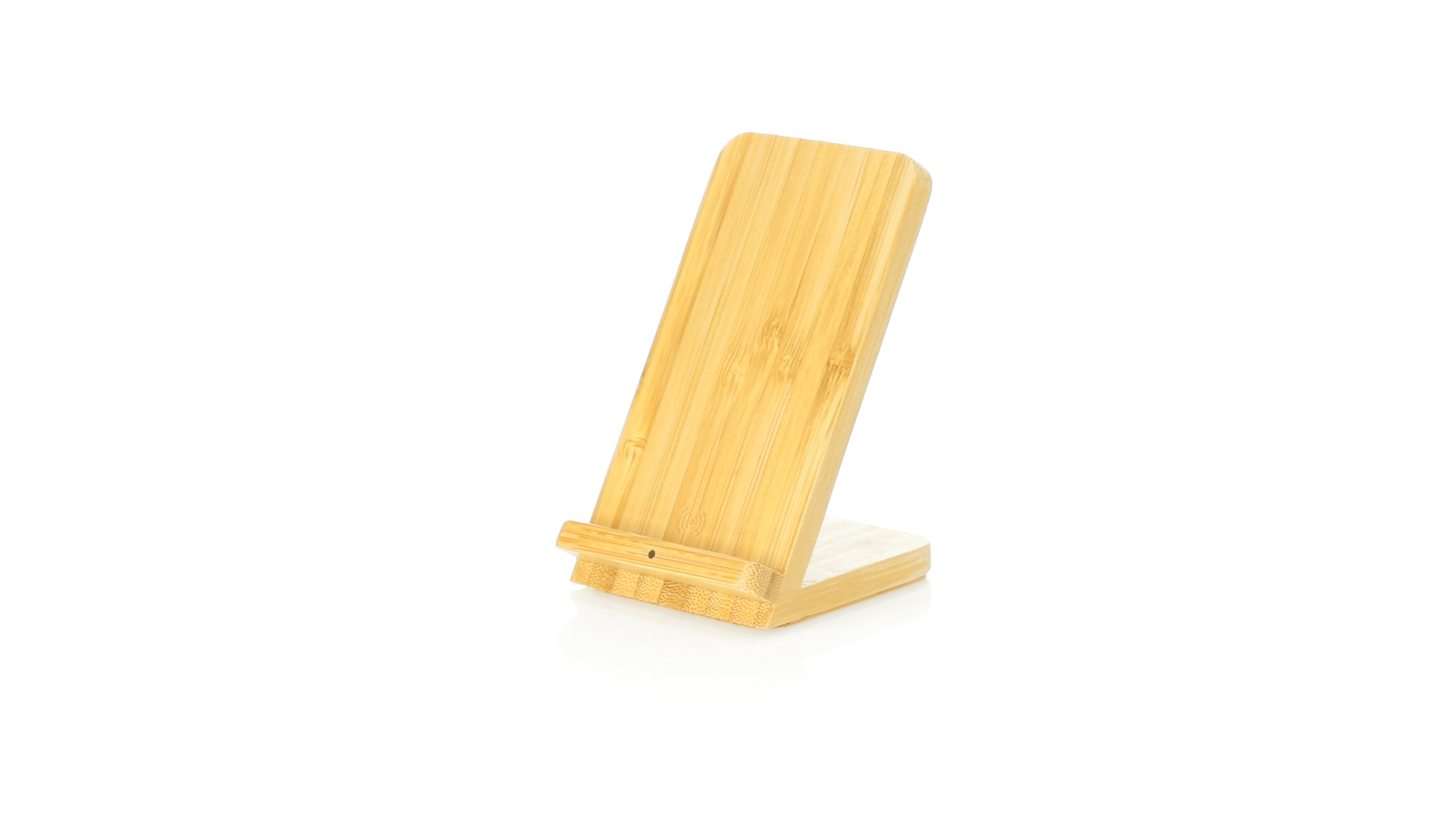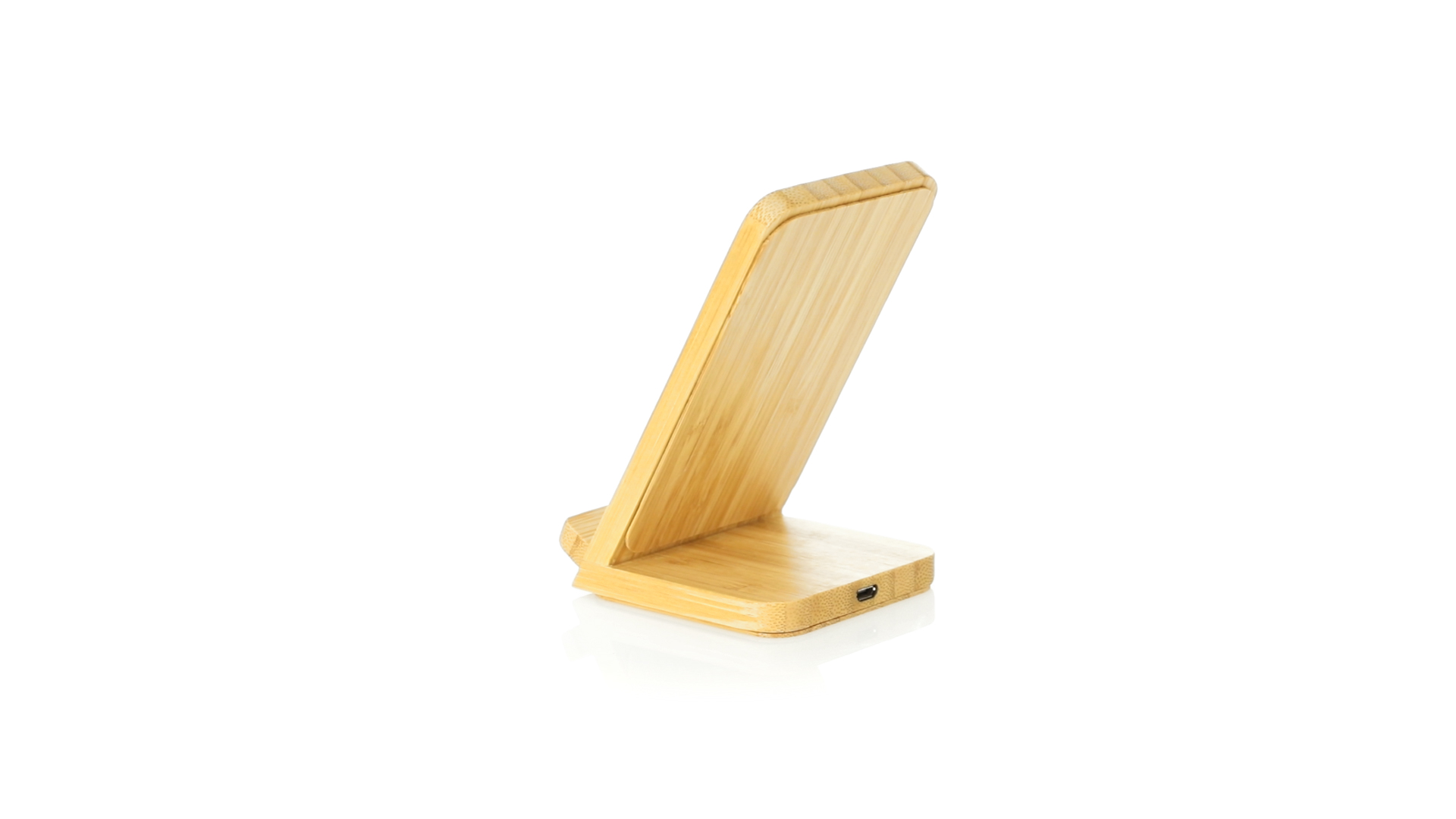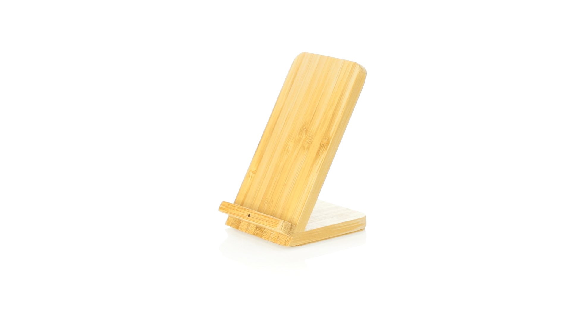 Naturlinie, kabelloses Ladegerät mit Smartphone-Halterungsfunktionalität. Hergestellt aus Bambus, aus natürlich geschnittenen Bambusstücken. Ladeanzeige und kompatibel mit Geräten, die mit drahtloser Ladetechnologie ausgestattet sind. Grosser Druckbereich und präsentiert in einer attraktiven, individuellen Öko-Design-Box.