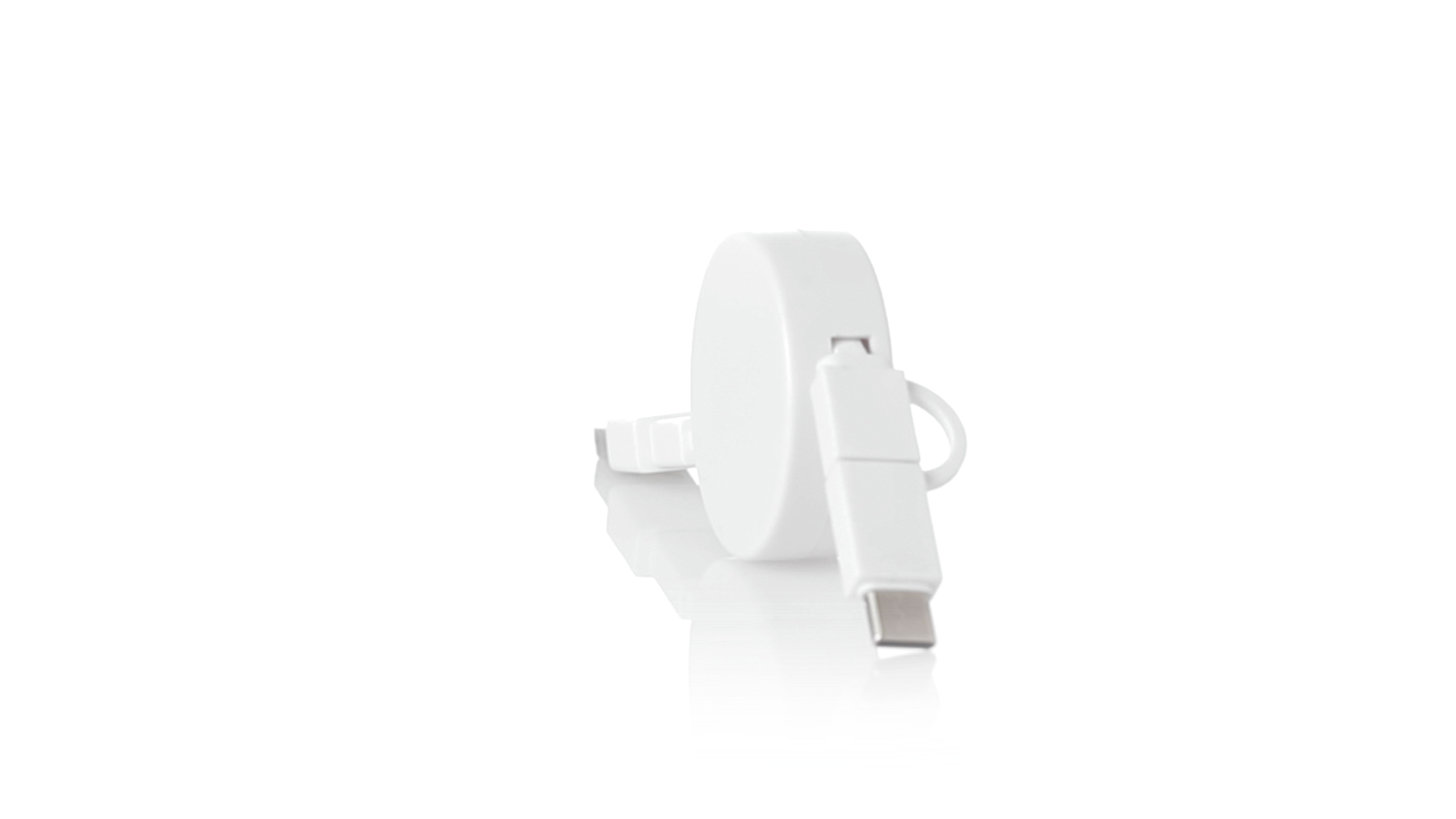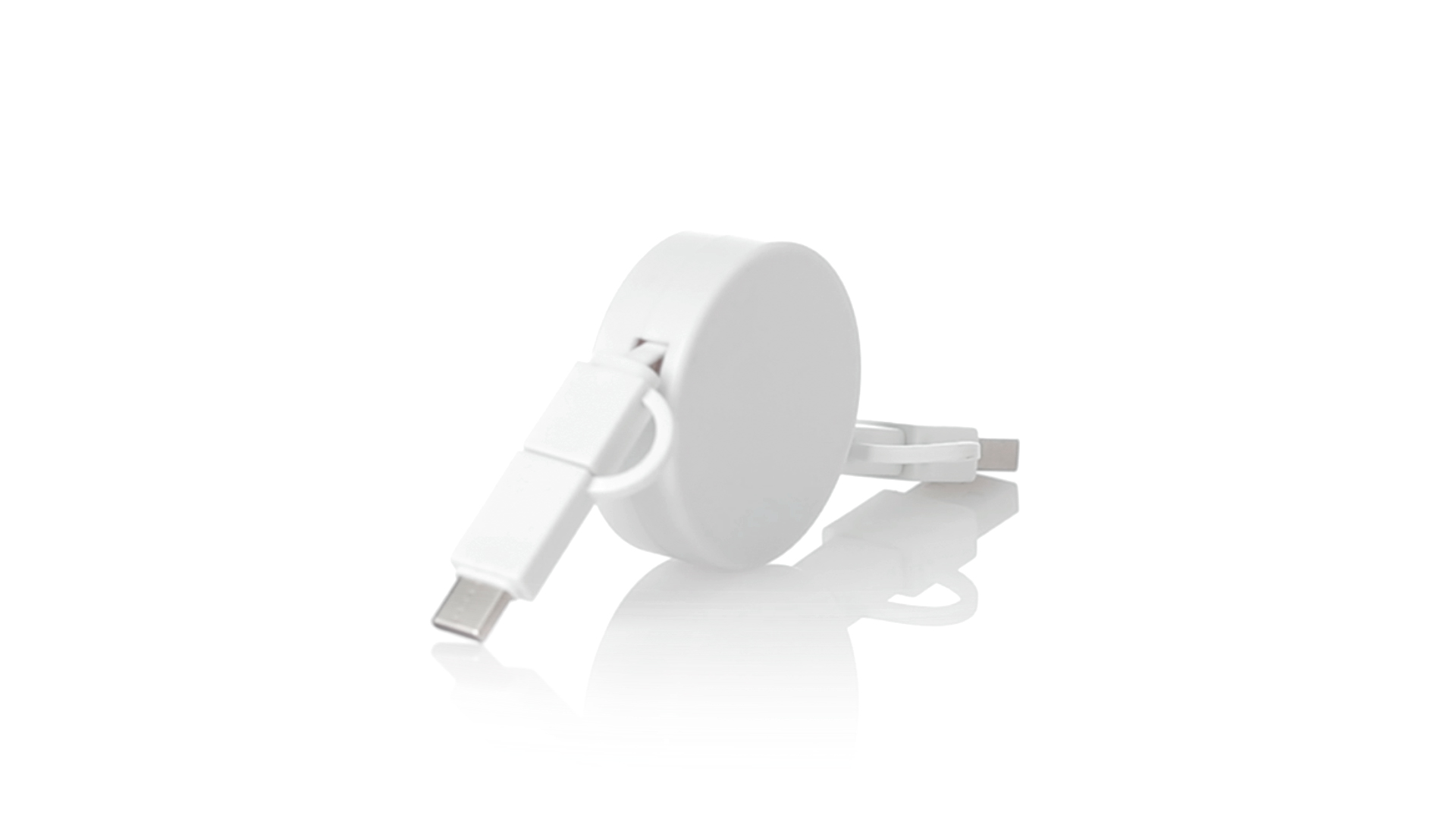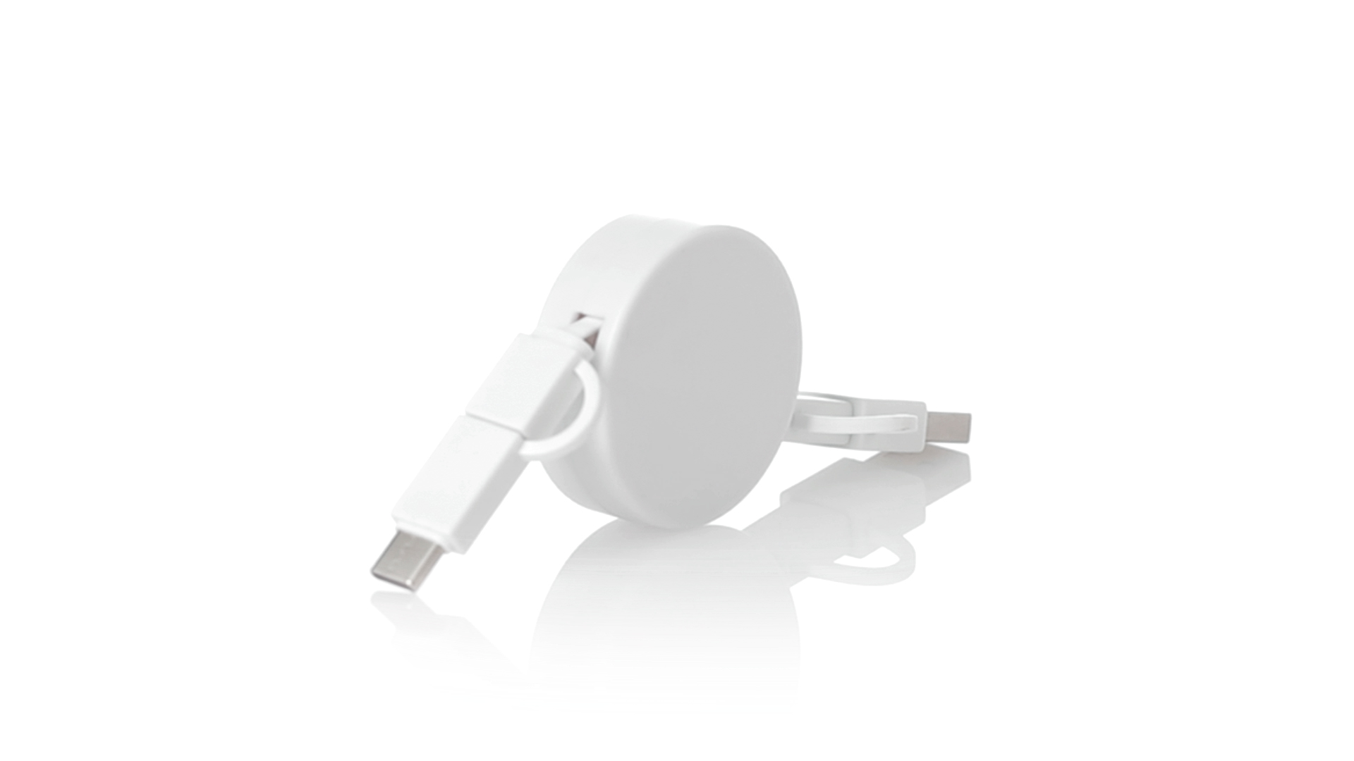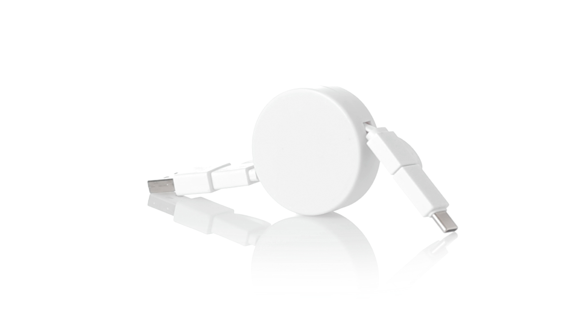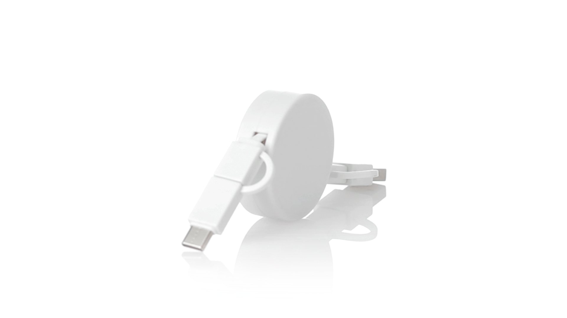 Ultrakompaktes Design, ausziehbares Ladegerät. Anschlüsse Typ C (Eingang und Ausgang) und Dual Micro USB/Lightning. Auflade- und Datenübertragungsfunktion. Breite Brandingfläche und präsentiert in einer individuellen Tasche.