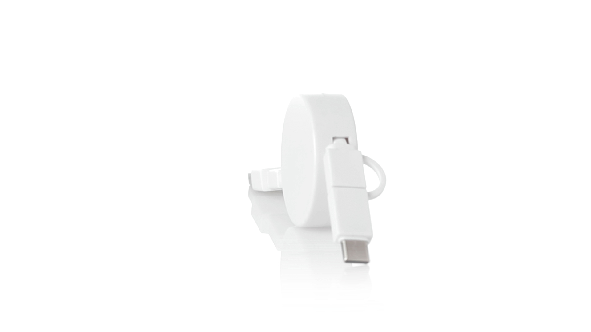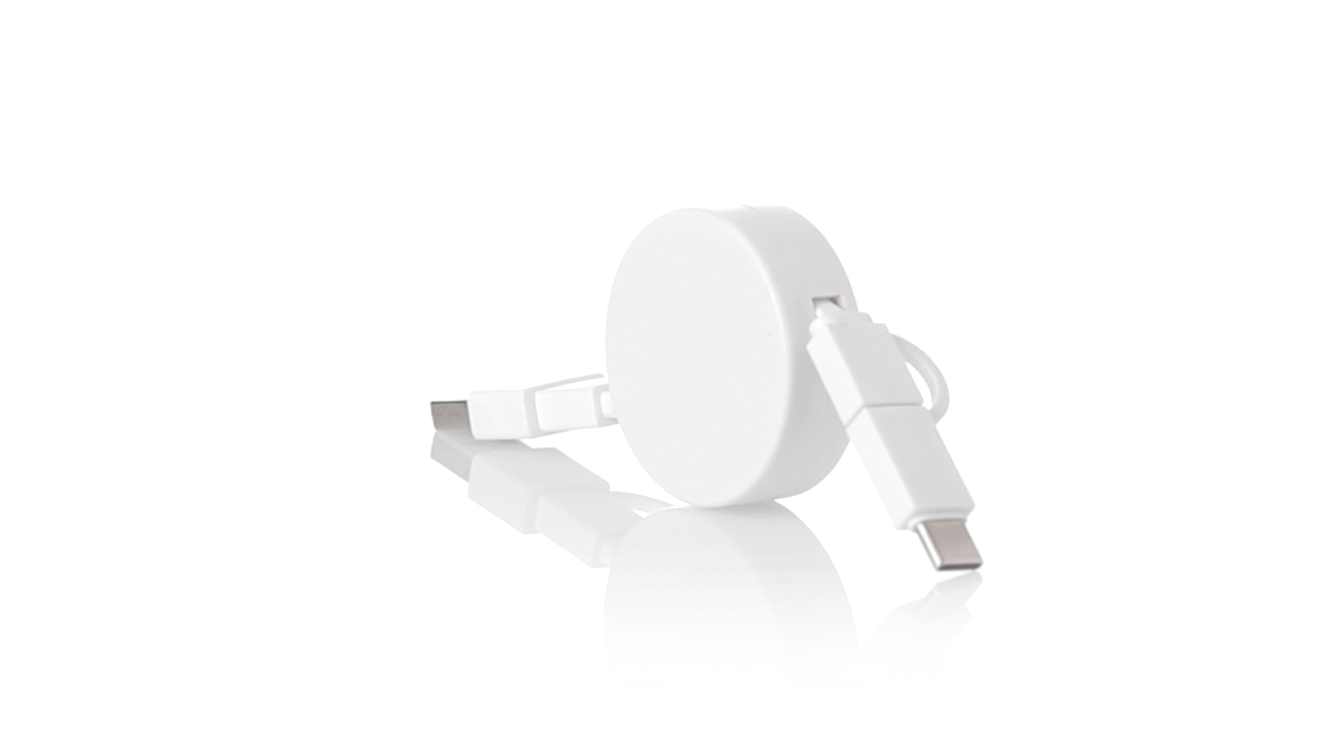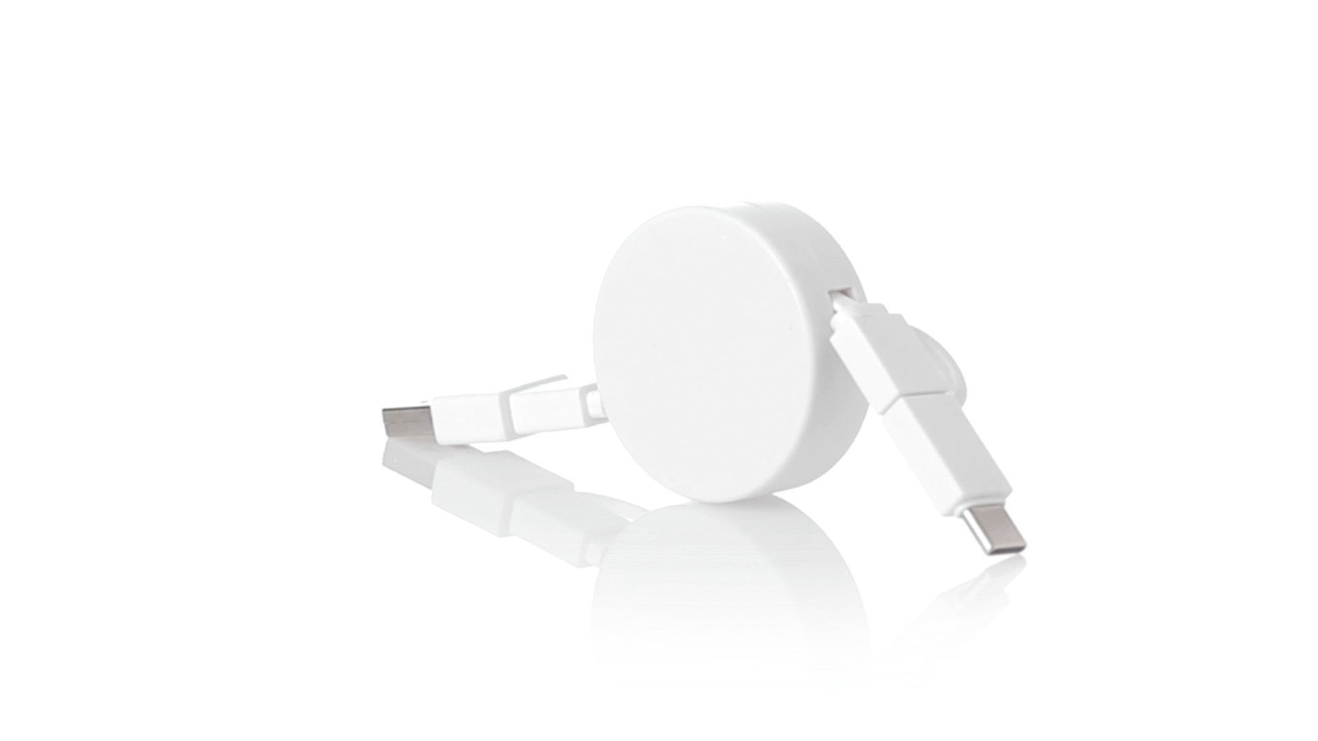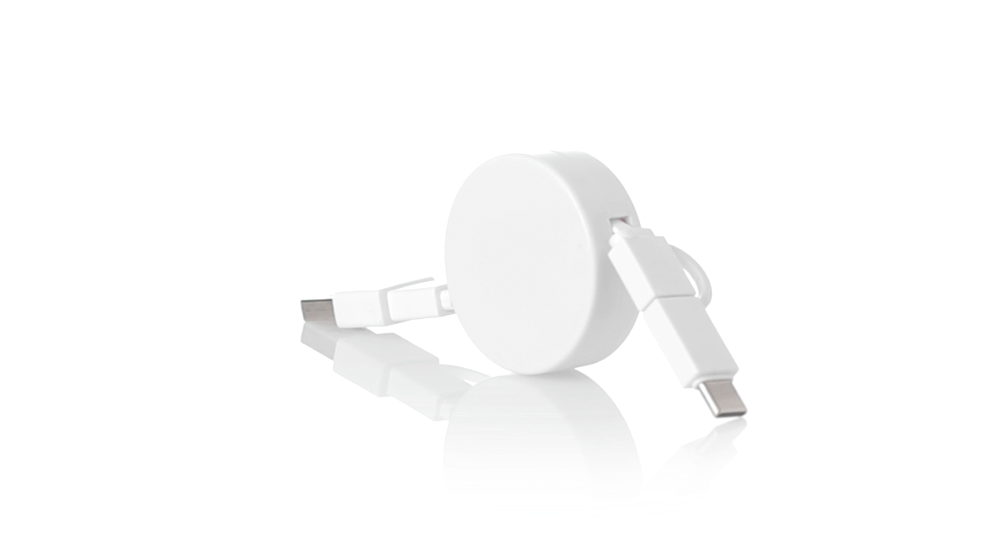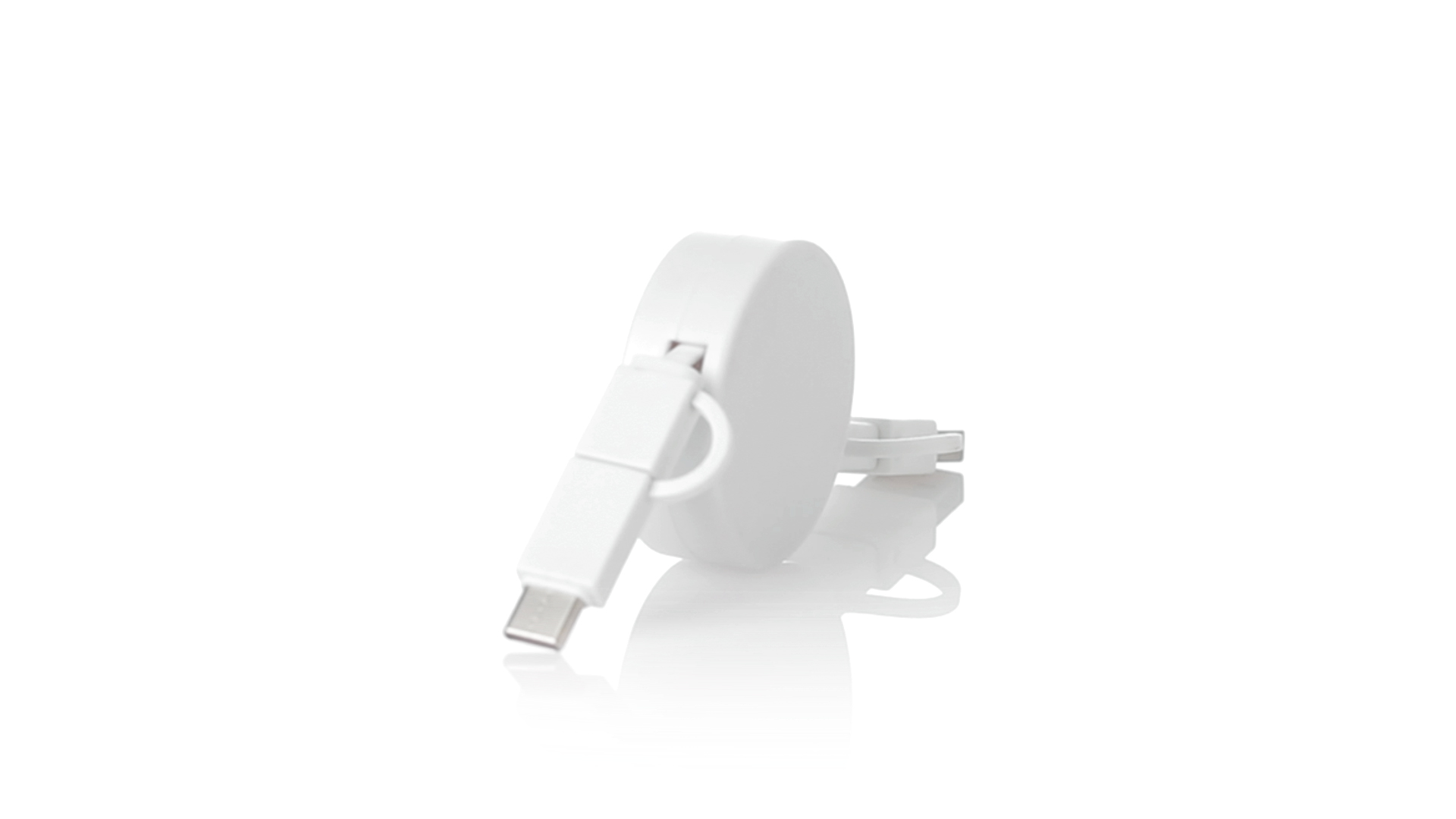 Ultrakompaktes Design, ausziehbares Ladegerät. Anschlüsse Typ C (Eingang und Ausgang) und Dual Micro USB/Lightning. Auflade- und Datenübertragungsfunktion. Breite Brandingfläche und präsentiert in einer individuellen Tasche.