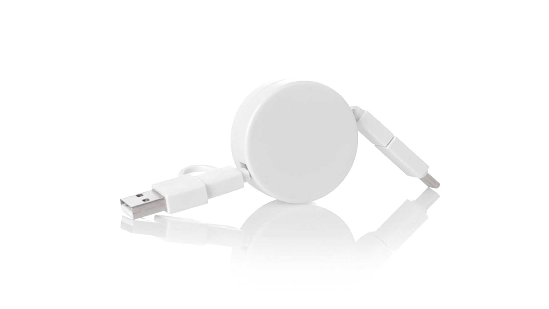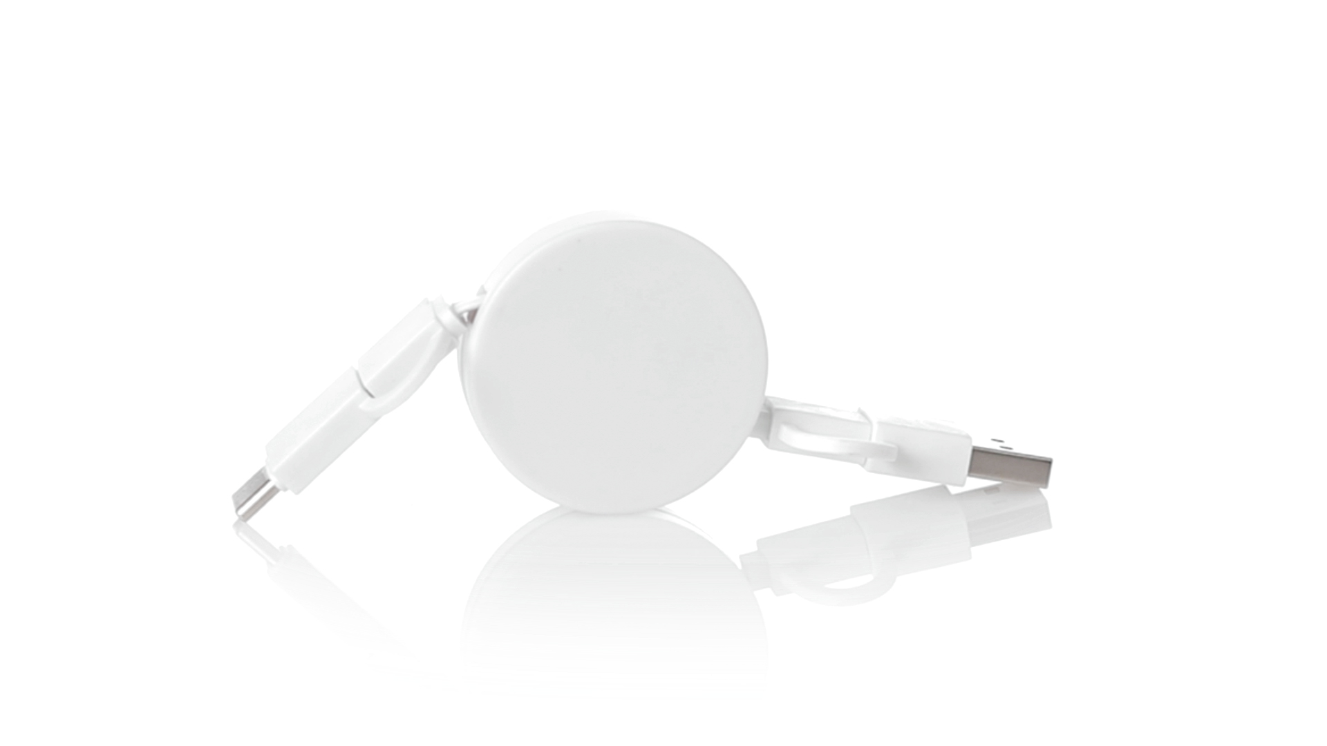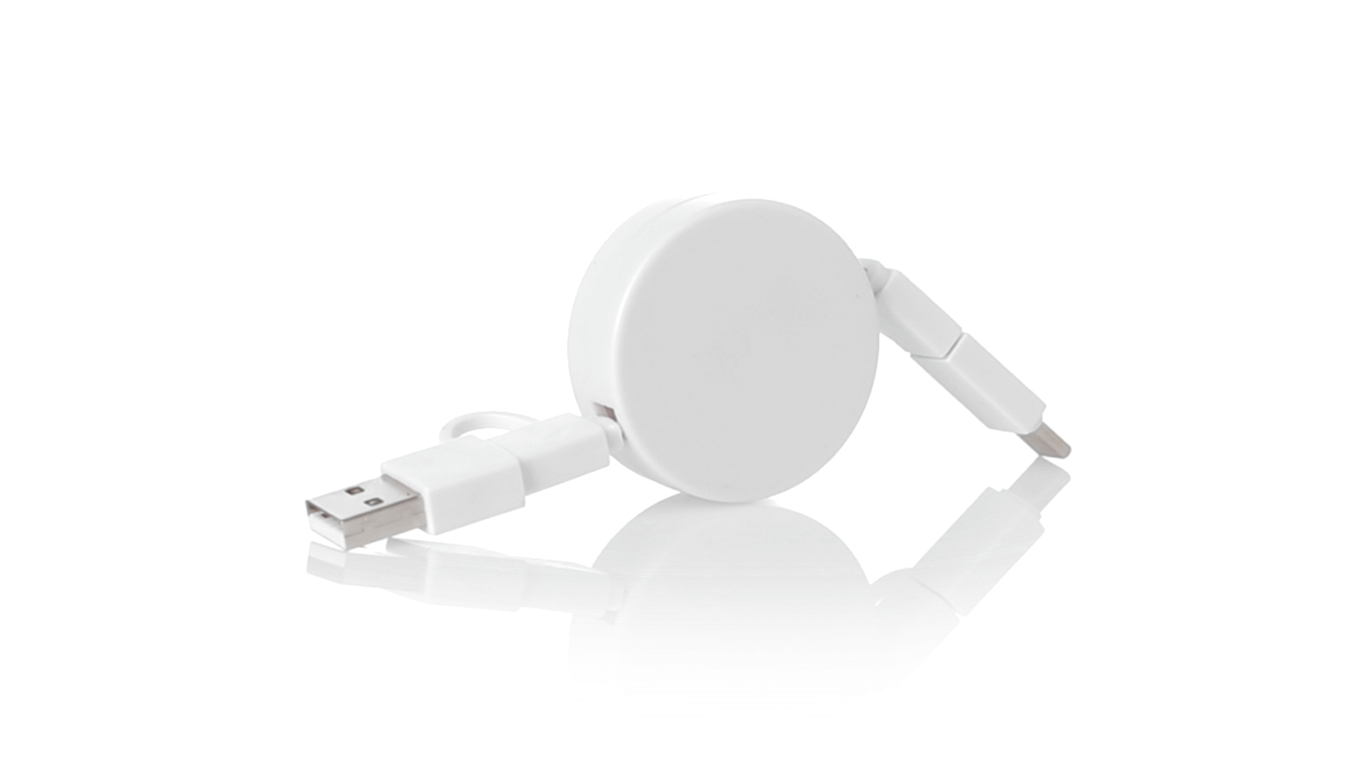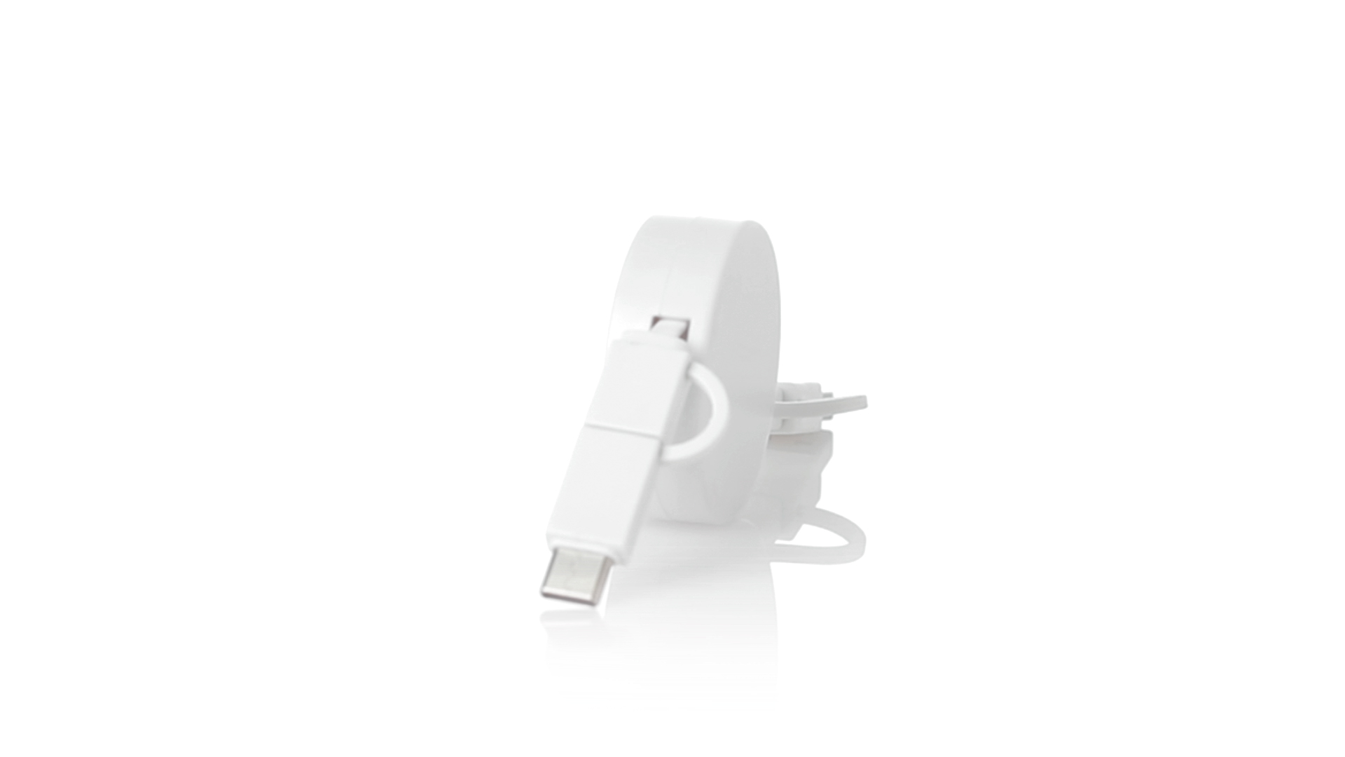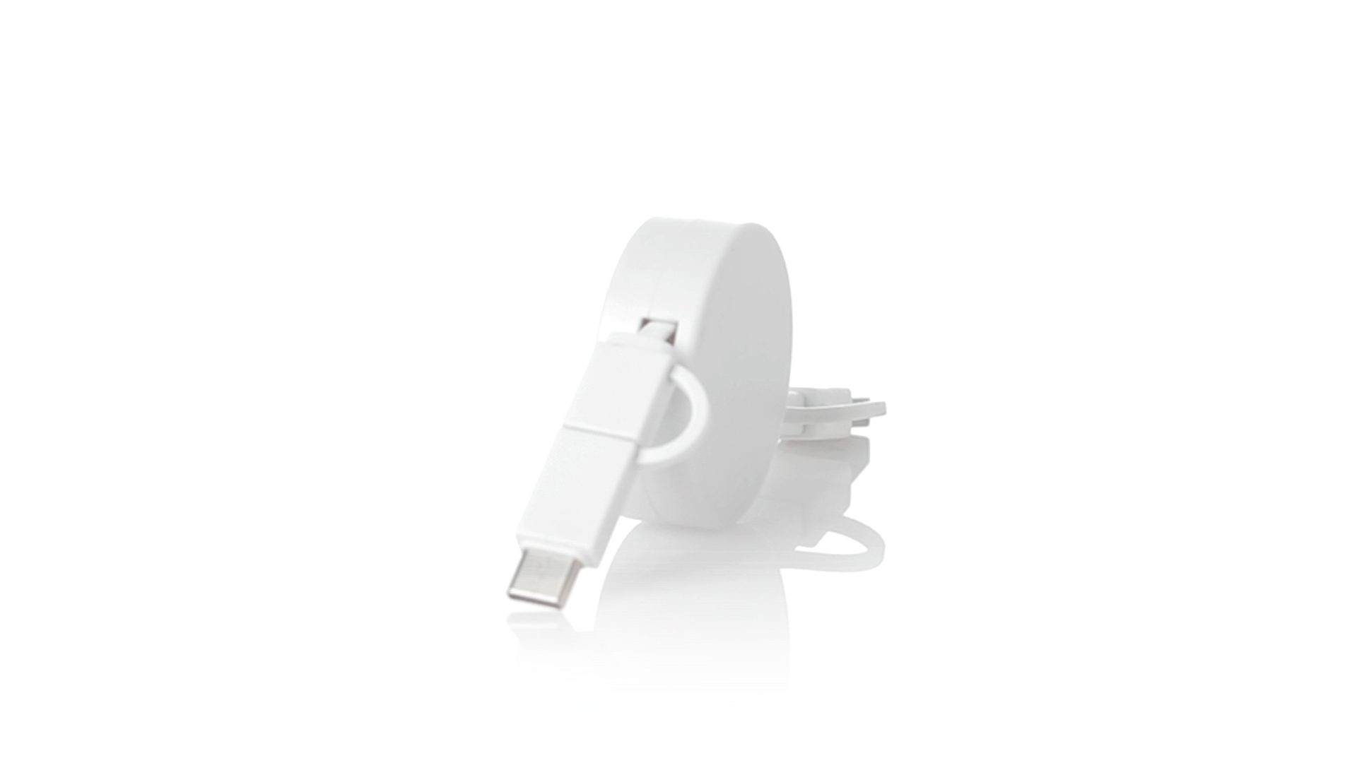 Ultrakompaktes Design, ausziehbares Ladegerät. Anschlüsse Typ C (Eingang und Ausgang) und Dual Micro USB/Lightning. Auflade- und Datenübertragungsfunktion. Breite Brandingfläche und präsentiert in einer individuellen Tasche.