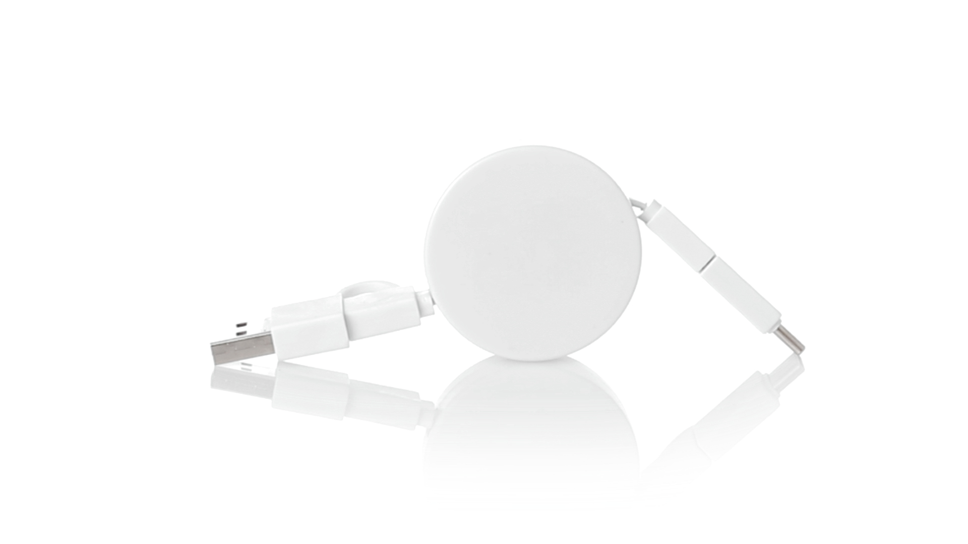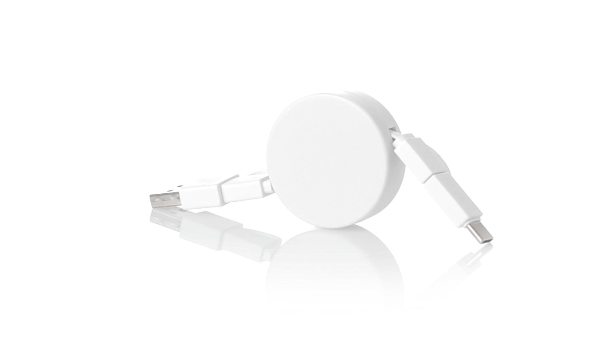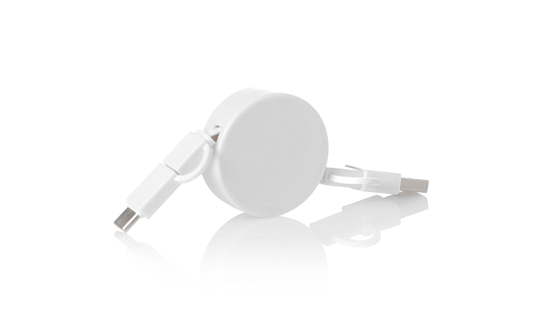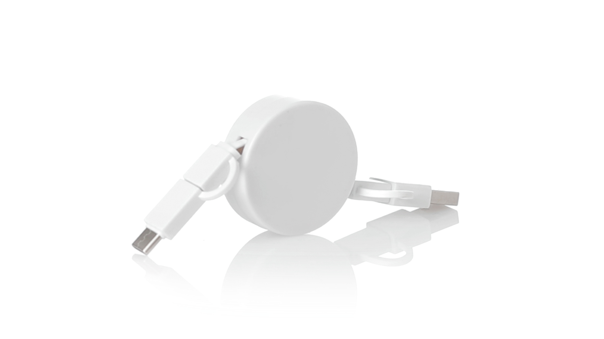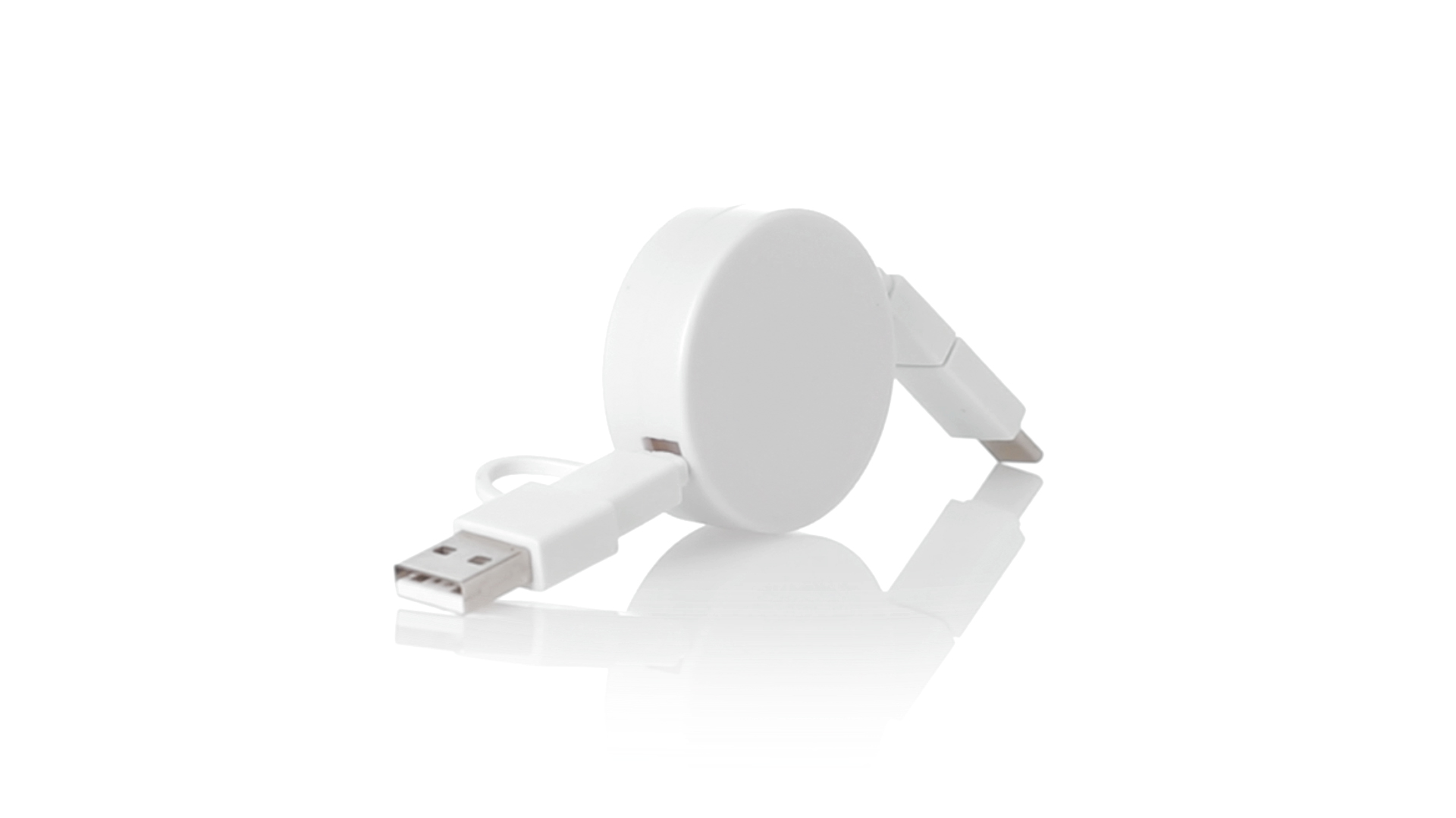 Ultrakompaktes Design, ausziehbares Ladegerät. Anschlüsse Typ C (Eingang und Ausgang) und Dual Micro USB/Lightning. Auflade- und Datenübertragungsfunktion. Breite Brandingfläche und präsentiert in einer individuellen Tasche.