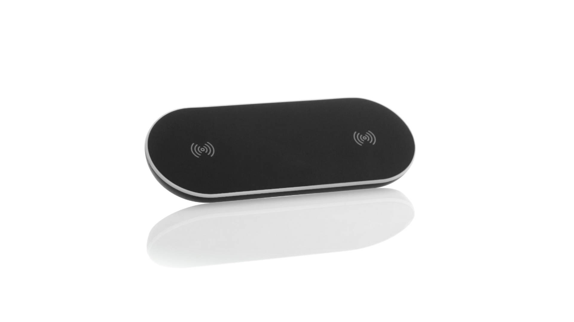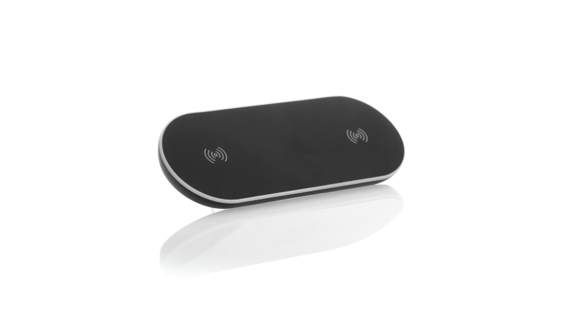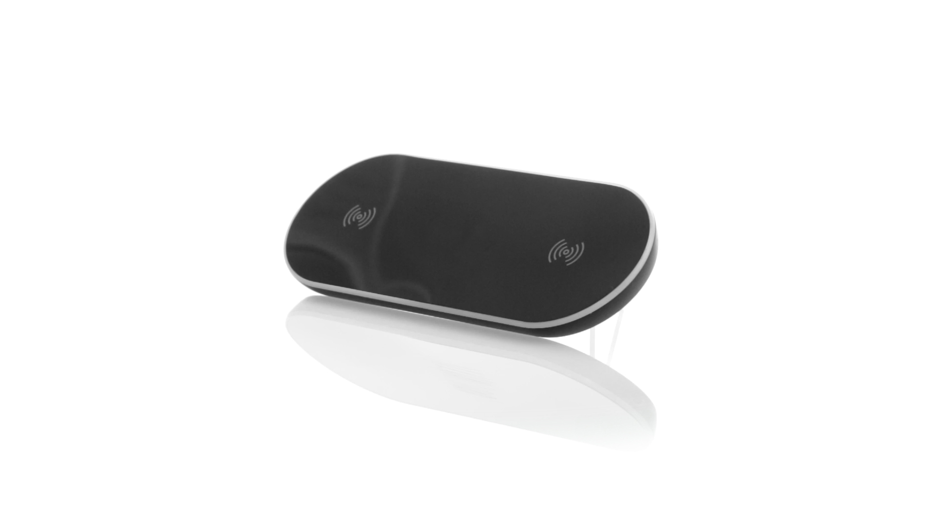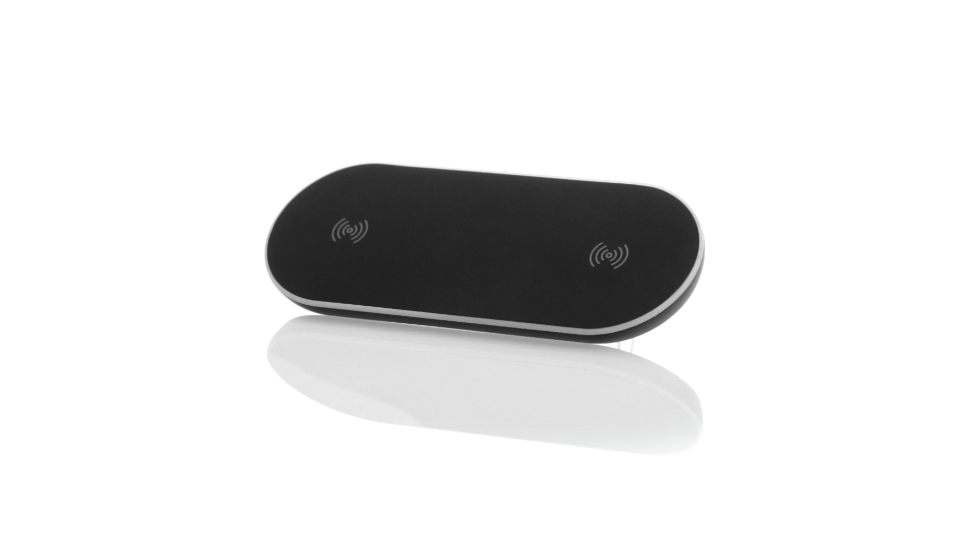Cargador inalámbrico para carga simultánea de hasta 2 dispositivos. En elegante color negro, con luz led interior y un recubrimiento exterior especialmente diseñado para marcaje en láser, con el que conseguirá que su publicidad o marca quede iluminada con luz blanca. Base antideslizante y compatible con dispositivos equipados con tecnología de carga inalámbrica. Presentado en atractiva caja de diseño. Cable USB incluido.