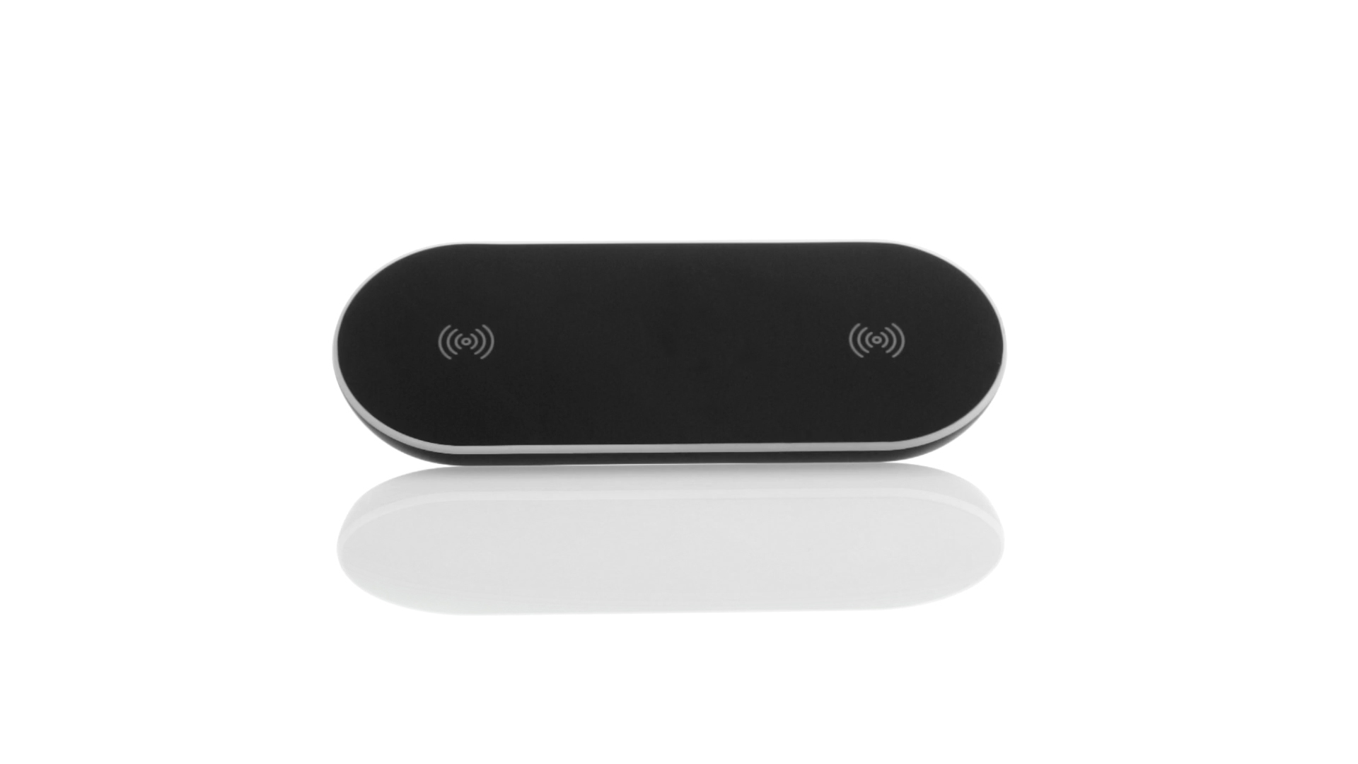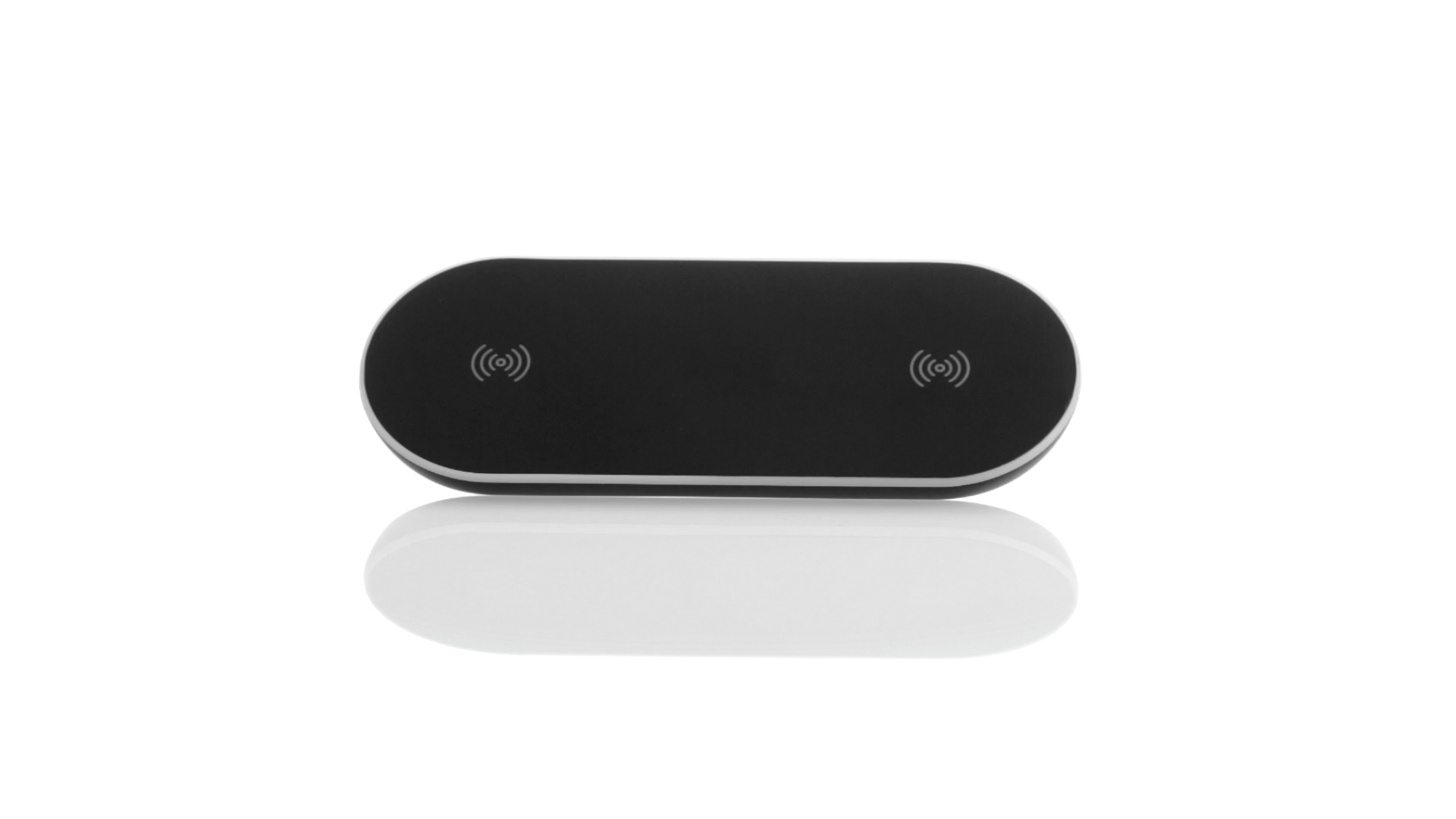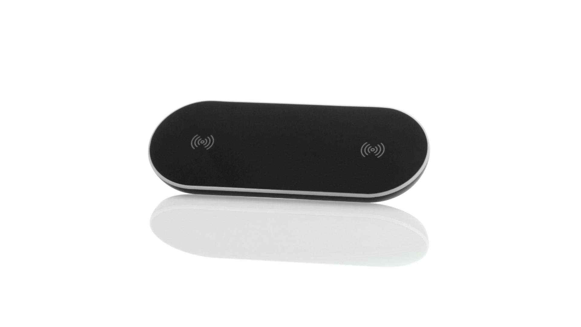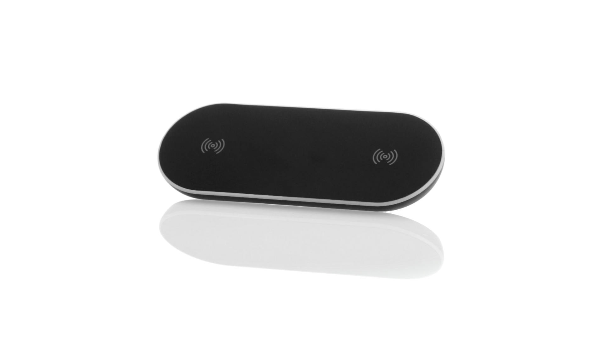 Cargador inalámbrico para carga simultánea de hasta 2 dispositivos. En elegante color negro, con luz led interior y un recubrimiento exterior especialmente diseñado para marcaje en láser, con el que conseguirá que su publicidad o marca quede iluminada con luz blanca. Base antideslizante y compatible con dispositivos equipados con tecnología de carga inalámbrica. Presentado en atractiva caja de diseño. Cable USB incluido.