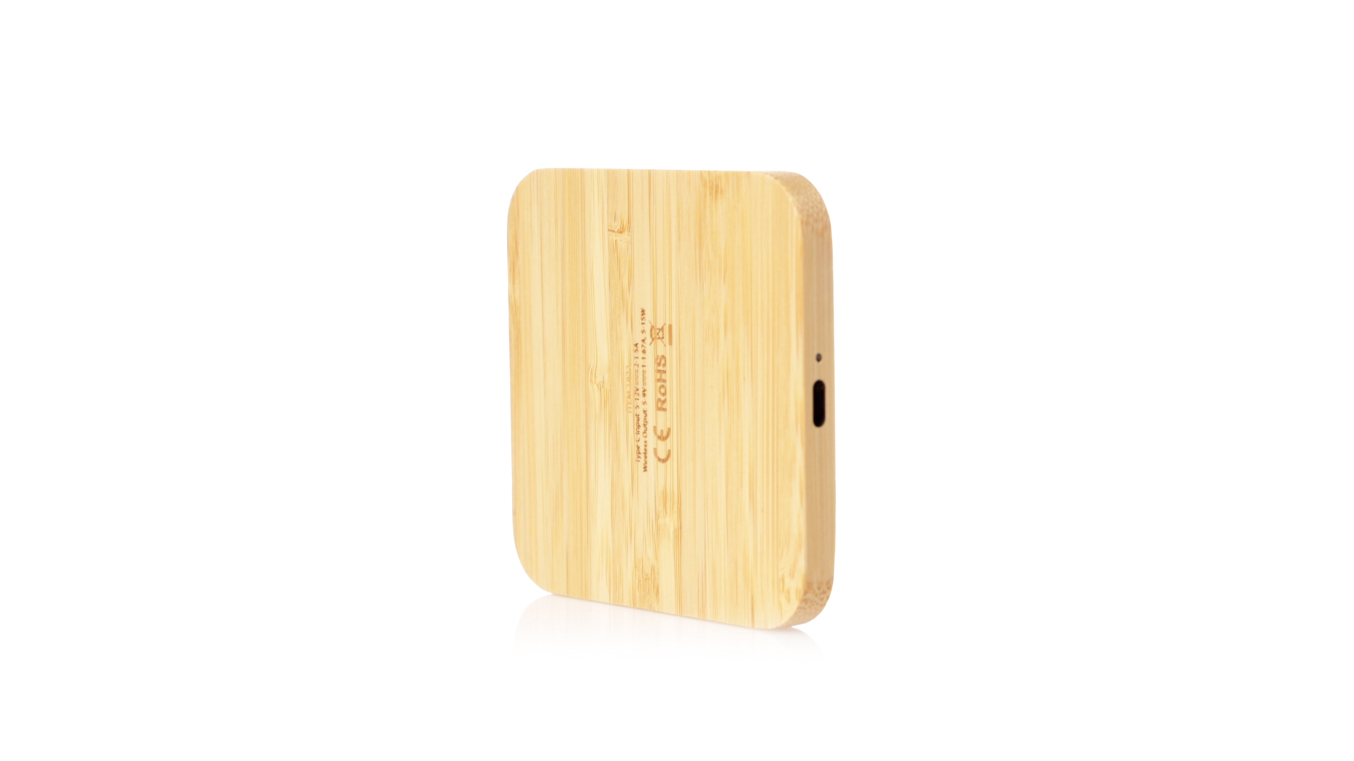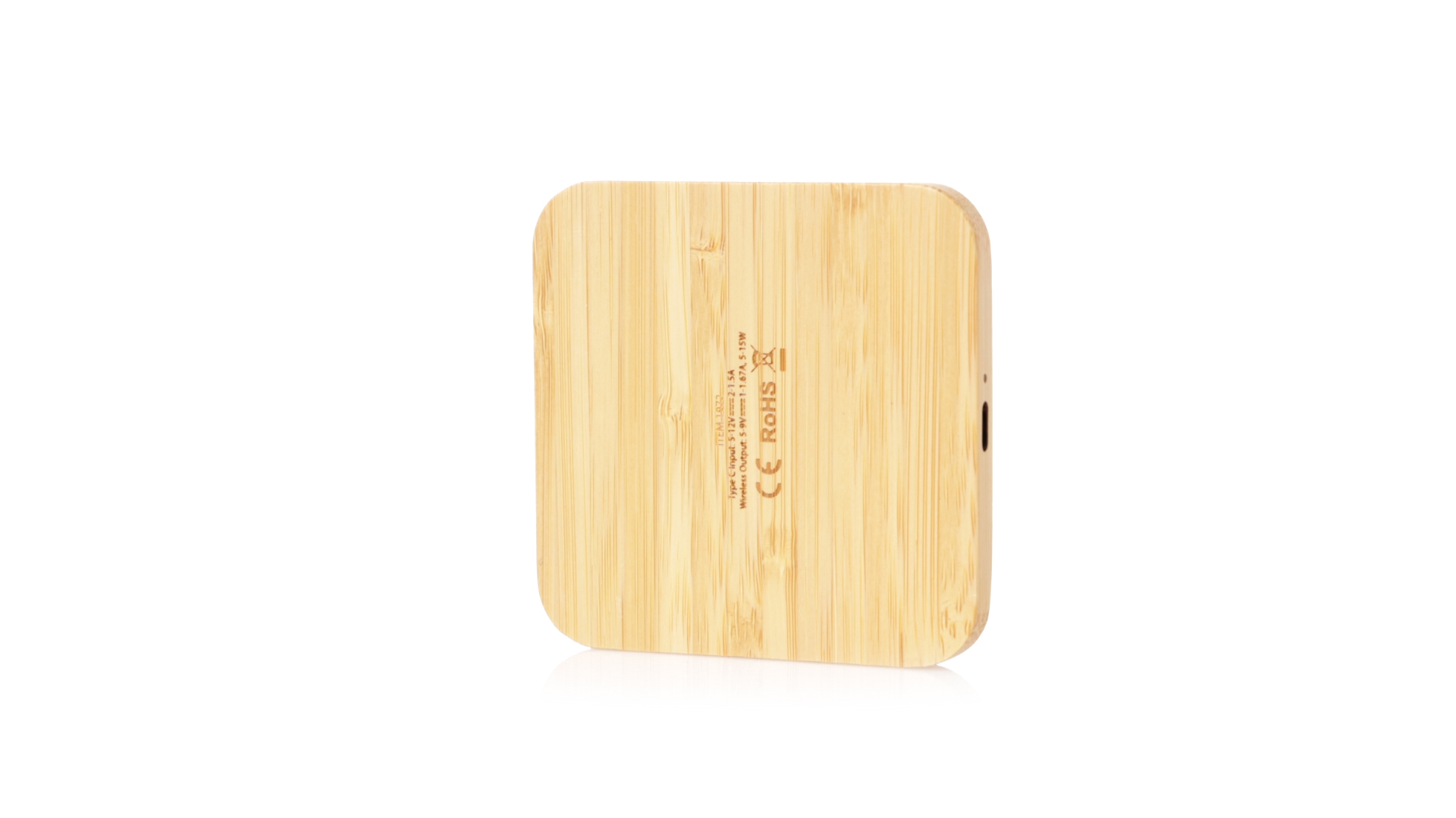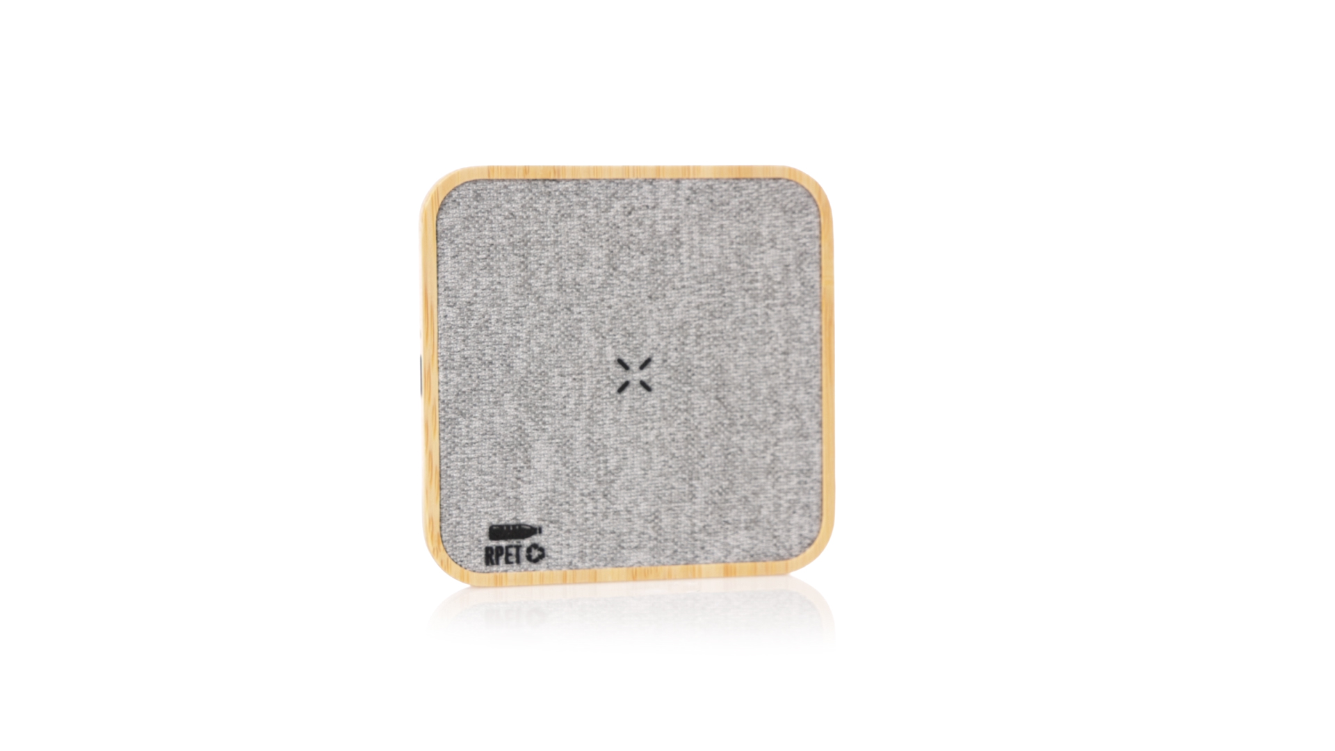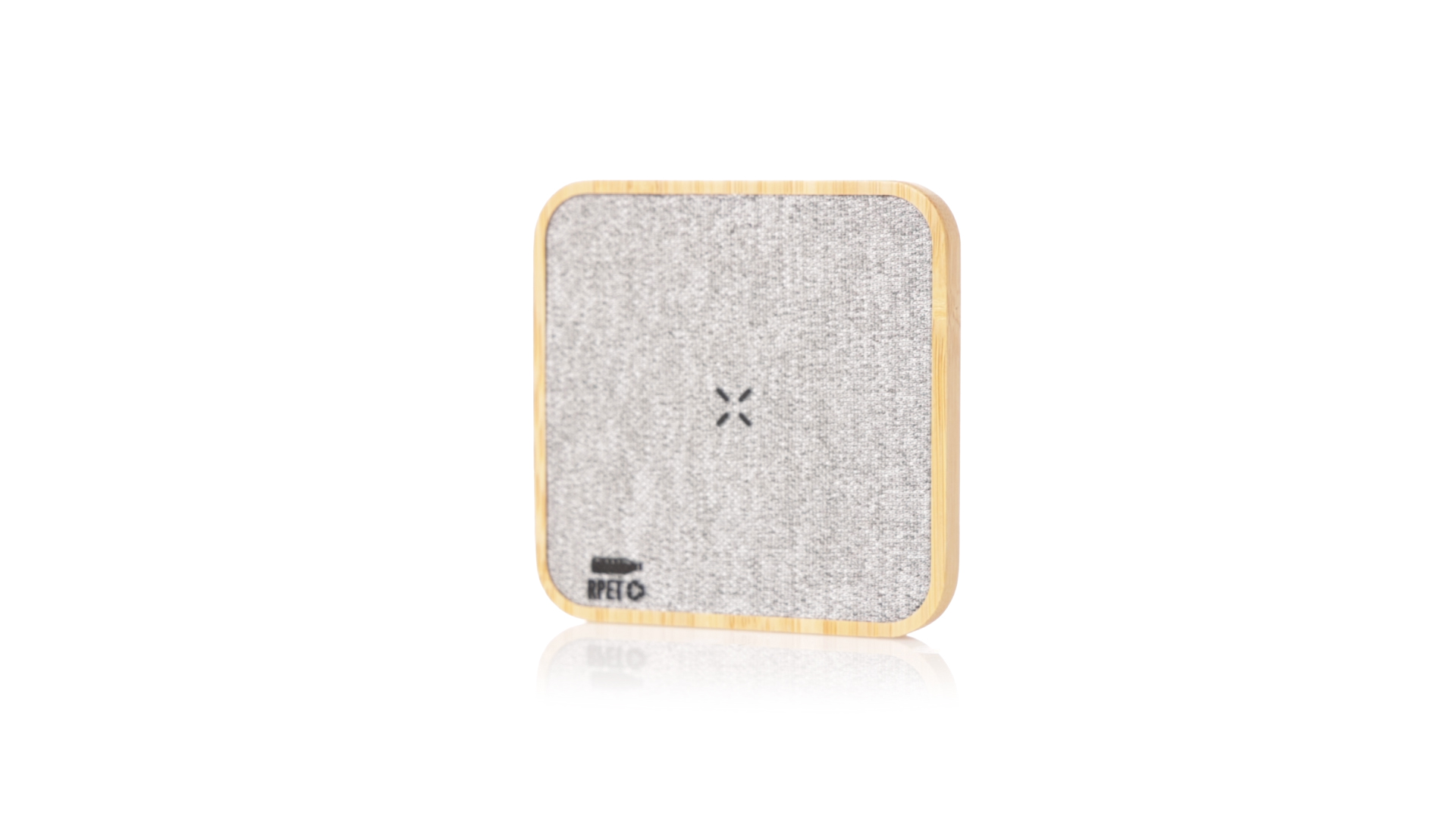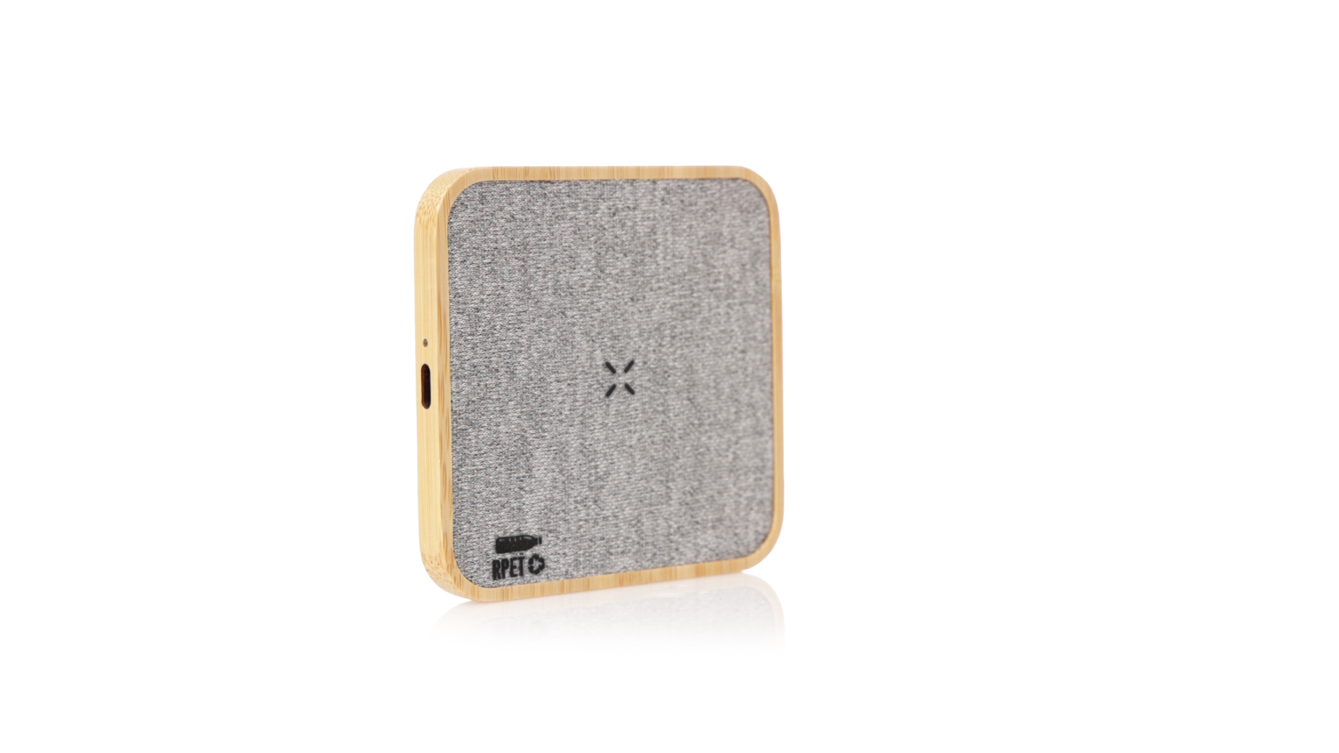 15-W-Wireless-Ladegerät mit quadratischem Design. Hergestellt aus Bambus und RPET-Material, hergestellt aus recyceltem Kunststoff, um die Wiederverwendung von Kunststoffabfällen zu fördern und zur Nachhaltigkeit des Planeten beizutragen. Kompatibel mit Geräten, die mit der kabellosen Qi-Ladetechnologie ausgestattet sind. Inklusive Typ-C-Ladekabel und Bedienungsanleitung in Englisch und Spanisch. Mit RPET-Logo und präsentiert in einer individuellen Kraft-Designbox. Hergestellt nach RoHS-Standards und unter Einhaltung der folgenden Sicherheitsanforderungen: Überhitzungsschutzsystem. Überladeschutzsystem. Blockiersystem zur Vermeidung von Kurzschlüssen.