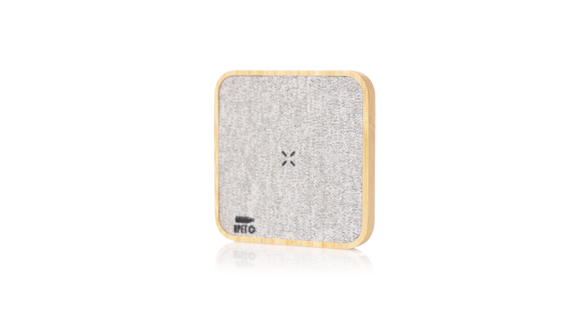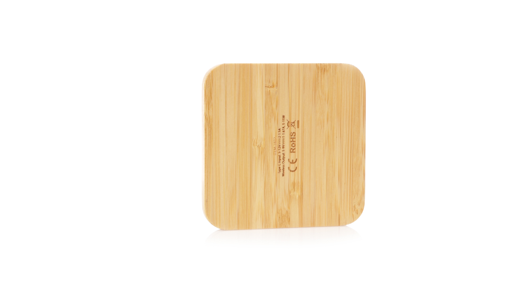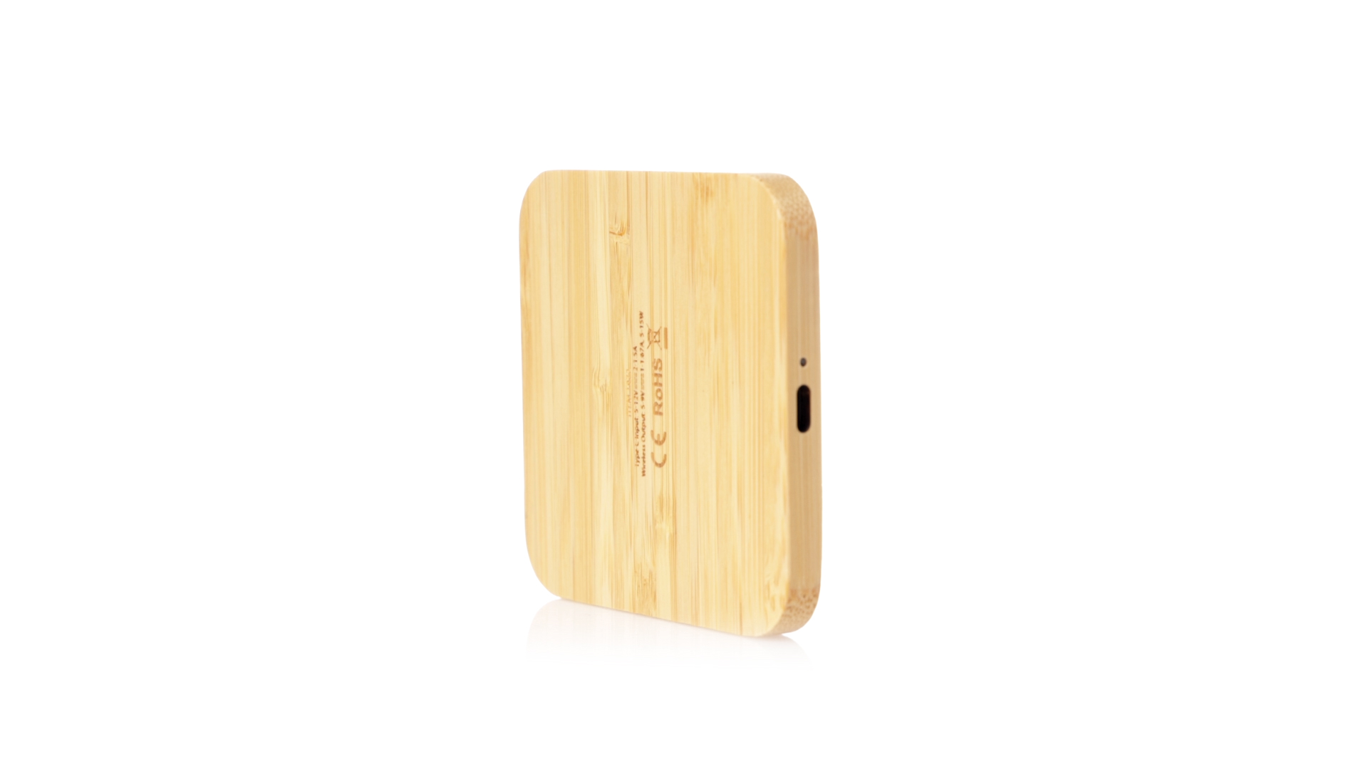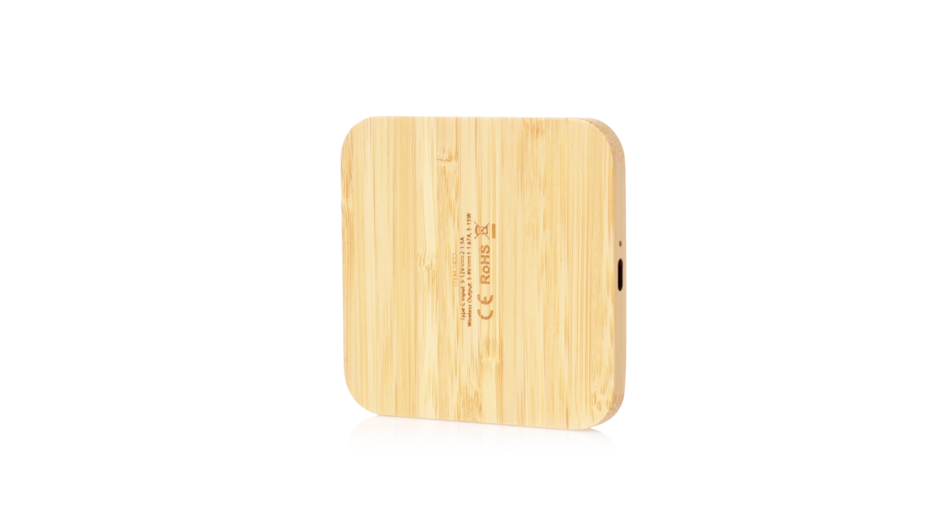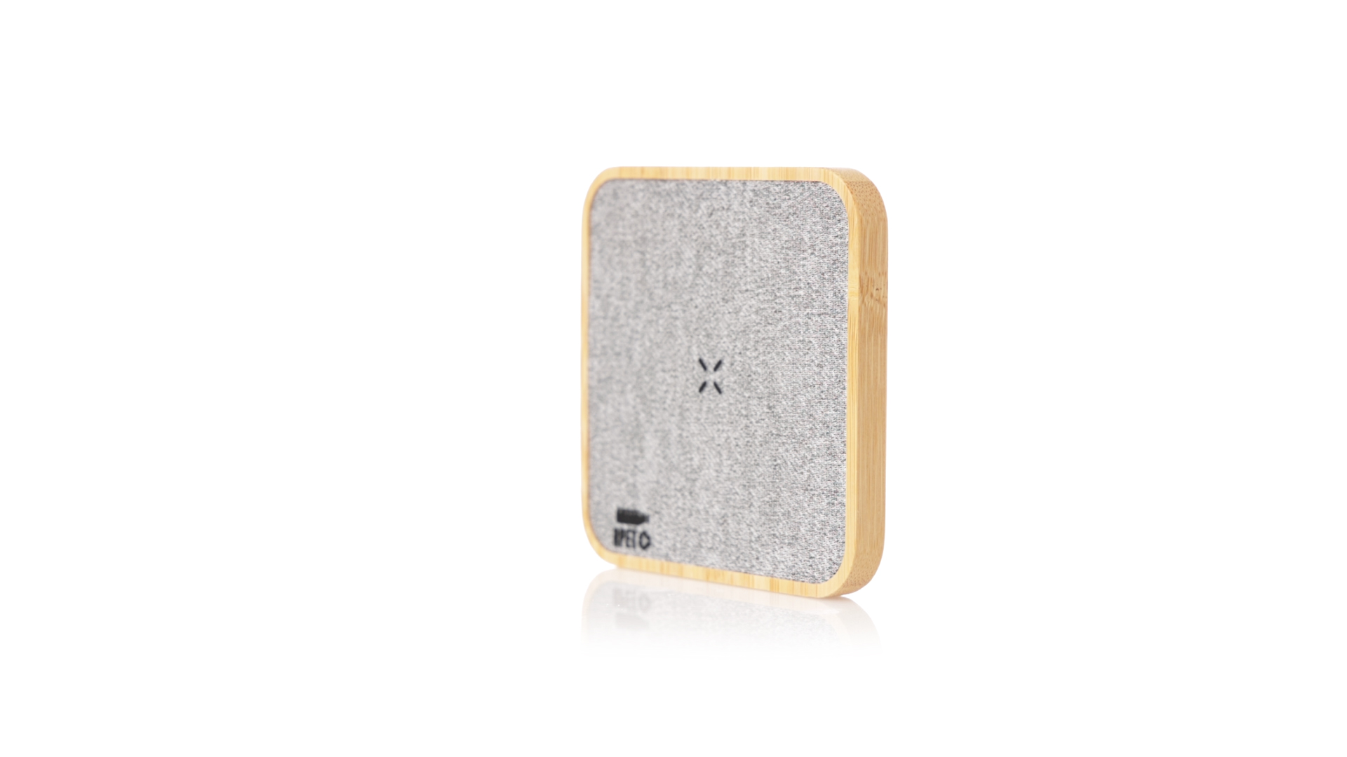 15-W-Wireless-Ladegerät mit quadratischem Design. Hergestellt aus Bambus und RPET-Material, hergestellt aus recyceltem Kunststoff, um die Wiederverwendung von Kunststoffabfällen zu fördern und zur Nachhaltigkeit des Planeten beizutragen. Kompatibel mit Geräten, die mit der kabellosen Qi-Ladetechnologie ausgestattet sind. Inklusive Typ-C-Ladekabel und Bedienungsanleitung in Englisch und Spanisch. Mit RPET-Logo und präsentiert in einer individuellen Kraft-Designbox. Hergestellt nach RoHS-Standards und unter Einhaltung der folgenden Sicherheitsanforderungen: Überhitzungsschutzsystem. Überladeschutzsystem. Blockiersystem zur Vermeidung von Kurzschlüssen.