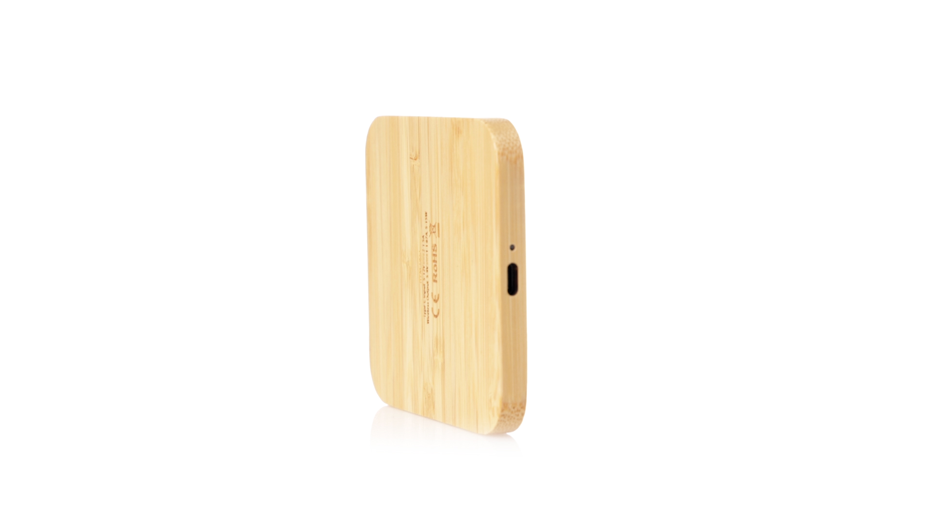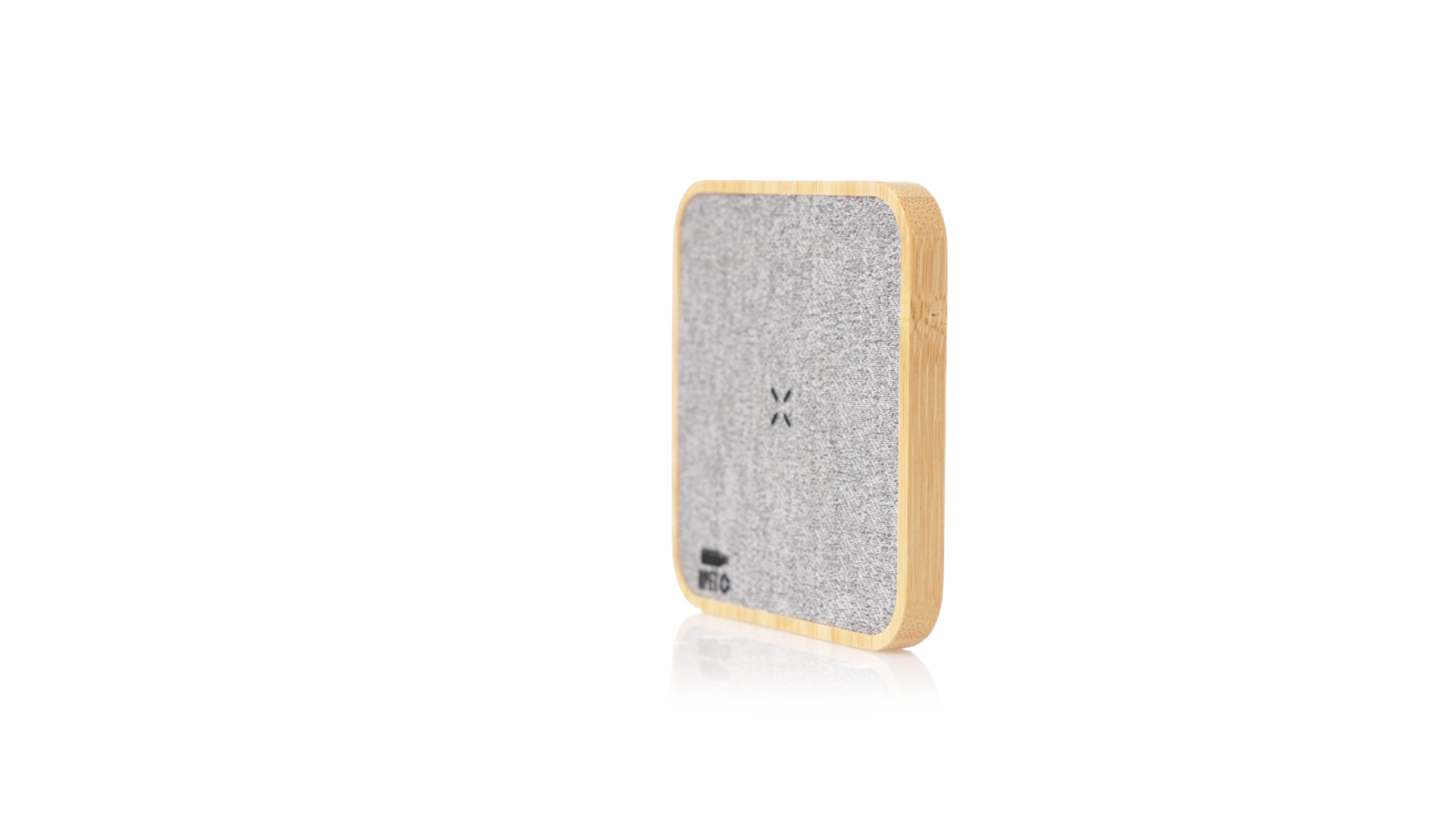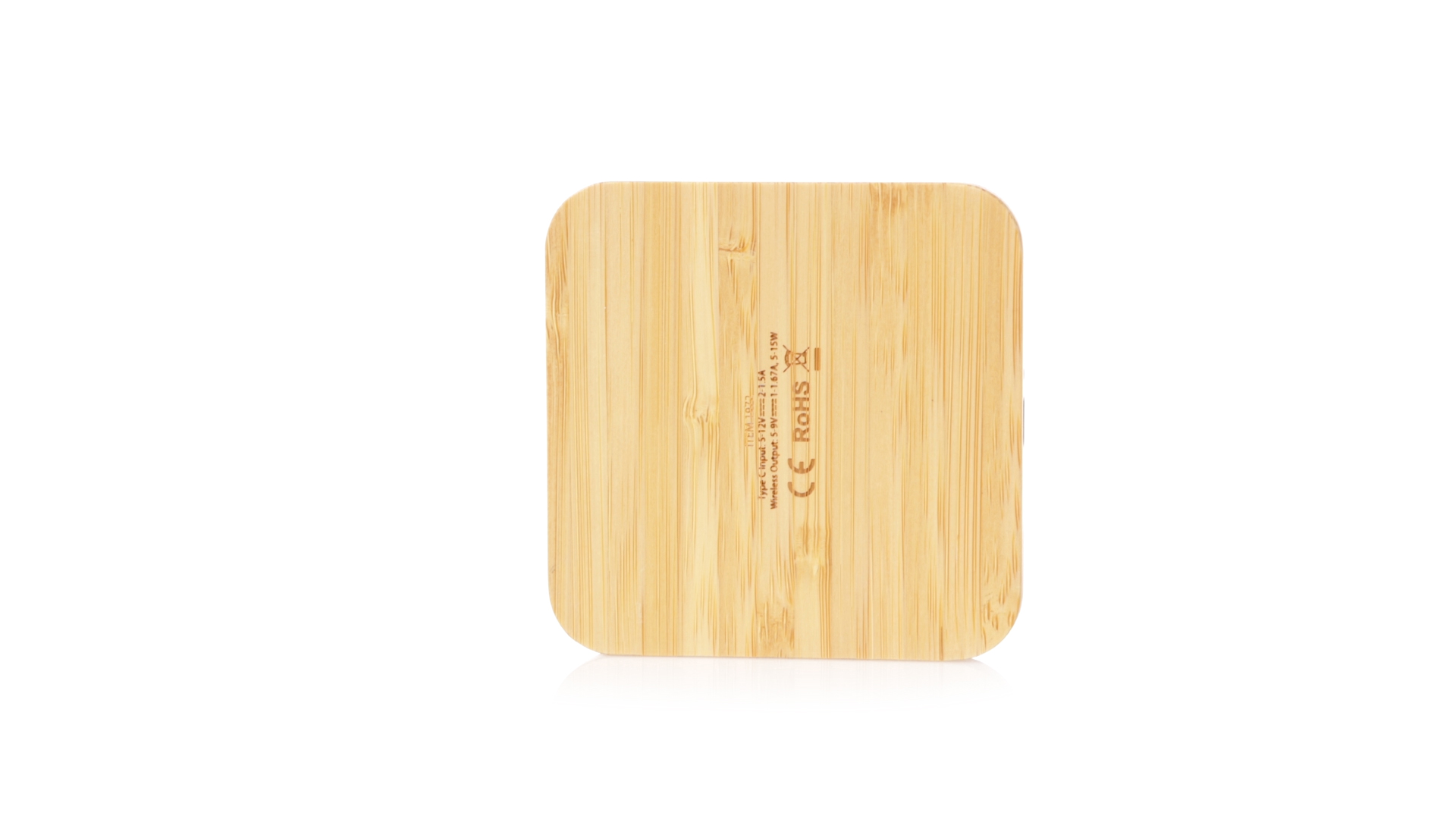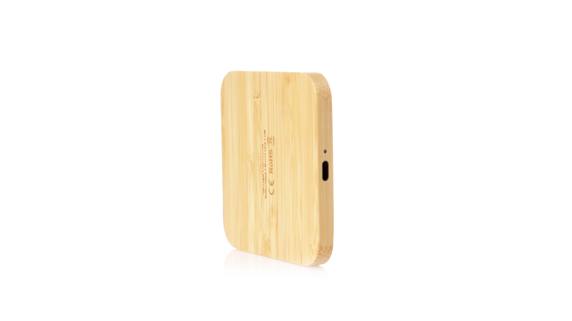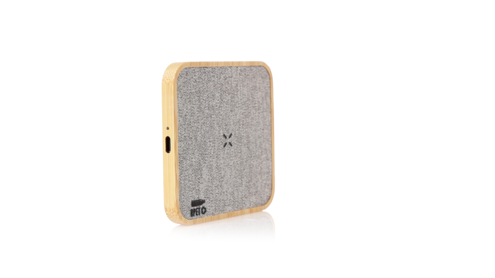 15-W-Wireless-Ladegerät mit quadratischem Design. Hergestellt aus Bambus und RPET-Material, hergestellt aus recyceltem Kunststoff, um die Wiederverwendung von Kunststoffabfällen zu fördern und zur Nachhaltigkeit des Planeten beizutragen. Kompatibel mit Geräten, die mit der kabellosen Qi-Ladetechnologie ausgestattet sind. Inklusive Typ-C-Ladekabel und Bedienungsanleitung in Englisch und Spanisch. Mit RPET-Logo und präsentiert in einer individuellen Kraft-Designbox. Hergestellt nach RoHS-Standards und unter Einhaltung der folgenden Sicherheitsanforderungen: Überhitzungsschutzsystem. Überladeschutzsystem. Blockiersystem zur Vermeidung von Kurzschlüssen.