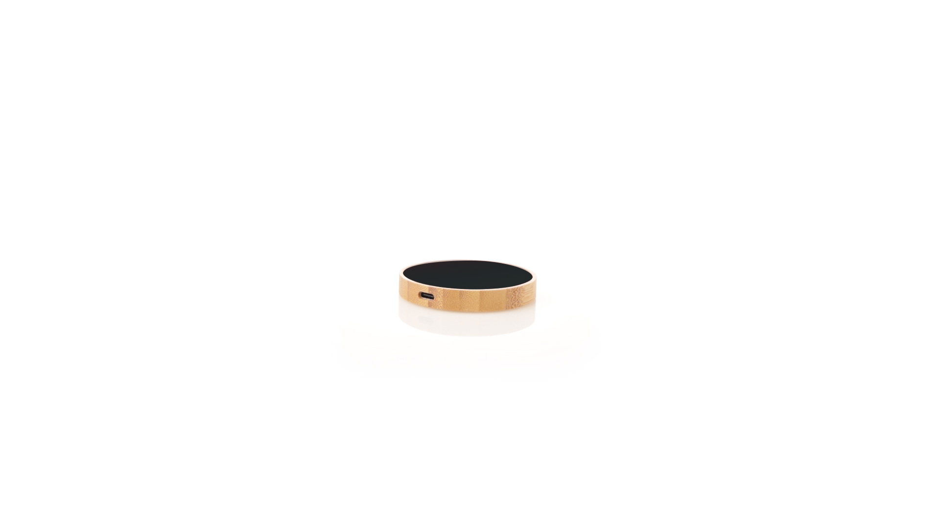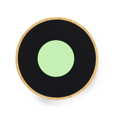 Kreisförmiges kabelloses Ladegerät. Hergestellt aus Bambus, mit eleganter schwarzer Oberfläche. Innere LED-Beleuchtung und äussere Beschichtung speziell für die Lasermarkierung entwickelt, beleuchtet das Logo. Mit 15 W Ladefunktion, kompatibel mit Geräten, die mit der kabellosen Qi-Ladetechnologie ausgestattet sind. Mit rutschfestem Standfuss, inklusive Typ-C-Ladekabel und Bedienungsanleitung in Englisch und Spanisch. Präsentiert in einer individuellen Kraft-Design-Box.