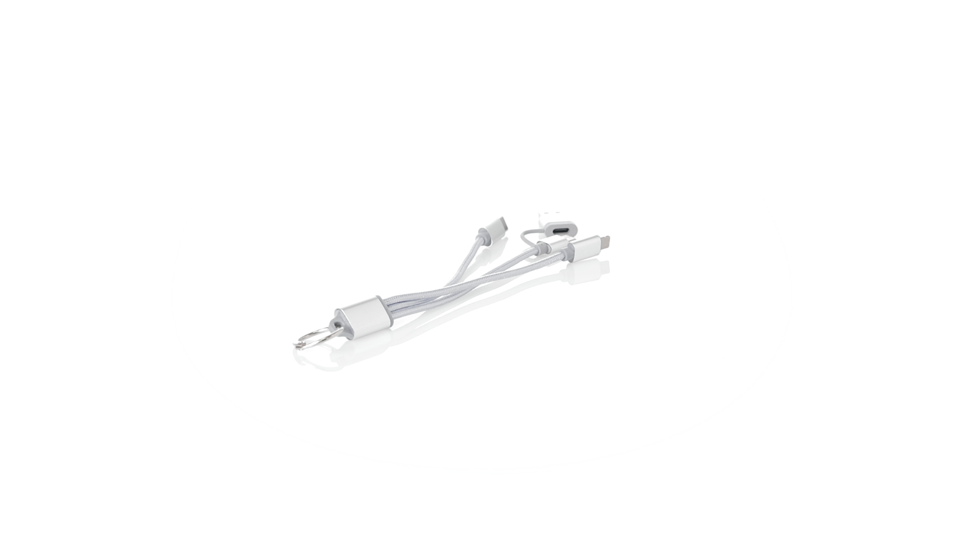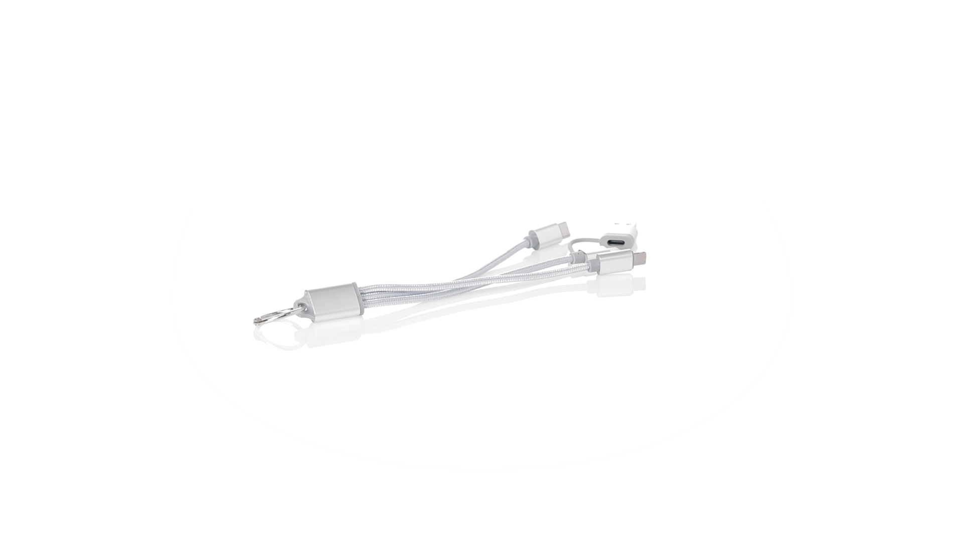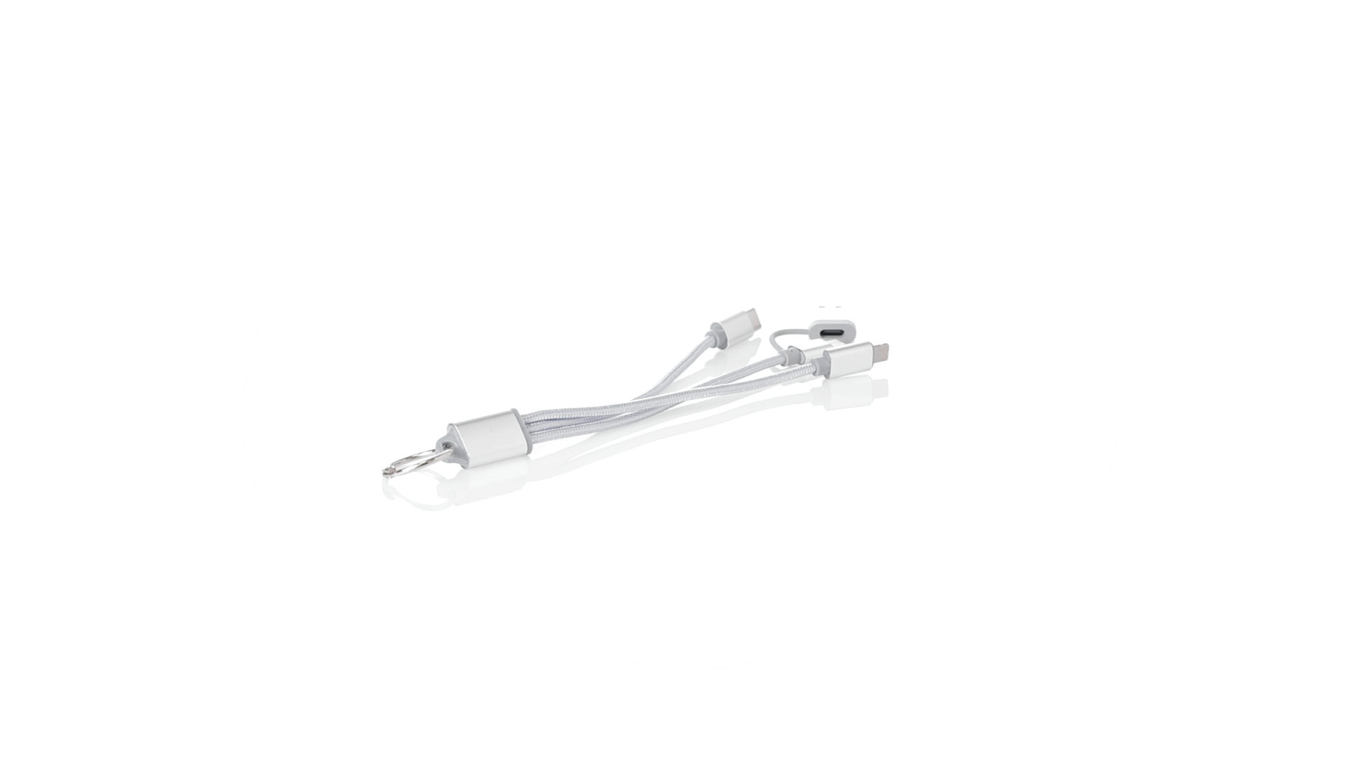 Ladekabel mit zwei Micro-USB/Lightning- und Typ-C-Anschlüssen (Eingang und Ausgang). Aluminiumanschlüsse und Metallplakette speziell für die Lasergravur entwickelt.