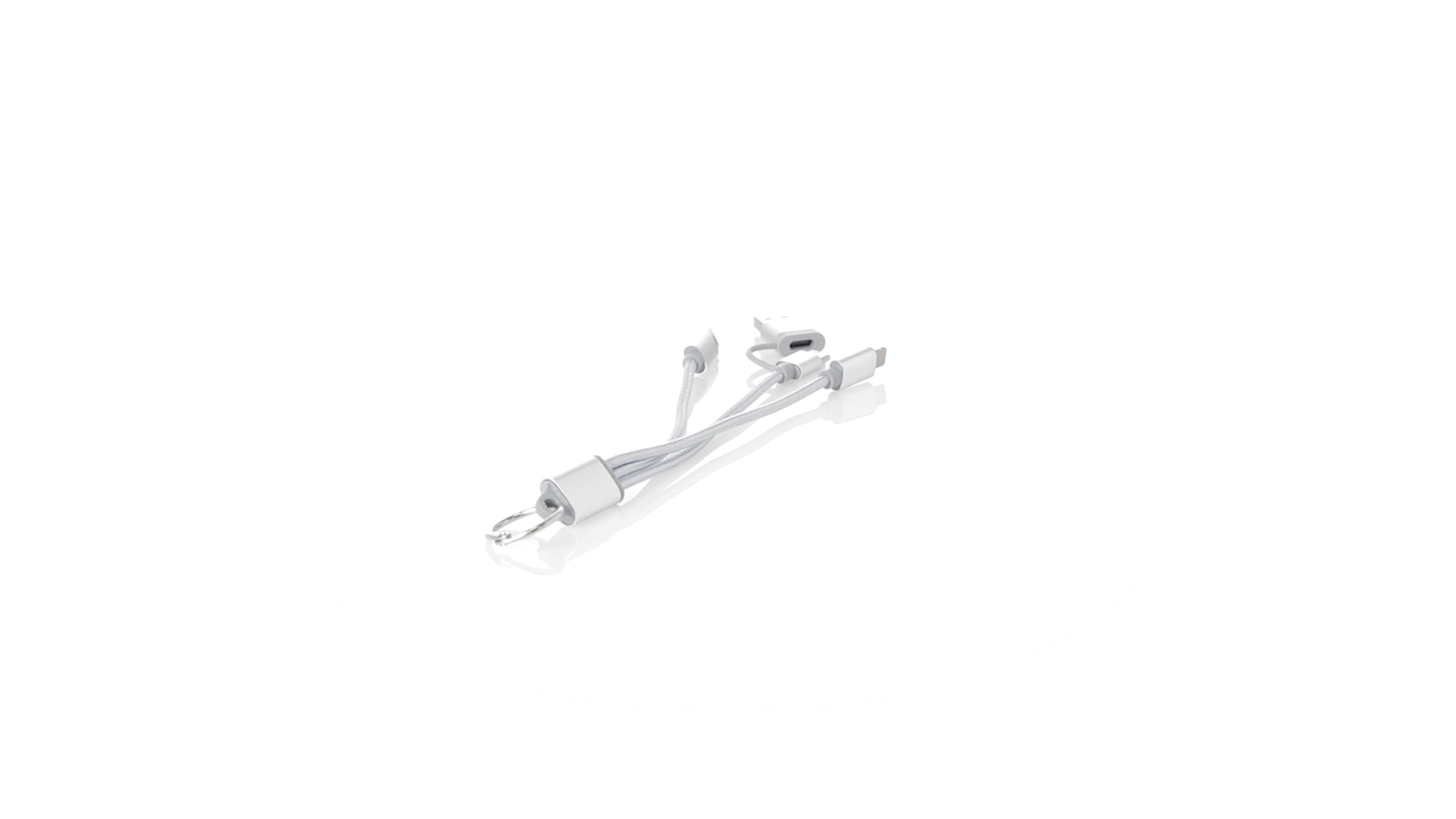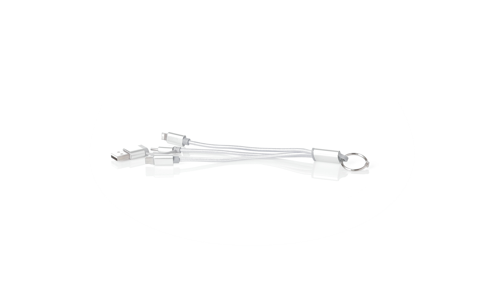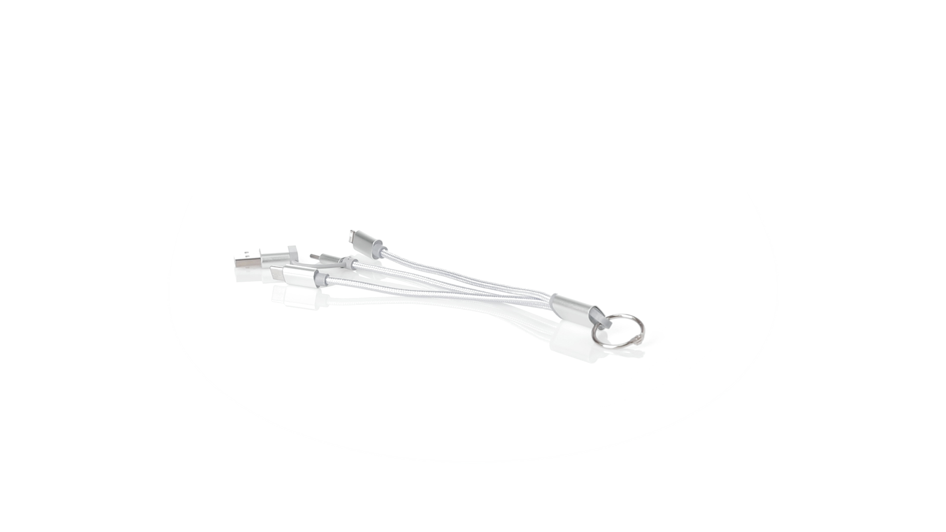 Ladekabel mit zwei Micro-USB/Lightning- und Typ-C-Anschlüssen (Eingang und Ausgang). Aluminiumanschlüsse und Metallplakette speziell für die Lasergravur entwickelt.