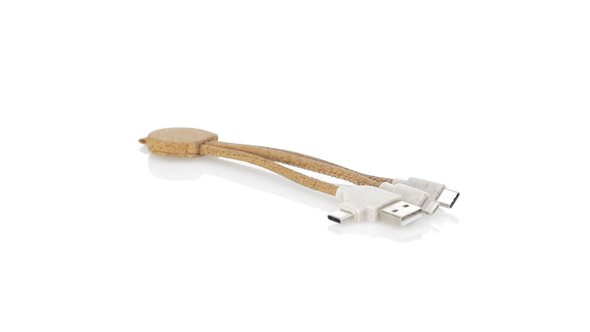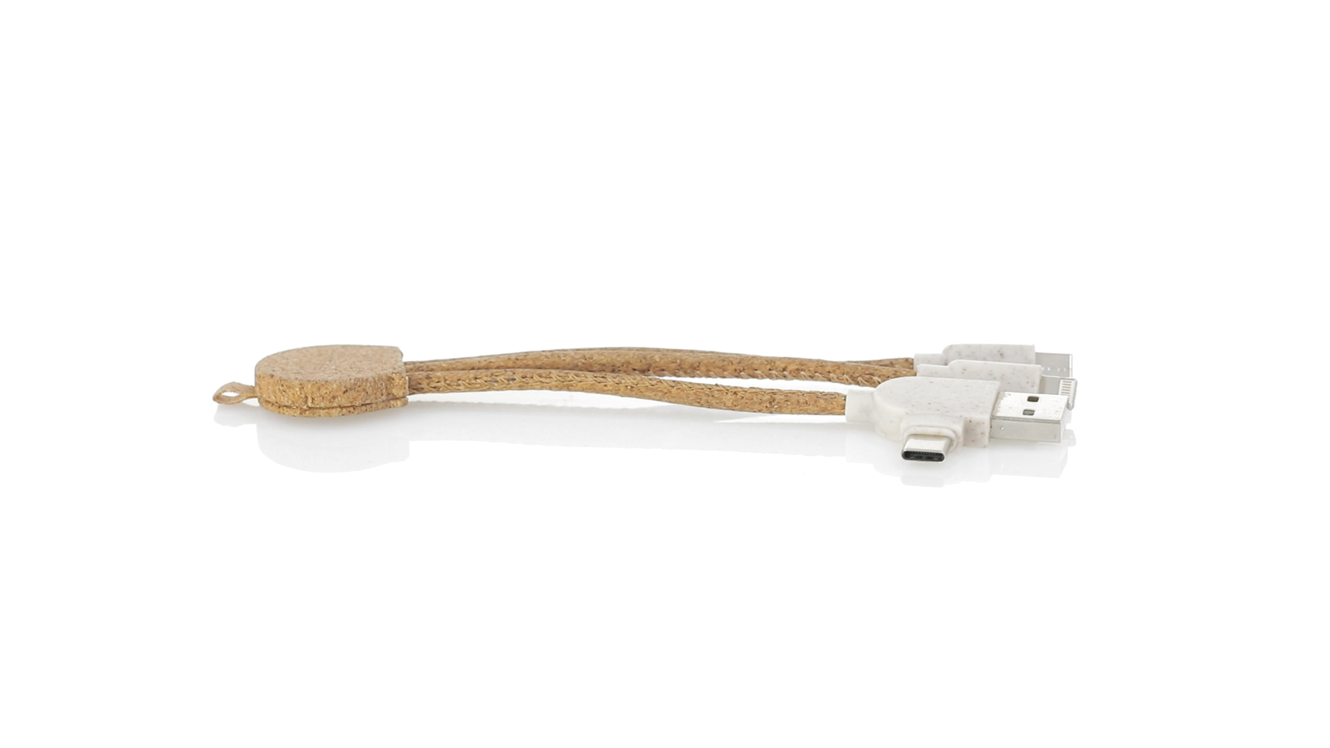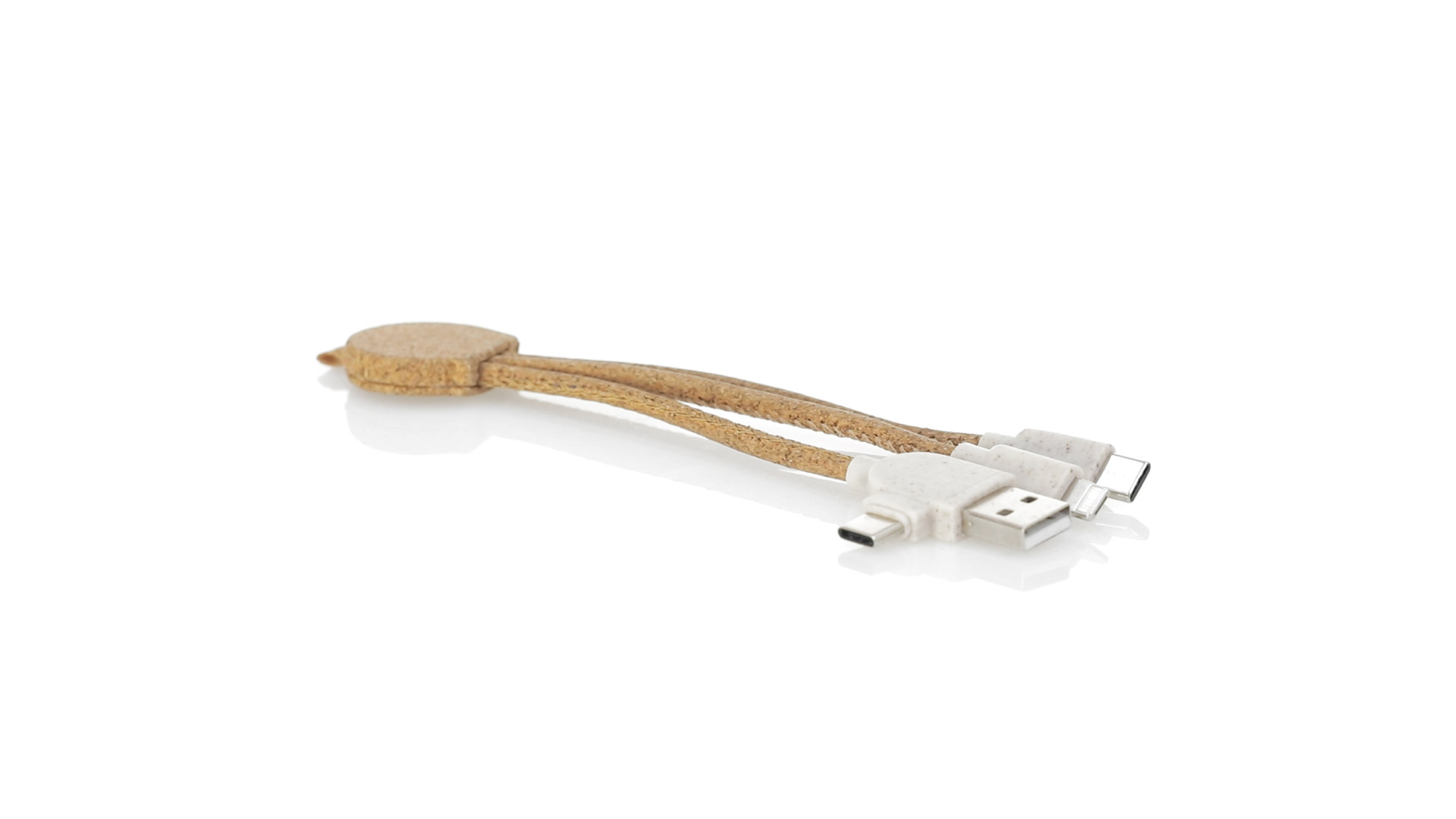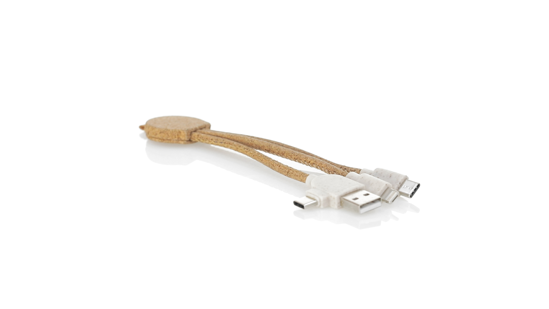 Nature Line USB-Ladekabel aus Naturkork und mit Zubehör aus Weizenrohr, um die Verwendung natürlicher Rohstoffe zu fördern und Schadstoffemissionen zu reduzieren. Mit USB, Typ C (Eingang und Ausgang) und zwei Micro-USB-Lightning-Anschlüssen. Mit Aufhängezubehör und glatter Fläche zum Beschriften. Präsentiert in einem individuellen, selbstverschliessenden Beutel mit Ökodesign.