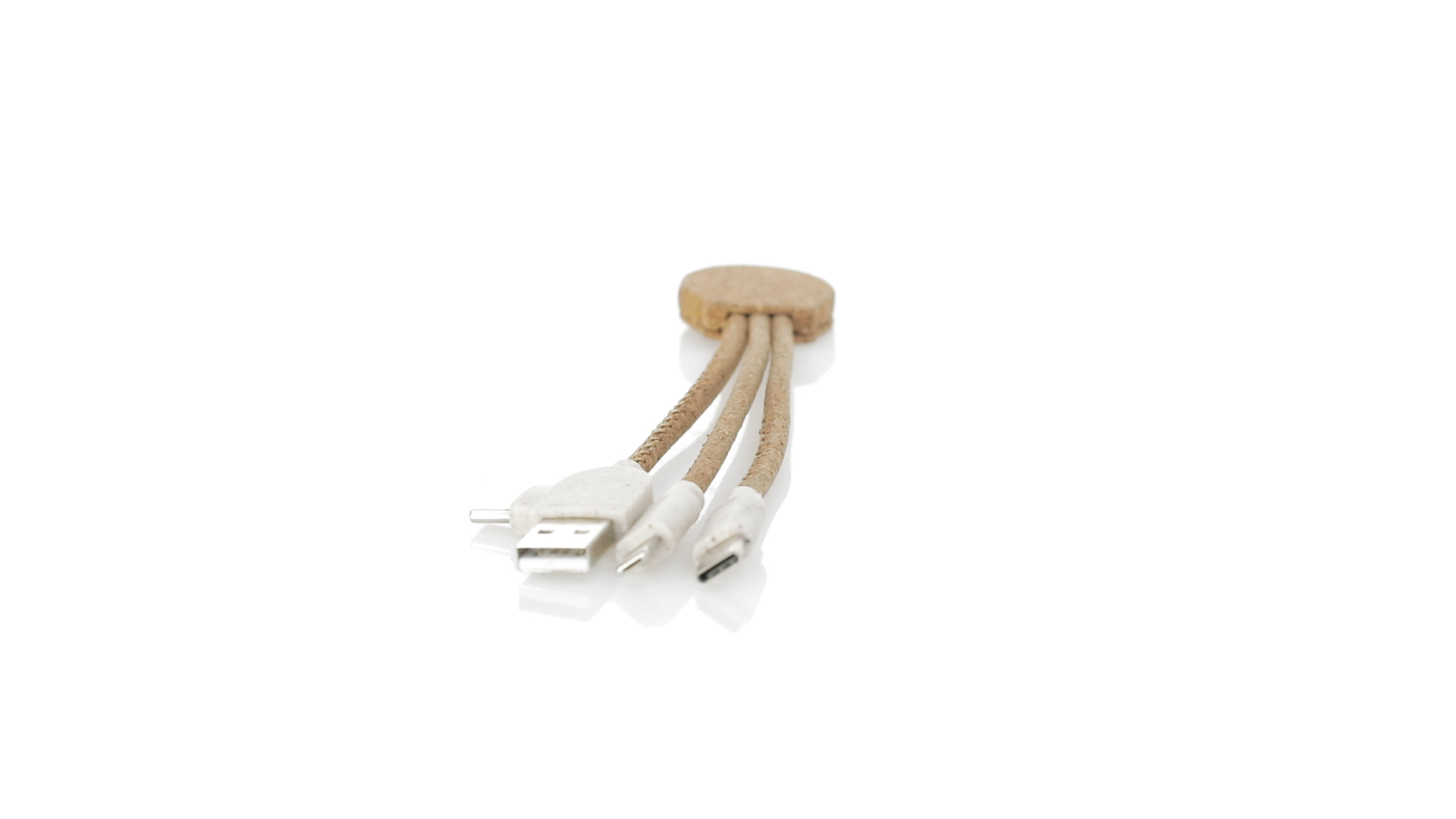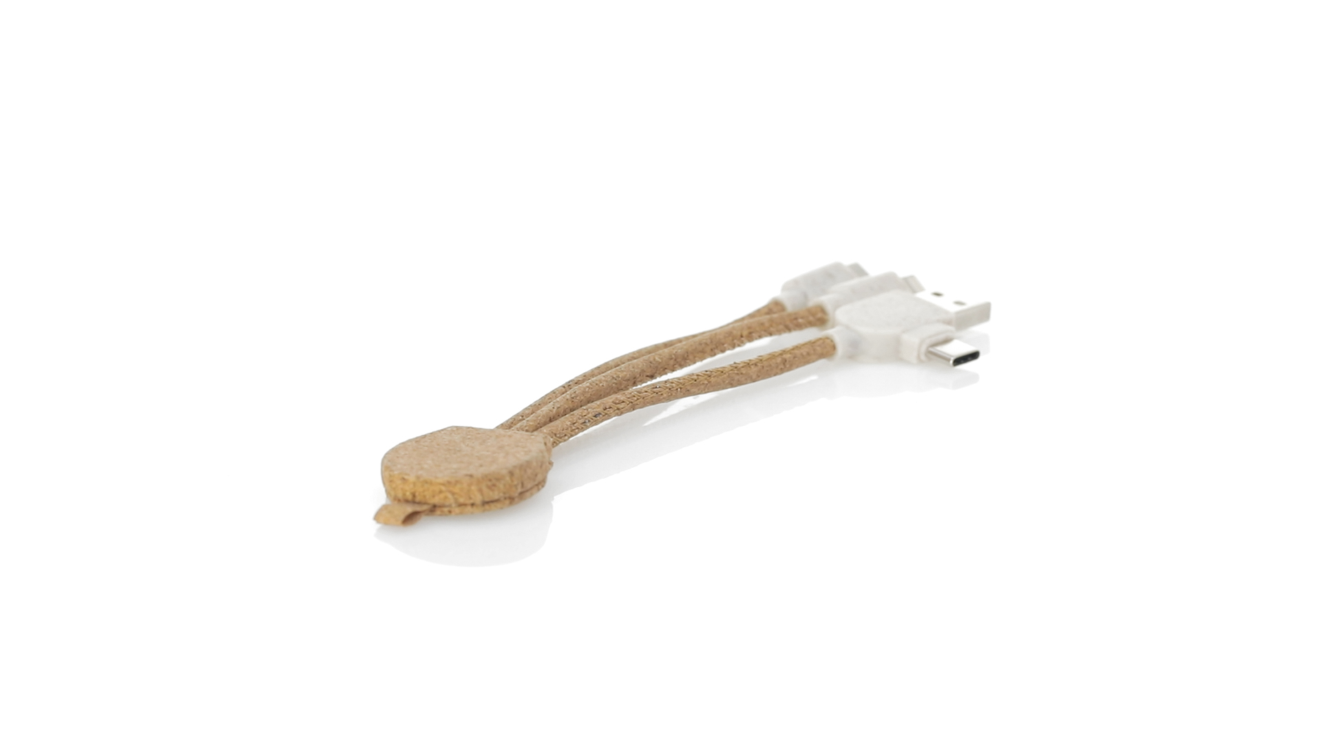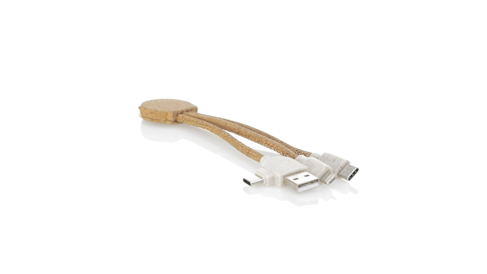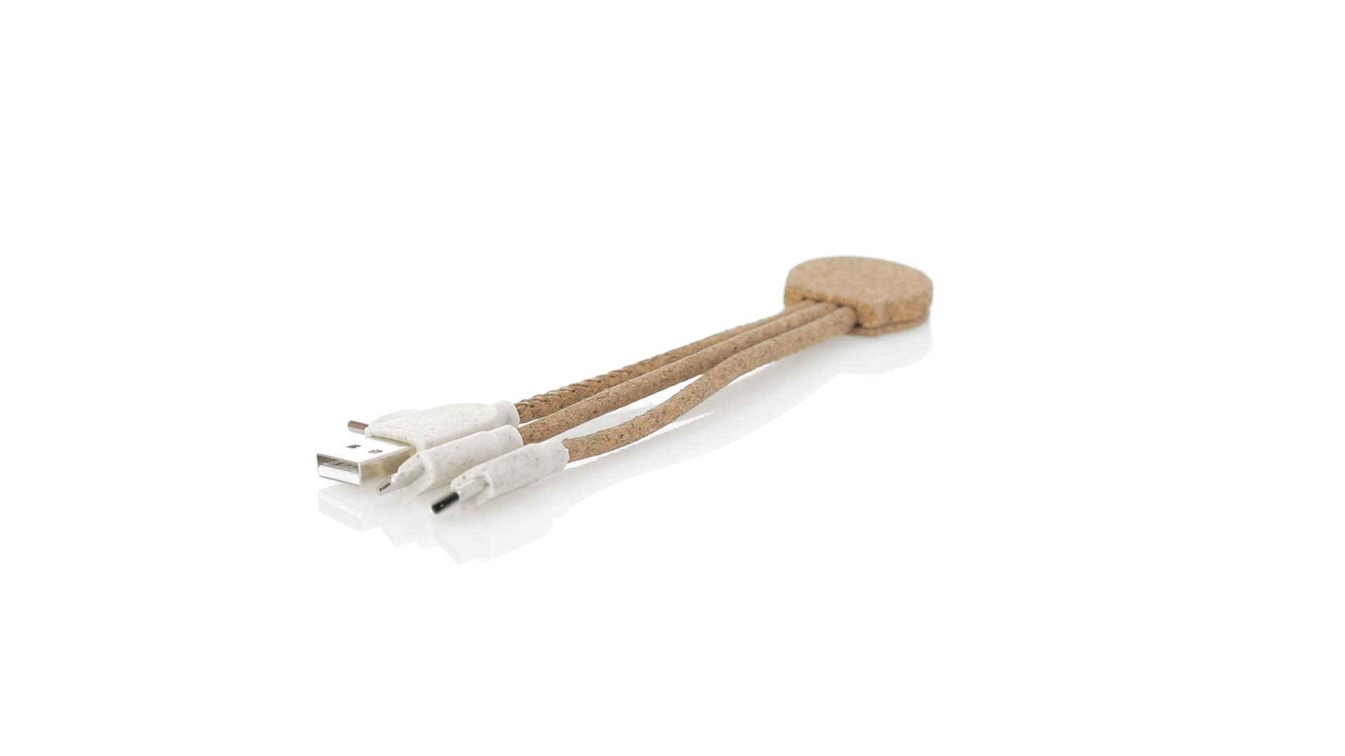 Nature Line USB-Ladekabel aus Naturkork und mit Zubehör aus Weizenrohr, um die Verwendung natürlicher Rohstoffe zu fördern und Schadstoffemissionen zu reduzieren. Mit USB, Typ C (Eingang und Ausgang) und zwei Micro-USB-Lightning-Anschlüssen. Mit Aufhängezubehör und glatter Fläche zum Beschriften. Präsentiert in einem individuellen, selbstverschliessenden Beutel mit Ökodesign.