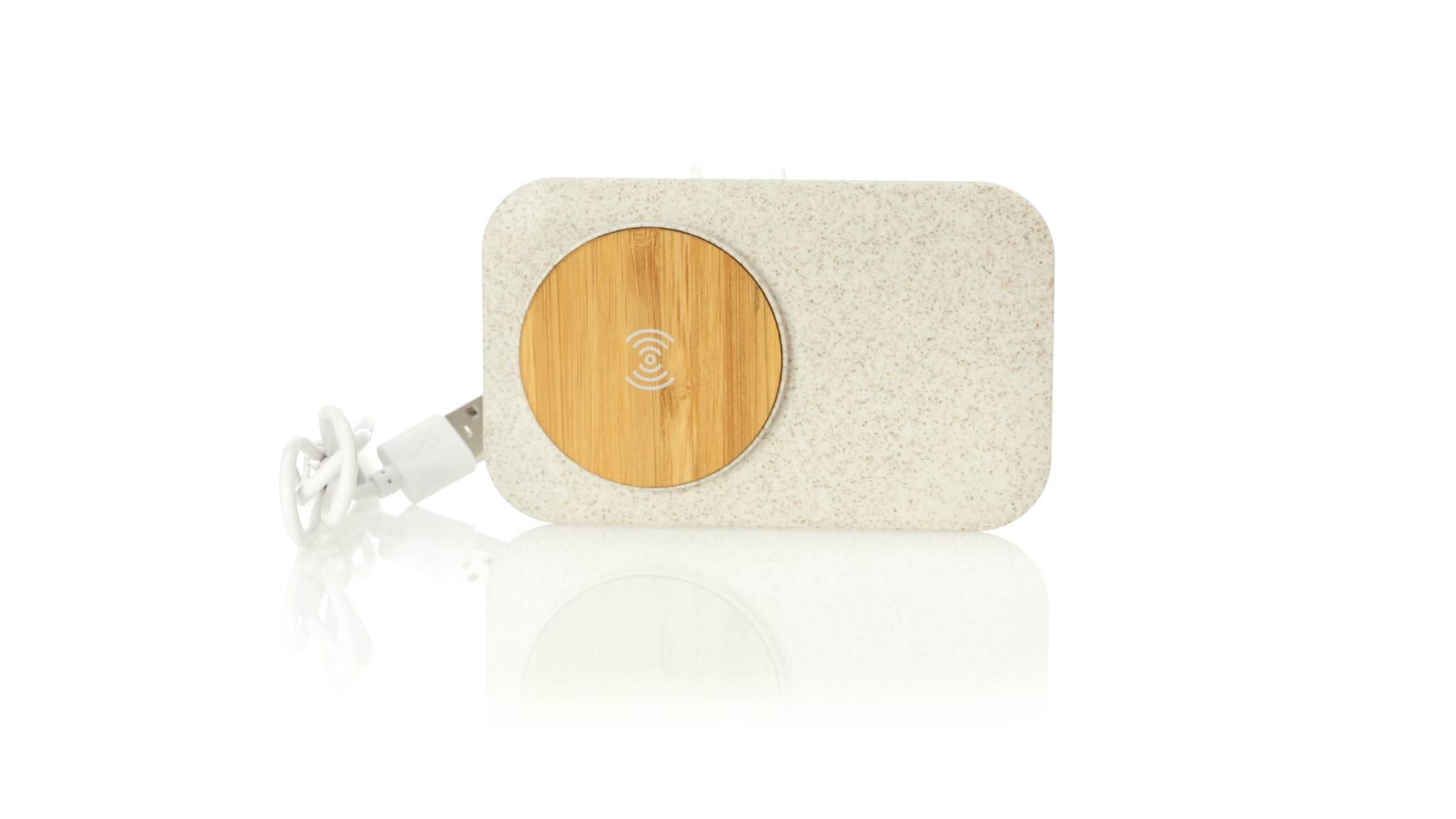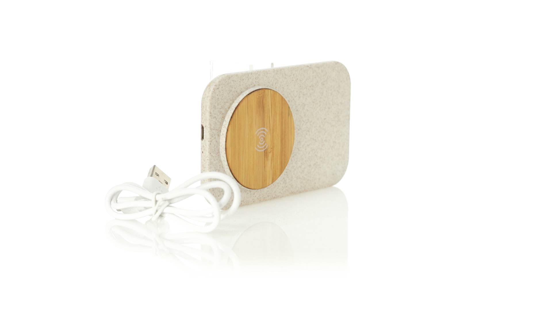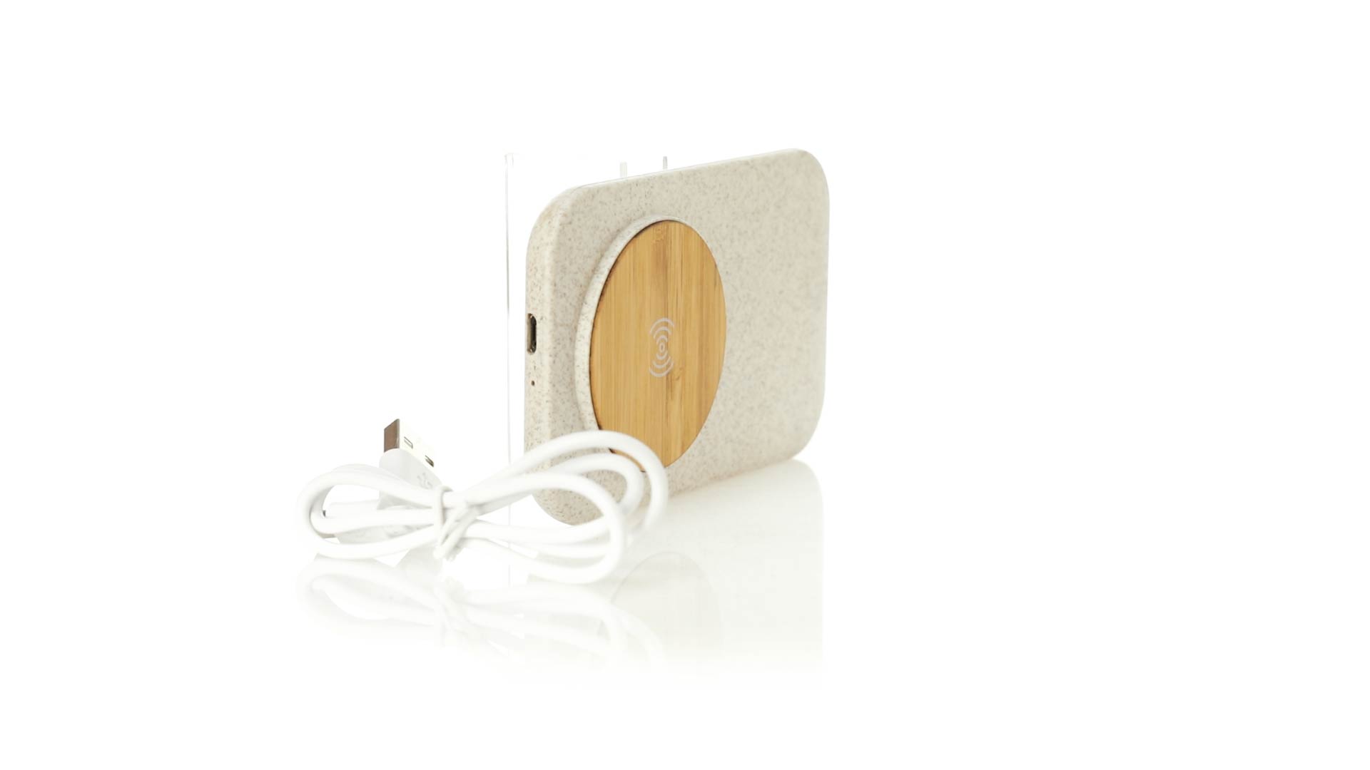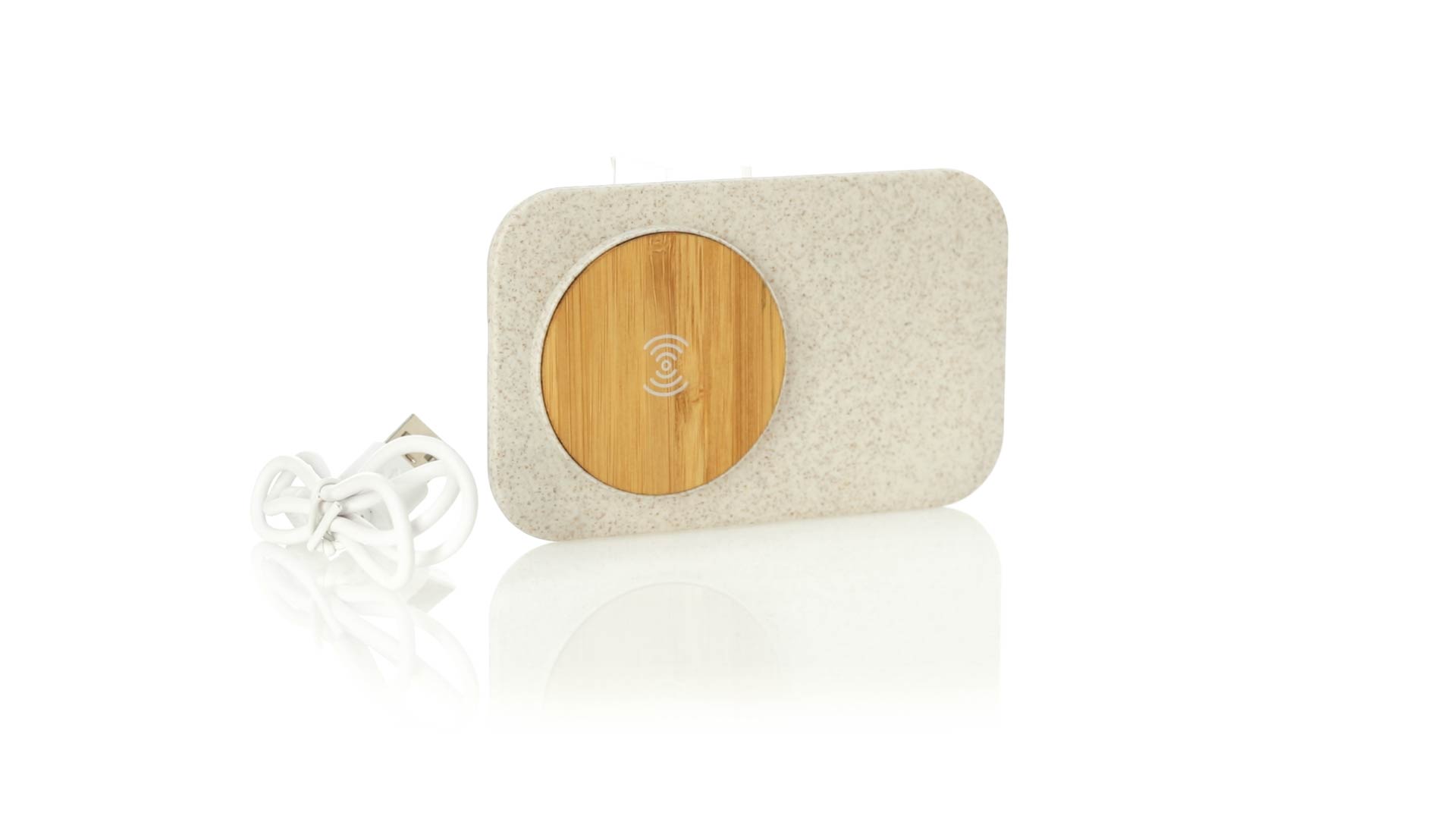 Kabelloses Ladegerät aus der Naturlinie. Bambusschale in Kombination mit Weizenstroh, um die Verwendung von natürlichen Rohstoffen zu fördern und Schadstoffemissionen zu reduzieren. Ladeanzeige und kompatibel mit Geräten, die mit drahtloser Ladetechnologie ausgestattet sind. Grosser Druckbereich und präsentiert in einer attraktiven, individuellen Öko-Design-Box. Inklusive Kabel