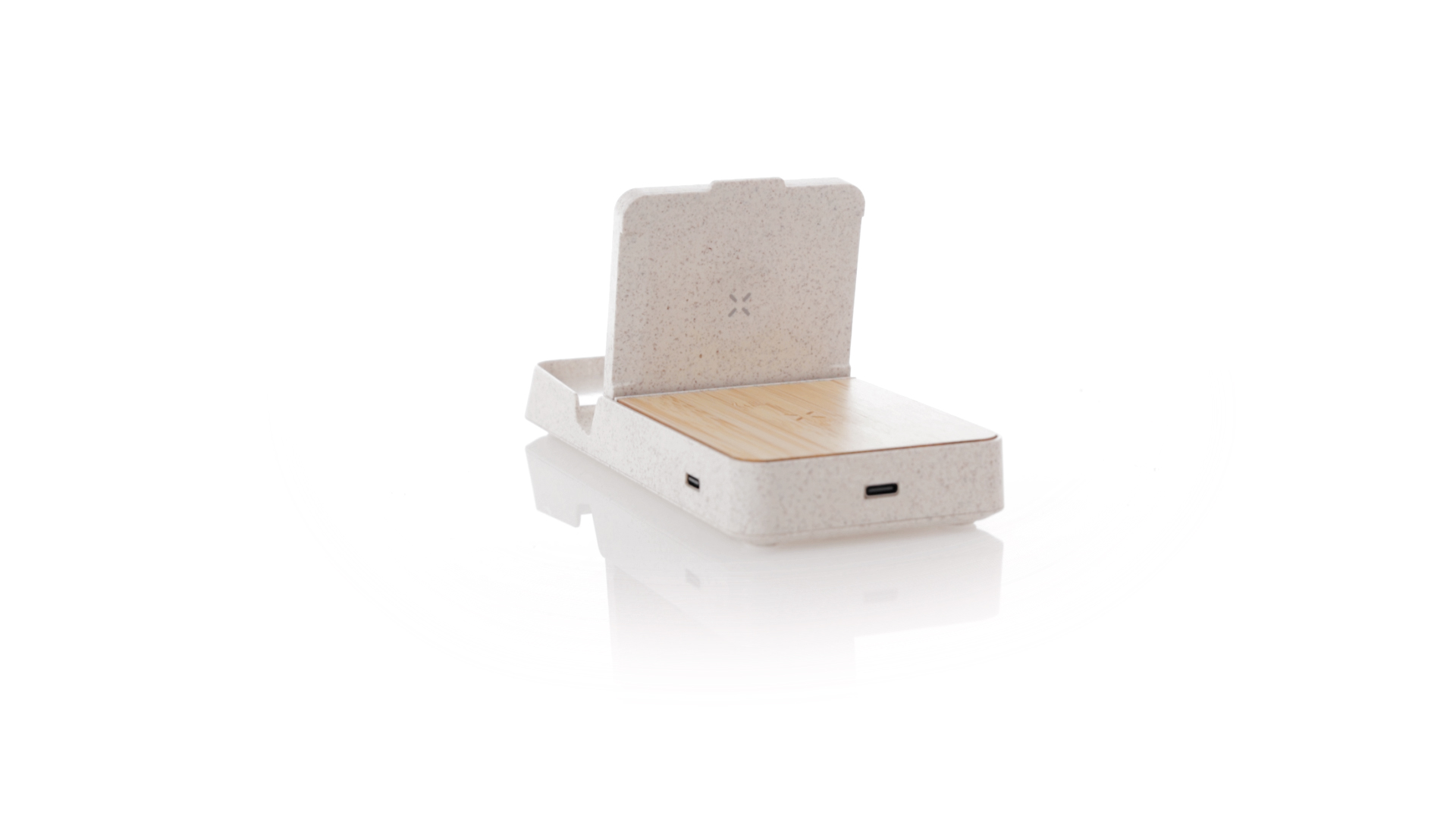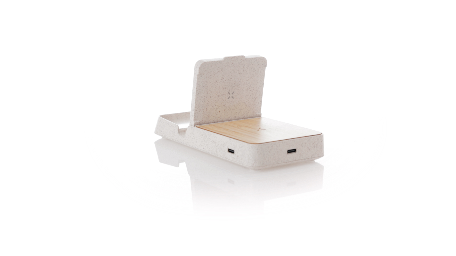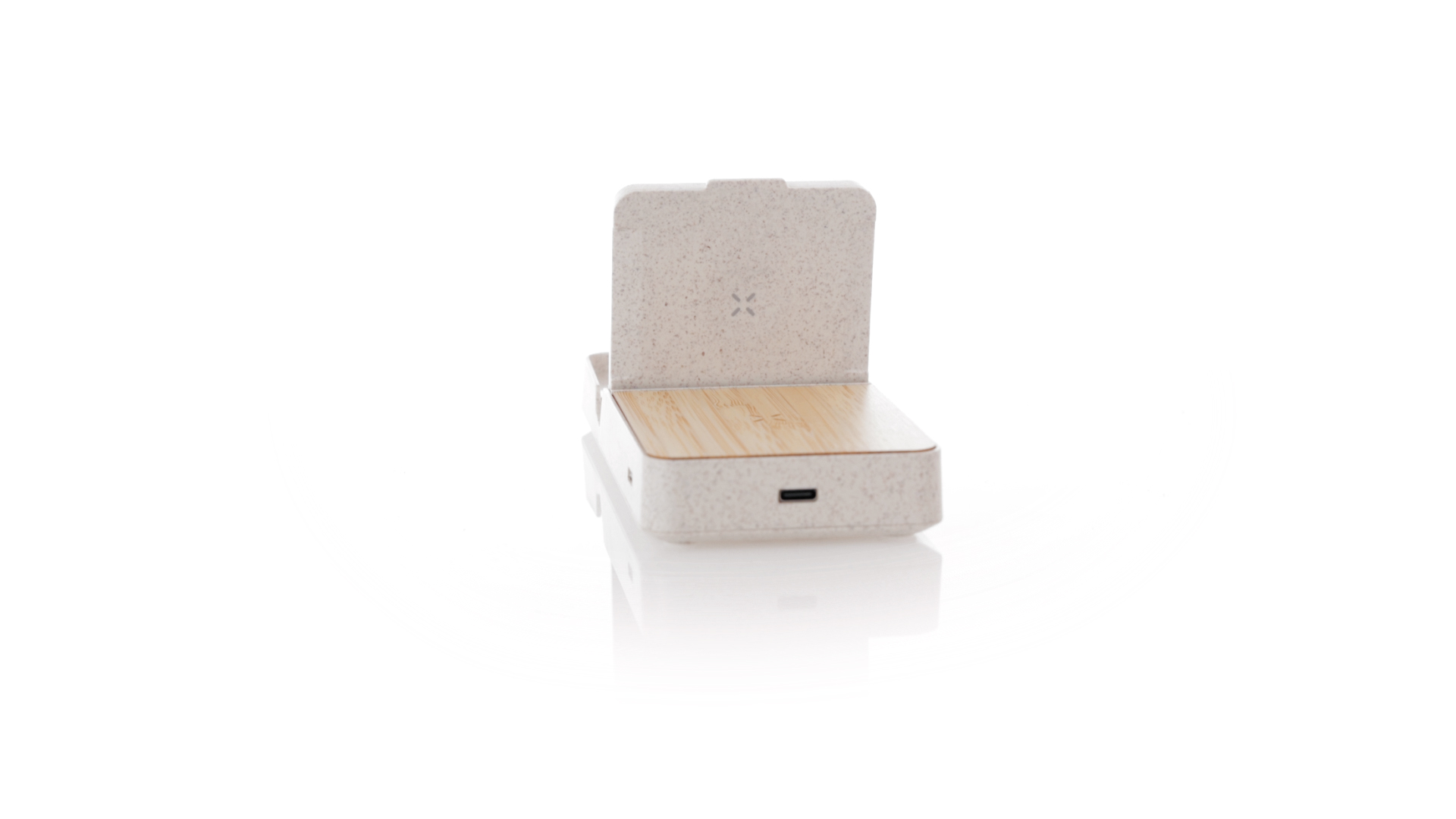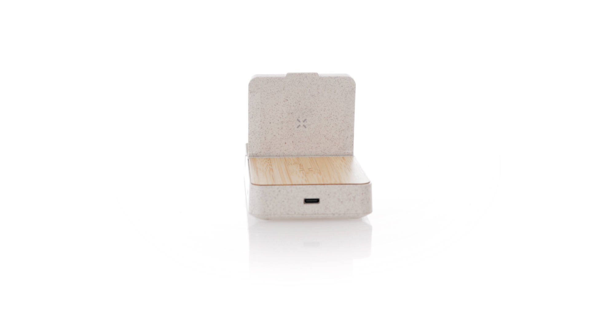 Komplettes kabelloses 15-W-Ladegerät mit Halterung, hergestellt aus einer Kombination von Bambus und Weizenstroh. Entwickelt für das gleichzeitige Aufladen von Smartphone, Smartwatch und Kopfhörern, sowohl kabellos als auch über den Typ-C-Anschluss. Eine vielseitige All-in-One-Ladestation mit Smartphone- oder Tablet-Halterung. Präsentiert in einer attraktiven individuellen Kraftbox und mit Bedienungsanleitung in Englisch und Spanisch erhältlich.Weizenstroh fördert die Verwendung von natürlichen Rohstoffen und reduziert so den Schadstoffausstoss.Materialien wie Bambus fördern die Verwendung natürlicher Rohstoffe und verringern so den Schadstoffausstoss. Bambus ist eine sehr widerstandsfähige und vielseitige Pflanze, die schnell wächst und sich regeneriert, was sie zu einer hervorragenden Alternative zu herkömmlichem Holz macht.Hergestellt gemäss den RoHS-Normen und unter Einhaltung der folgenden Sicherheitsanforderungen:Überhitzungsschutzsystem.Überladungsschutzsystem.Blockiersystem zur Vermeidung von Kurzschlüssen.