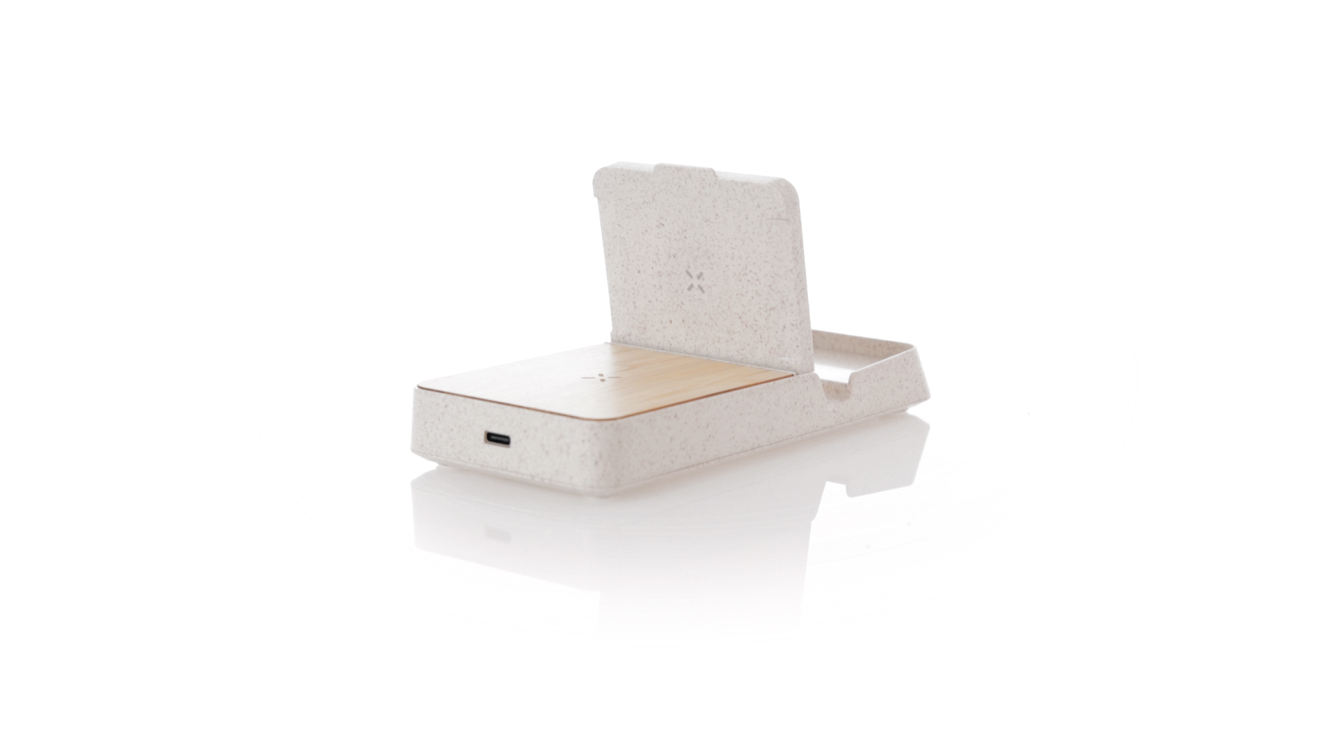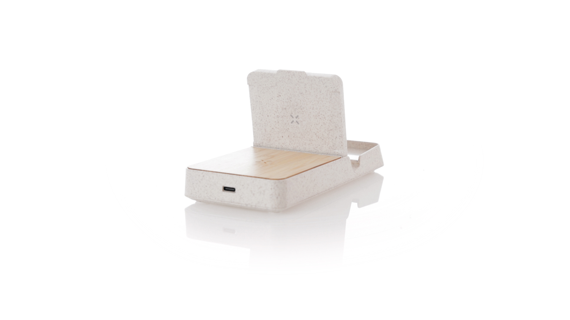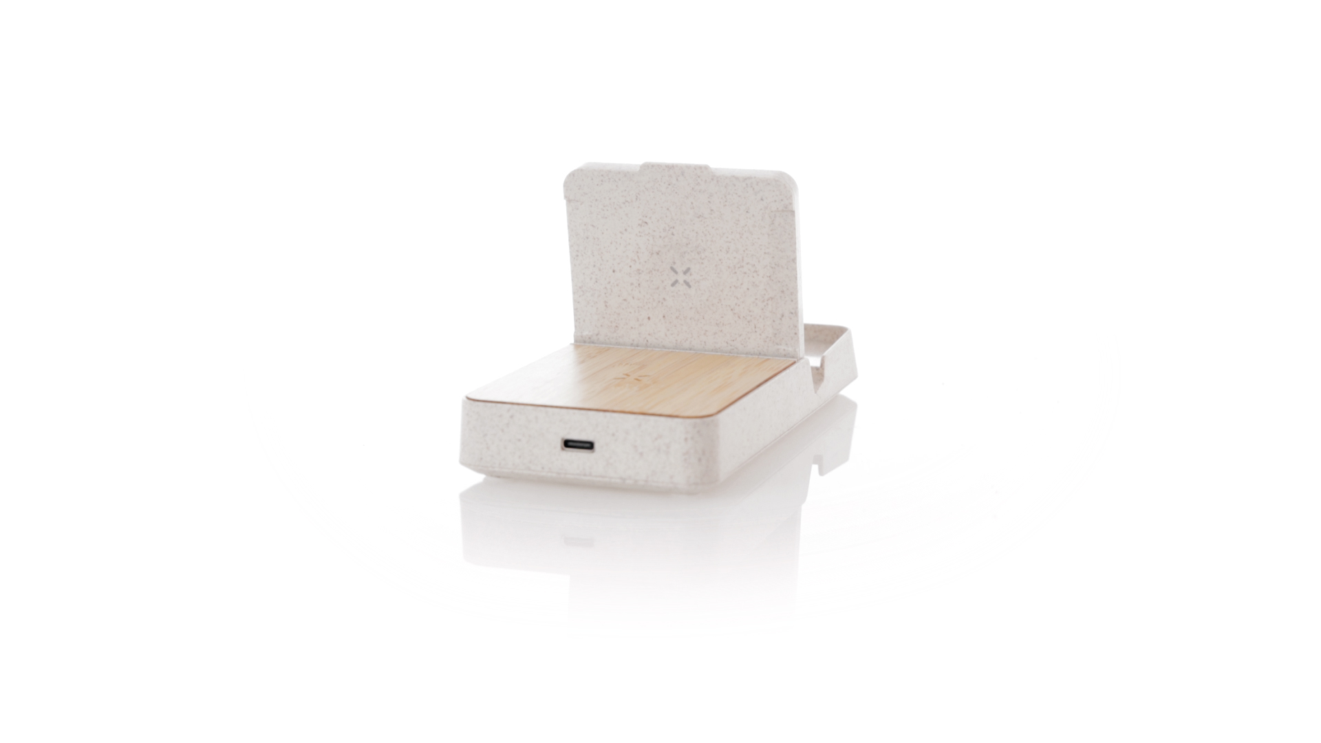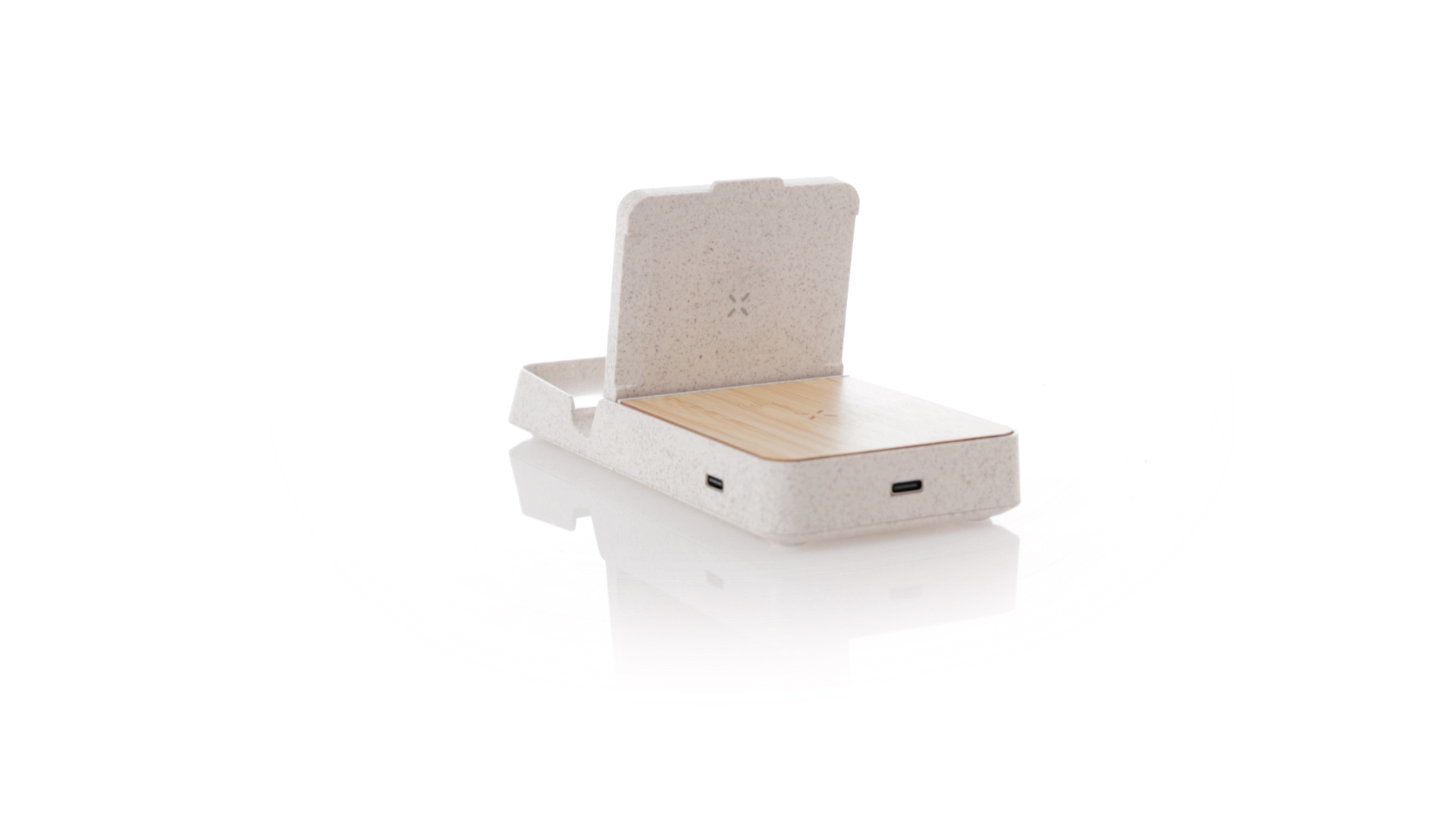 Komplettes kabelloses 15-W-Ladegerät mit Halterung, hergestellt aus einer Kombination von Bambus und Weizenstroh. Entwickelt für das gleichzeitige Aufladen von Smartphone, Smartwatch und Kopfhörern, sowohl kabellos als auch über den Typ-C-Anschluss. Eine vielseitige All-in-One-Ladestation mit Smartphone- oder Tablet-Halterung. Präsentiert in einer attraktiven individuellen Kraftbox und mit Bedienungsanleitung in Englisch und Spanisch erhältlich.Weizenstroh fördert die Verwendung von natürlichen Rohstoffen und reduziert so den Schadstoffausstoss.Materialien wie Bambus fördern die Verwendung natürlicher Rohstoffe und verringern so den Schadstoffausstoss. Bambus ist eine sehr widerstandsfähige und vielseitige Pflanze, die schnell wächst und sich regeneriert, was sie zu einer hervorragenden Alternative zu herkömmlichem Holz macht.Hergestellt gemäss den RoHS-Normen und unter Einhaltung der folgenden Sicherheitsanforderungen:Überhitzungsschutzsystem.Überladungsschutzsystem.Blockiersystem zur Vermeidung von Kurzschlüssen.