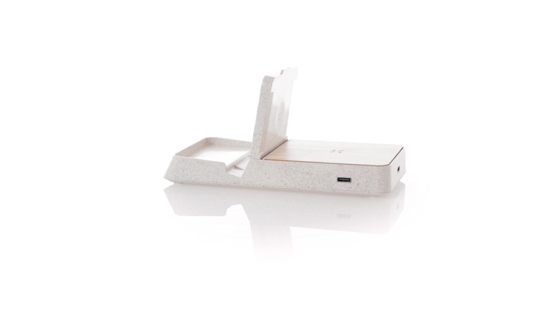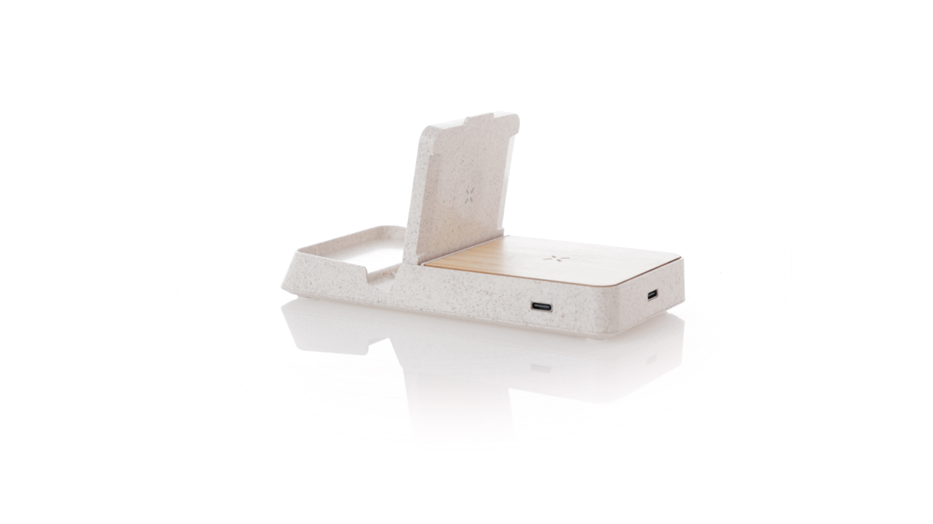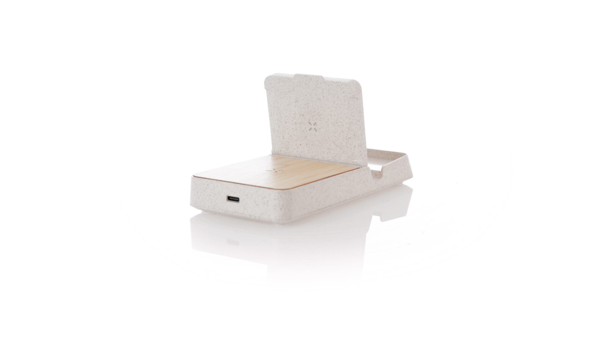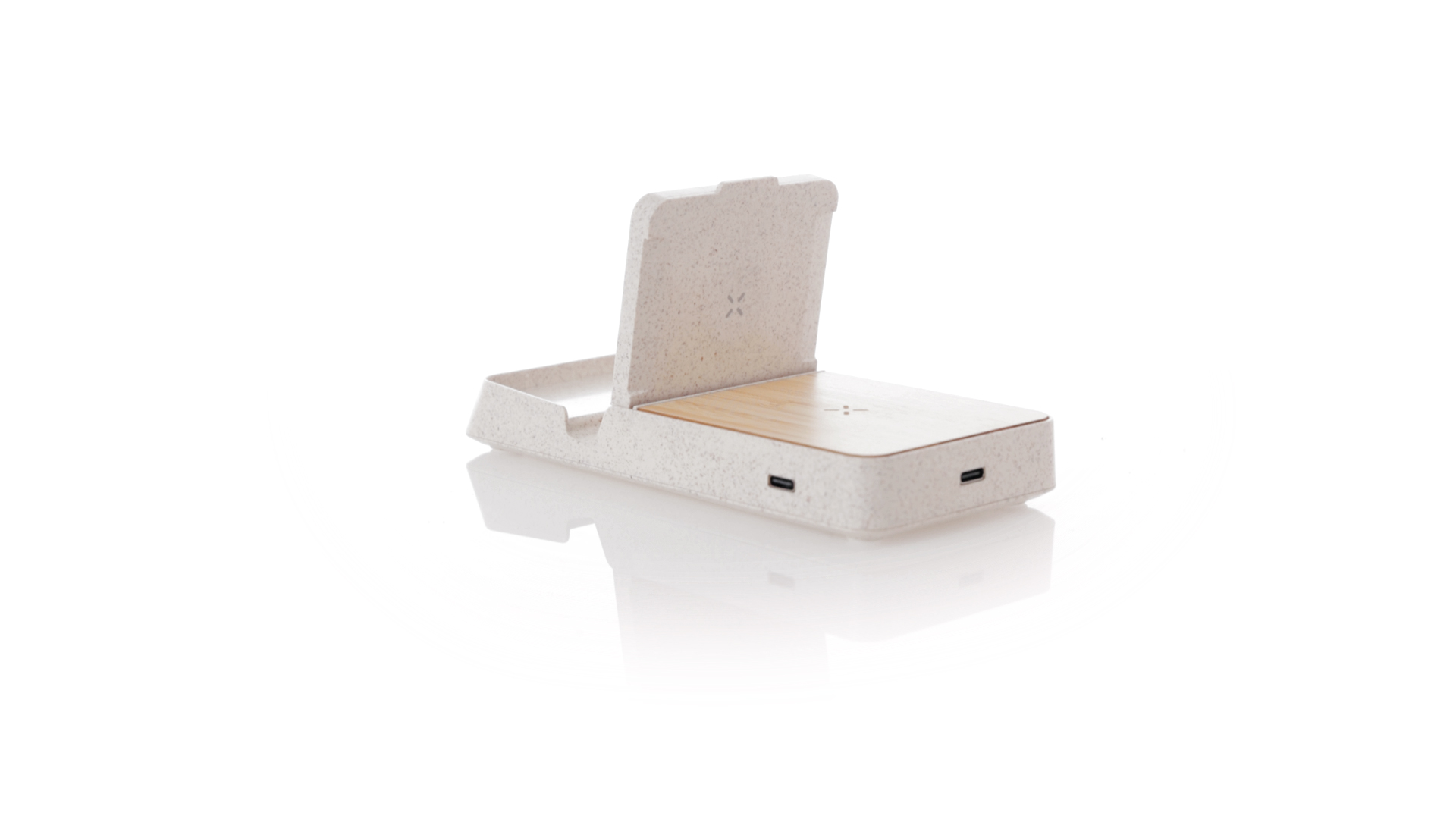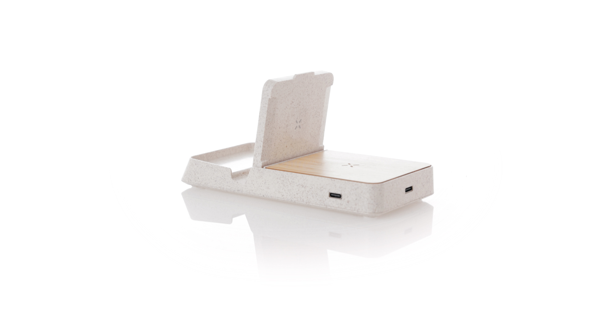 Komplettes kabelloses 15-W-Ladegerät mit Halterung, hergestellt aus einer Kombination von Bambus und Weizenstroh. Entwickelt für das gleichzeitige Aufladen von Smartphone, Smartwatch und Kopfhörern, sowohl kabellos als auch über den Typ-C-Anschluss. Eine vielseitige All-in-One-Ladestation mit Smartphone- oder Tablet-Halterung. Präsentiert in einer attraktiven individuellen Kraftbox und mit Bedienungsanleitung in Englisch und Spanisch erhältlich.Weizenstroh fördert die Verwendung von natürlichen Rohstoffen und reduziert so den Schadstoffausstoss.Materialien wie Bambus fördern die Verwendung natürlicher Rohstoffe und verringern so den Schadstoffausstoss. Bambus ist eine sehr widerstandsfähige und vielseitige Pflanze, die schnell wächst und sich regeneriert, was sie zu einer hervorragenden Alternative zu herkömmlichem Holz macht.Hergestellt gemäss den RoHS-Normen und unter Einhaltung der folgenden Sicherheitsanforderungen:Überhitzungsschutzsystem.Überladungsschutzsystem.Blockiersystem zur Vermeidung von Kurzschlüssen.