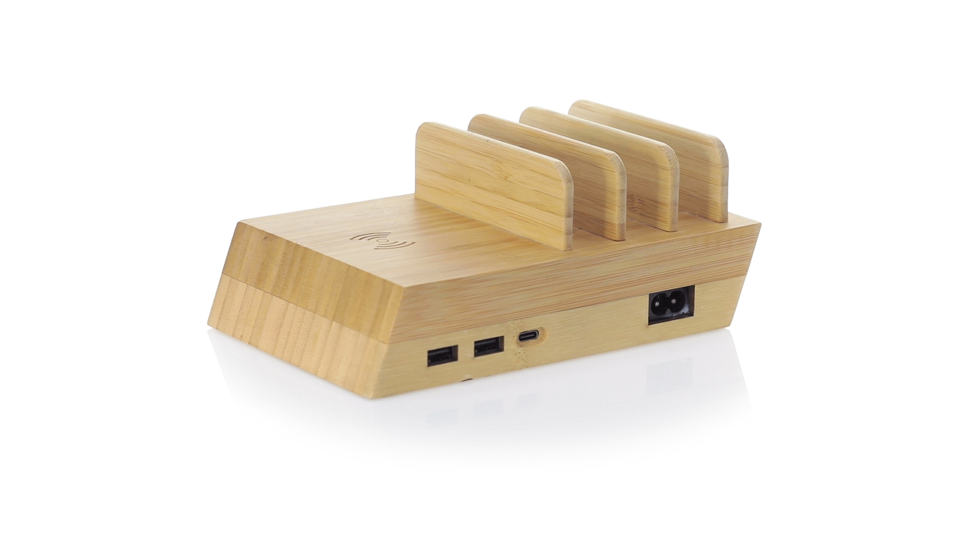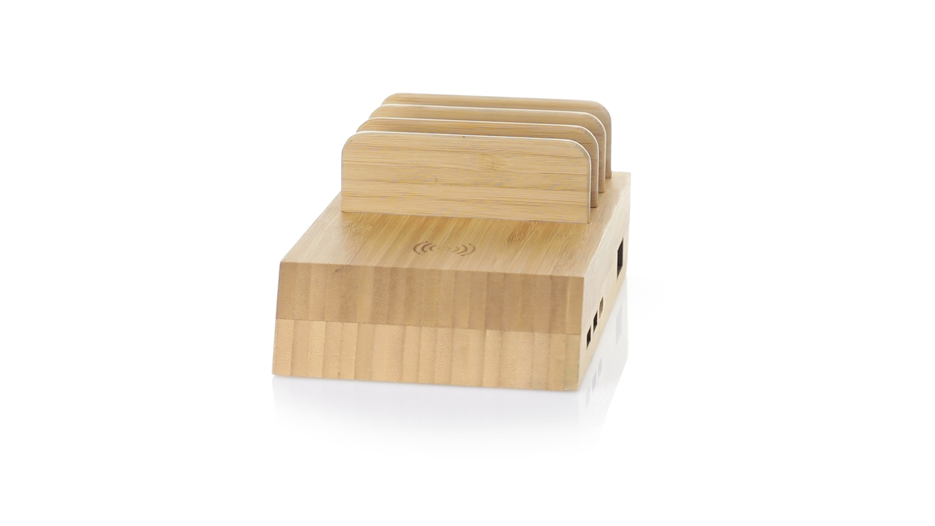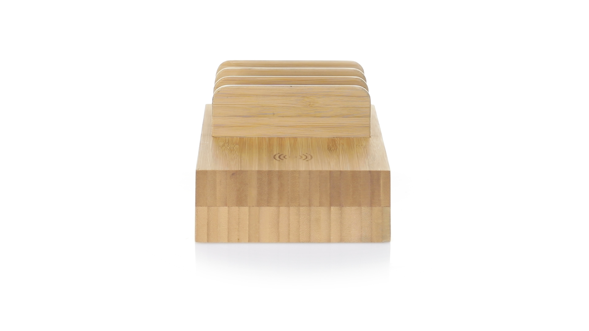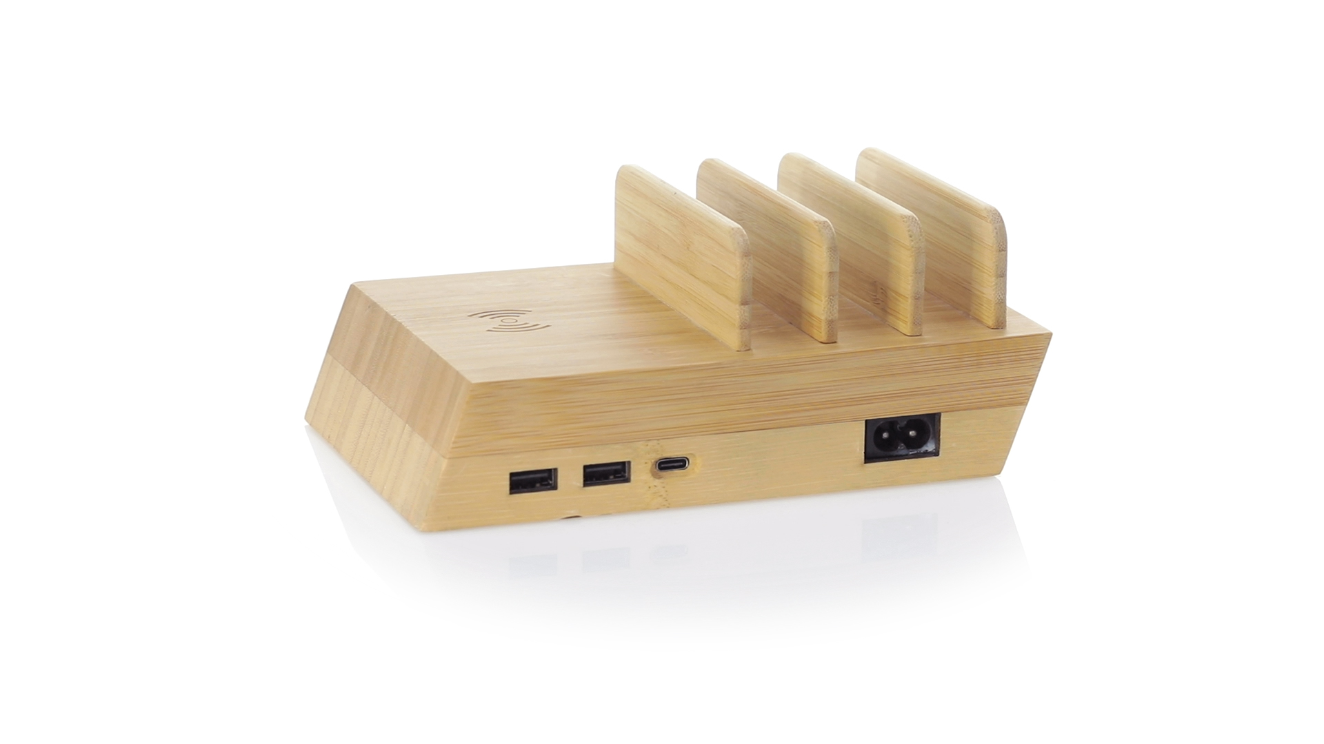 Linie "Natur" drahtlose Ladestation, Multi-Gerät und 10W-Ladung, kann bis zu 4 Geräte gleichzeitig aufladen. Hergestellt aus Bambus und mit 2 USB- und 1 Typ-C-Ausgang. Kompatibel mit Geräten, die mit kabelloser Ladetechnik ausgestattet sind. 150 cm langes Anschlusskabel, mit einem europäischen Stecker und breiter Druckfläche. Präsentiert in einer attraktiven Box im Öko-Design, mit Bedienungsanleitung in Englisch und Spanisch. Entspricht den Sicherheitsanforderungen: Überhitzungsschutzsystem, Schutzsystem gegen Überladung, Blockiersystem zur Vermeidung von Kurzschlüssen.