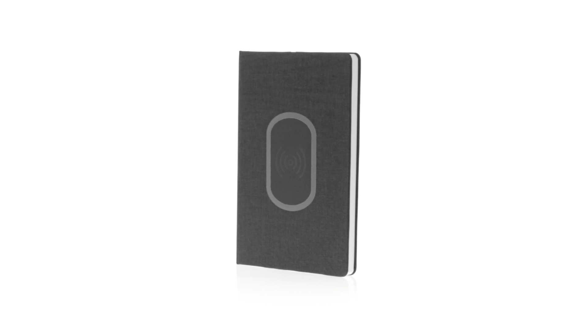 Notizblock aus robustem 300D Polyester mit schlichtem Design und integriertem, kabellosem Ladegerät. Ladestation auf dem Cover. Mit 80 linierten Blättern.
