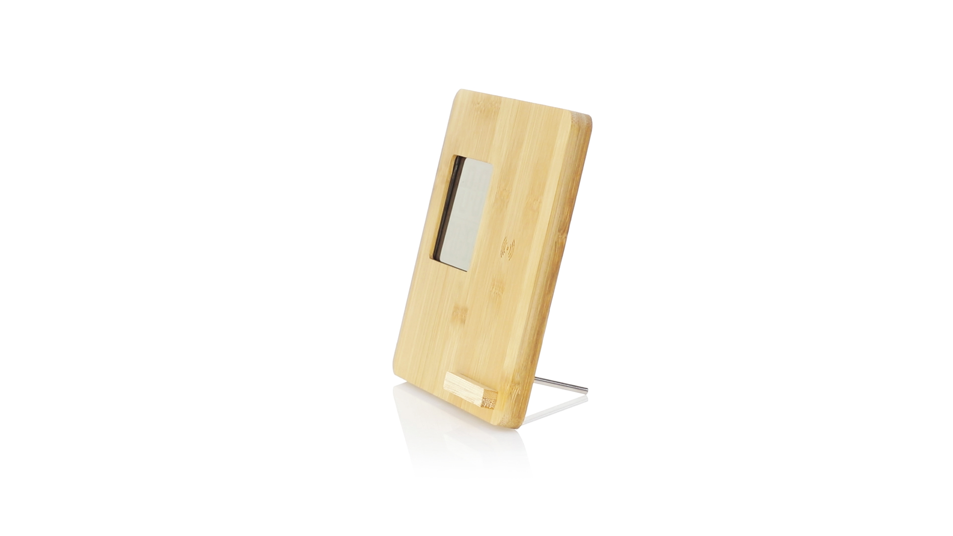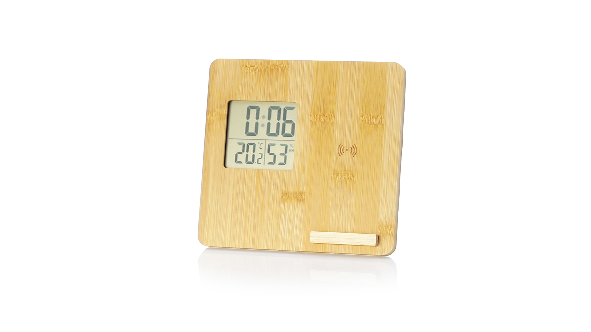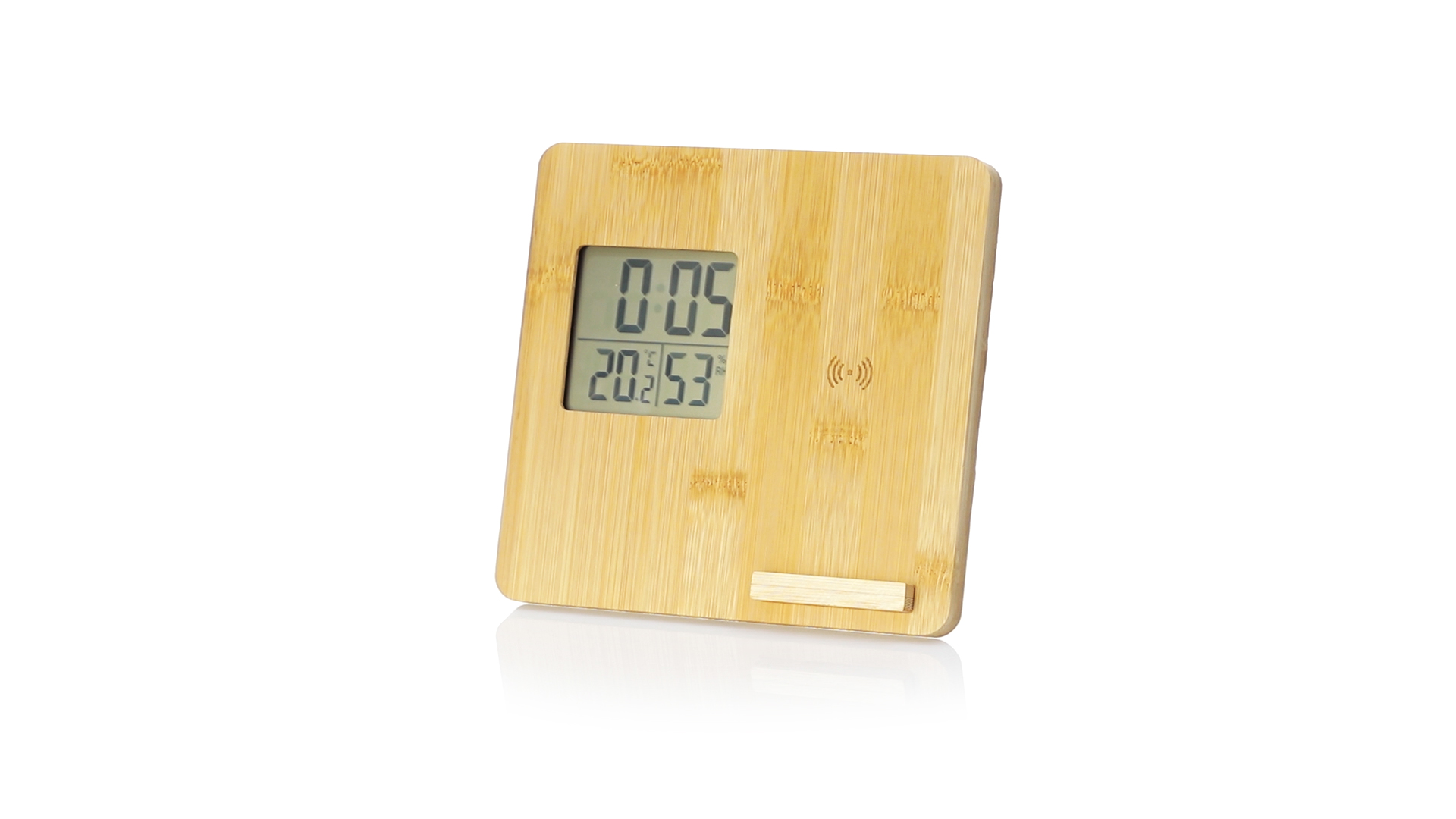Linie "Natur" Wetterstation mit integriertem kabellosen 10W-Ladegerät. Hergestellt aus poliertem Bambus, mit Thermometer- und Hygrometerfunktionen. Inklusive 1 m Micro-USB-Ladekabel und kompatibel mit Geräten, die mit kabelloser Ladetechnik ausgestattet sind. Die Uhr ist batteriebetrieben (Knopfzelle im Lieferumfang enthalten) und wird in einer attraktiven Ökodesign-Box geliefert. Gebrauchsanweisung in Englisch und Spanisch erhältlich.