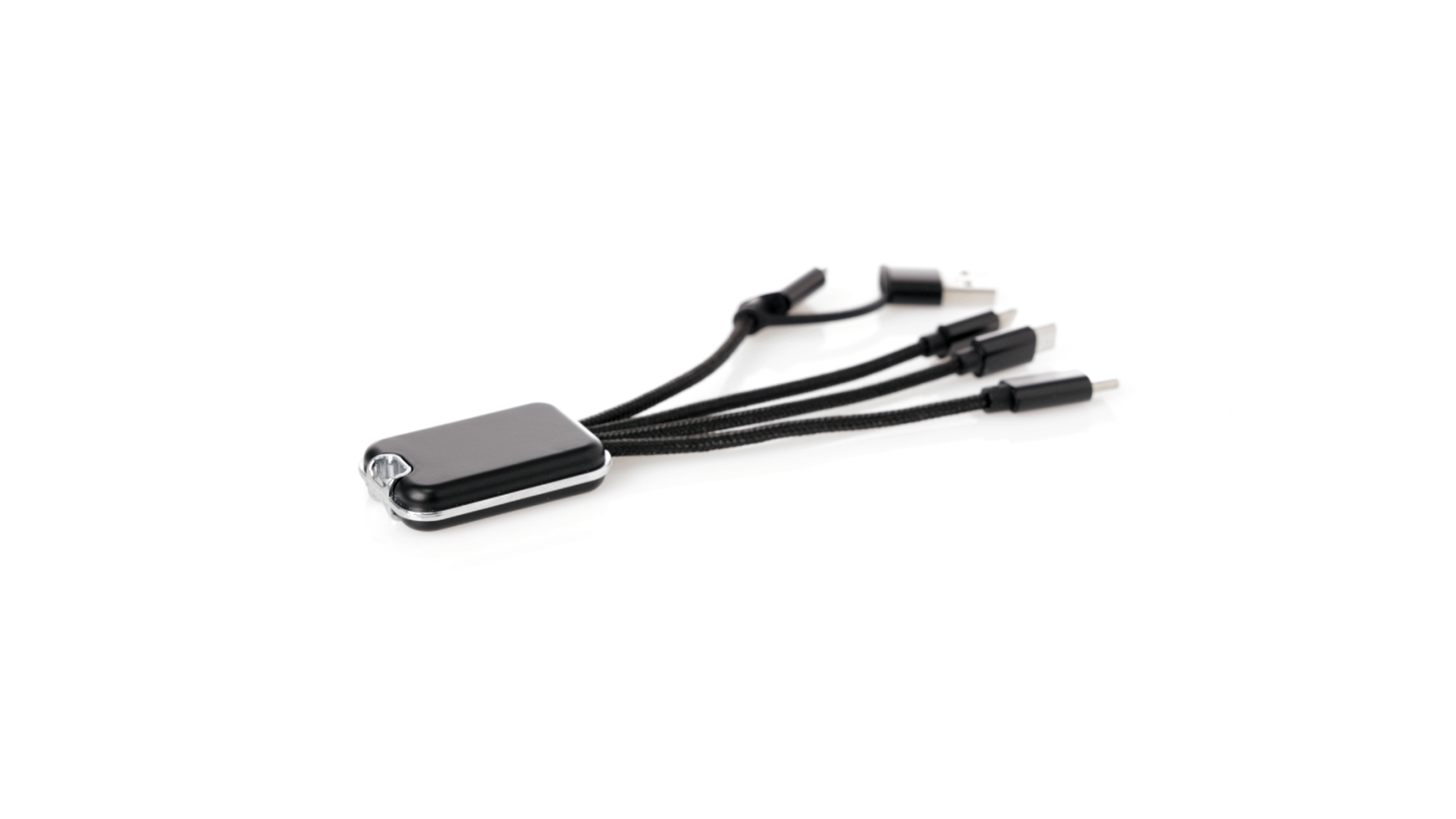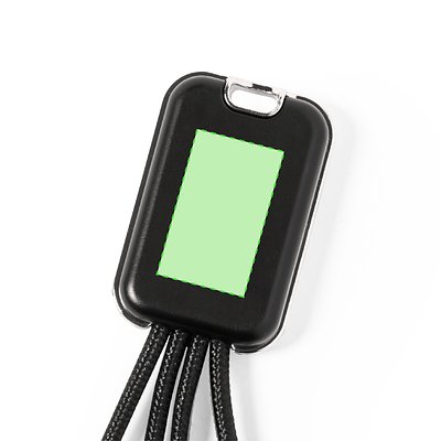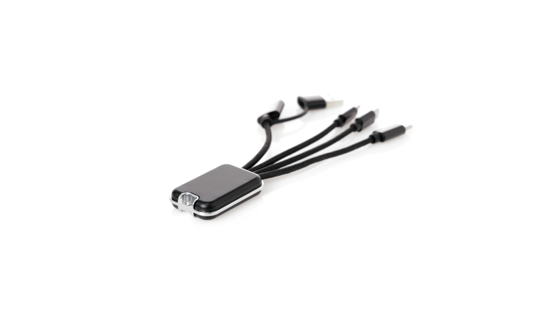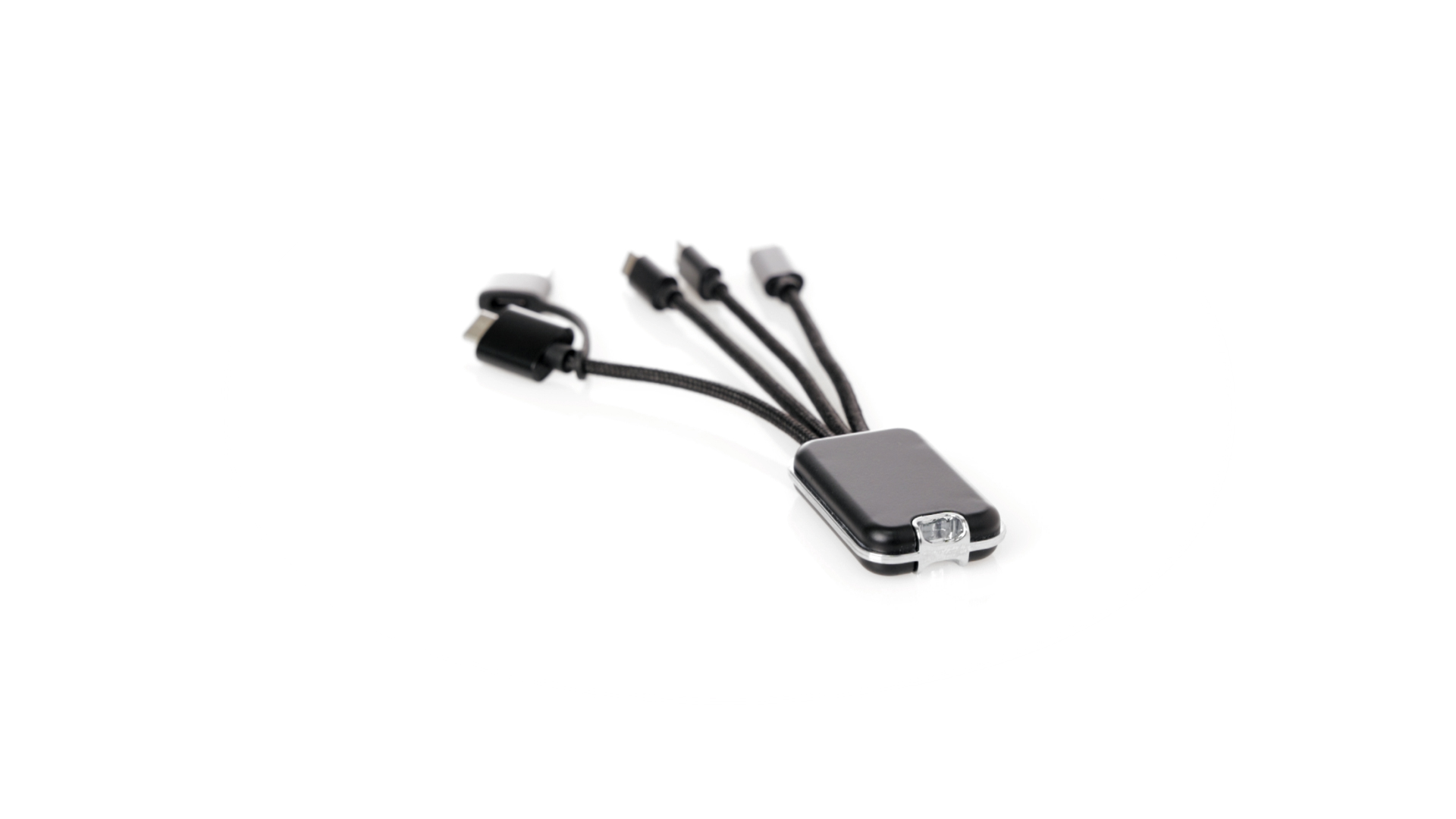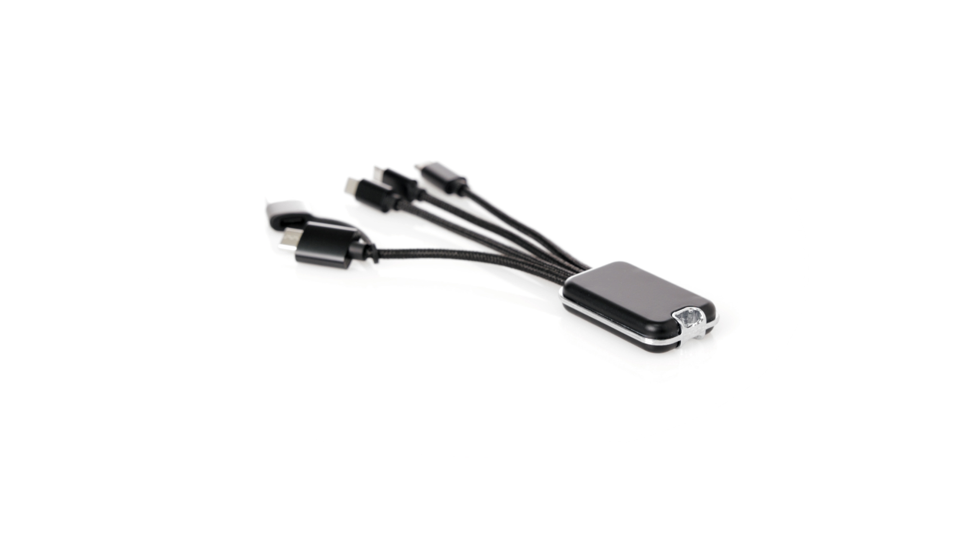 Cable cargador con luz, con pieza central especialmente diseñada para marcaje en láser e iluminar el logotipo. Con conexiones de entrada Tipo C y USB y salidas Tipo C, Lightning y Micro USB. 5V DC 2.4A. En elegante acabado de color negro, con cables recubiertos en tela de poliéster.