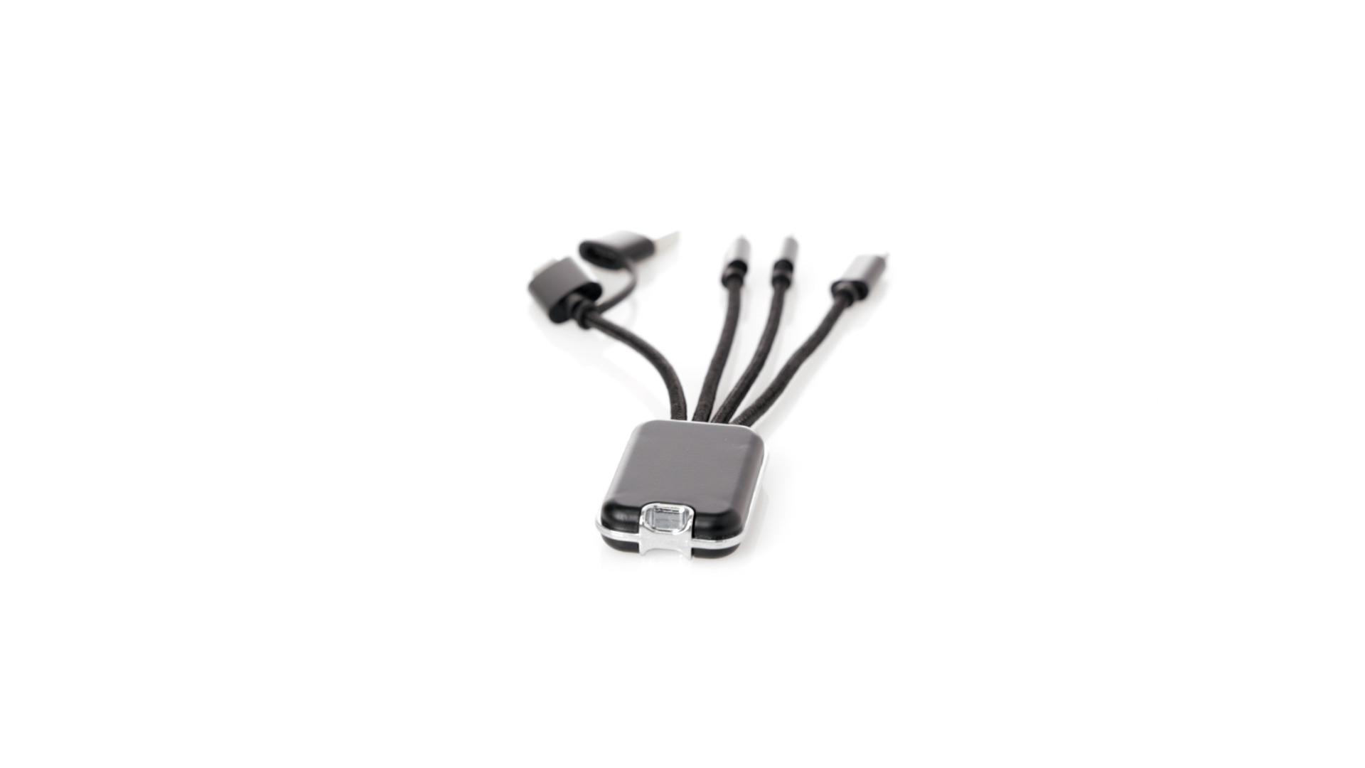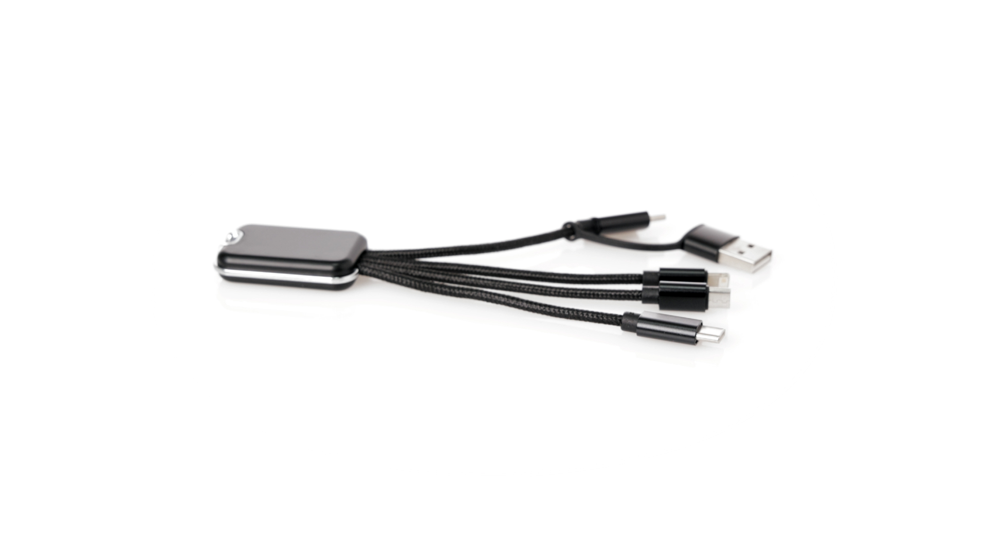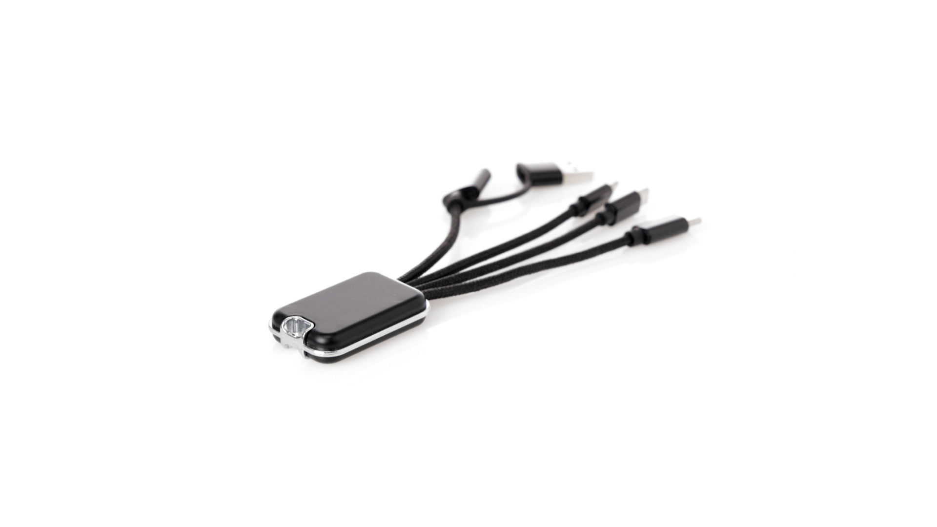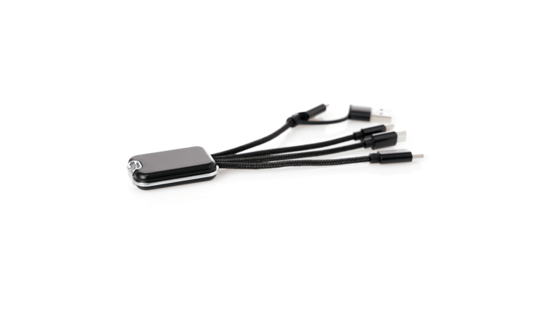 Cable cargador con luz, con pieza central especialmente diseñada para marcaje en láser e iluminar el logotipo. Con conexiones de entrada Tipo C y USB y salidas Tipo C, Lightning y Micro USB. 5V DC 2.4A. En elegante acabado de color negro, con cables recubiertos en tela de poliéster.
