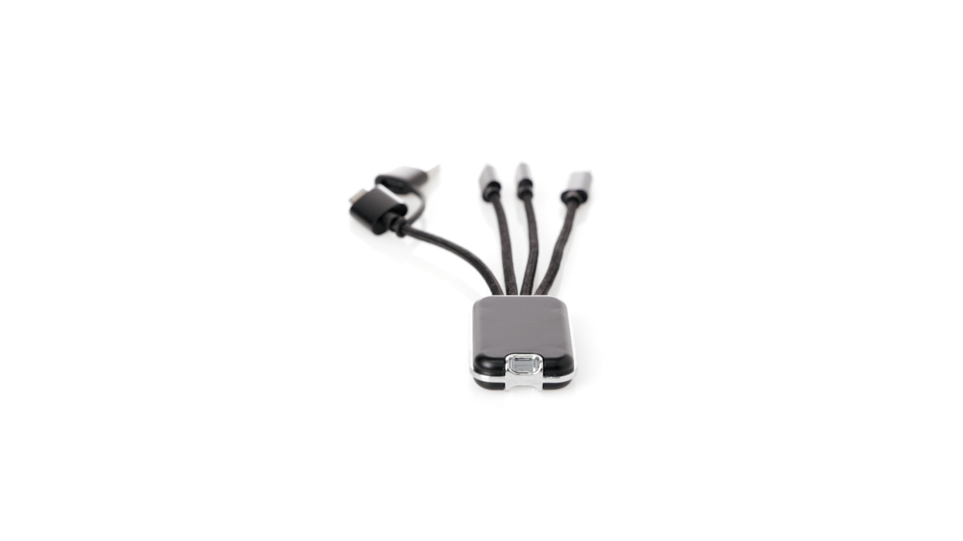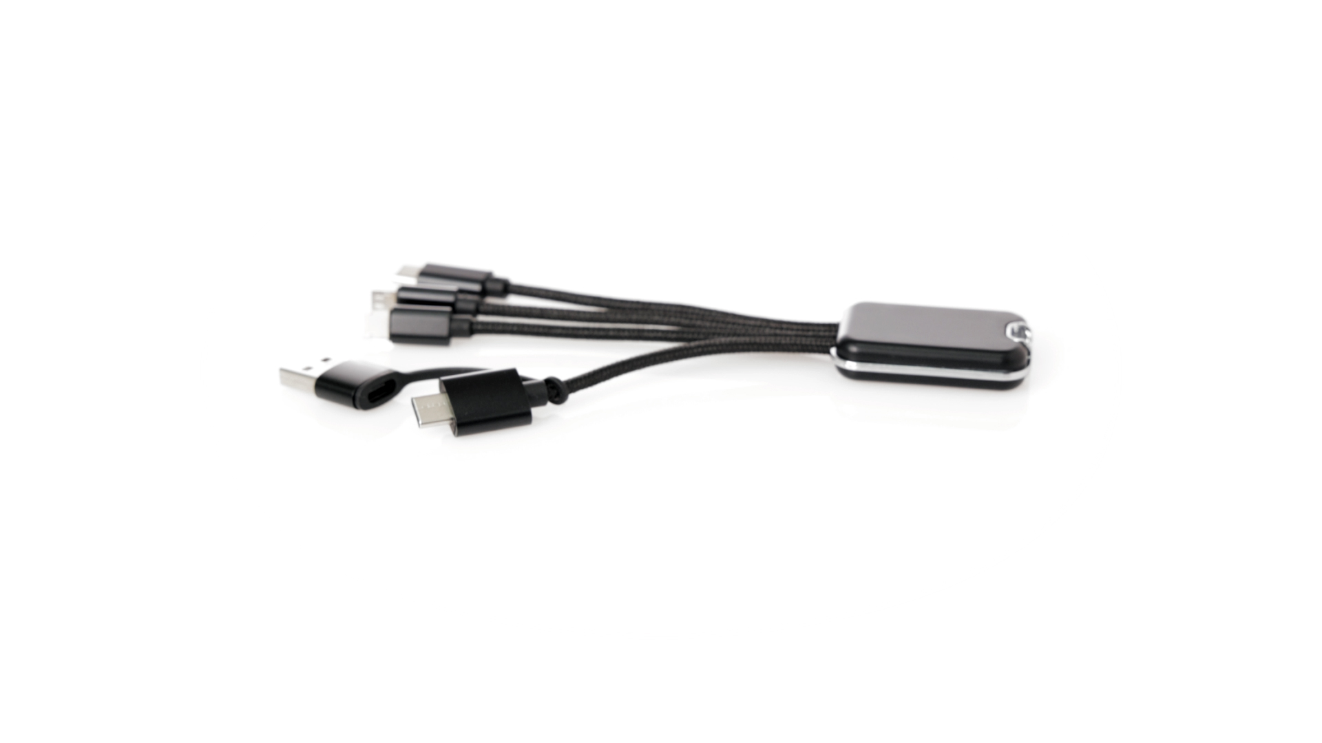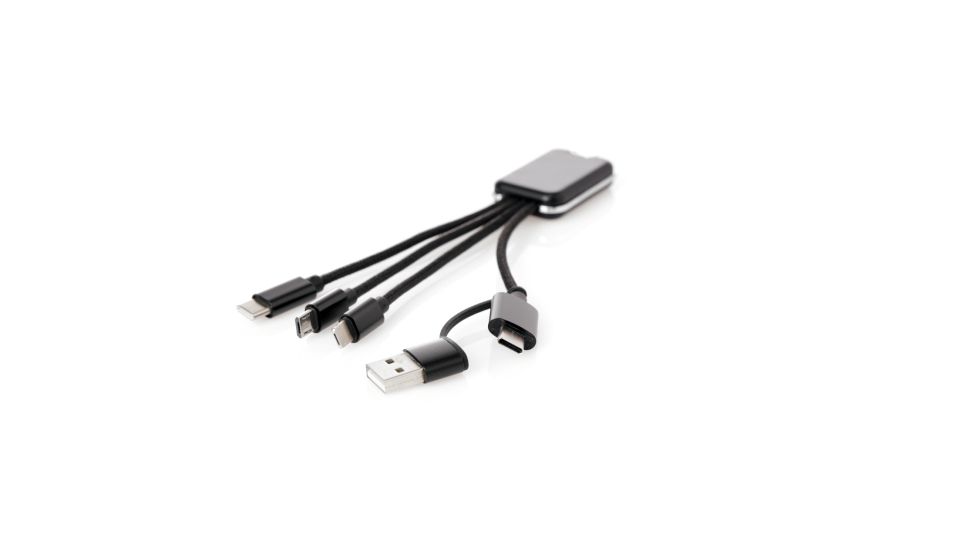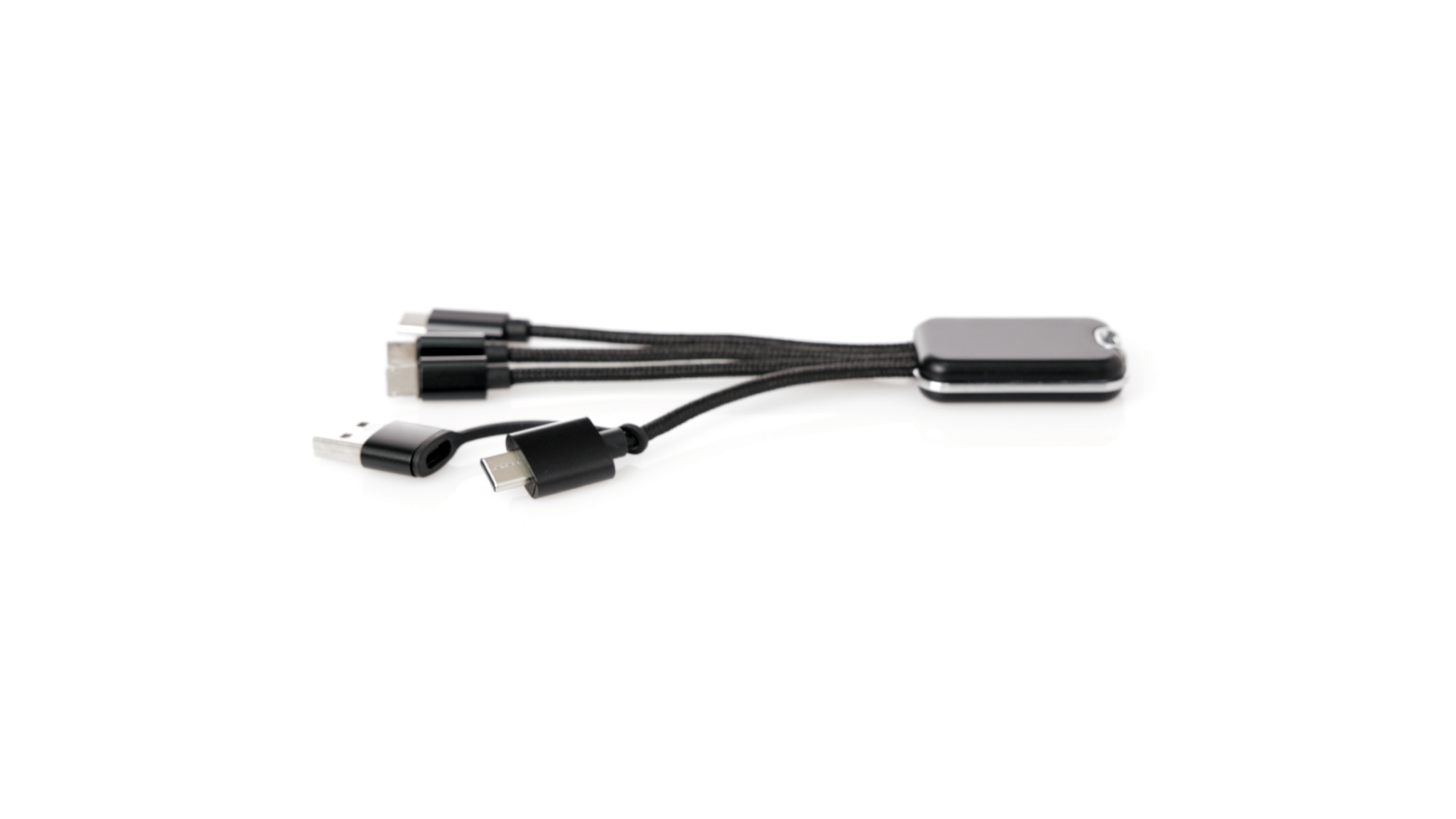 Cable cargador con luz, con pieza central especialmente diseñada para marcaje en láser e iluminar el logotipo. Con conexiones de entrada Tipo C y USB y salidas Tipo C, Lightning y Micro USB. 5V DC 2.4A. En elegante acabado de color negro, con cables recubiertos en tela de poliéster.