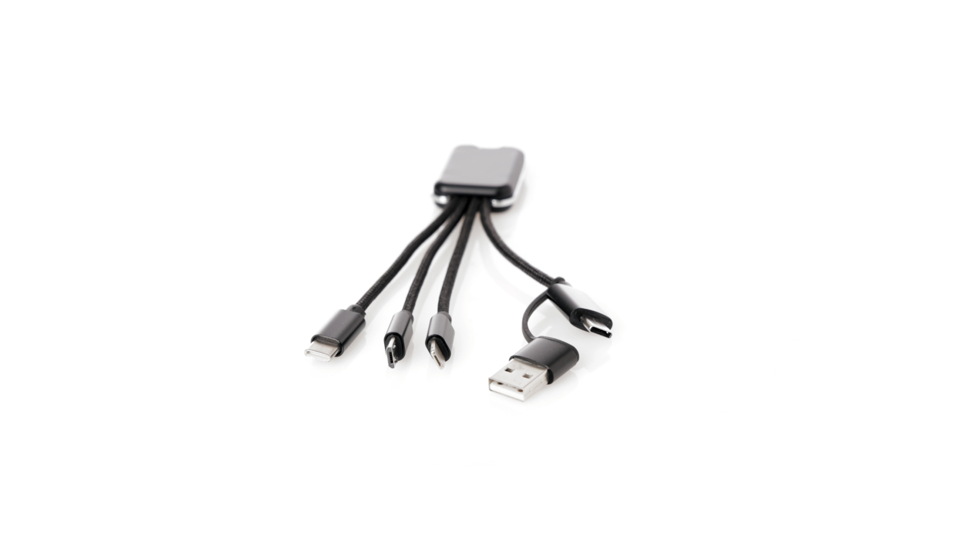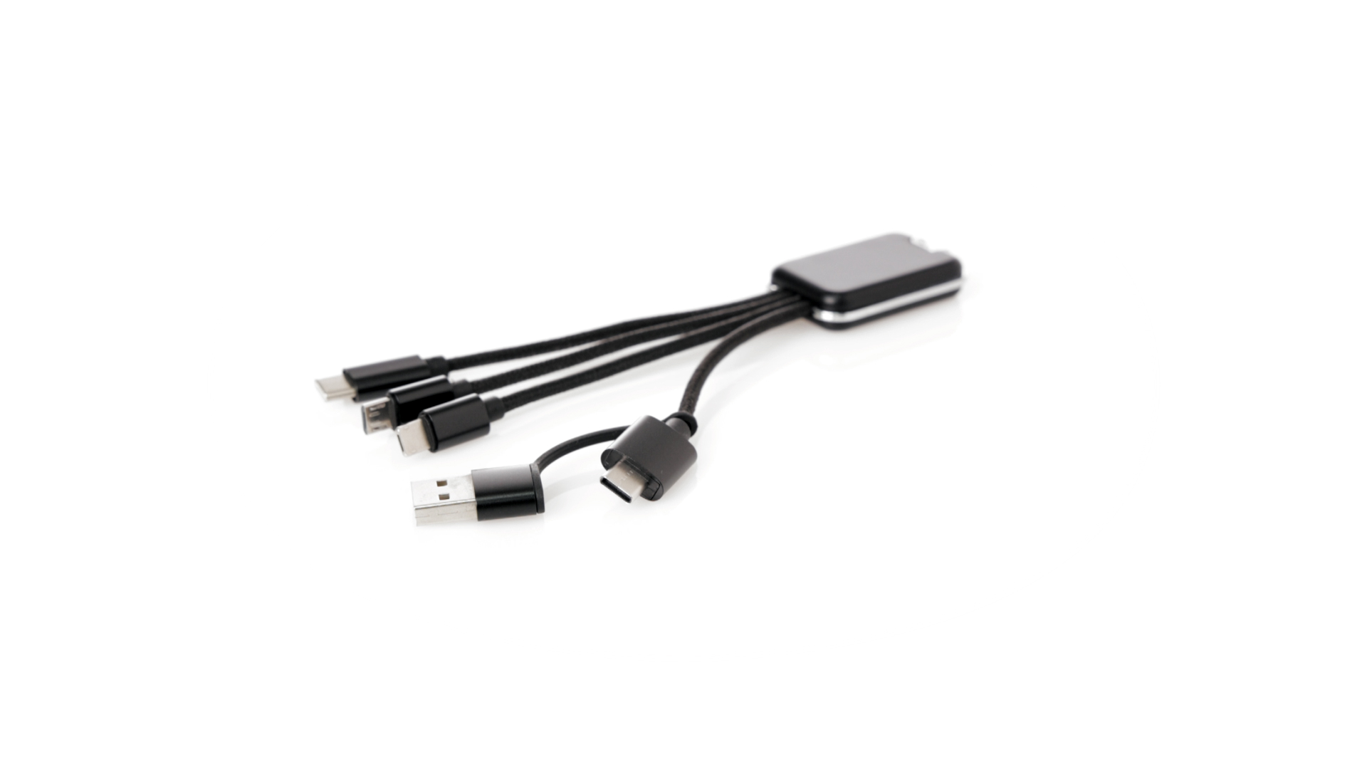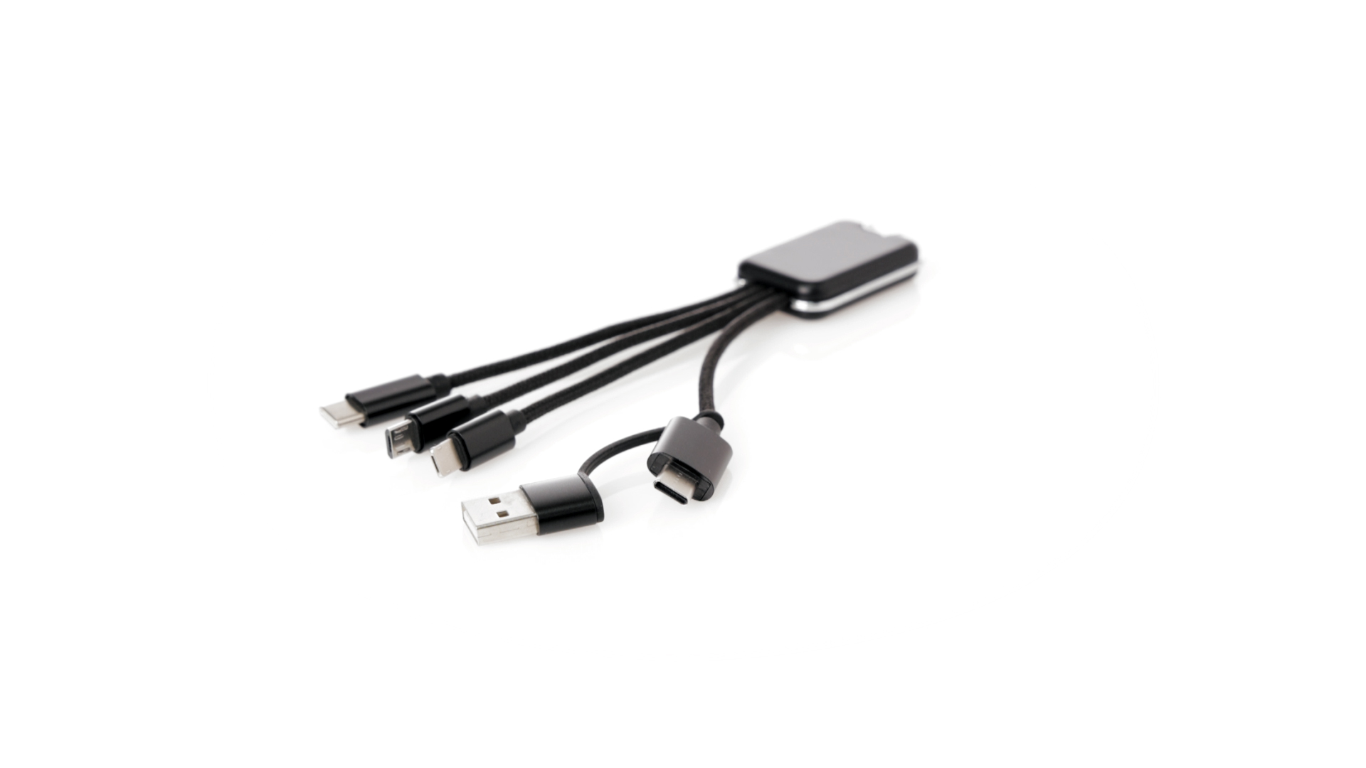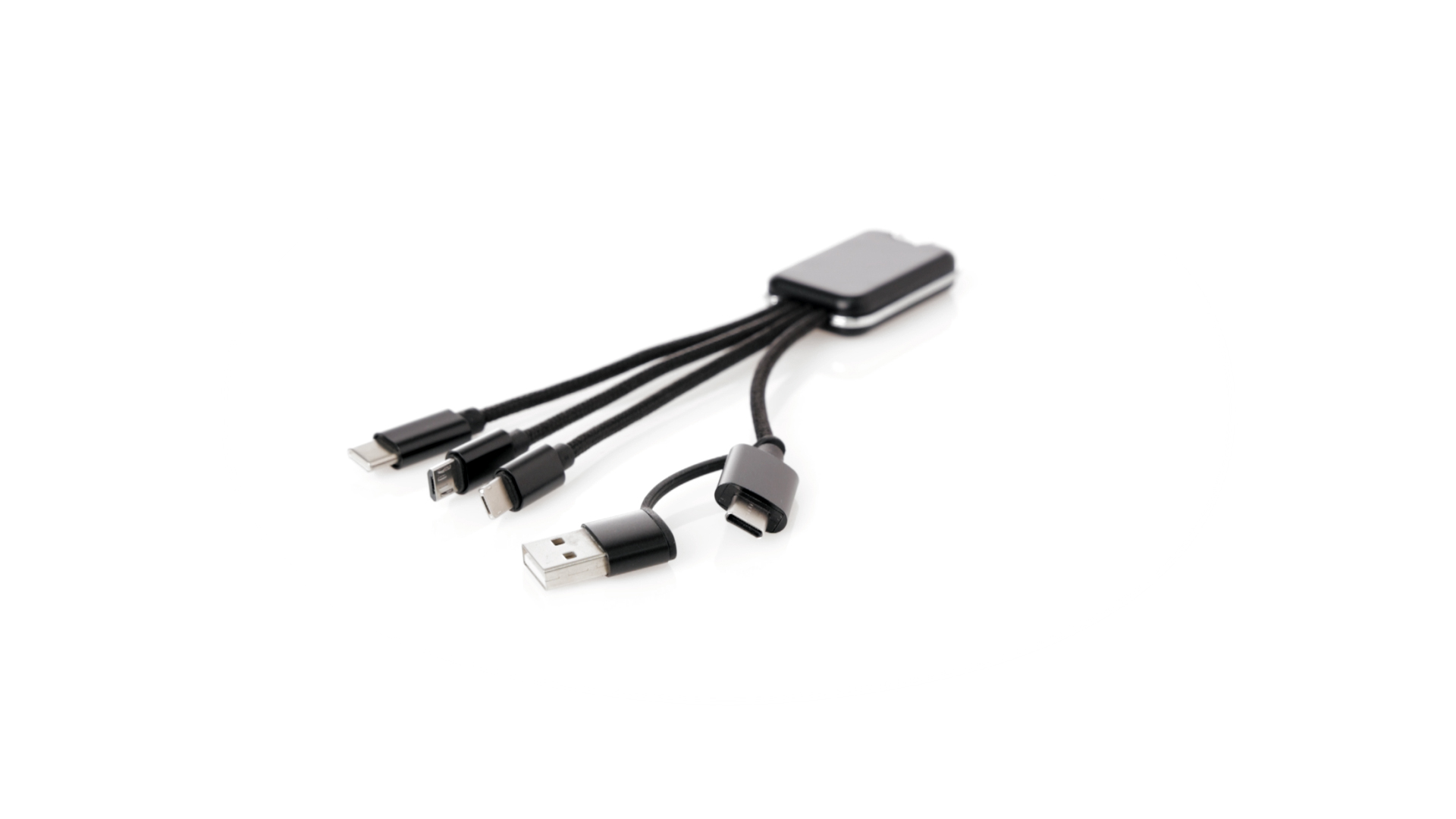 Cable cargador con luz, con pieza central especialmente diseñada para marcaje en láser e iluminar el logotipo. Con conexiones de entrada Tipo C y USB y salidas Tipo C, Lightning y Micro USB. 5V DC 2.4A. En elegante acabado de color negro, con cables recubiertos en tela de poliéster.