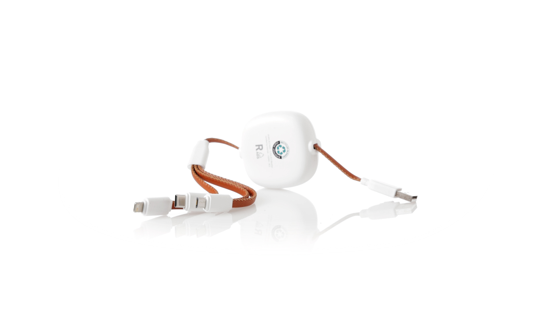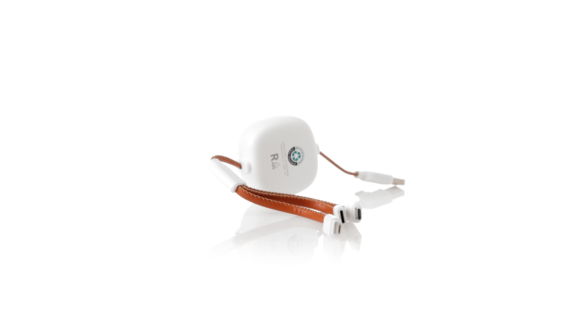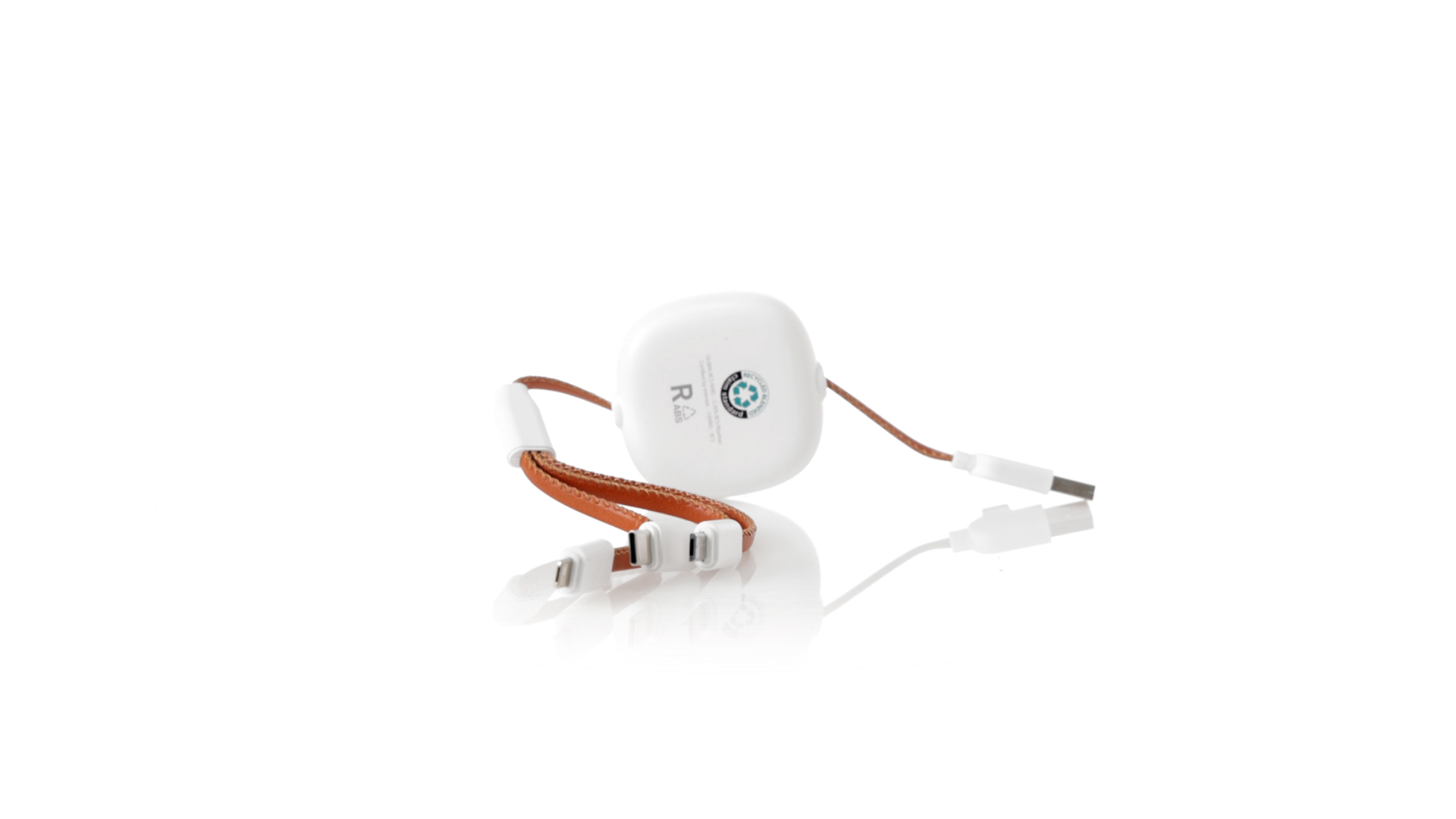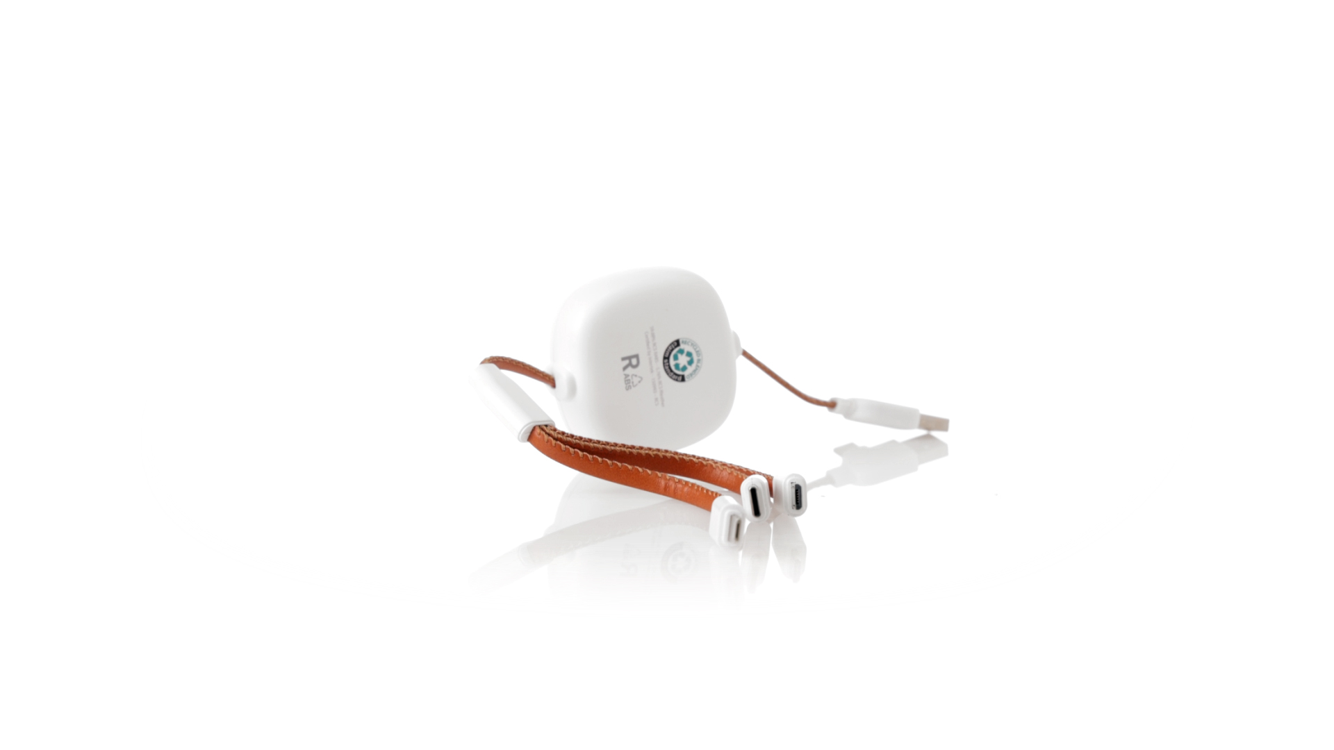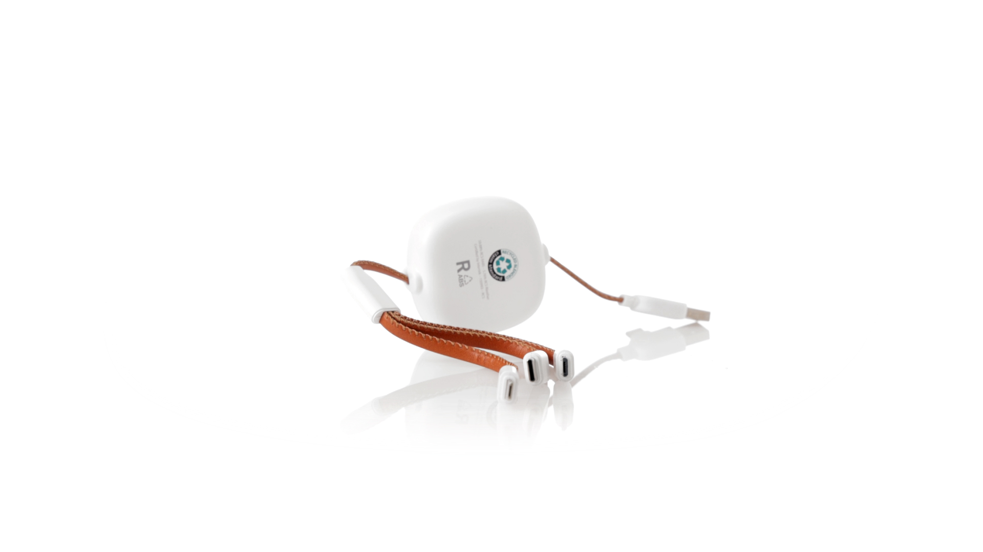 m langes, ausziehbares Ladekabel, hergestellt aus RABS und in elegantem Weiss, mit Kabeln und Details aus recyceltem Leder. Mittelteil mit recyceltem Lederbezug und internem Mechanismus zur Verlängerung des Kabels. Mit Typ-C- und USB-Eingangsanschlüssen sowie Typ-C-, Lightning- und Micro-USB-Ausgängen. 5 V DC 2,4 A RABS oder recyceltes ABS-Material und recyceltes Leder stammen aus dem Recycling von Artikeln am Ende ihrer Lebensdauer. Die verwendeten recycelten Materialien verfügen über eine RCS-Zertifizierung, die ihre recycelte Herkunft garantiert.