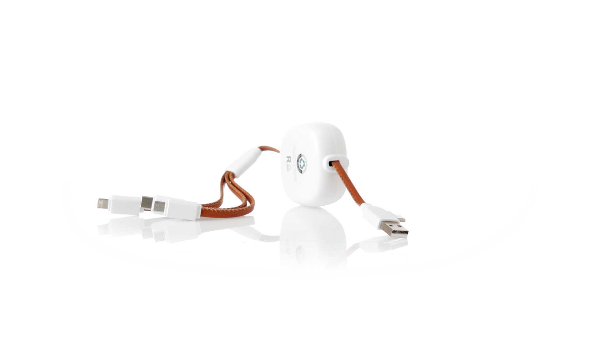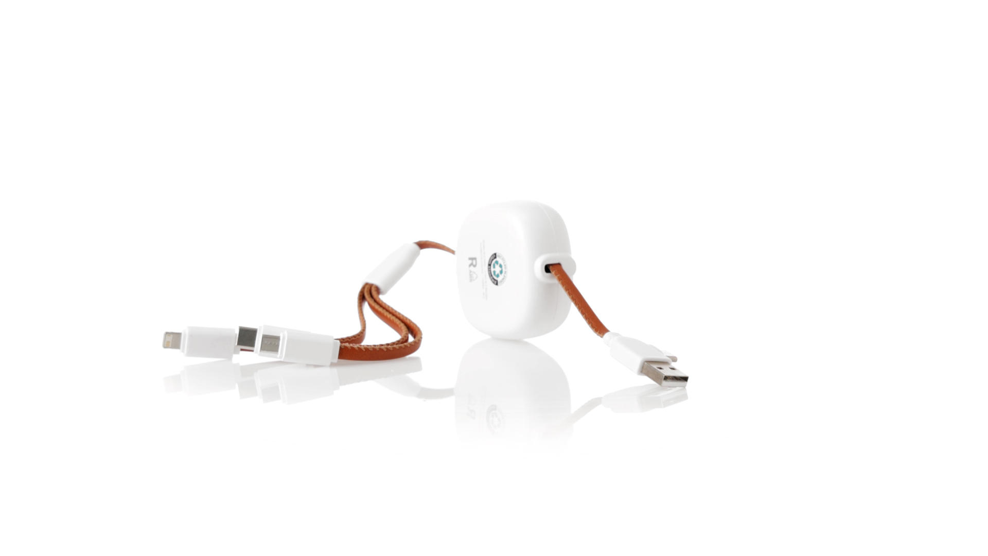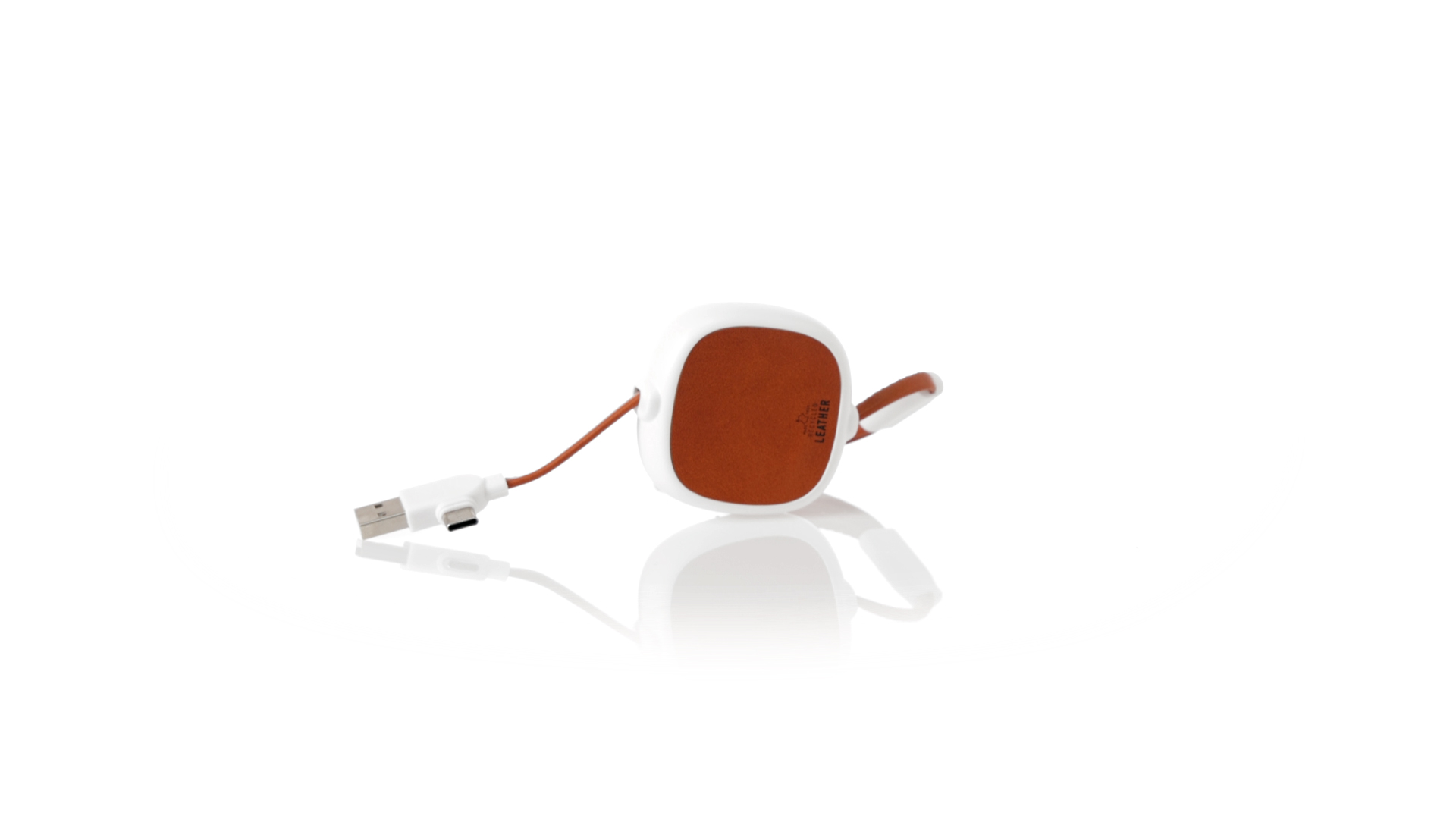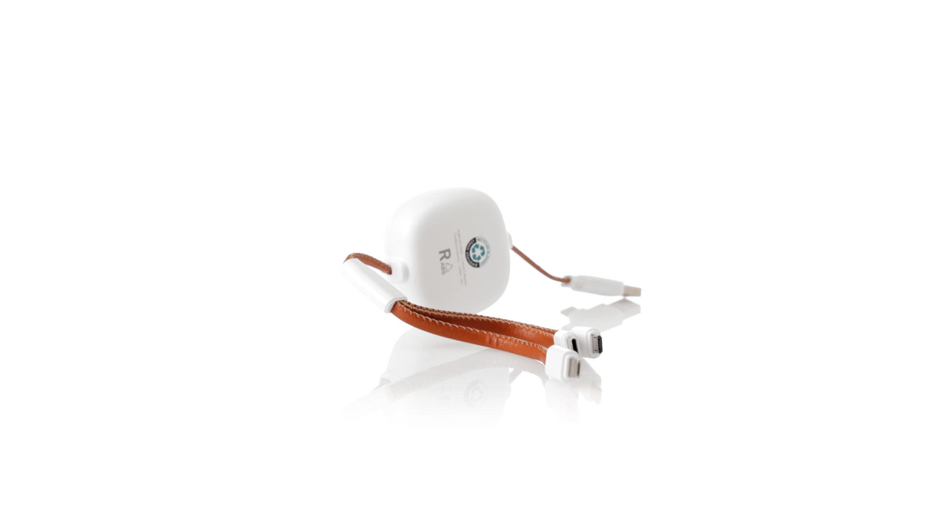 m langes, ausziehbares Ladekabel, hergestellt aus RABS und in elegantem Weiss, mit Kabeln und Details aus recyceltem Leder. Mittelteil mit recyceltem Lederbezug und internem Mechanismus zur Verlängerung des Kabels. Mit Typ-C- und USB-Eingangsanschlüssen sowie Typ-C-, Lightning- und Micro-USB-Ausgängen. 5 V DC 2,4 A RABS oder recyceltes ABS-Material und recyceltes Leder stammen aus dem Recycling von Artikeln am Ende ihrer Lebensdauer. Die verwendeten recycelten Materialien verfügen über eine RCS-Zertifizierung, die ihre recycelte Herkunft garantiert.