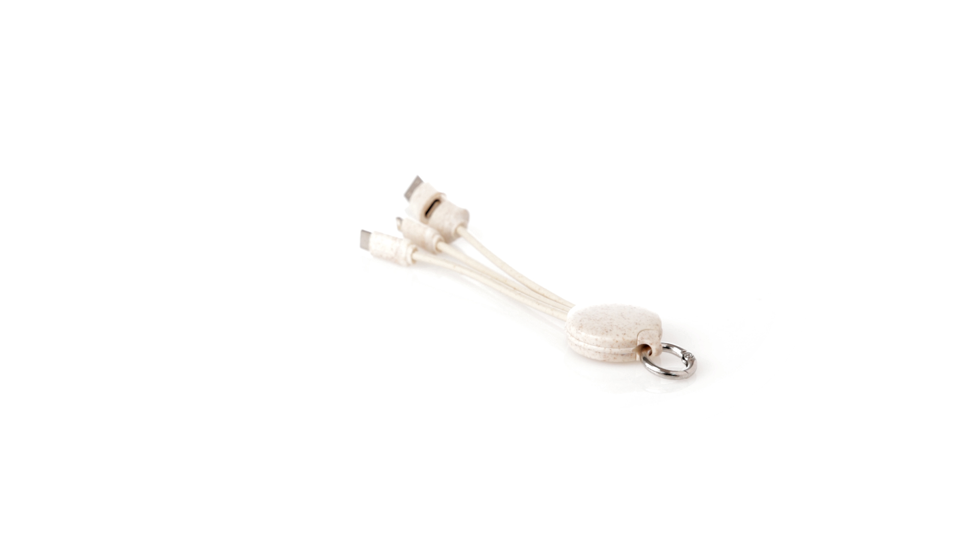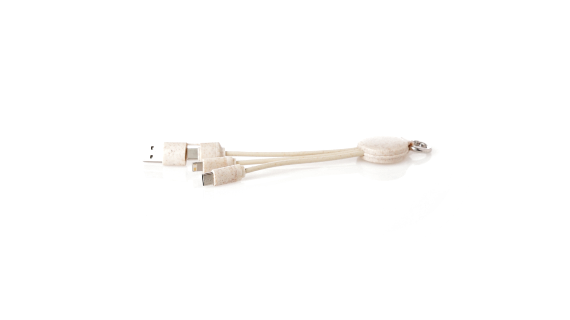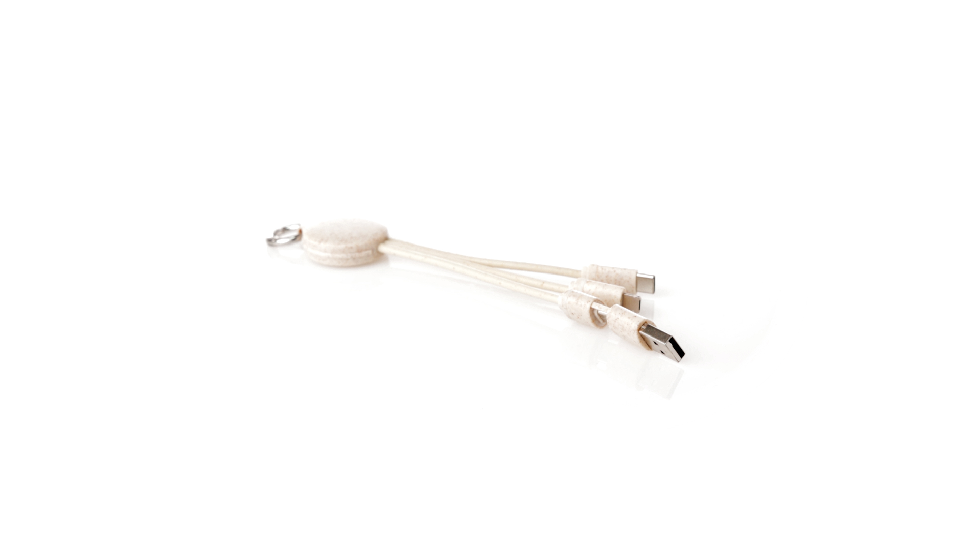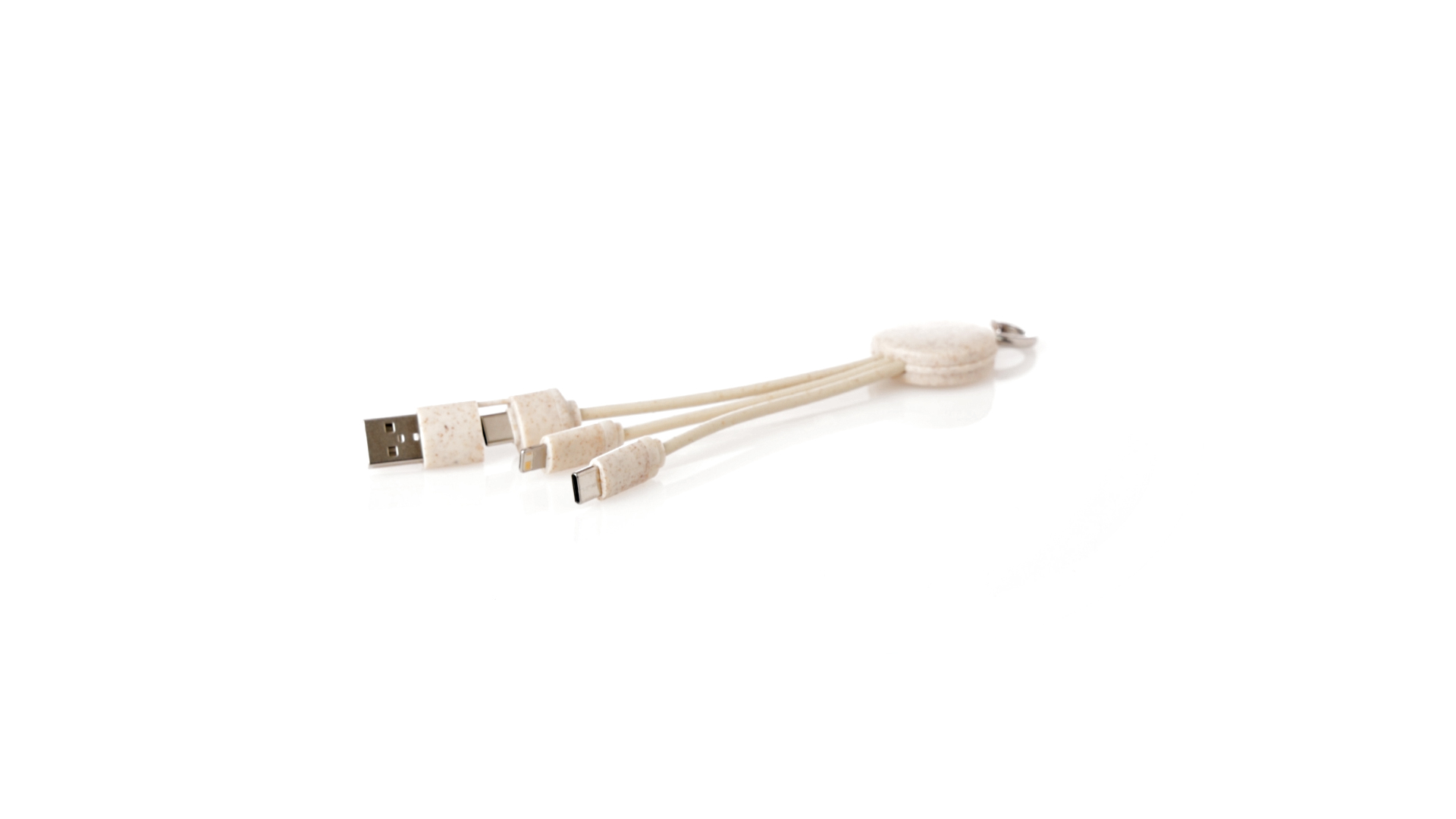 Ladekabel mit Ring aus Weizenstroh, das die Verwendung natürlicher Rohstoffe fördert und Schadstoffemissionen reduziert. Einschliesslich Typ-C- und USB-Eingangsanschlüsse Lightning, Micro-USB und USB-Ausgänge. Präsentiert in einer individuellen Kraft-Design-Tasche.