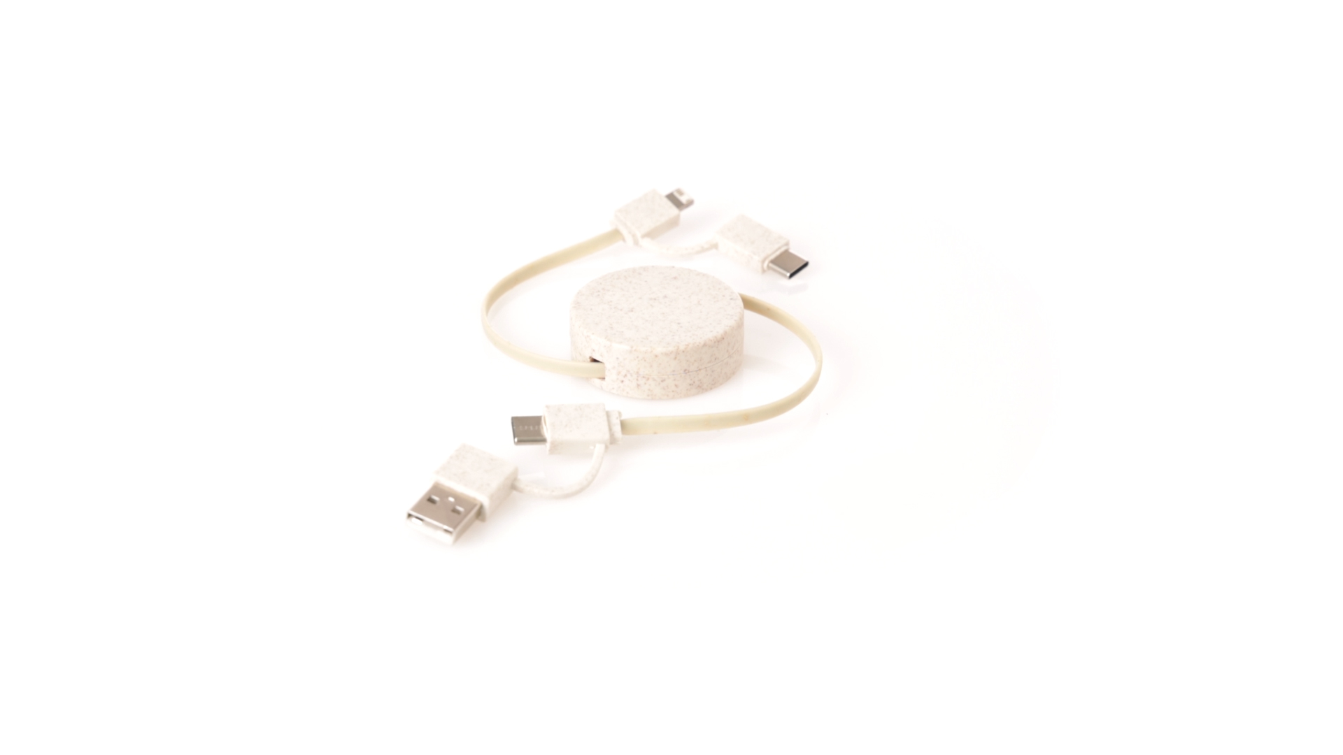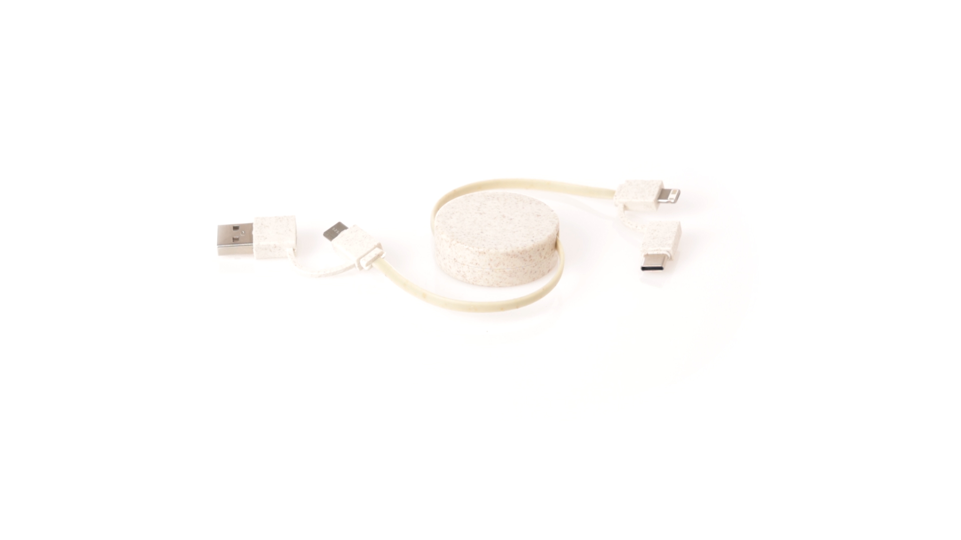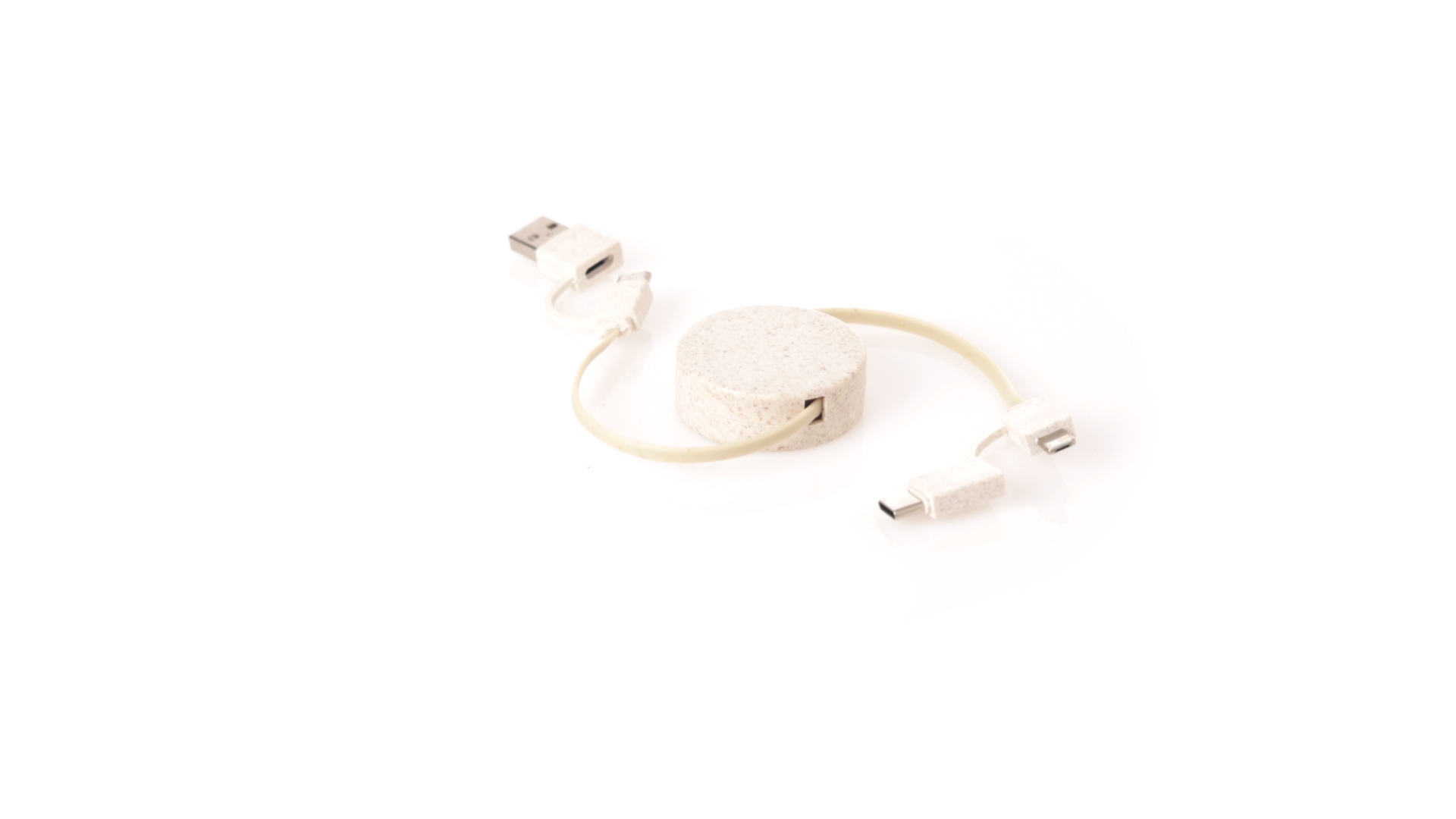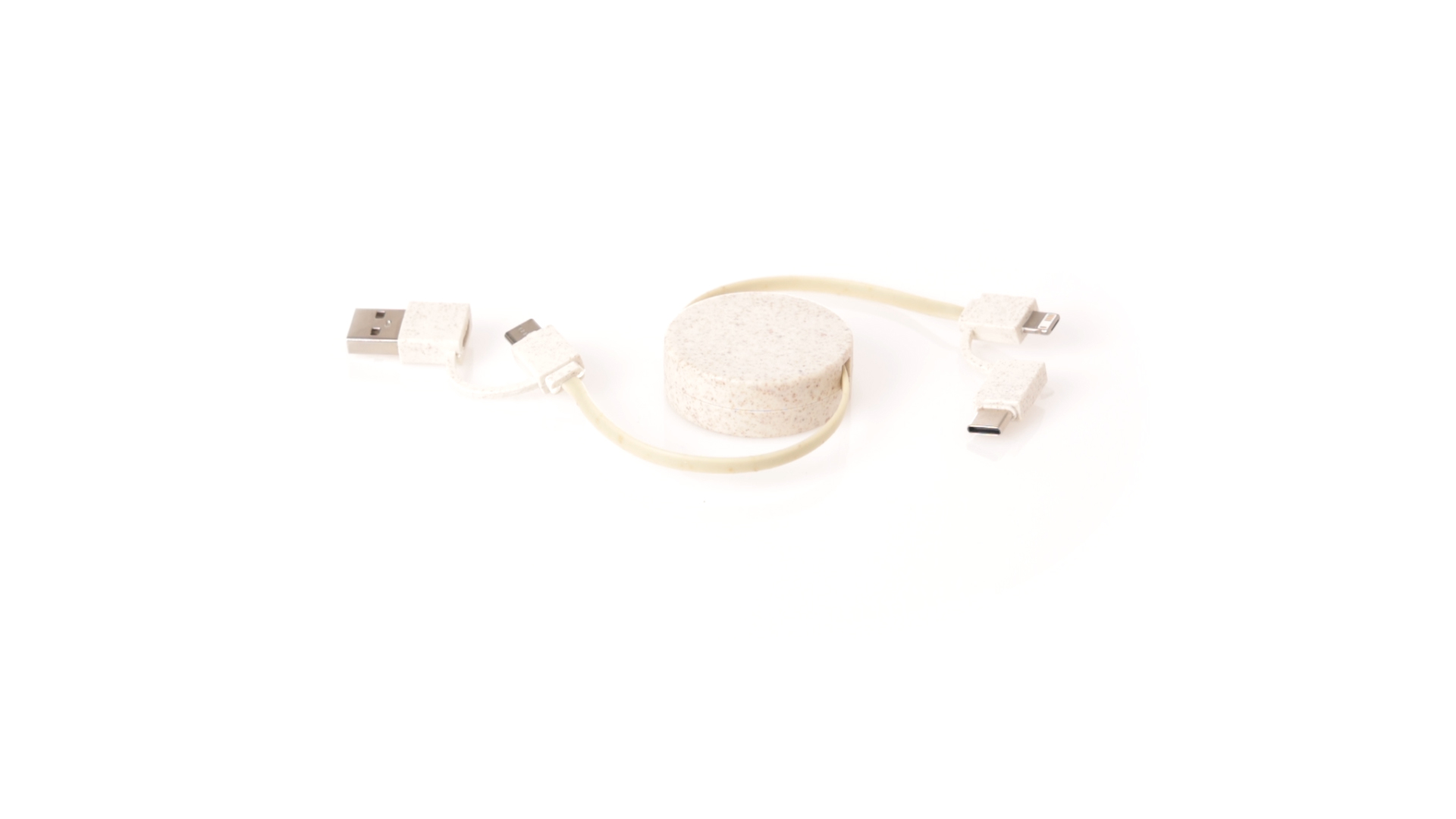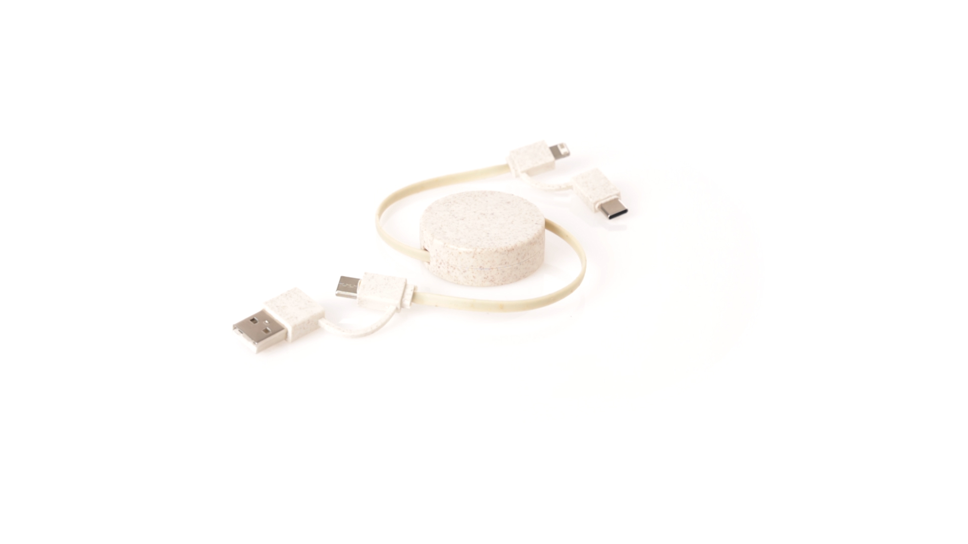 Cable cargador y sincronizador extensible, válido para cargar dispositivos y transferir datos. Fabricado en caña de trigo, para así fomentar la utilización de materias primas naturales y reducir las emisiones contaminantes. Pieza central con mecanismo interior extensible. Incluidas conexiones de entrada Tipo C y USB salidas Lightning, Micro USB y Tipo C. 5V DC 2.4A. Presentado en bolsa individual de diseño kraft.