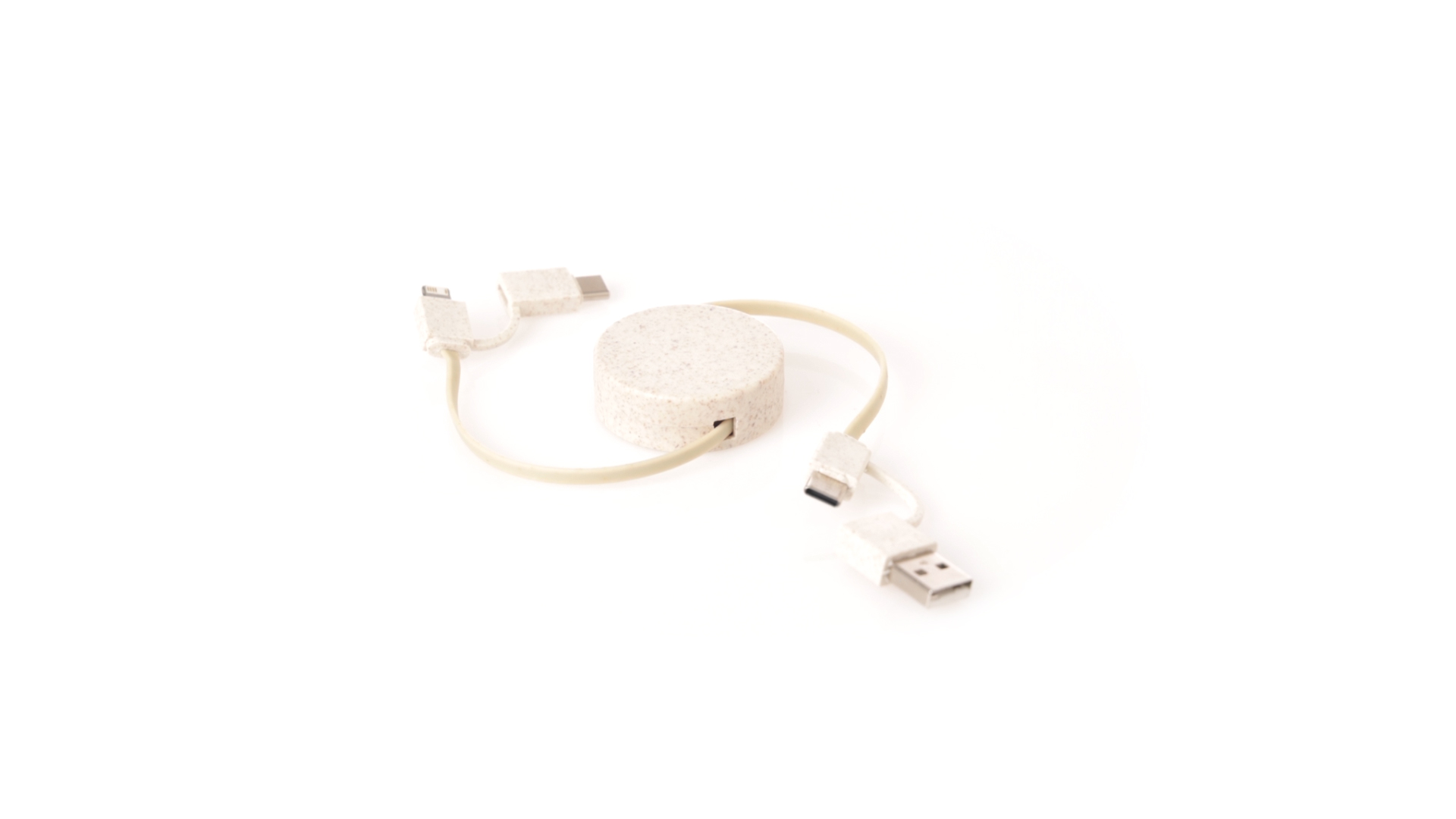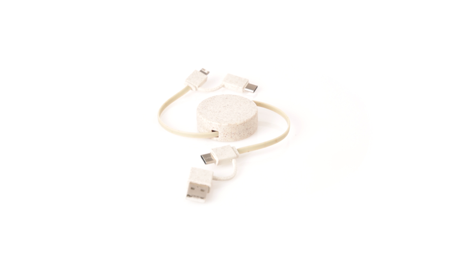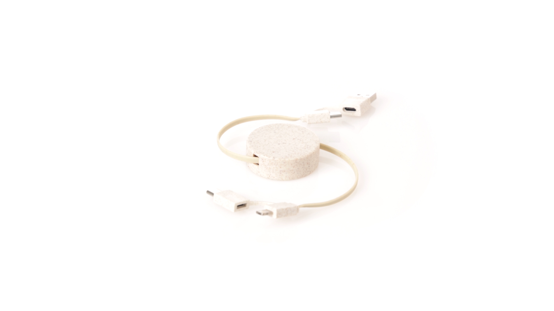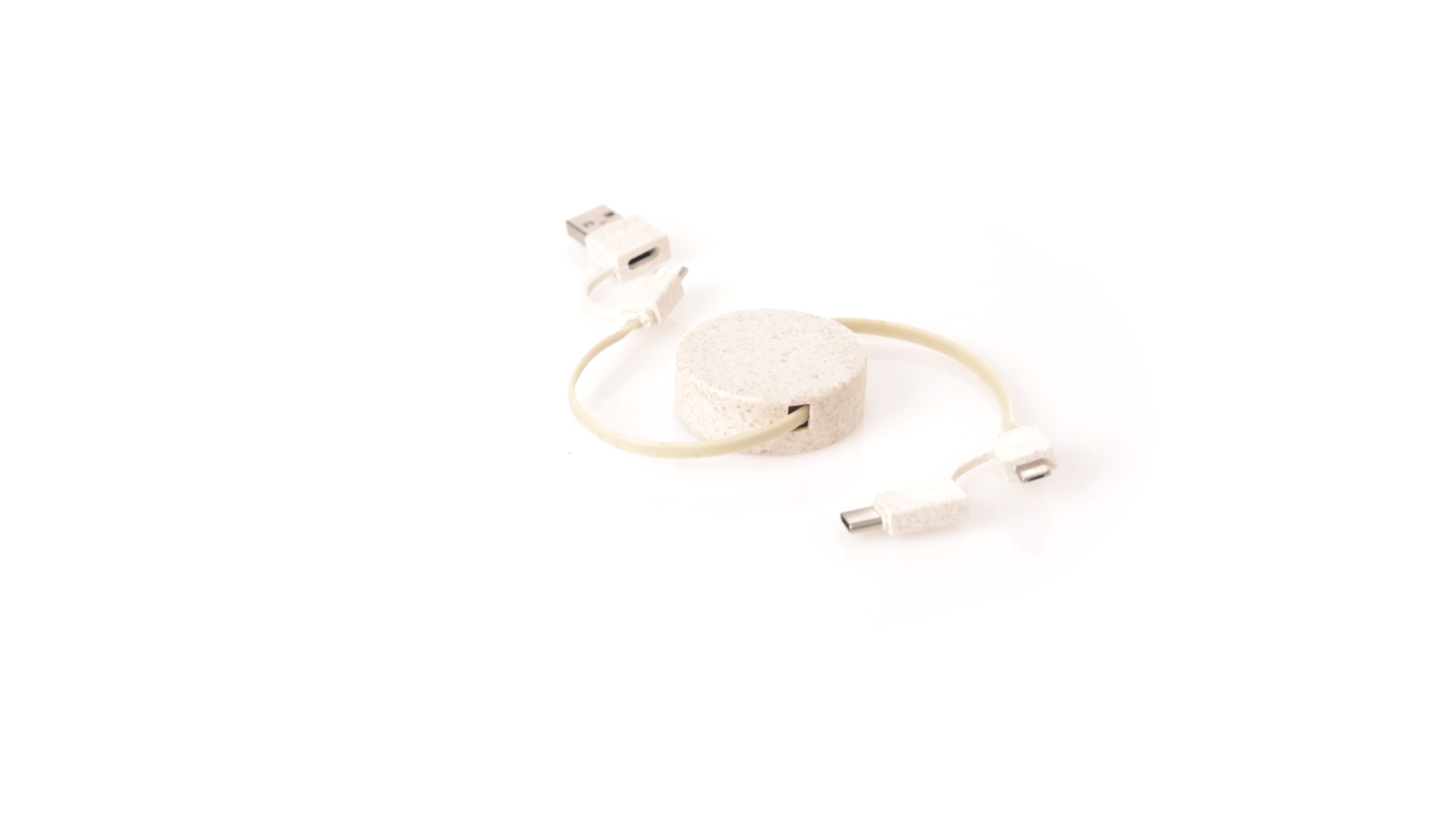 Cable cargador y sincronizador extensible, válido para cargar dispositivos y transferir datos. Fabricado en caña de trigo, para así fomentar la utilización de materias primas naturales y reducir las emisiones contaminantes. Pieza central con mecanismo interior extensible. Incluidas conexiones de entrada Tipo C y USB salidas Lightning, Micro USB y Tipo C. 5V DC 2.4A. Presentado en bolsa individual de diseño kraft.