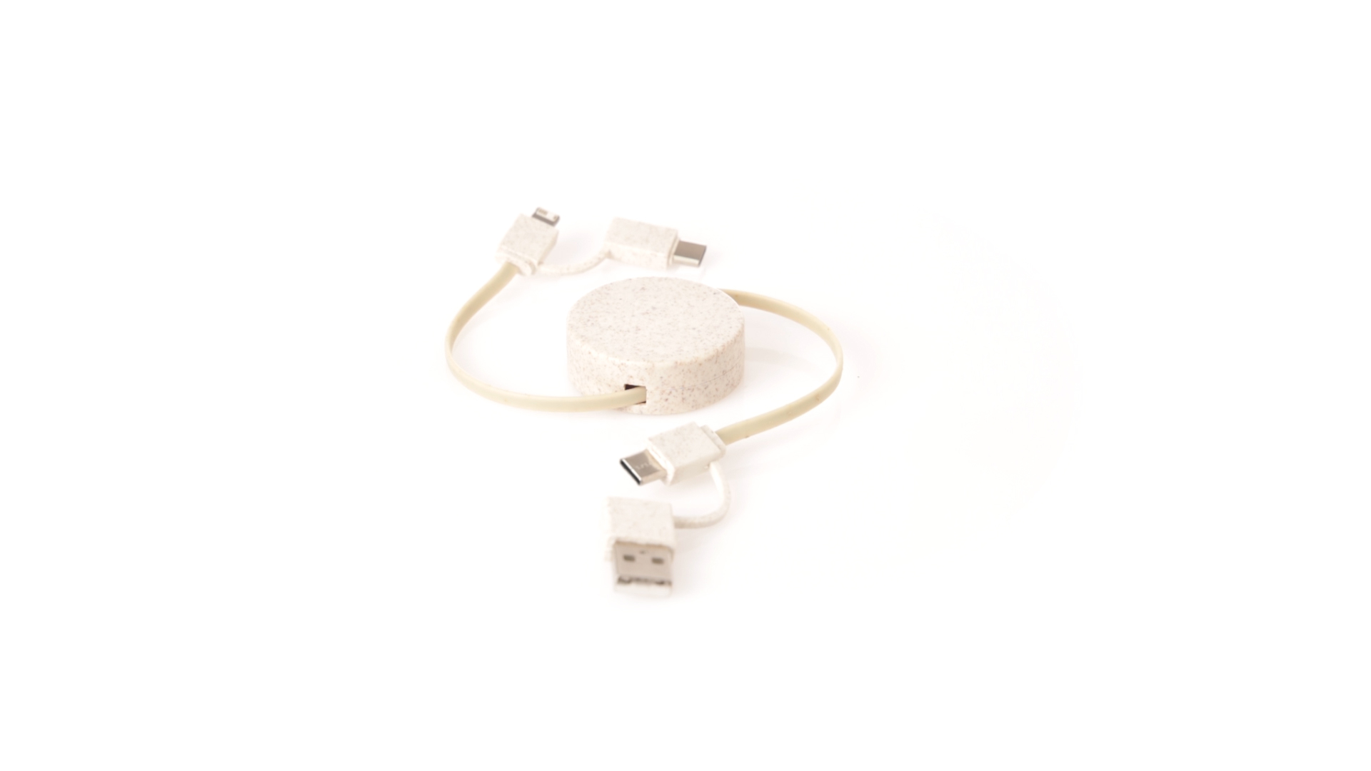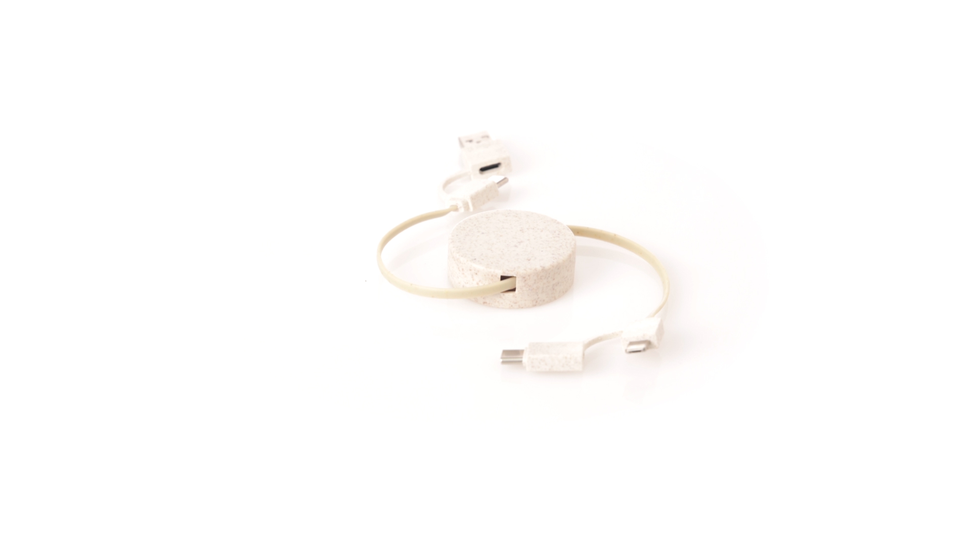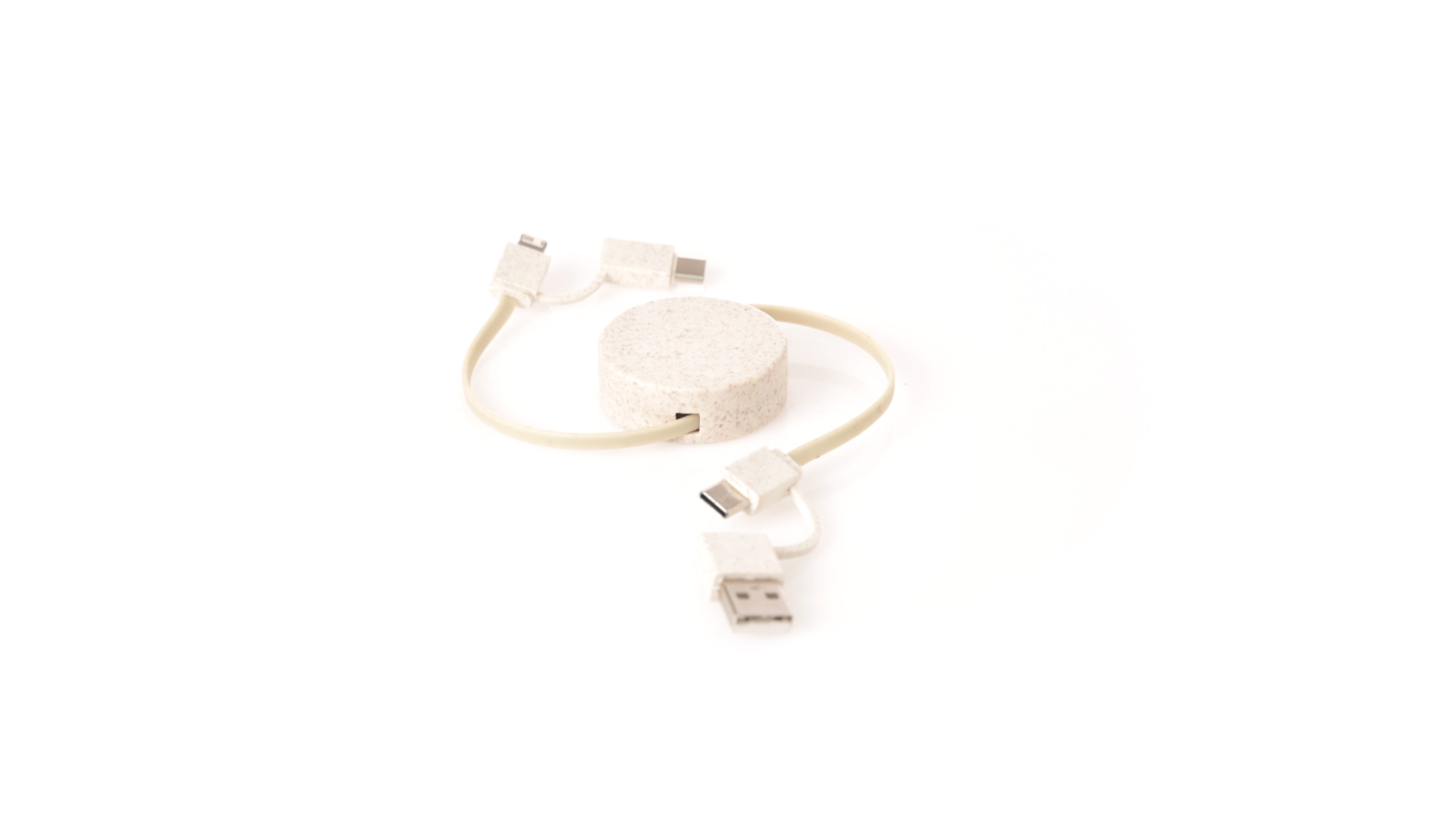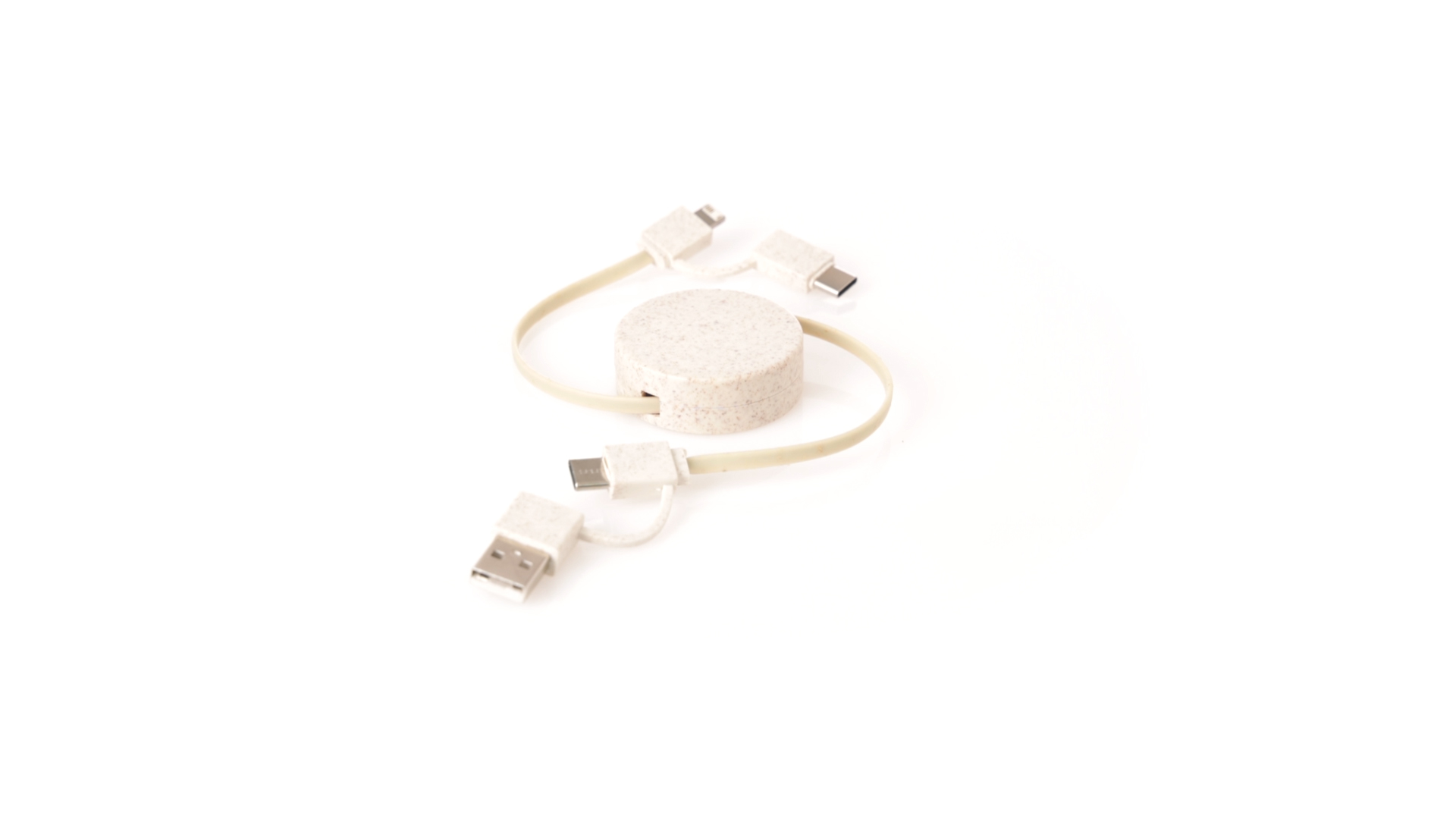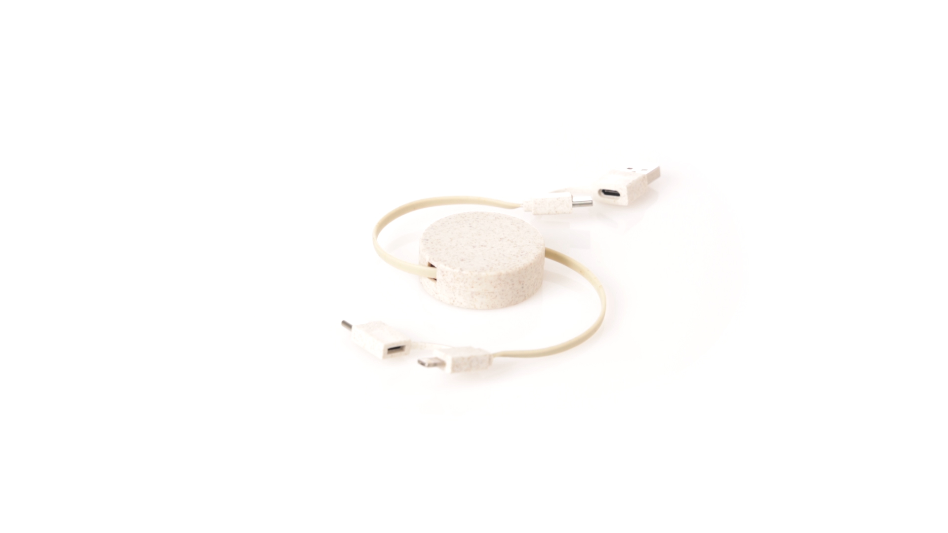 Cable cargador y sincronizador extensible, válido para cargar dispositivos y transferir datos. Fabricado en caña de trigo, para así fomentar la utilización de materias primas naturales y reducir las emisiones contaminantes. Pieza central con mecanismo interior extensible. Incluidas conexiones de entrada Tipo C y USB salidas Lightning, Micro USB y Tipo C. 5V DC 2.4A. Presentado en bolsa individual de diseño kraft.