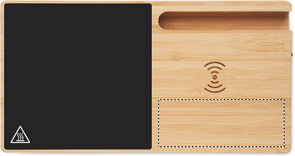 Kabellose Ladestation mit Tassenwärmer und Smartphone-Halter. Bambus. Verbinden Sie das Gerät mit dem Computer und laden Sie Ihr Smartphone durch einfaches Auflegen auf. Ausgang: DC 9V/1.67A (15W). Kompatibel mit allen QI-fähigen Geräten wie den neuesten Android Smartphones, iPhone® 8 und X und höher.