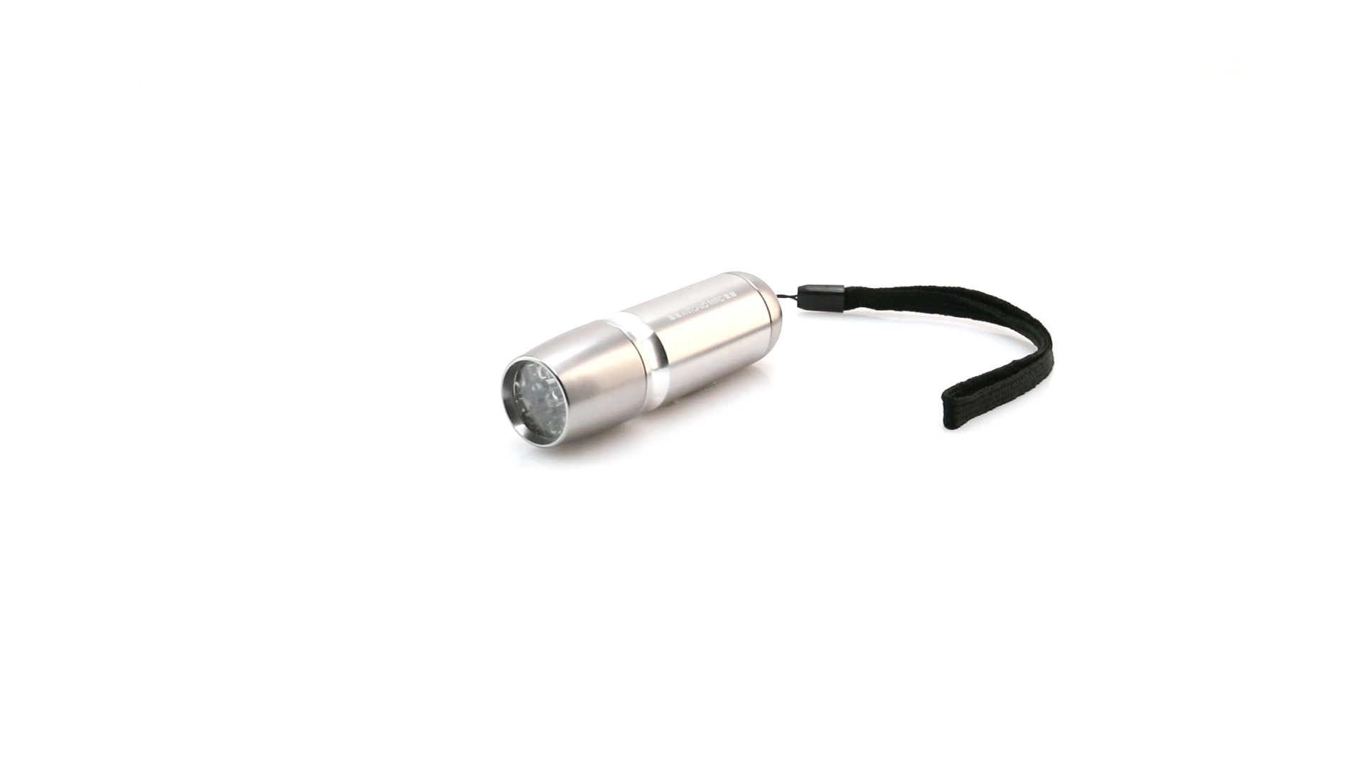 Taschenlampe von Antonio Miró mit 9 LEDs von hoher Leuchtkraft. Mit rutschfestem Gehäuse aus Aluminium in matter Ausführung und Powerbutton mit Gummibeschichtung sowie Trageschlaufe. Batteriebetrieben - 3 x AAA inklusive. Präsentiert in einer individuellen Schachtel mit dem Markenlogo und weichem Schaumstoff mit Stanzung im Inneren.