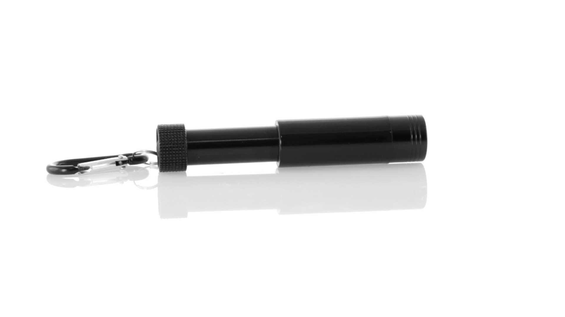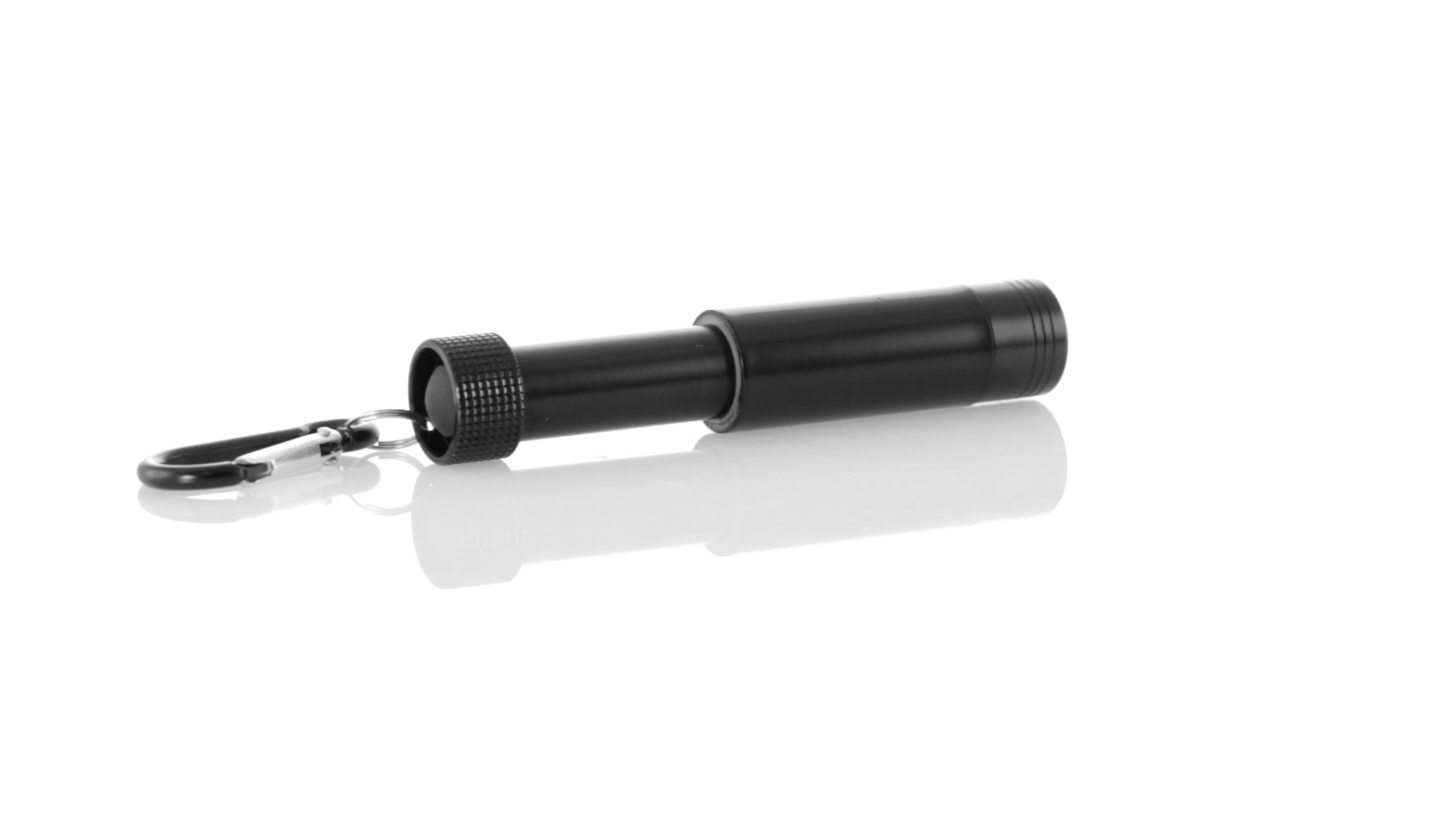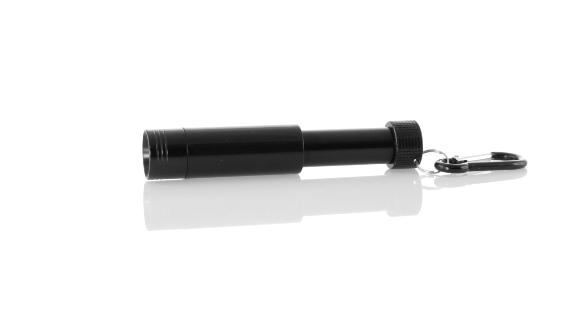 Taschenlampe mit ausziehbarem Gehäuse in schwarzer Metall-Ausführung. Mit LED-Beleuchtung im Inneren und speziell für den Laserdruck entworfenem Gehäuse, durch das das Logo von innen beleuchtet wird. Mit Metallkarabiner in passender Farbe. Batteriebetrieben - Knopfzellen inklusive.