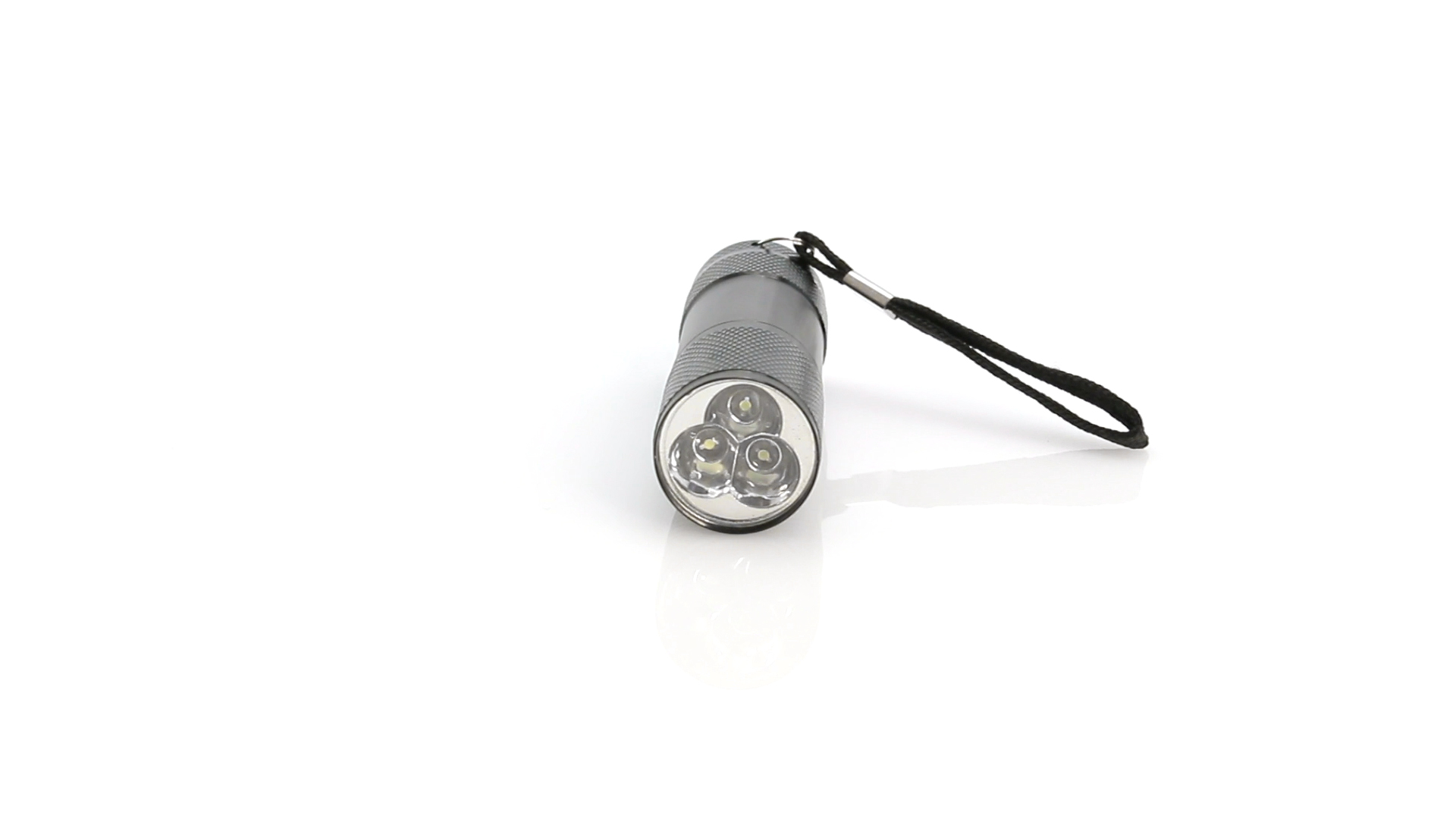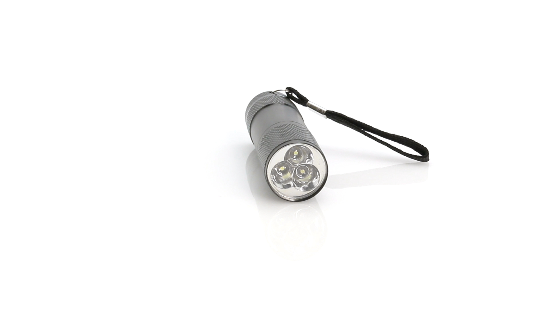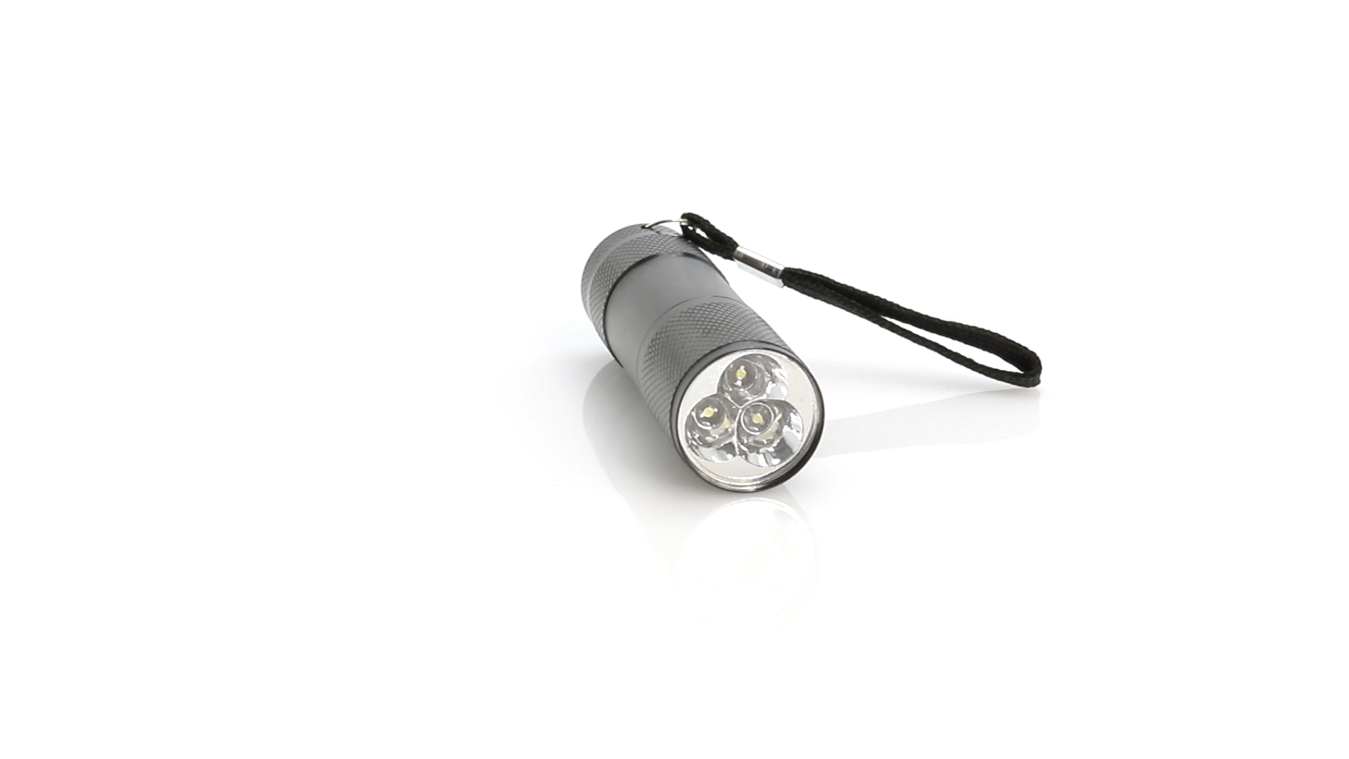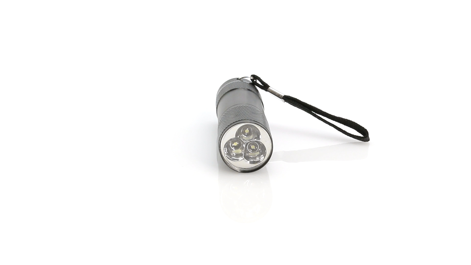Taschenlampe mit 3 LEDs von hoher Leuchtkraft sowie minimalistischem Design. Mit robustem, rutschfestem Gehäuse aus Aluminium in verschiedenen lebendigen Farben sowie geschütztem Druckknopf mit resistenter Gummierung und Trageschlaufe. Batteriebetrieben - 3 x AAA nicht inklusive. Präsentiert in einer individuellen Box.
