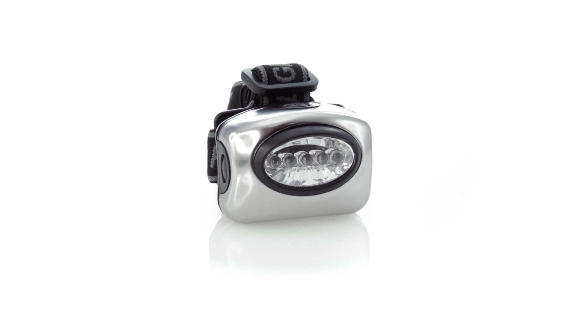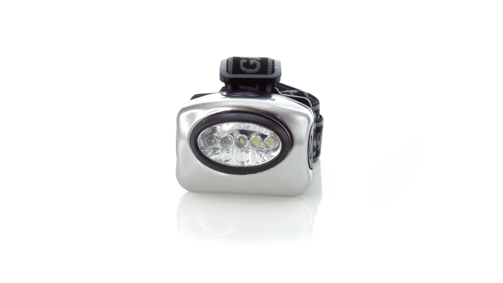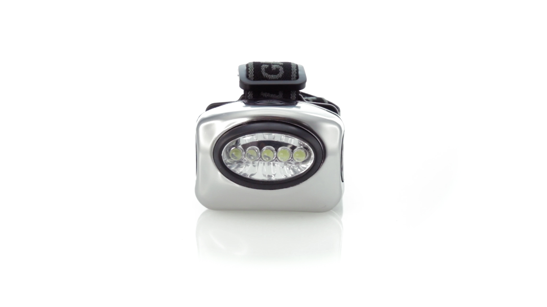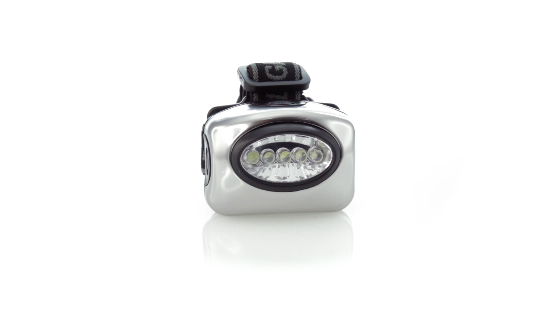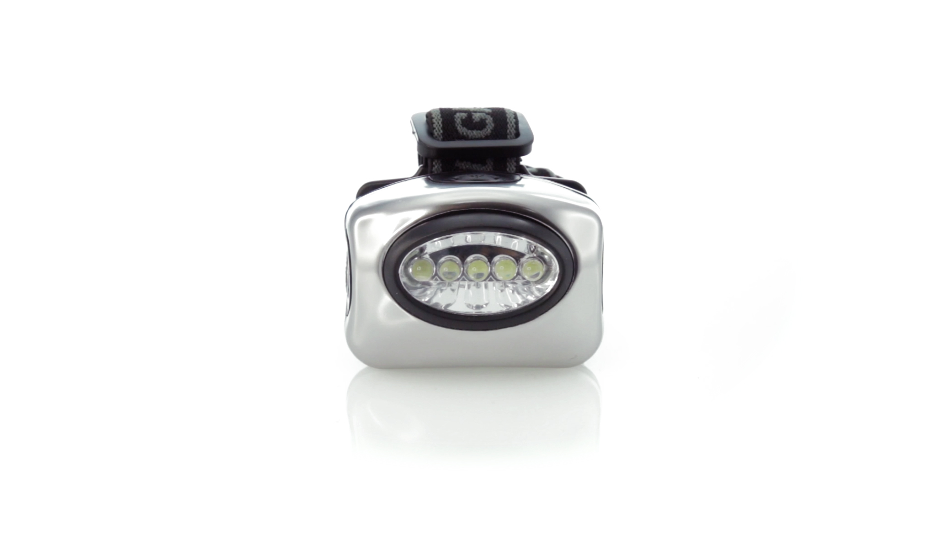 Kopflampe mit 5 LEDs und drei Lichteinstellungen. Mit verstellbarem und angenehm am Kopf sitzendem Gummigurt sowie Gehäuse aus robustem Material in kräftigen Farben. Gurt ist abnehmbar. Batteriebetrieben - 3 x AAA nicht inklusive. Präsentiert in einer individuellen Box in Silber mit Luftpolsterfolie.