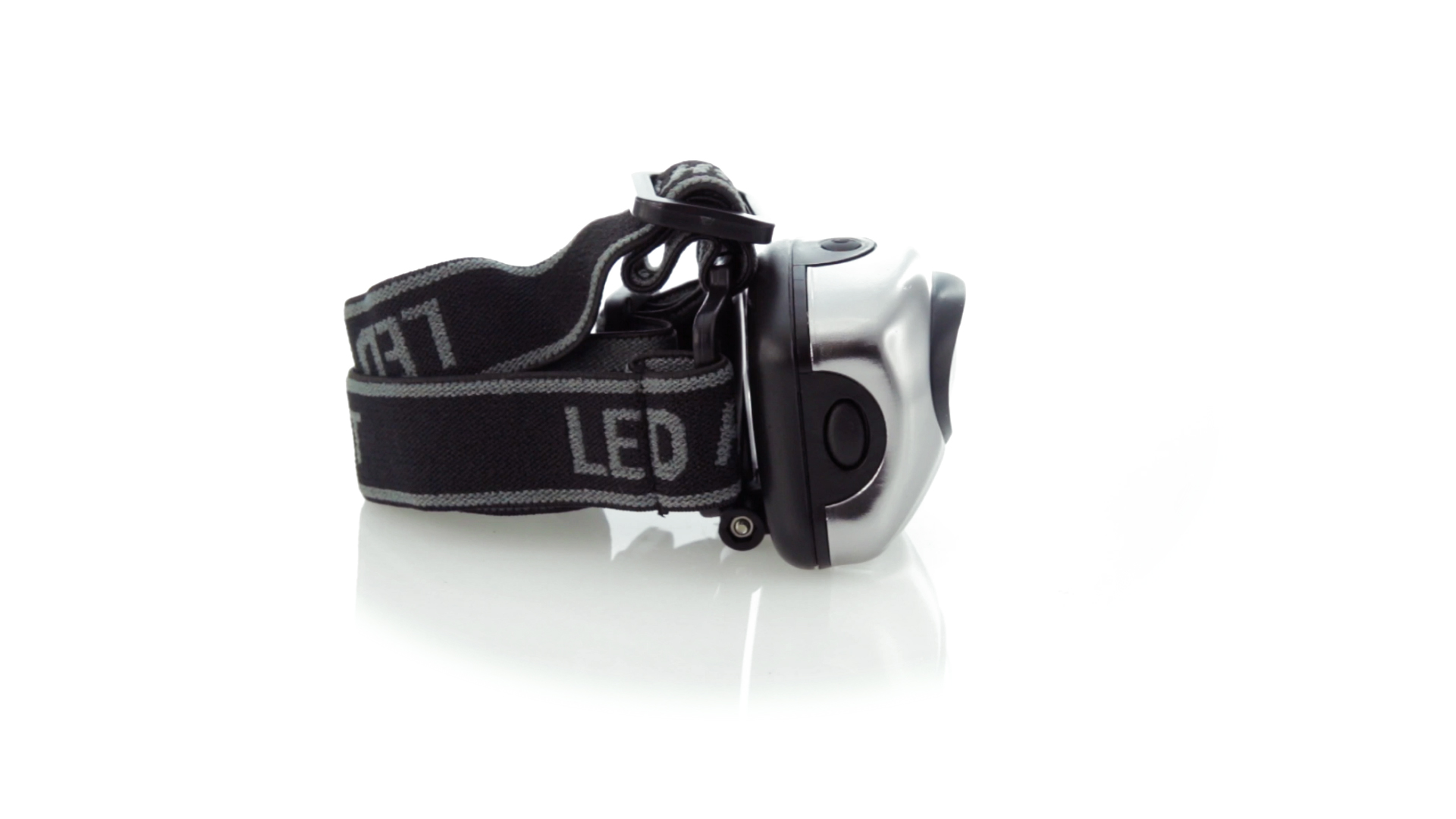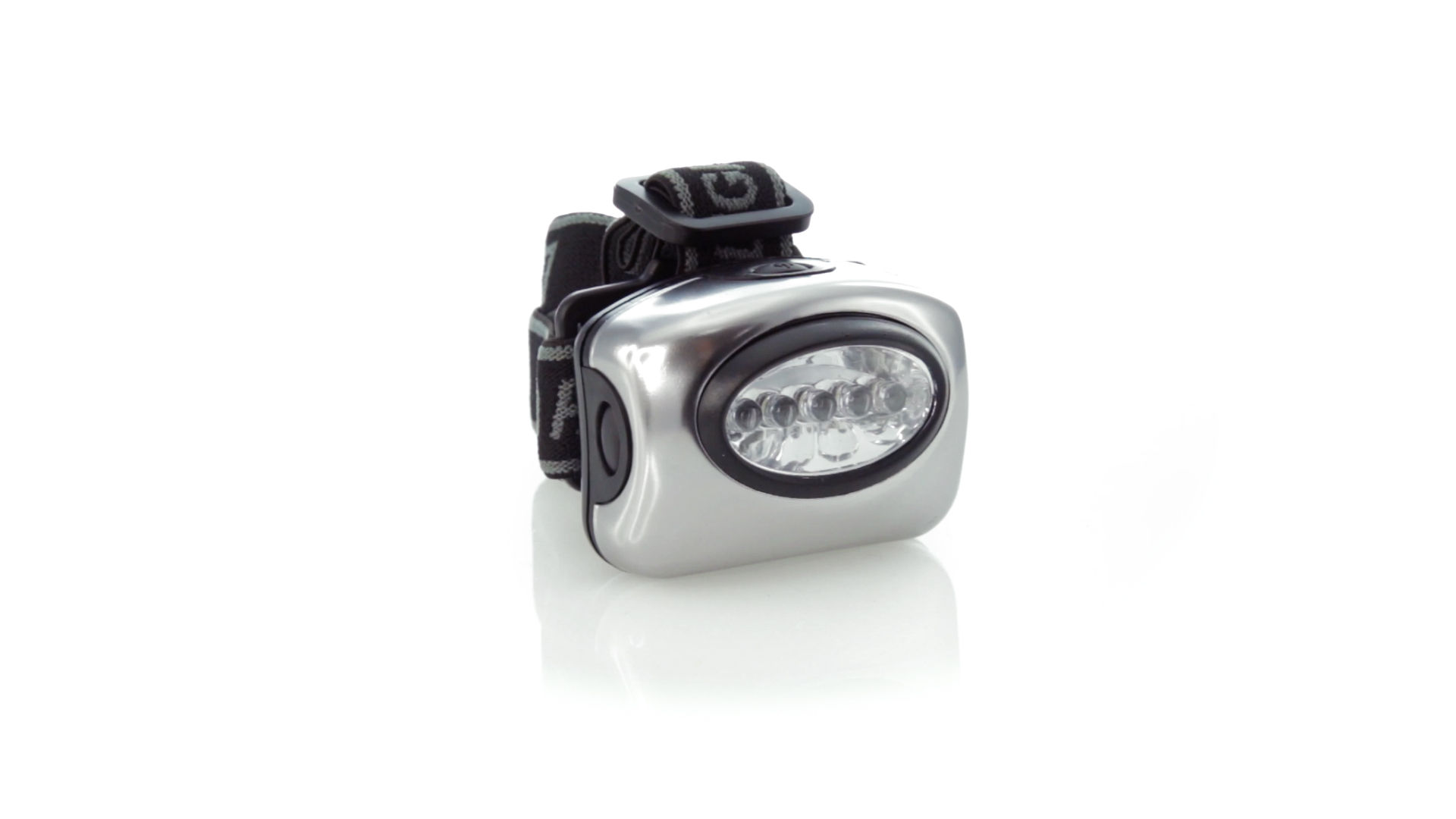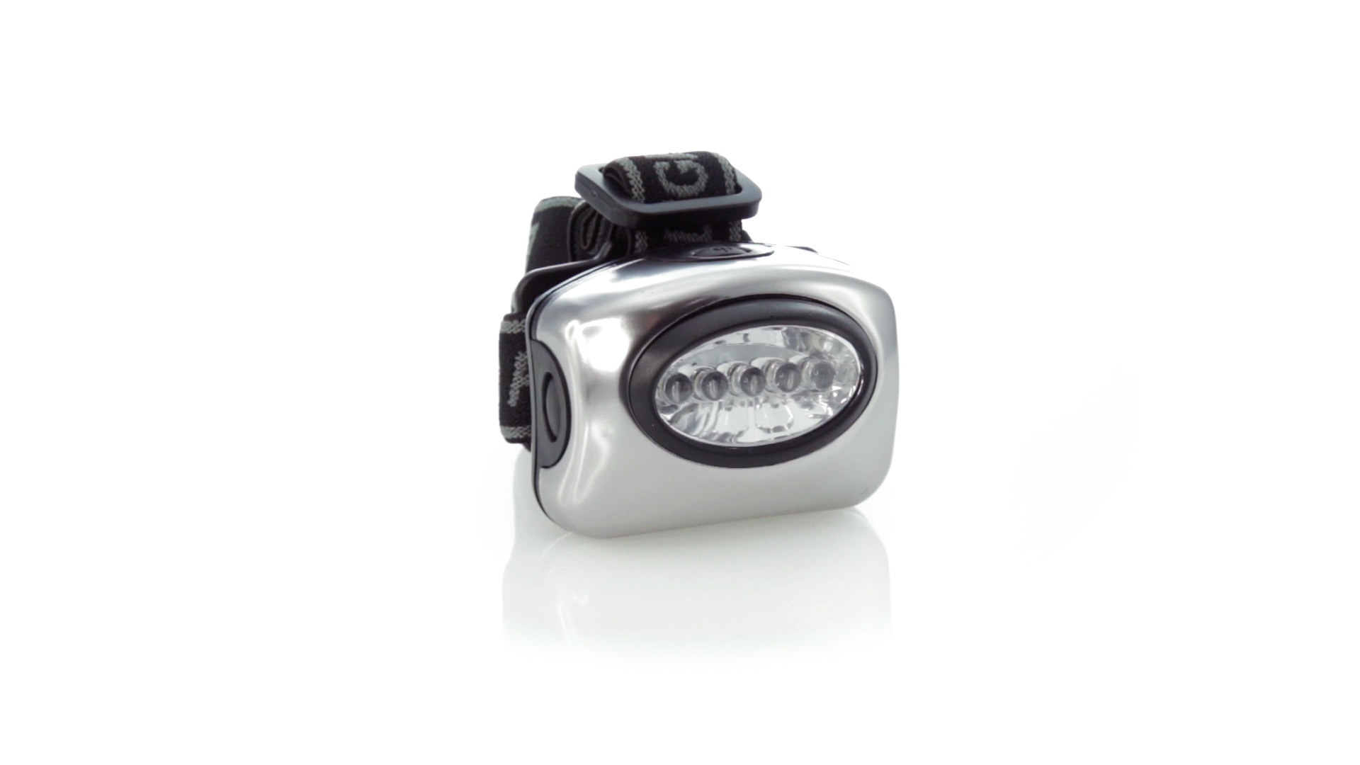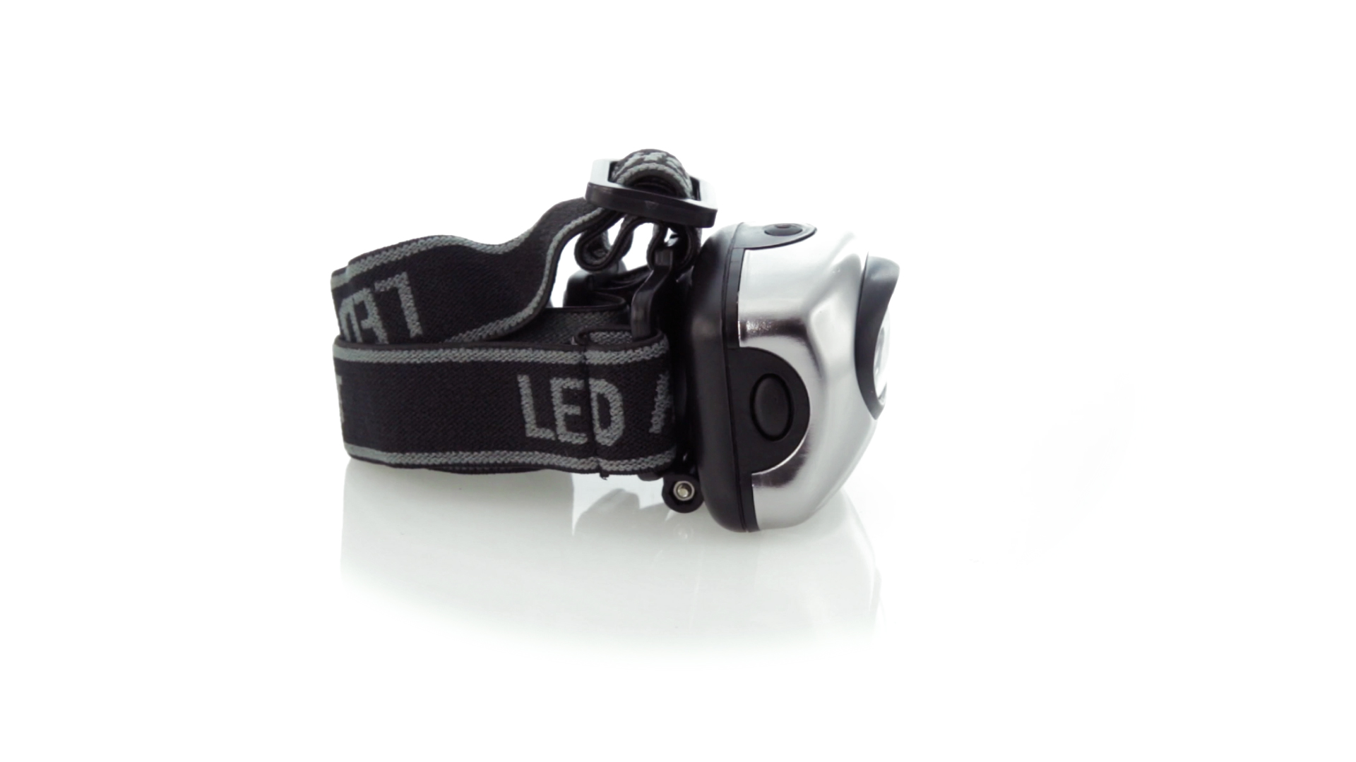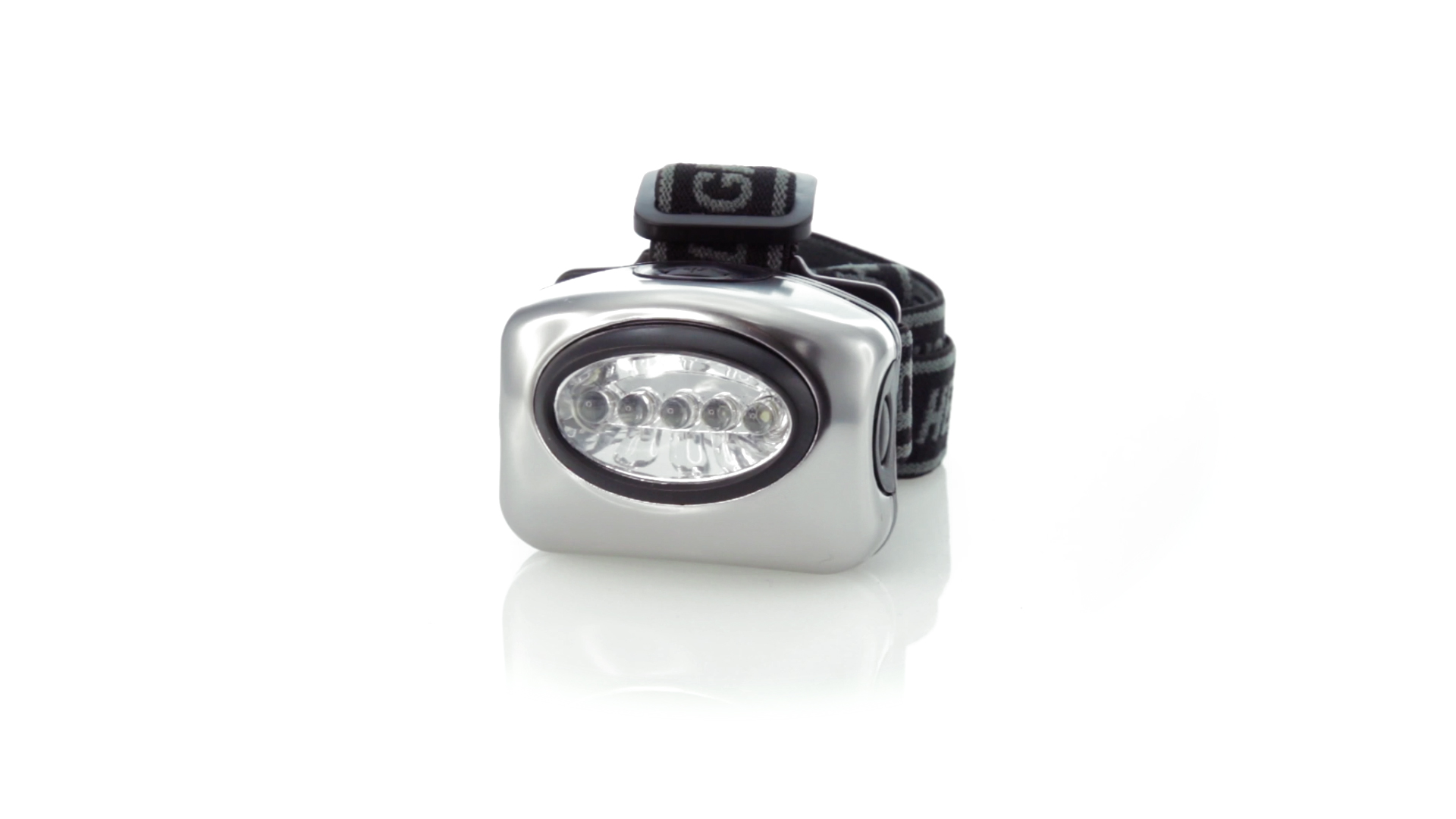 Kopflampe mit 5 LEDs und drei Lichteinstellungen. Mit verstellbarem und angenehm am Kopf sitzendem Gummigurt sowie Gehäuse aus robustem Material in kräftigen Farben. Gurt ist abnehmbar. Batteriebetrieben - 3 x AAA nicht inklusive. Präsentiert in einer individuellen Box in Silber mit Luftpolsterfolie.