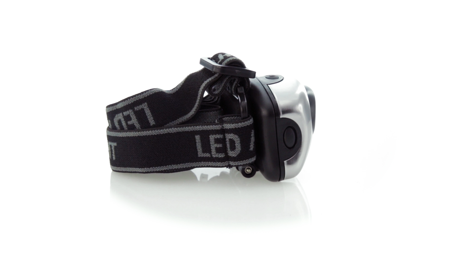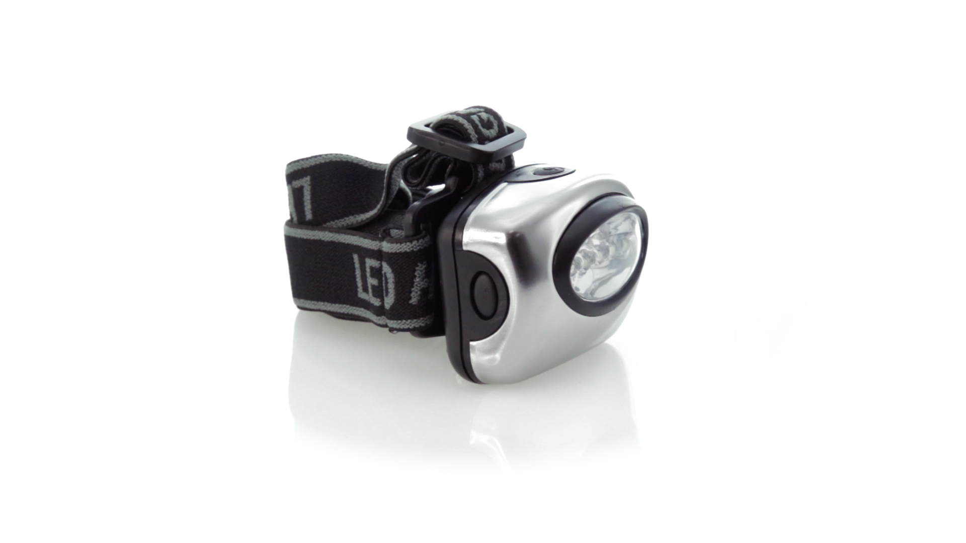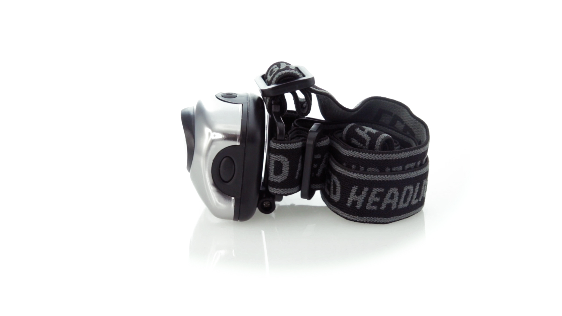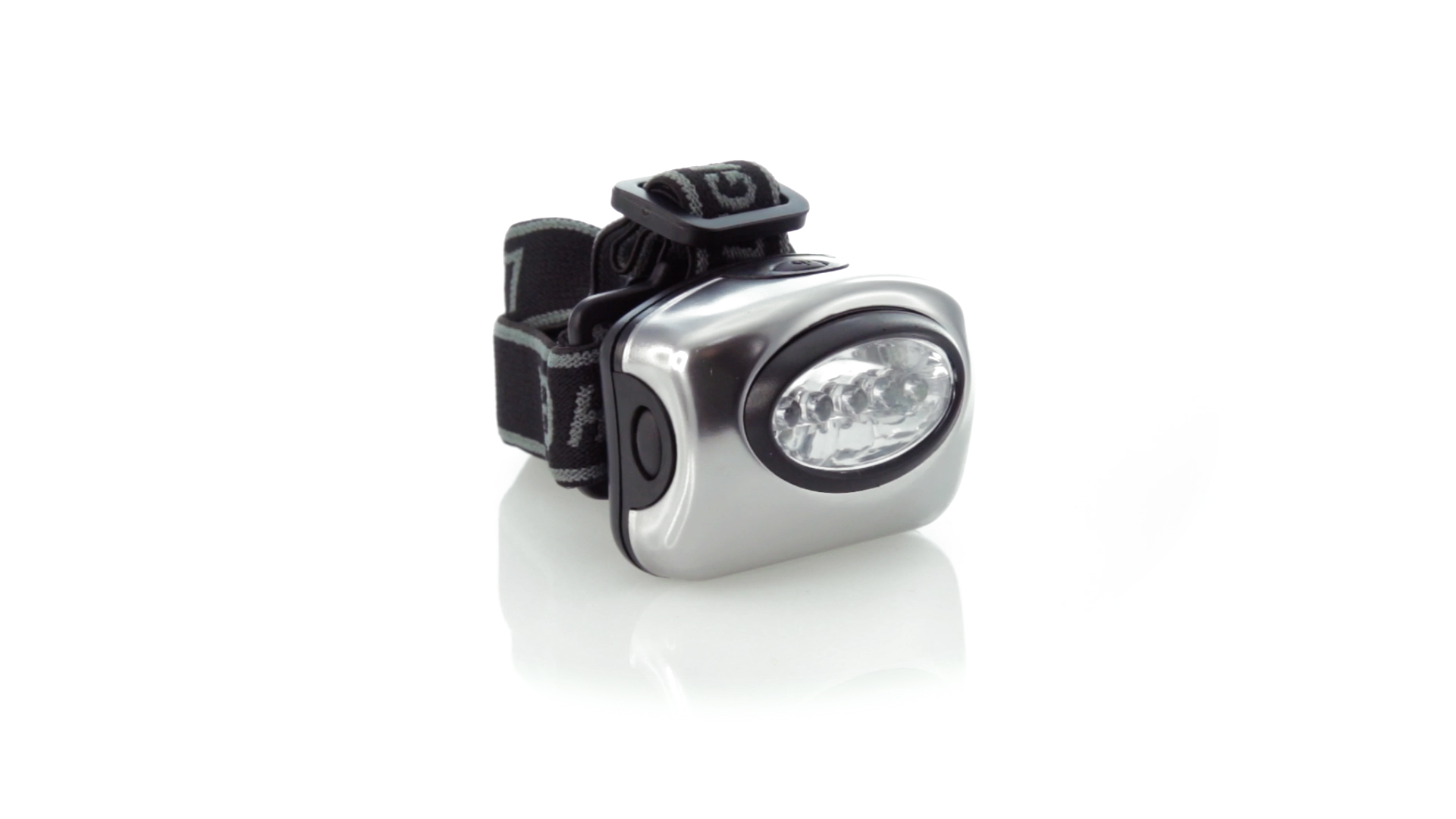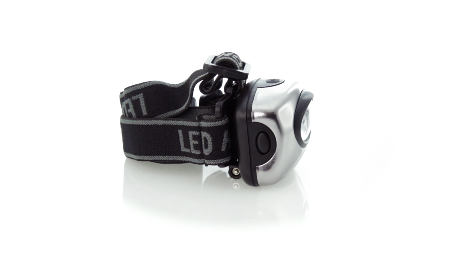 Kopflampe mit 5 LEDs und drei Lichteinstellungen. Mit verstellbarem und angenehm am Kopf sitzendem Gummigurt sowie Gehäuse aus robustem Material in kräftigen Farben. Gurt ist abnehmbar. Batteriebetrieben - 3 x AAA nicht inklusive. Präsentiert in einer individuellen Box in Silber mit Luftpolsterfolie.