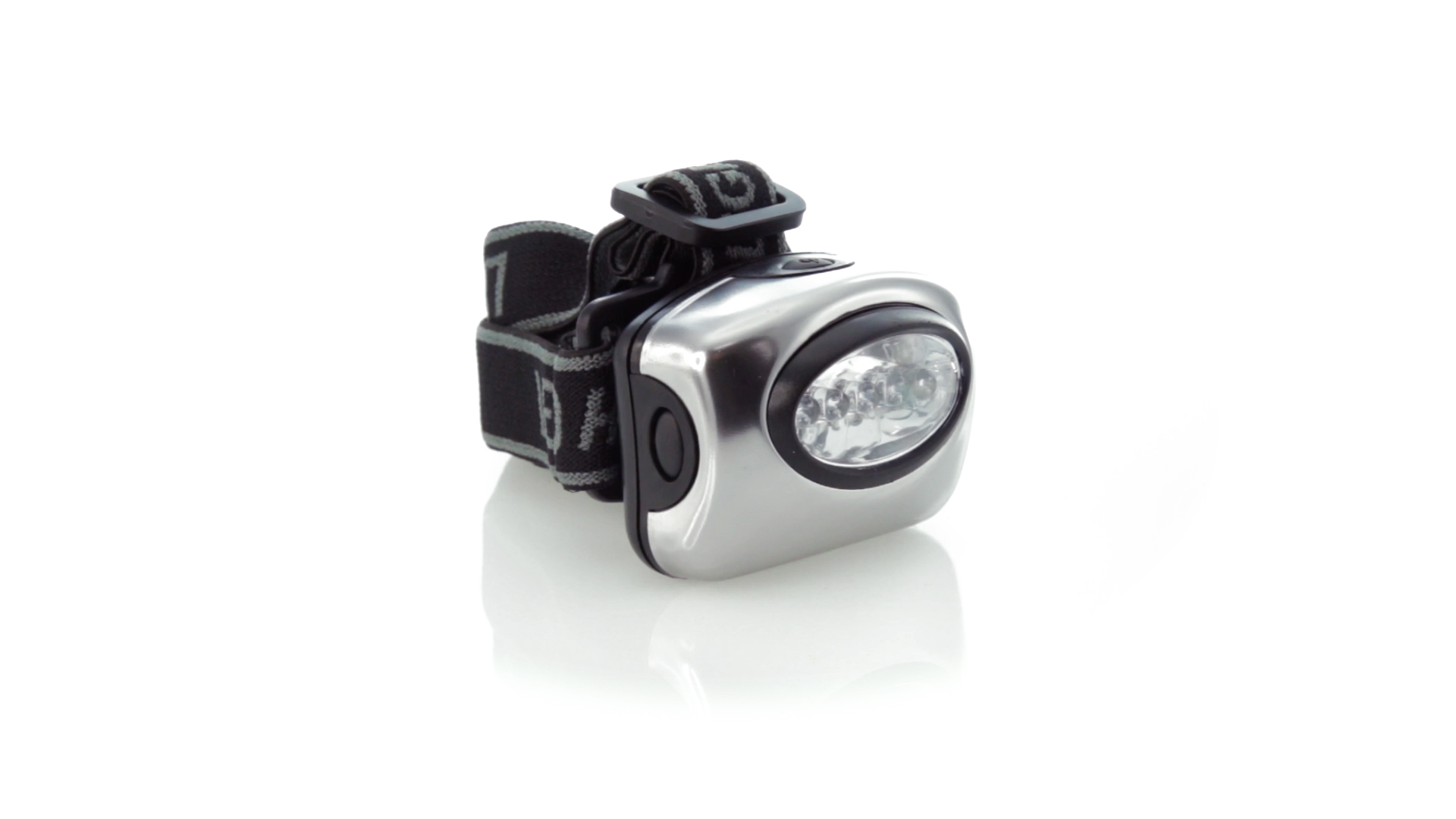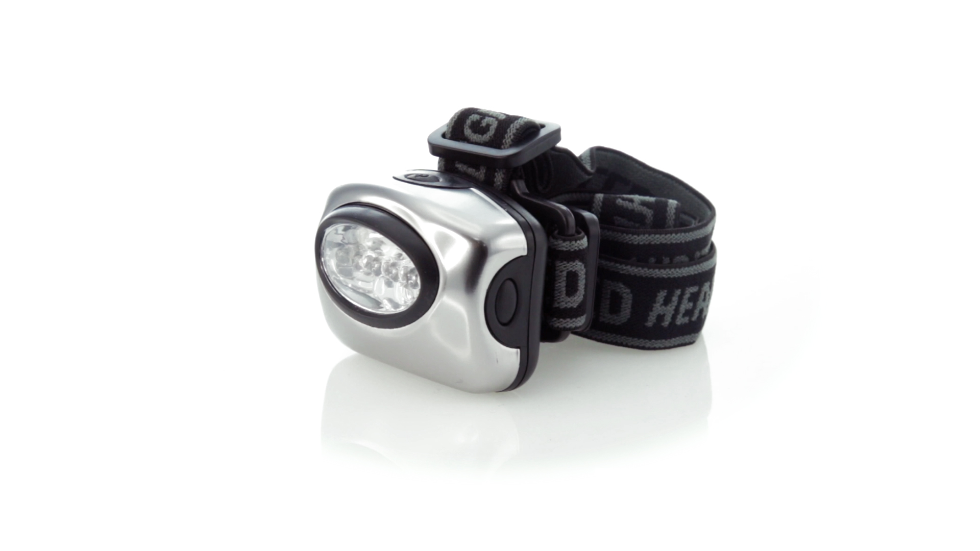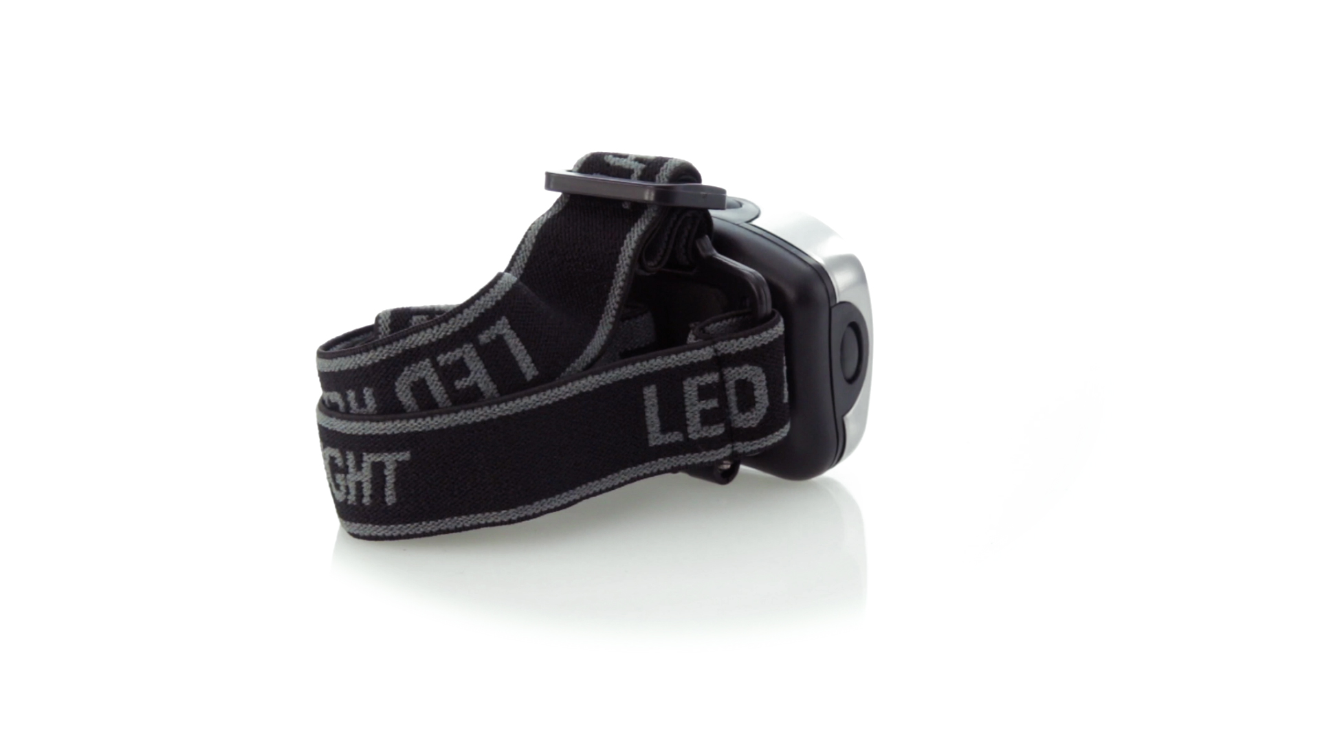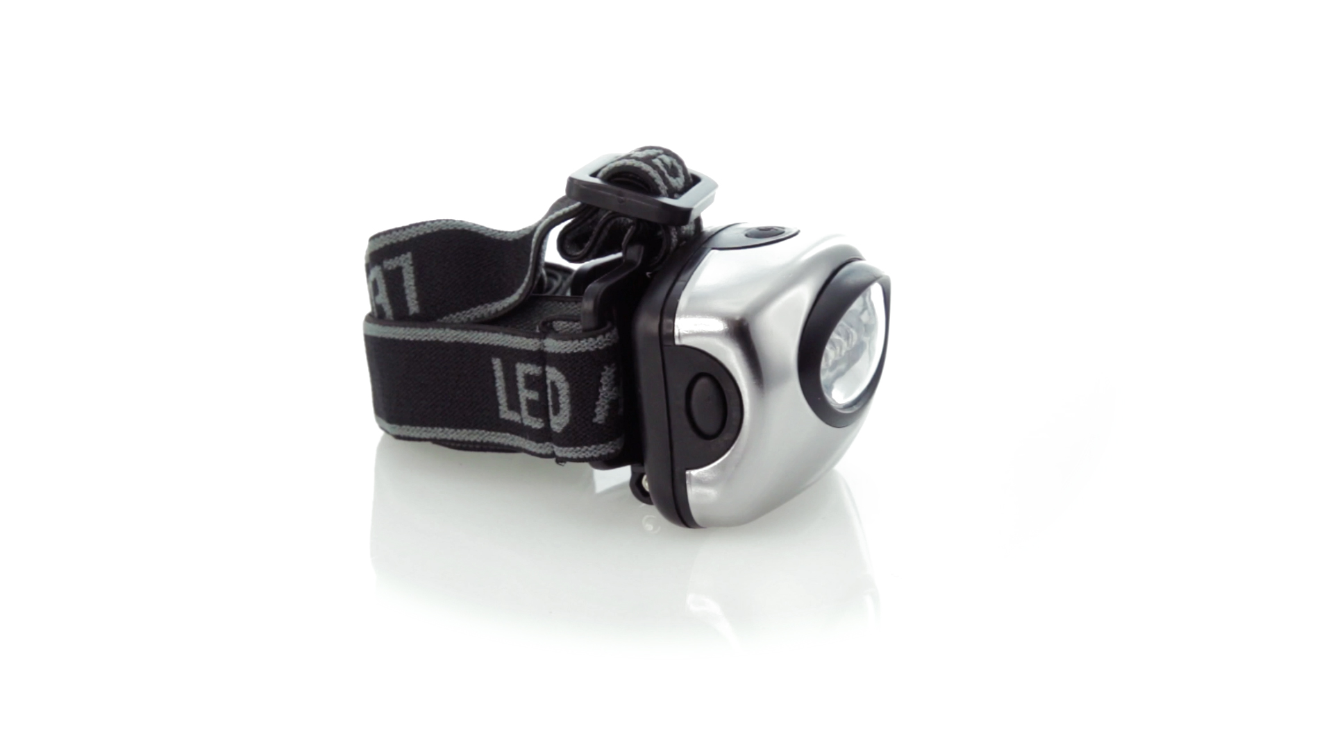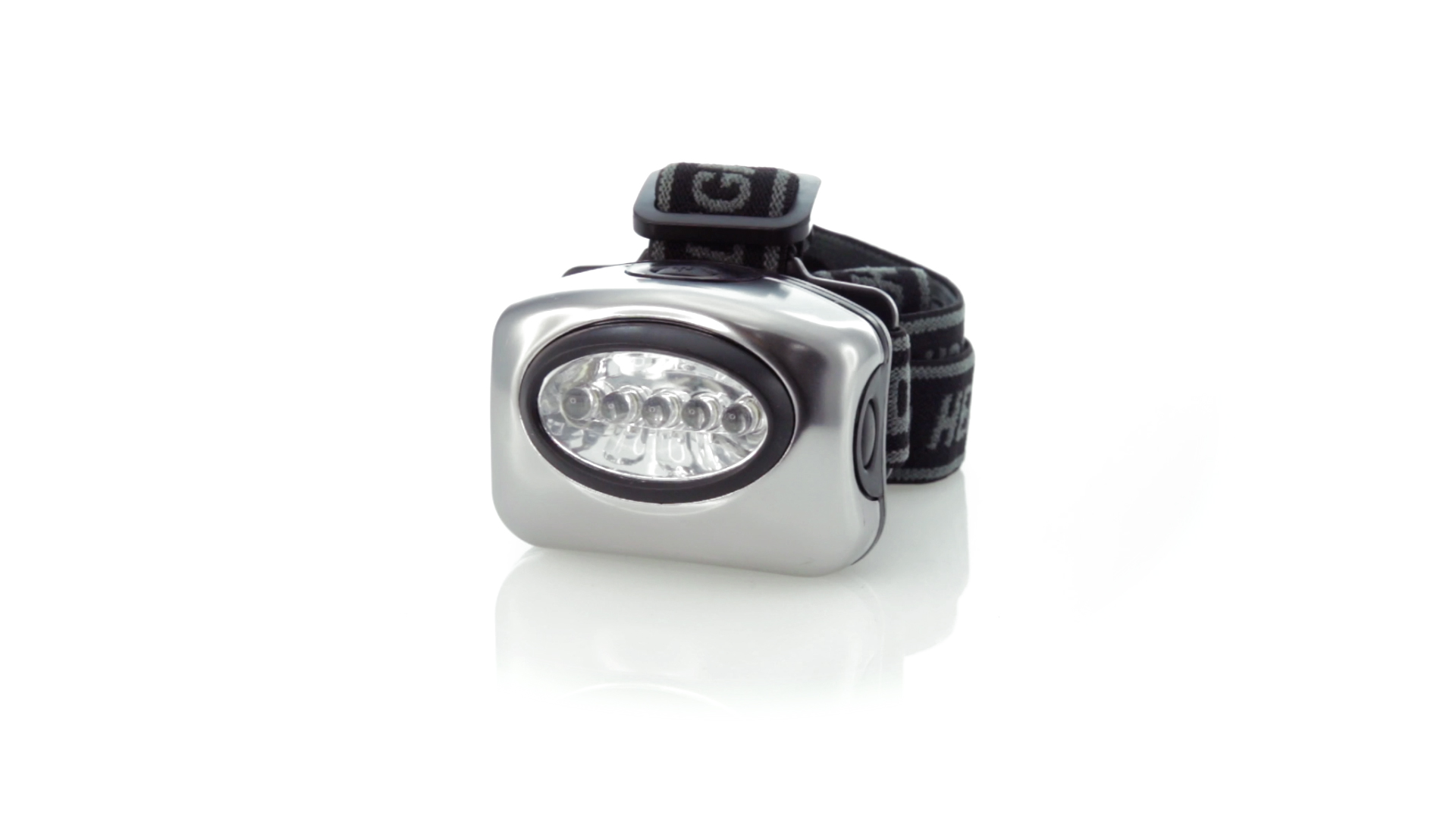 Kopflampe mit 5 LEDs und drei Lichteinstellungen. Mit verstellbarem und angenehm am Kopf sitzendem Gummigurt sowie Gehäuse aus robustem Material in kräftigen Farben. Gurt ist abnehmbar. Batteriebetrieben - 3 x AAA nicht inklusive. Präsentiert in einer individuellen Box in Silber mit Luftpolsterfolie.