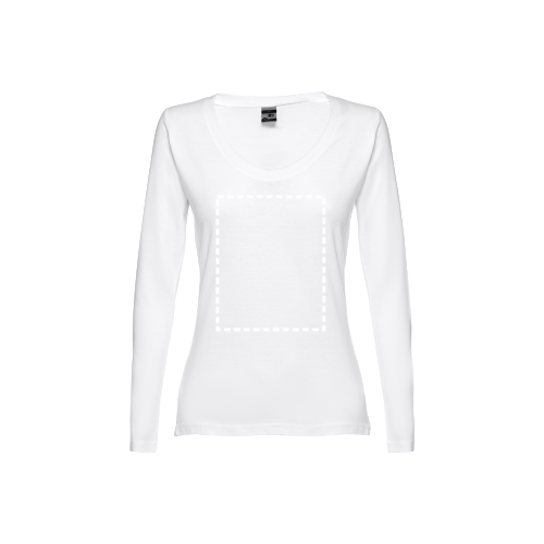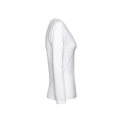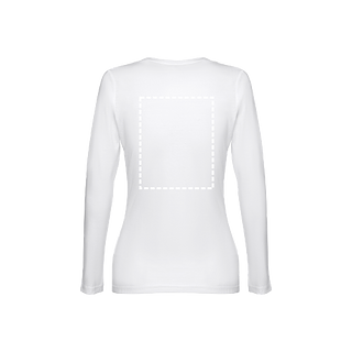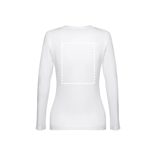 Damen Langarmshirt aus 100% Strickjersey und Baumwolle (150g/m²), tailliert mit kardiertem Baumwollfaden, Jersey-Kragen und Doppelnaht an Ärmeln und Saum. Grössen: S, M, L, XL, XXL