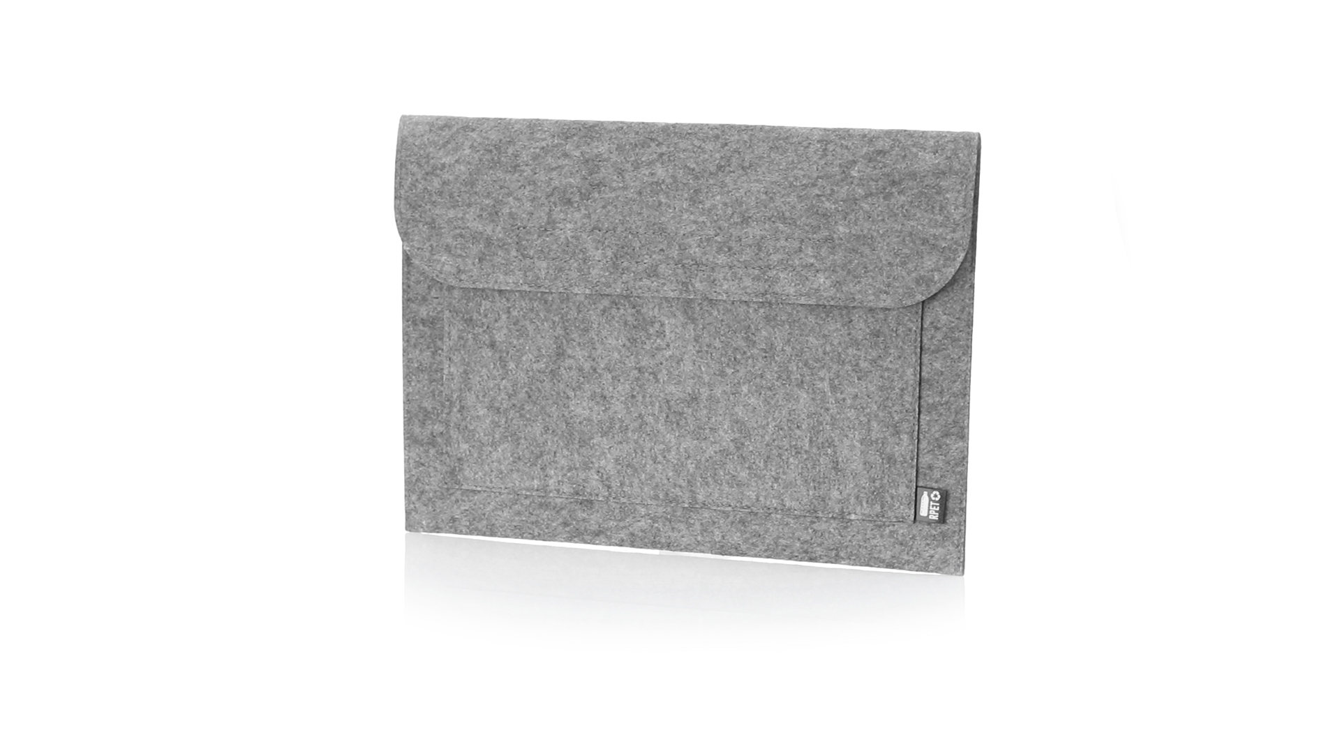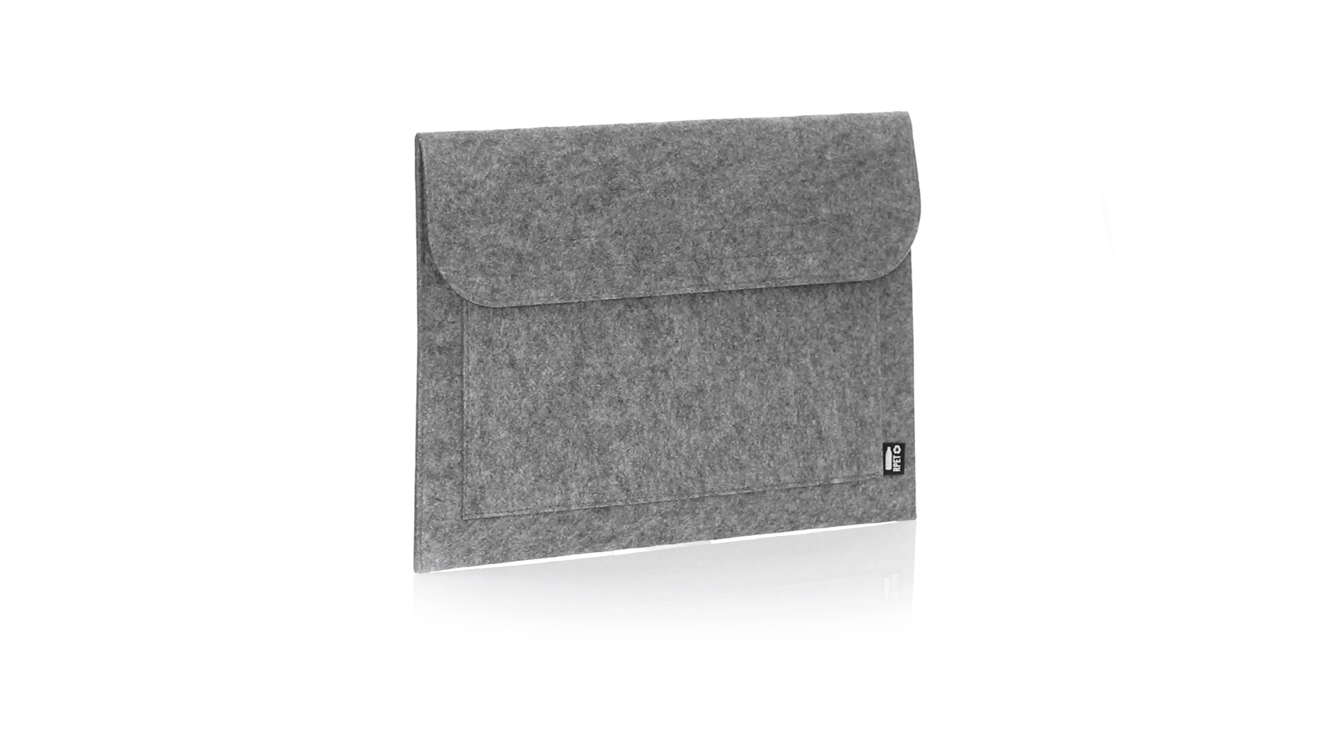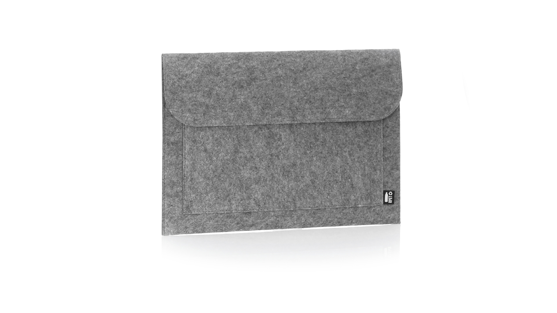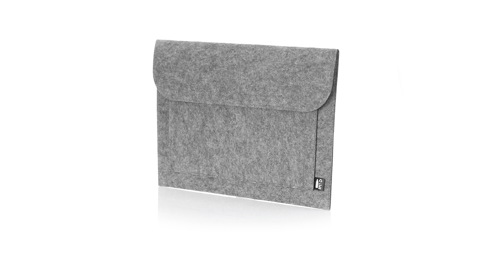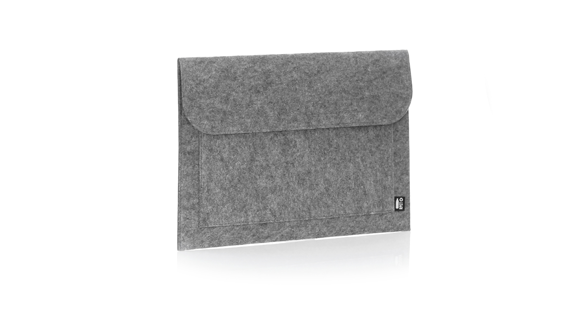 Laptophülle der Liene "Natur" aus widerstandsfähigem recyceltem RPET-Filz, das Ergebnis der Kombination des Recyclingprozesses von Kunststoffmaterialien mit der alten Technik der Filzherstellung, was zu einem Öko-Trend-Material führt, das nicht nur recycelten Ursprungs ist, sondern auch zu recycelbar. Überschlag mit Klettverschlüssen und Fronttasche, mit markantem RPET auf dem Aussenetikett.