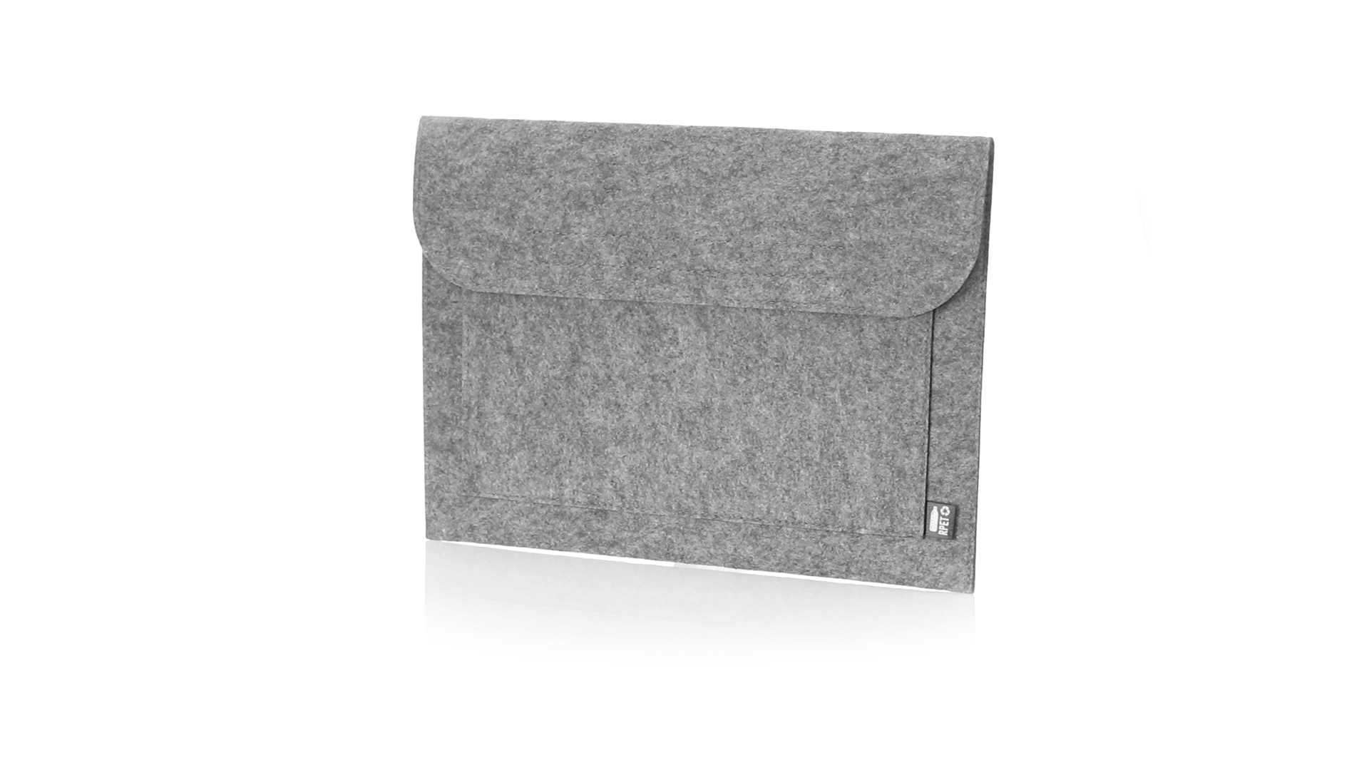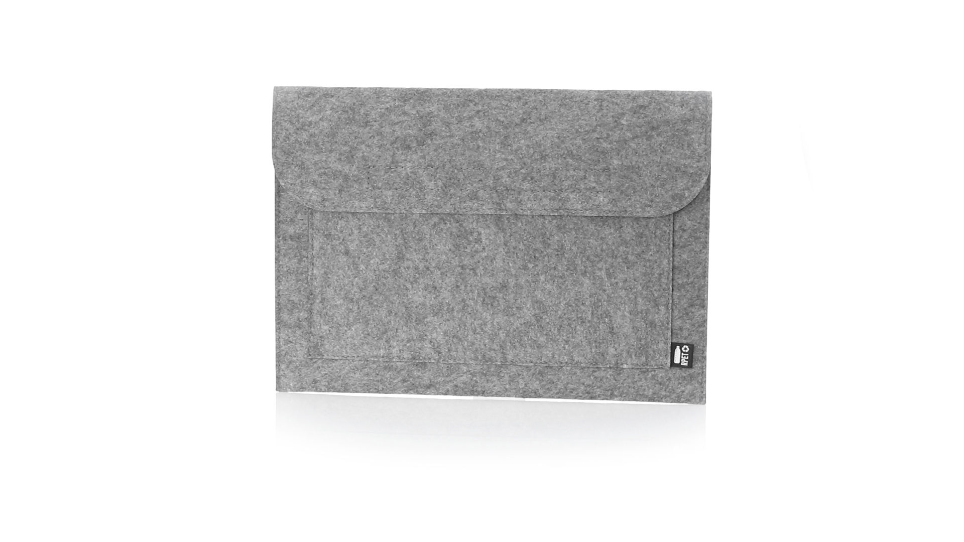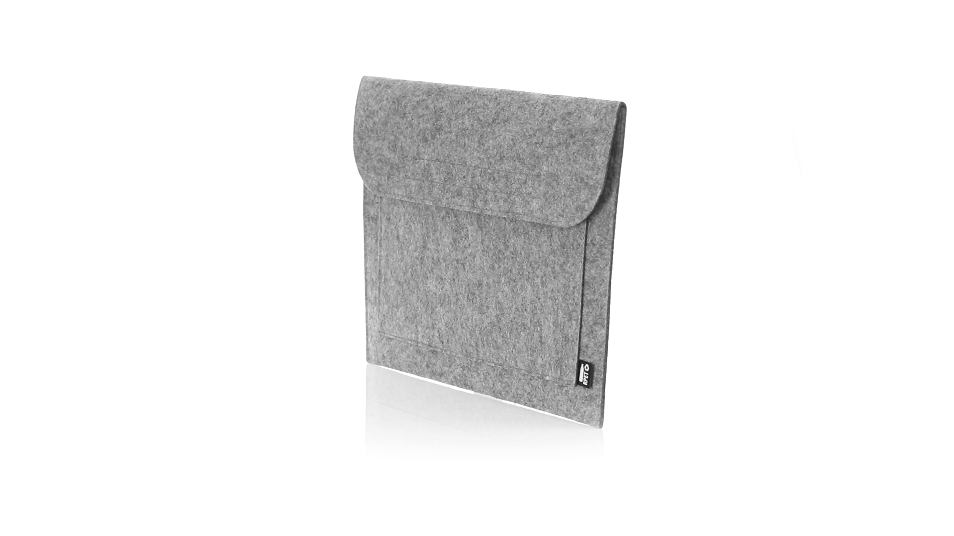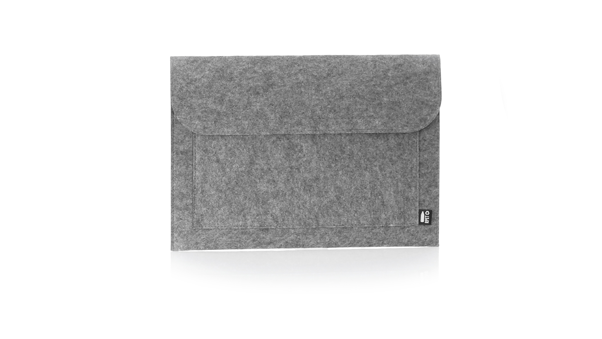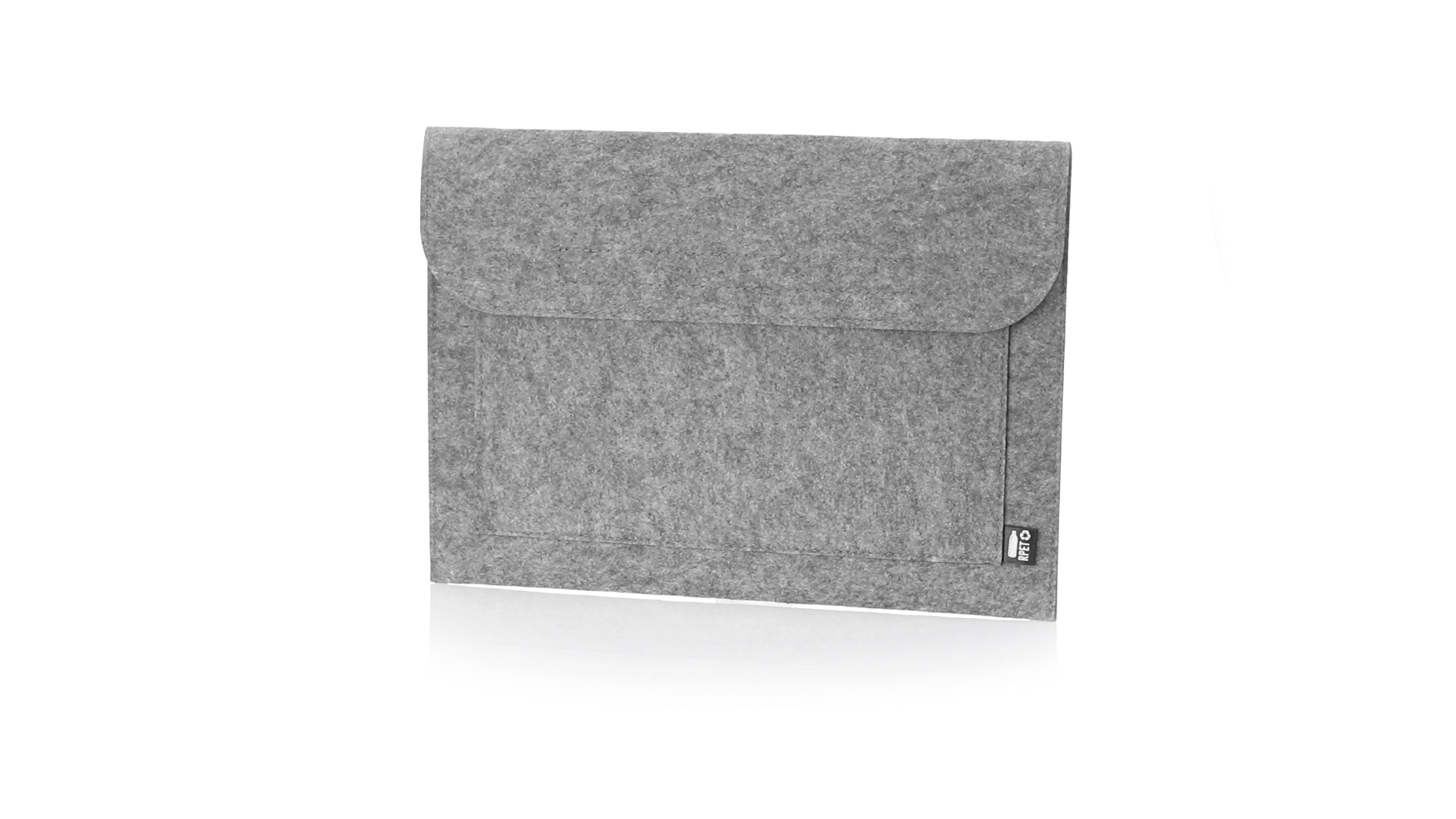 Laptophülle der Liene "Natur" aus widerstandsfähigem recyceltem RPET-Filz, das Ergebnis der Kombination des Recyclingprozesses von Kunststoffmaterialien mit der alten Technik der Filzherstellung, was zu einem Öko-Trend-Material führt, das nicht nur recycelten Ursprungs ist, sondern auch zu recycelbar. Überschlag mit Klettverschlüssen und Fronttasche, mit markantem RPET auf dem Aussenetikett.