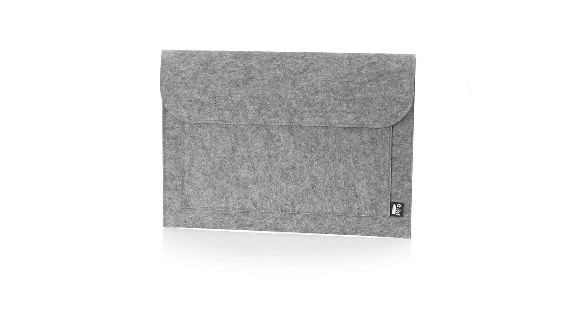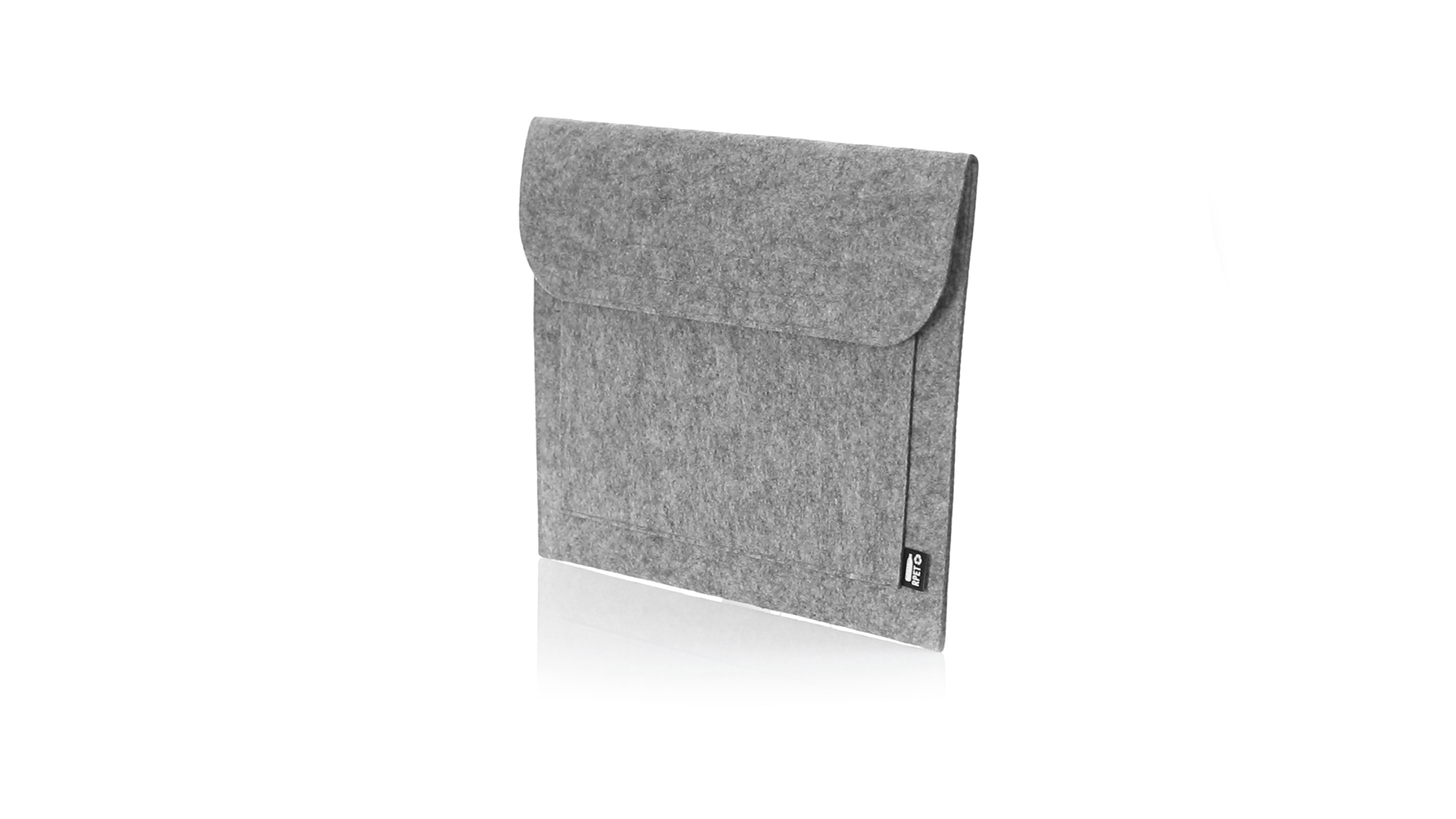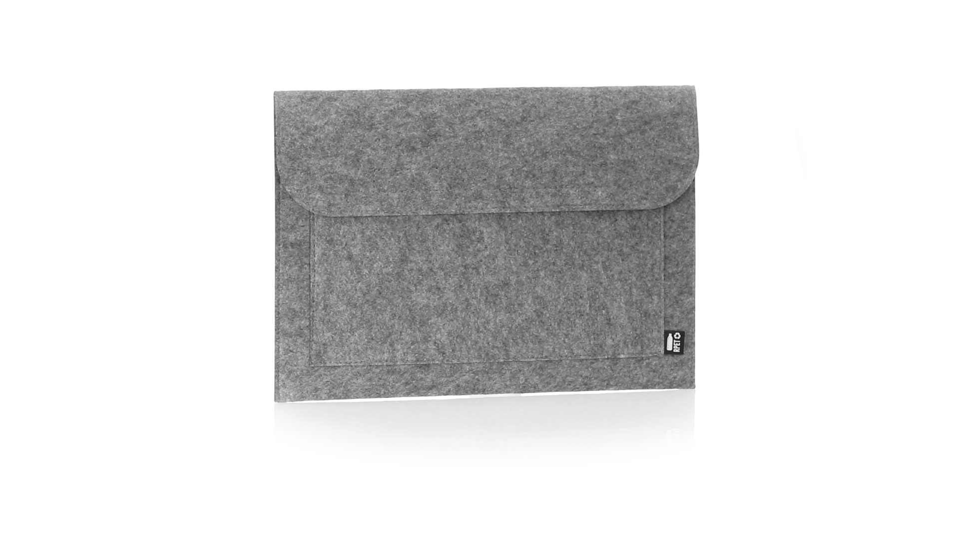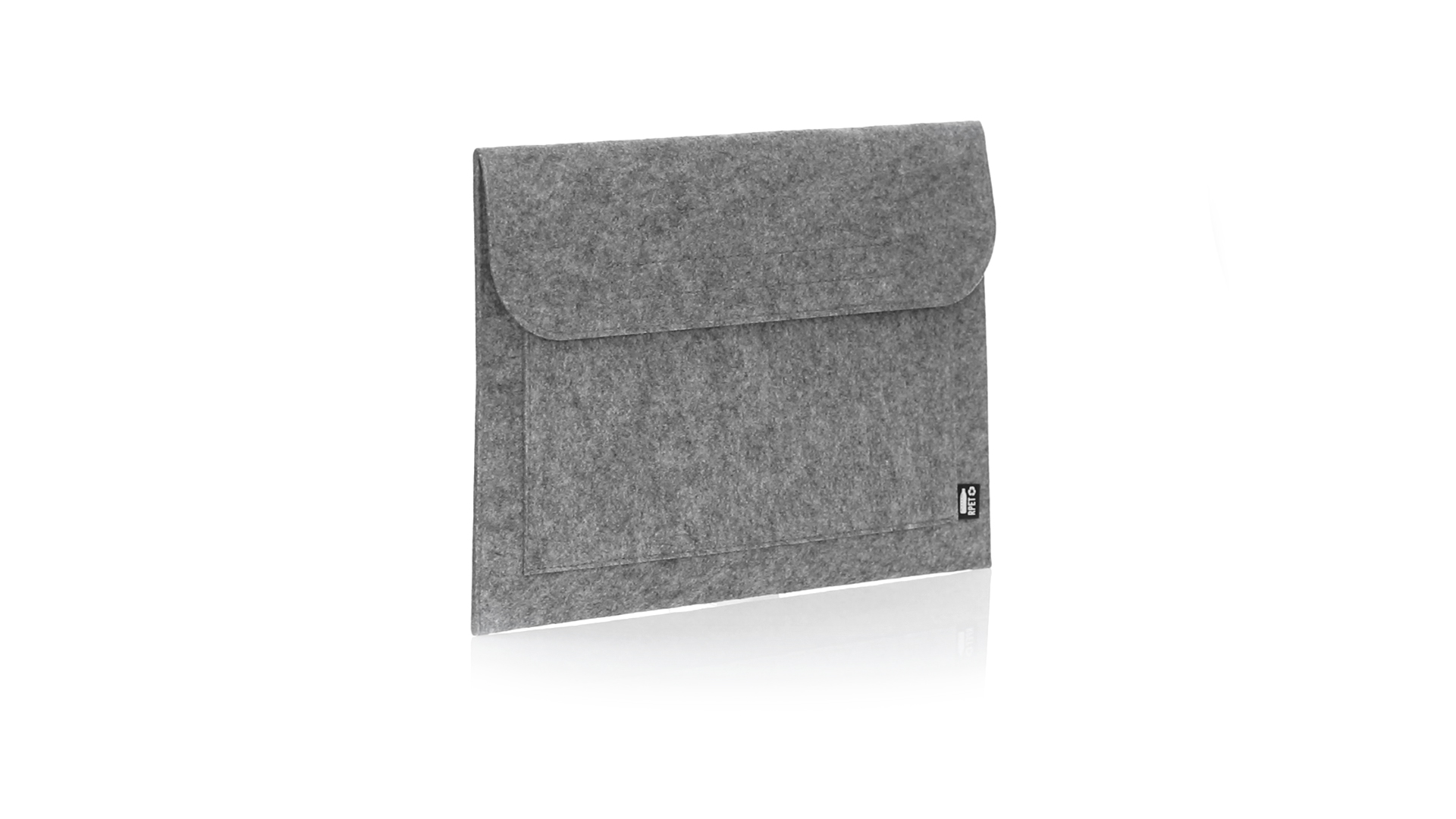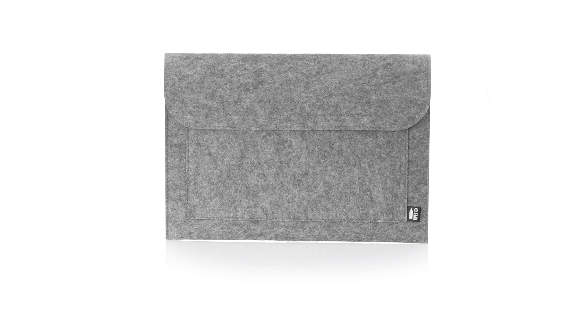 Laptophülle der Liene "Natur" aus widerstandsfähigem recyceltem RPET-Filz, das Ergebnis der Kombination des Recyclingprozesses von Kunststoffmaterialien mit der alten Technik der Filzherstellung, was zu einem Öko-Trend-Material führt, das nicht nur recycelten Ursprungs ist, sondern auch zu recycelbar. Überschlag mit Klettverschlüssen und Fronttasche, mit markantem RPET auf dem Aussenetikett.