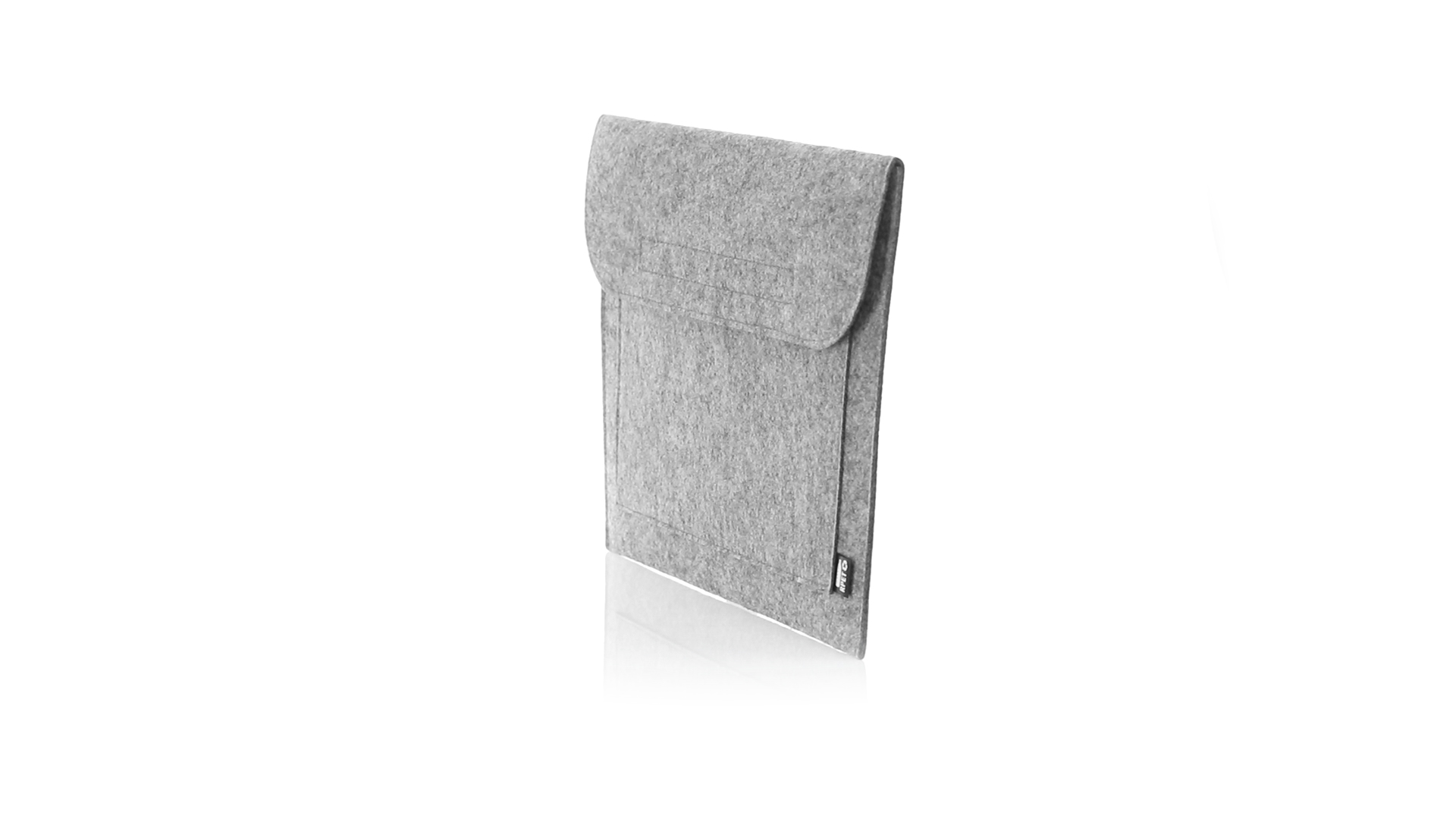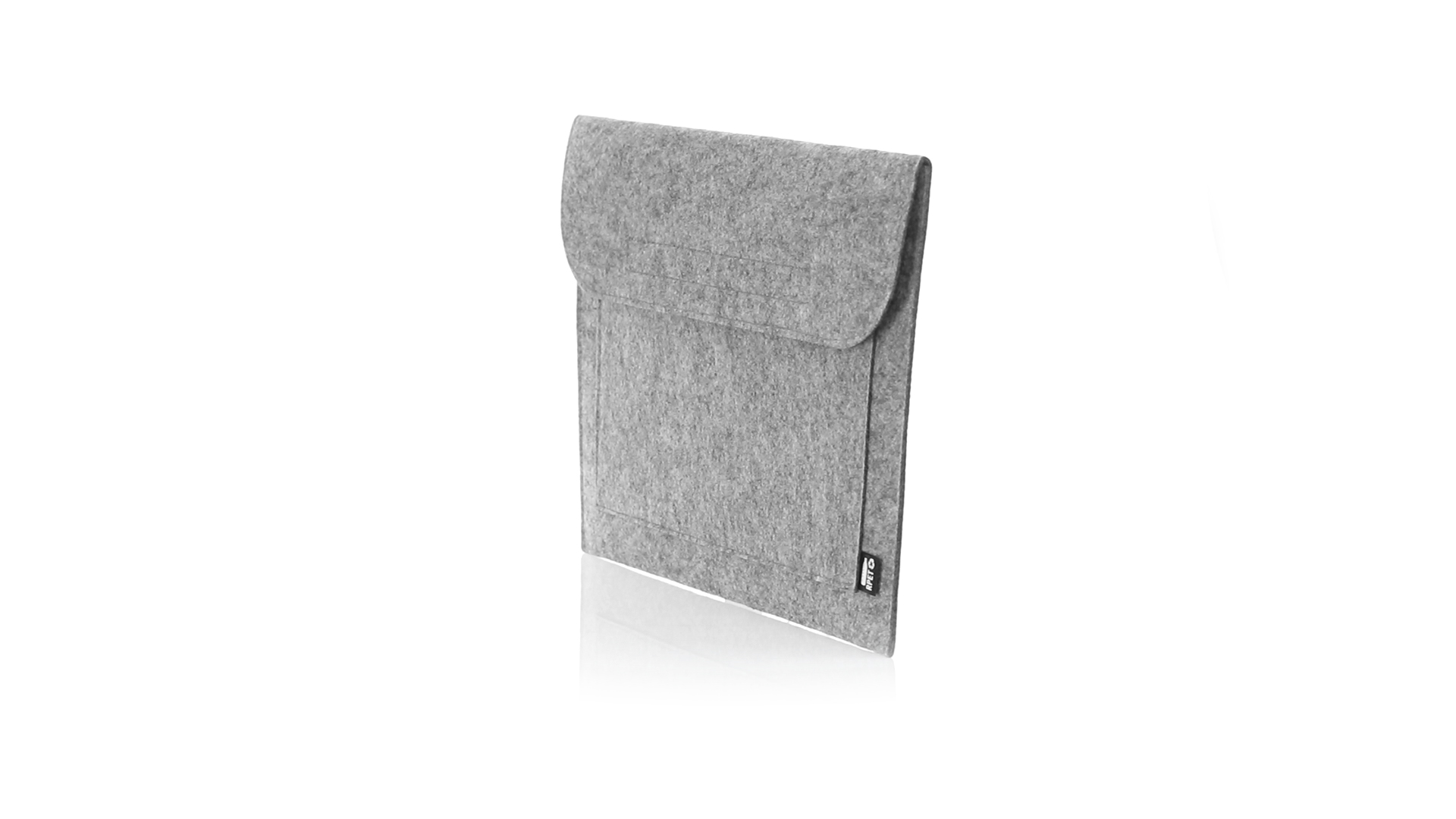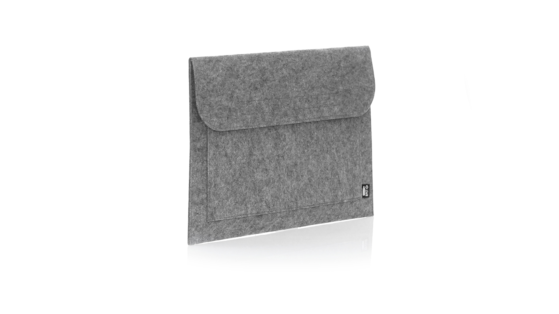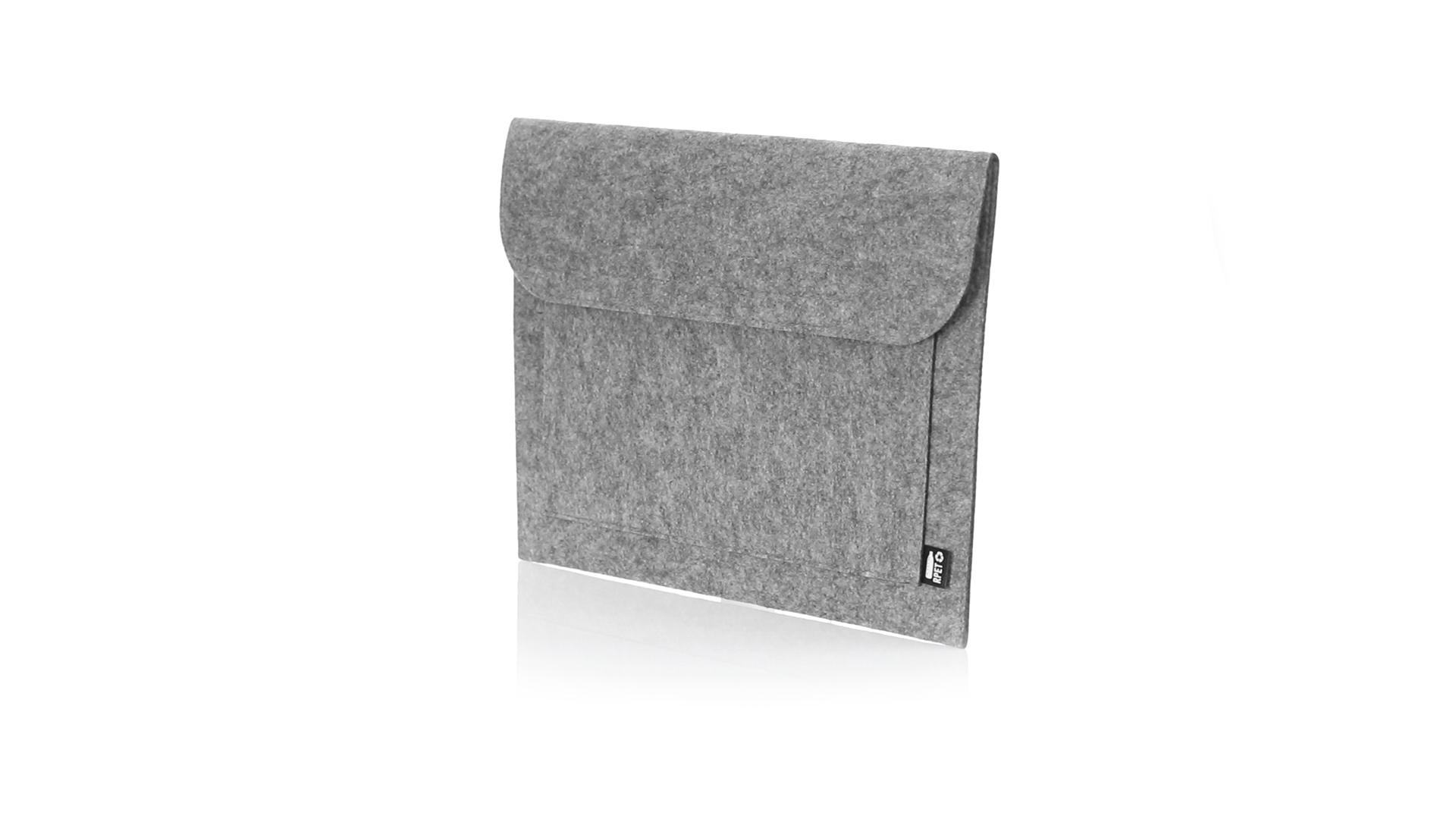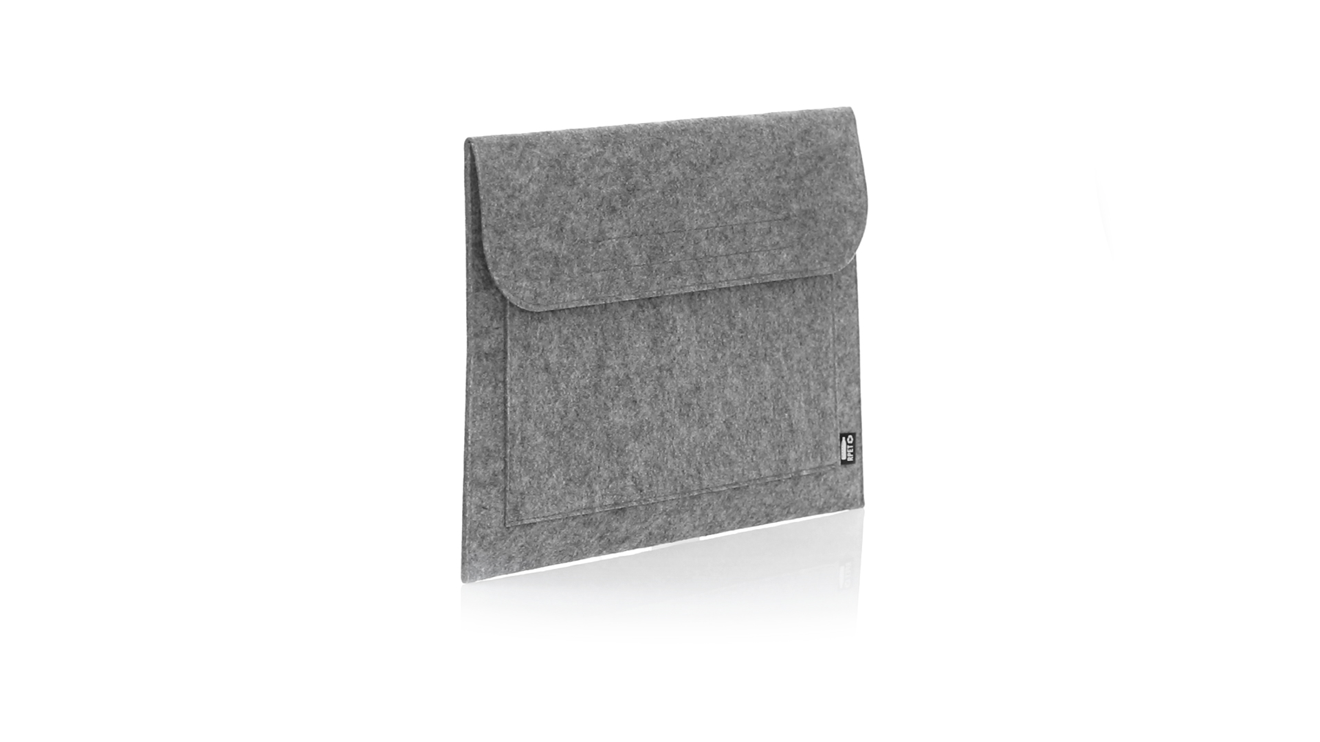 Laptophülle der Liene "Natur" aus widerstandsfähigem recyceltem RPET-Filz, das Ergebnis der Kombination des Recyclingprozesses von Kunststoffmaterialien mit der alten Technik der Filzherstellung, was zu einem Öko-Trend-Material führt, das nicht nur recycelten Ursprungs ist, sondern auch zu recycelbar. Überschlag mit Klettverschlüssen und Fronttasche, mit markantem RPET auf dem Aussenetikett.