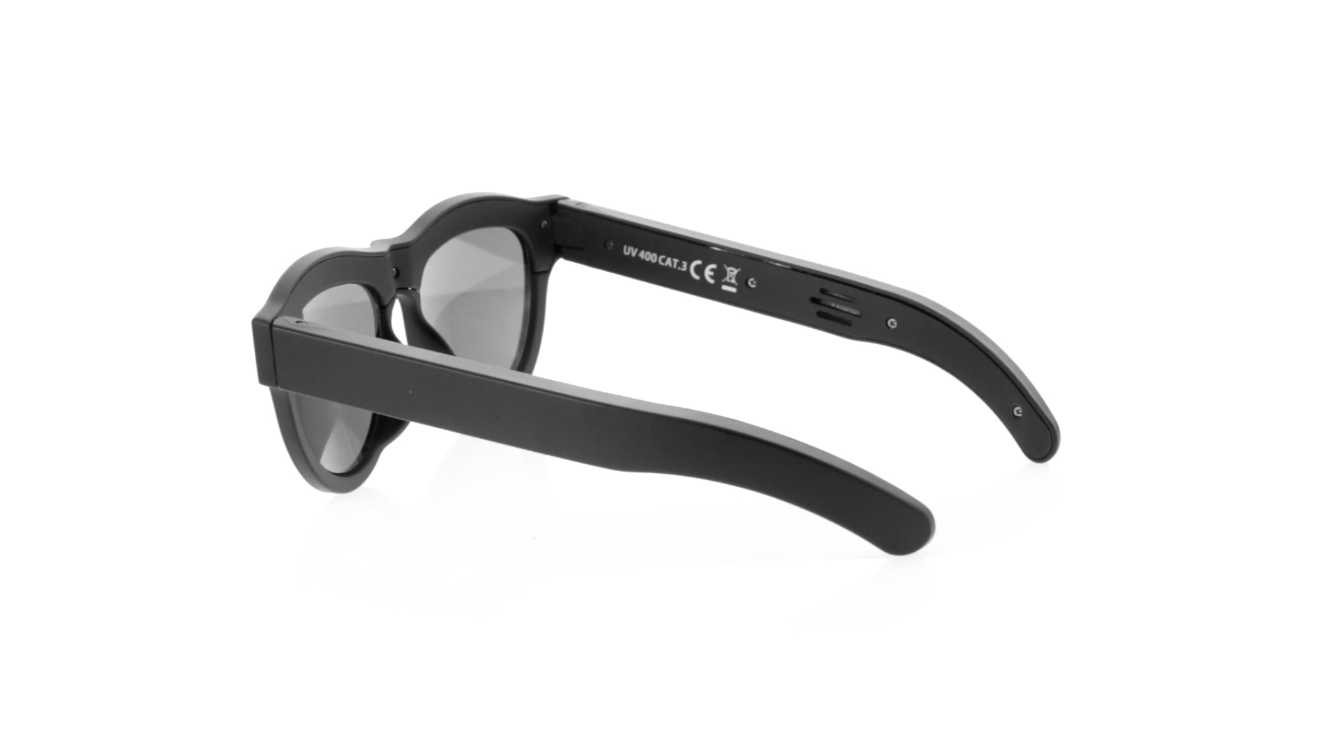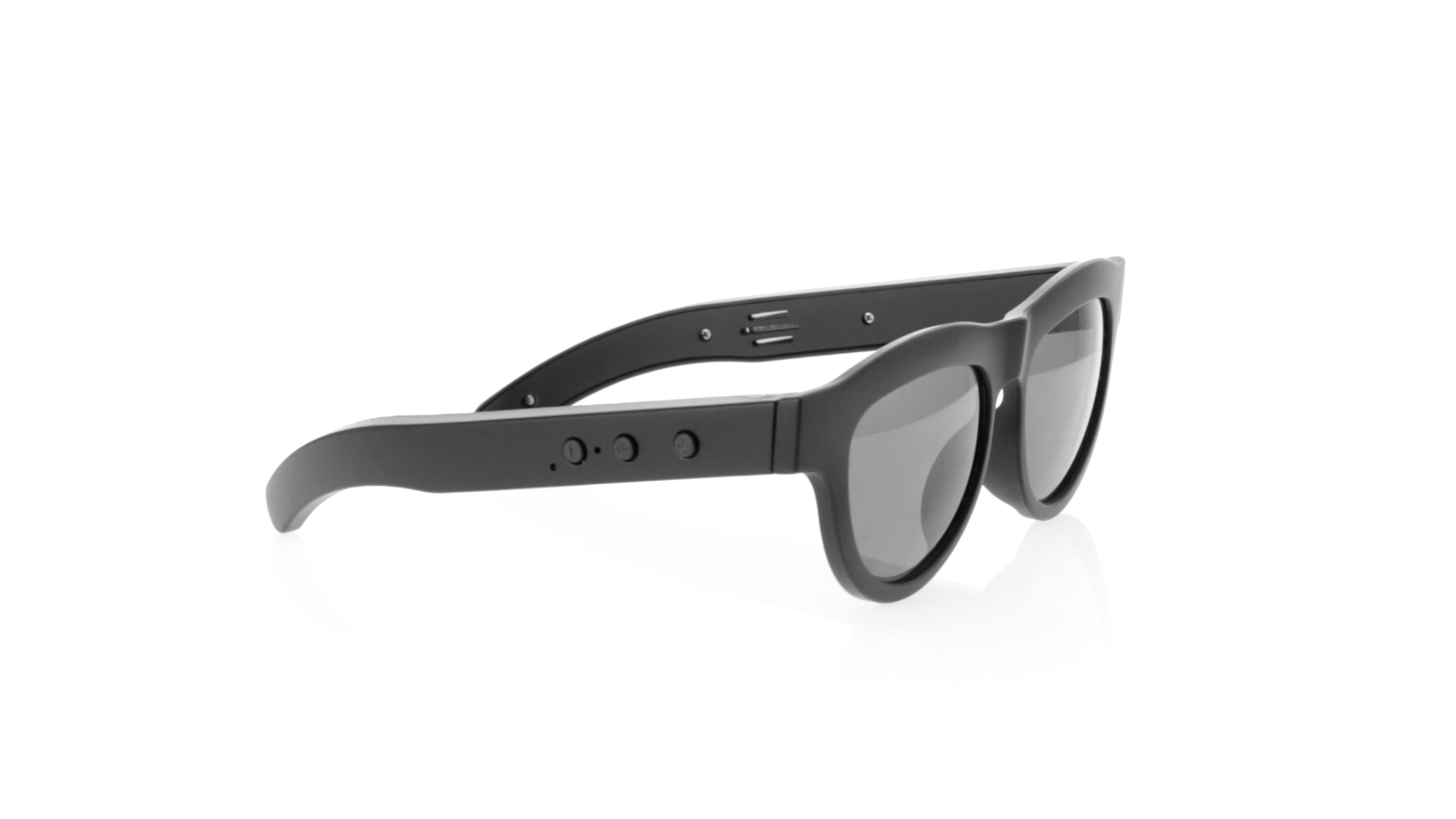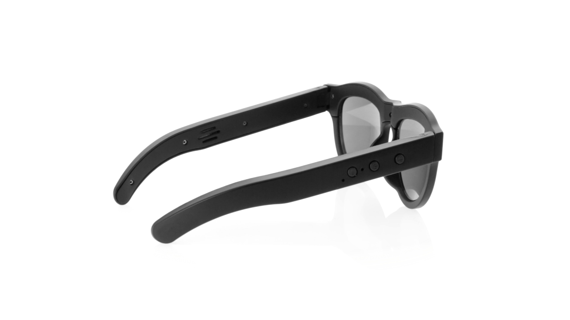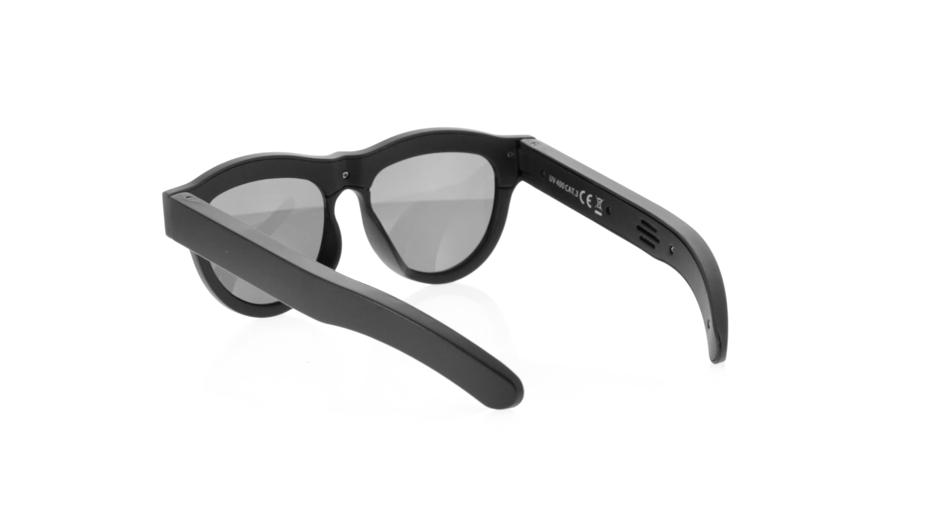 Sonnenbrille mit UV-400-Schutz und integriertem Bluetooth-Headset. Ultradünnes Design mit Bedientasten am Bügel. Mit 1 W Leistung und Freisprechfunktion. Aufladbar über USB-Kabel (inklusive). Präsentiert in einer resistenten Hülle mit transparentem Deckel.
