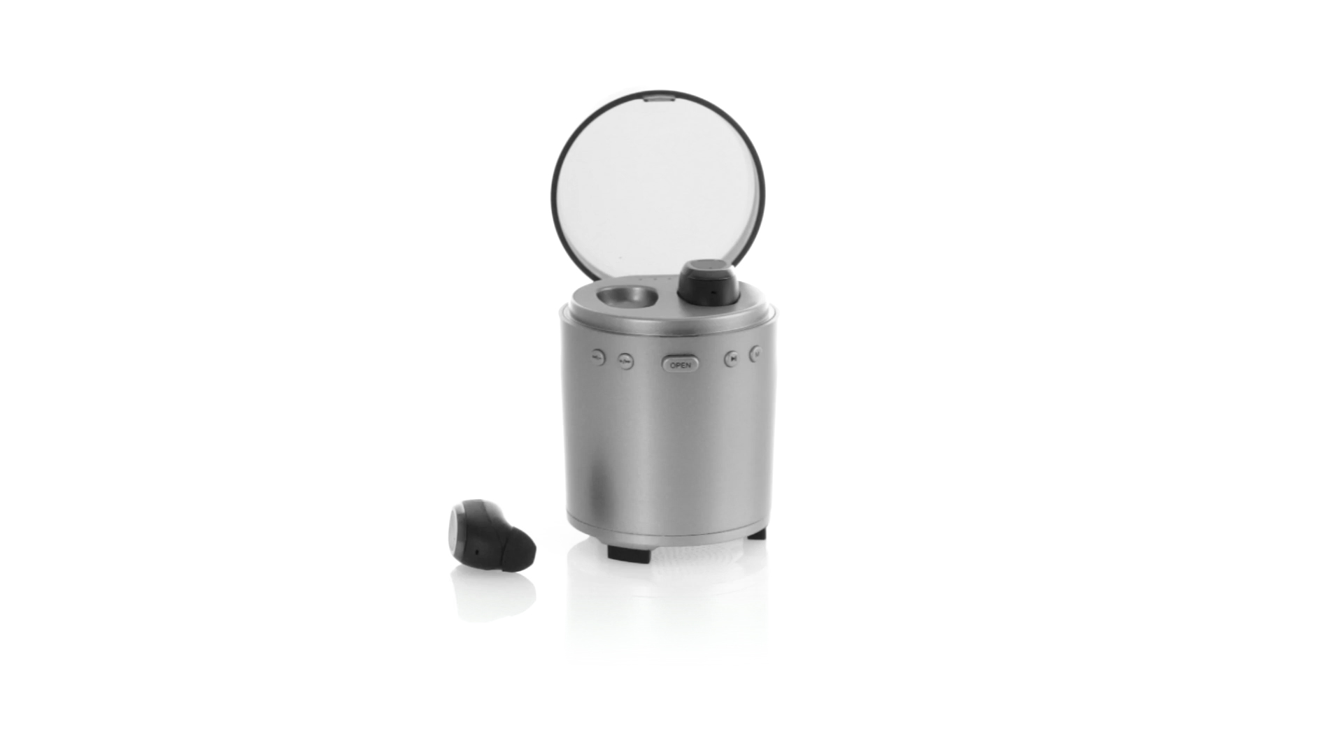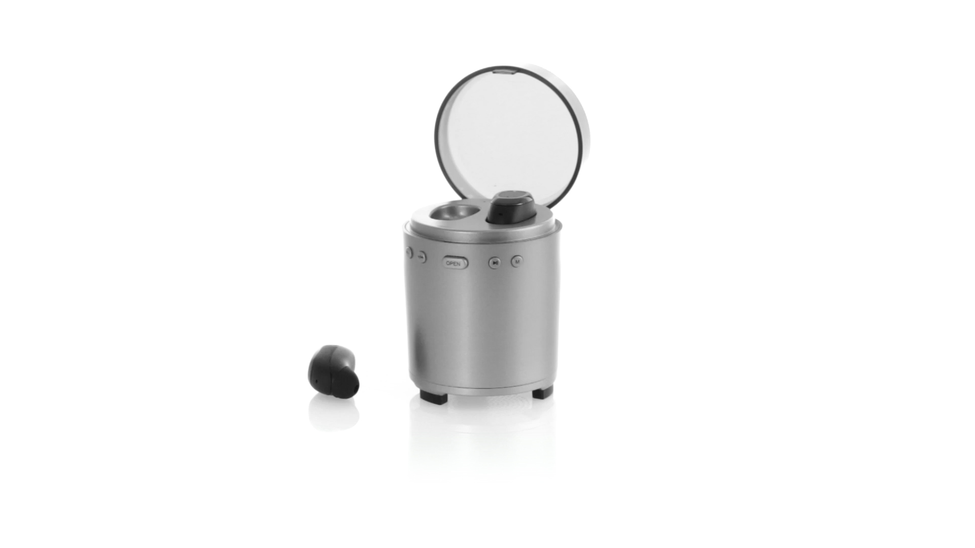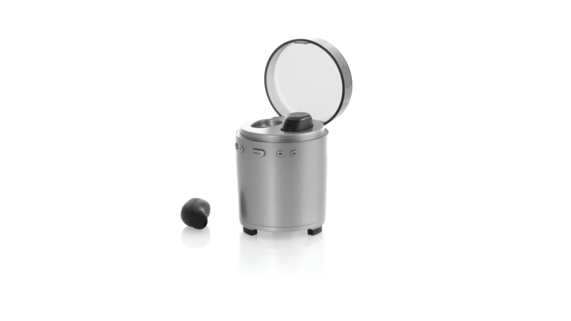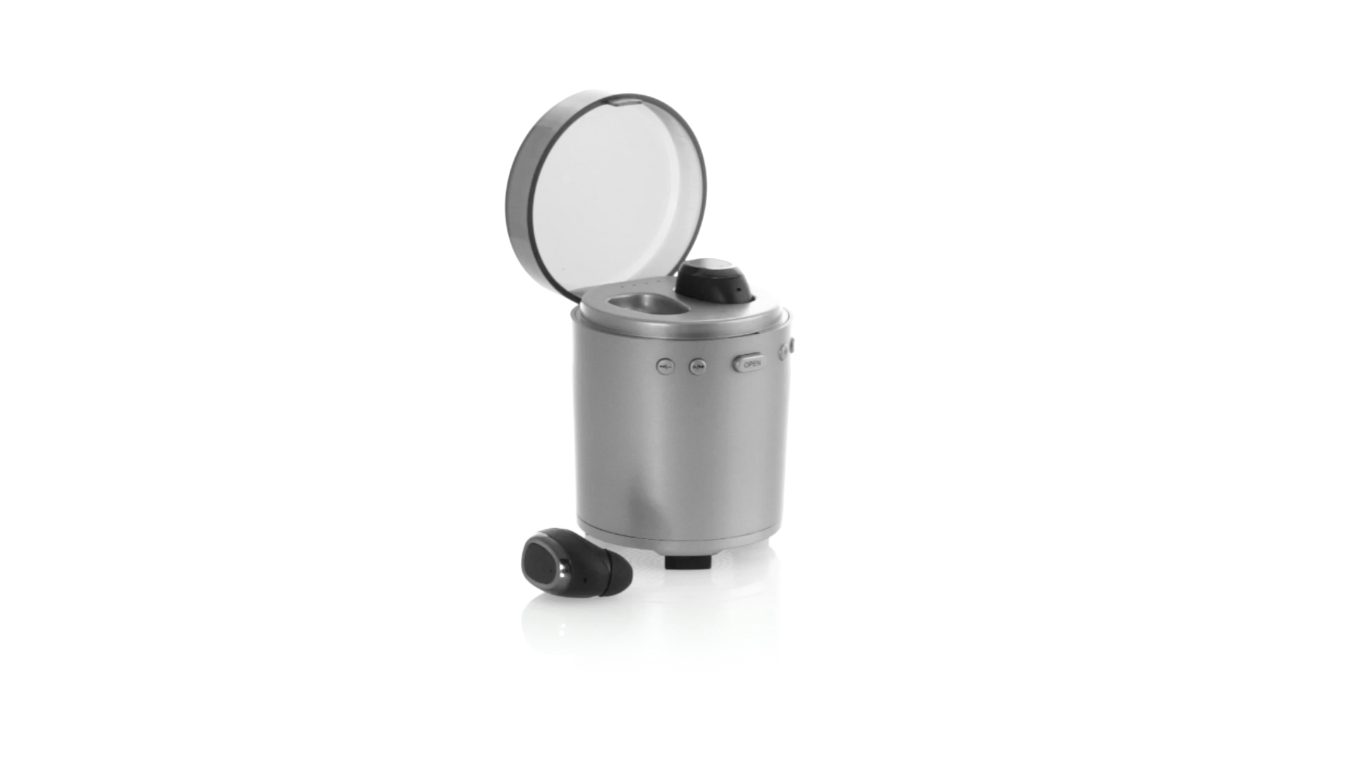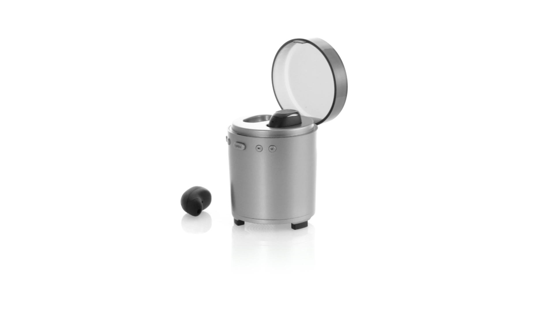 Bluetooth®-Lautsprecher mit integrierten In-Ear-Kopfhörern. Mit schlichtem Design in Schwarz/Silber, rutschfester Unterseite und im Lautsprecher integrierten Bedientasten. Bietet zudem Freisprechfunktion und FM-Radio. Ladestation für Kopfhörer mit Deckel und Ladeanzeige. Aufladbar über USB-Kabel (inklusive). Präsentiert in einer attraktiven Designbox.